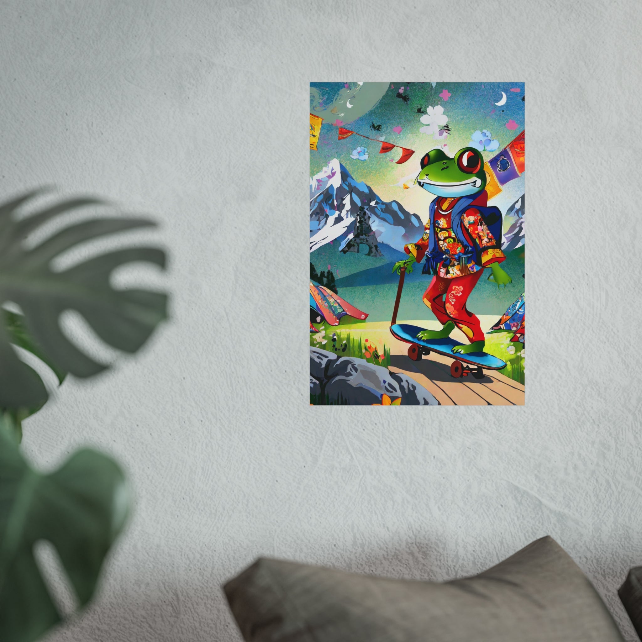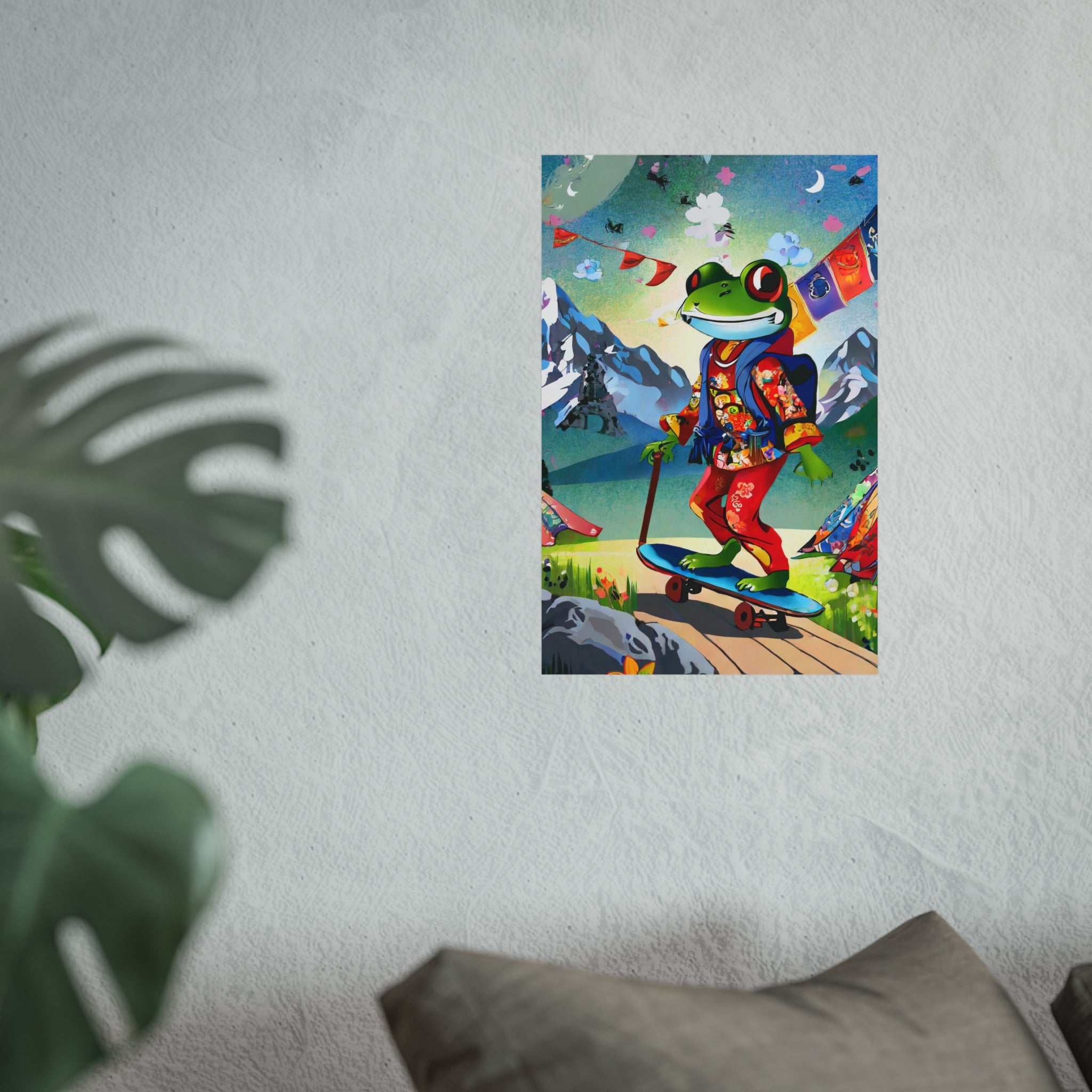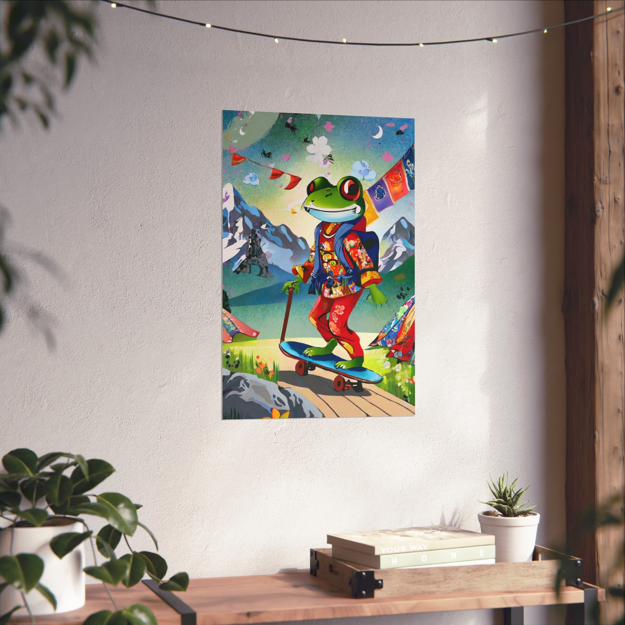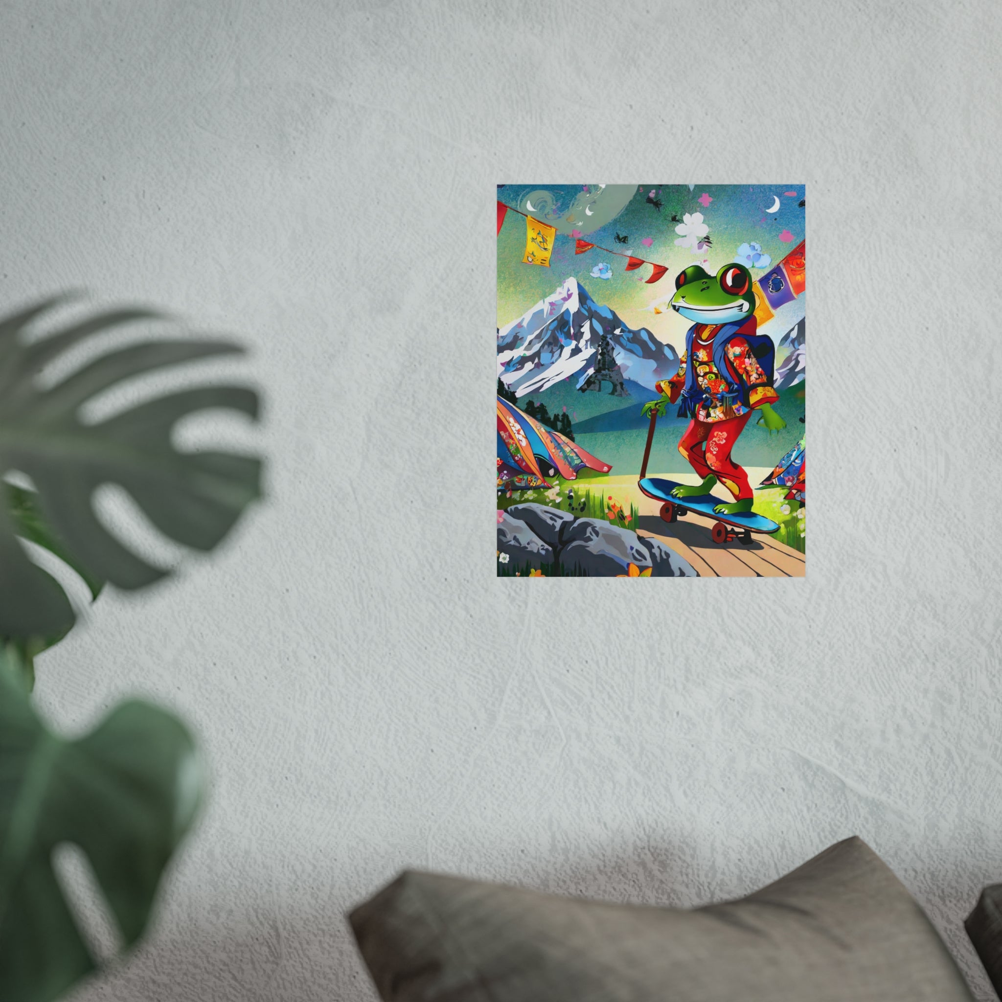 Artwork created, designed and digitally remastered by Sarasvati Designs. A whimsical illustration of a charming and fun frog riding a skateboard past colorful Tibetan tents and flags.