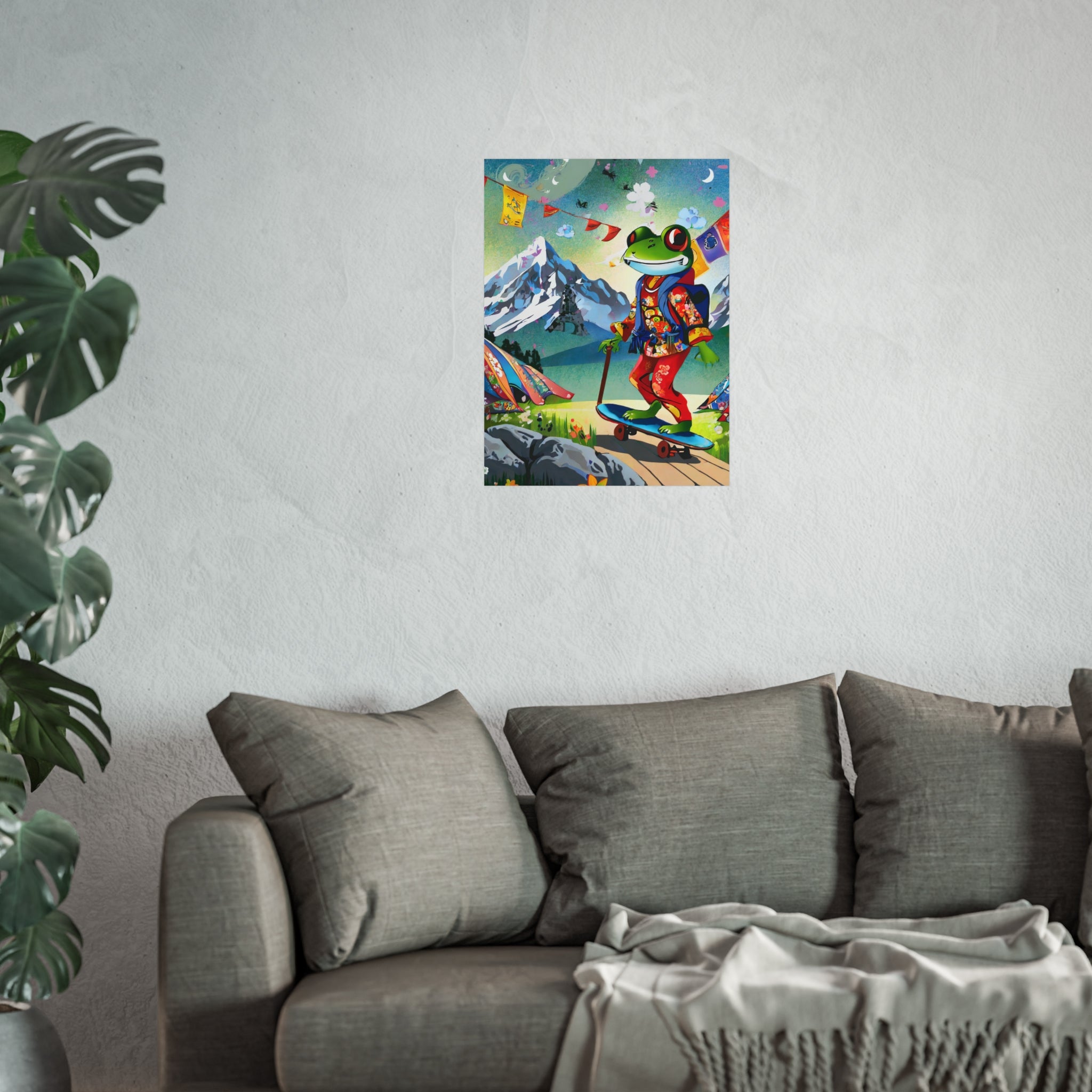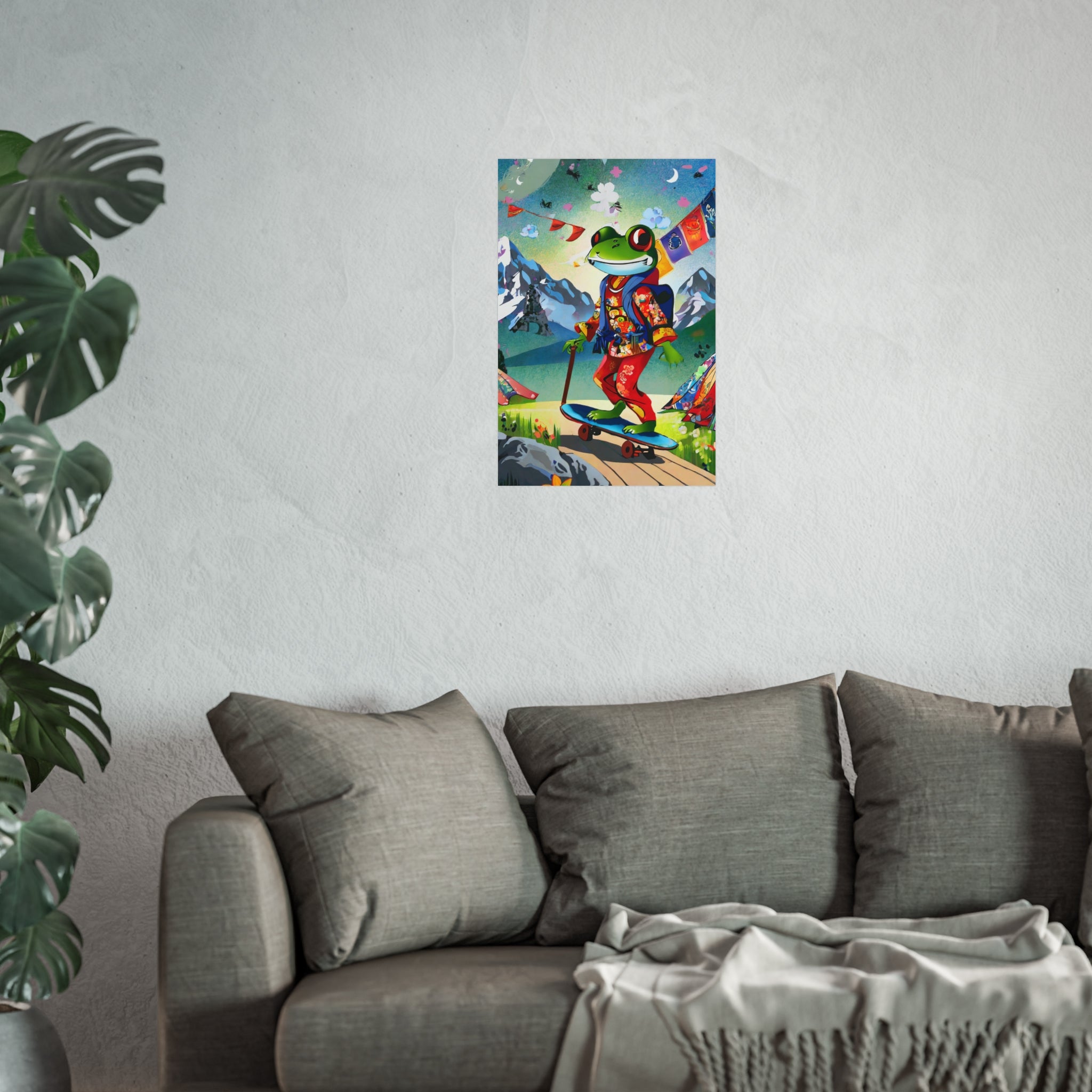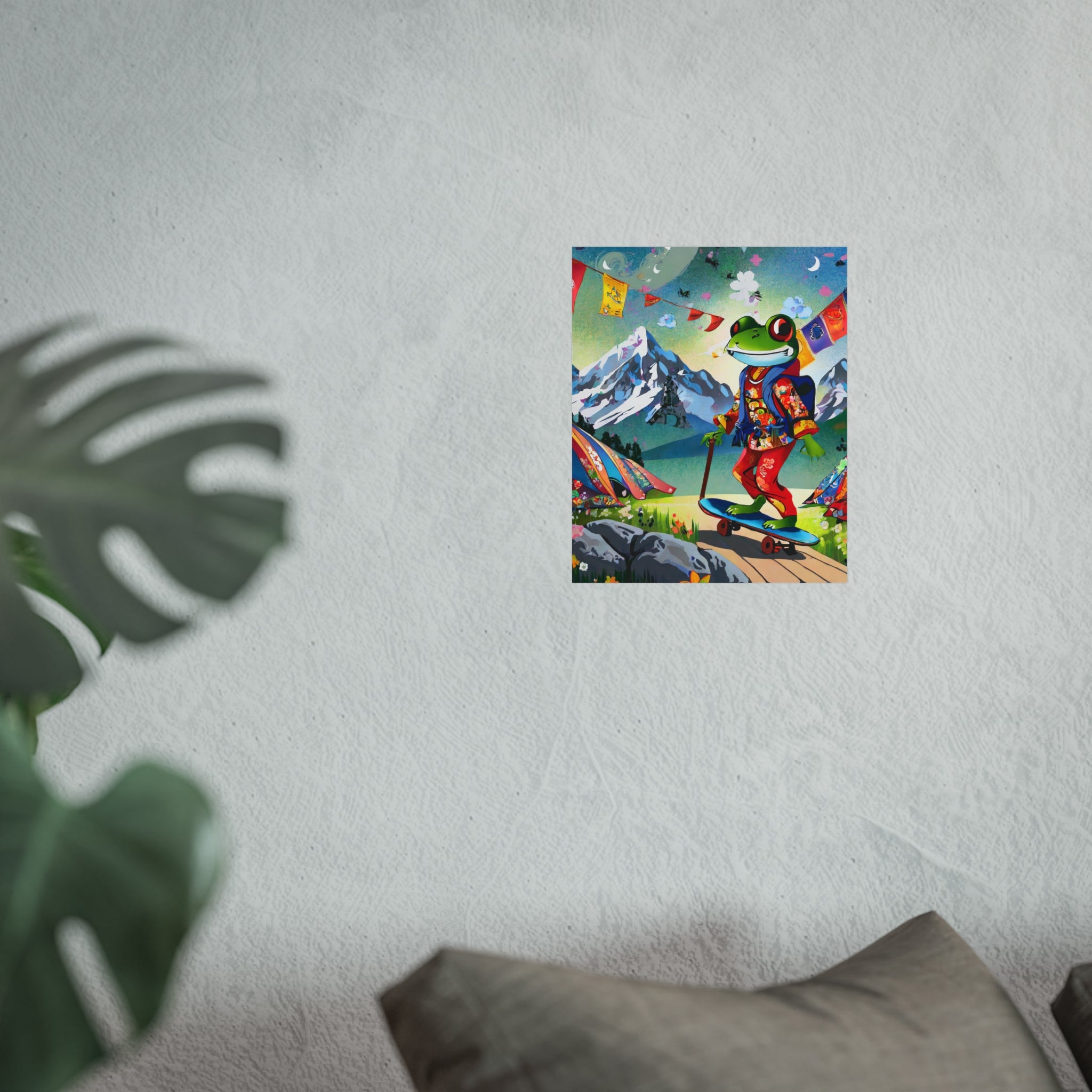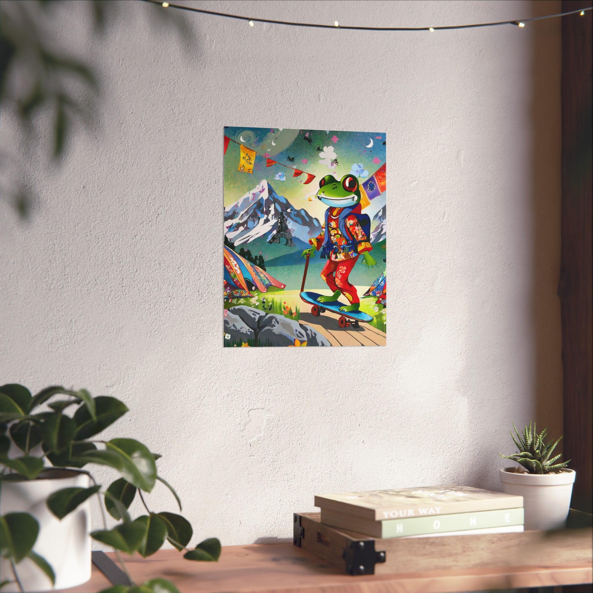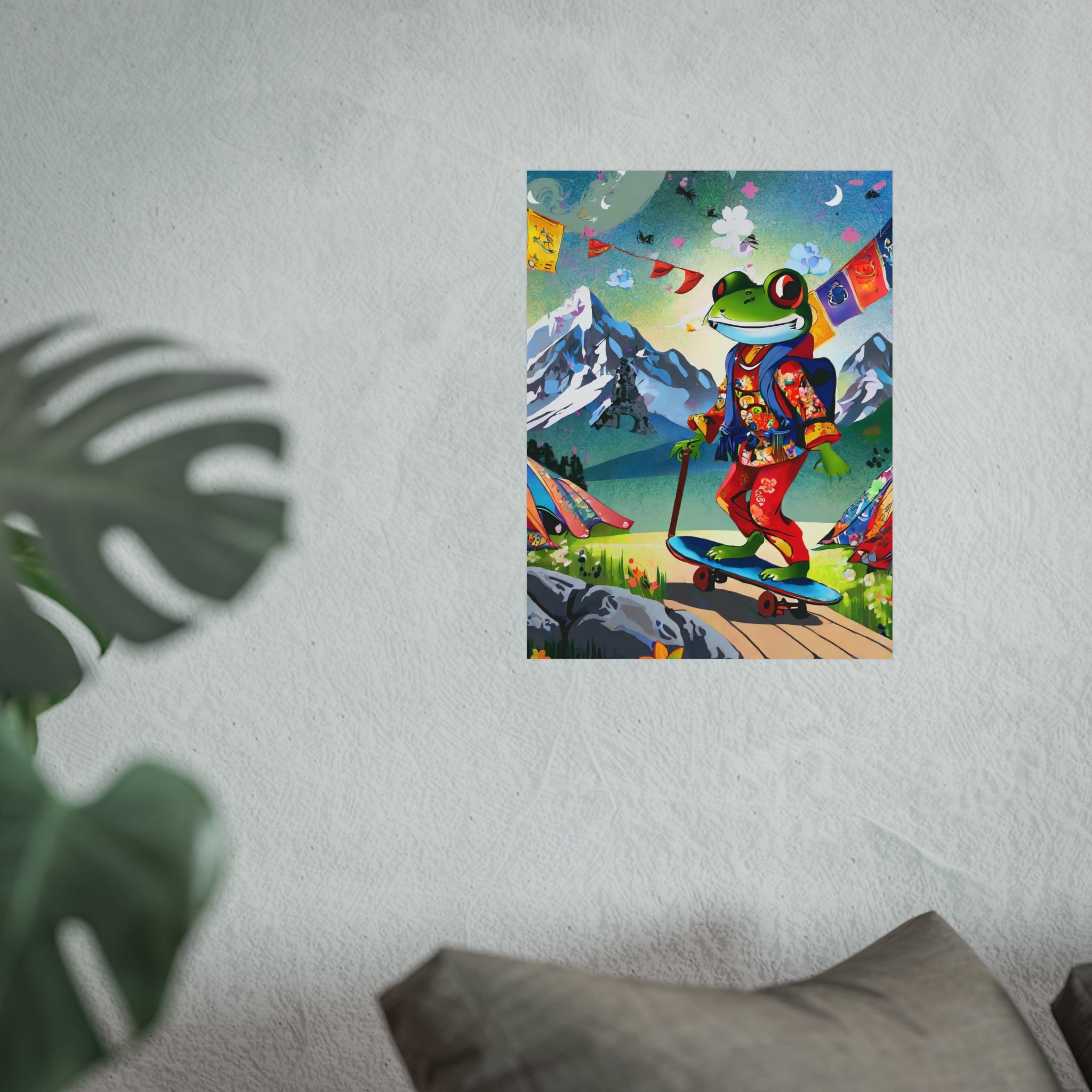 Artwork created, designed and digitally remastered by Sarasvati Designs. A whimsical illustration of a charming and fun frog riding a skateboard past colorful Tibetan tents and flags.
