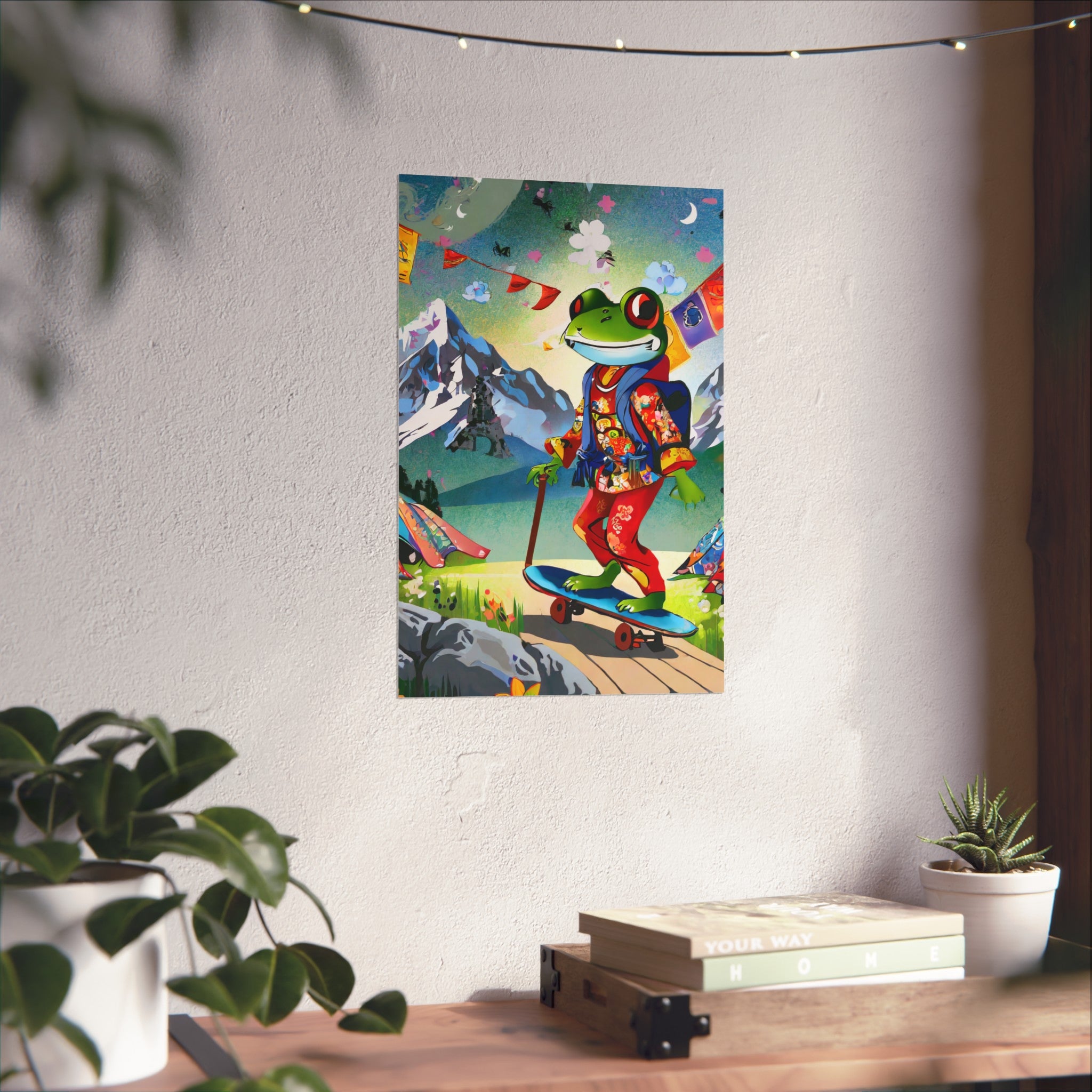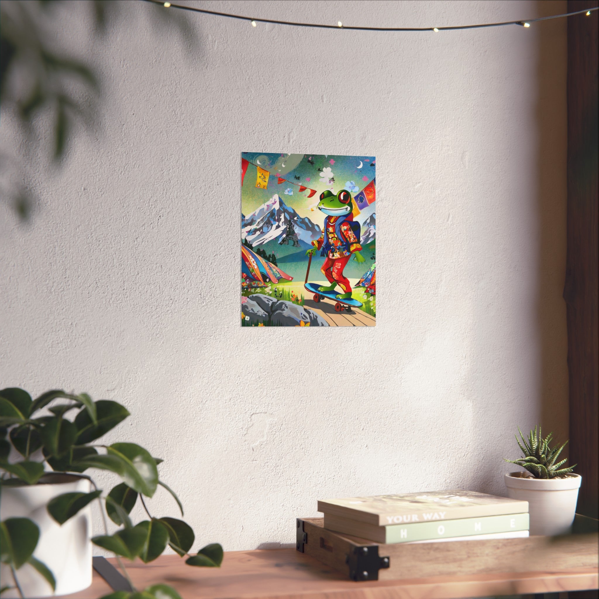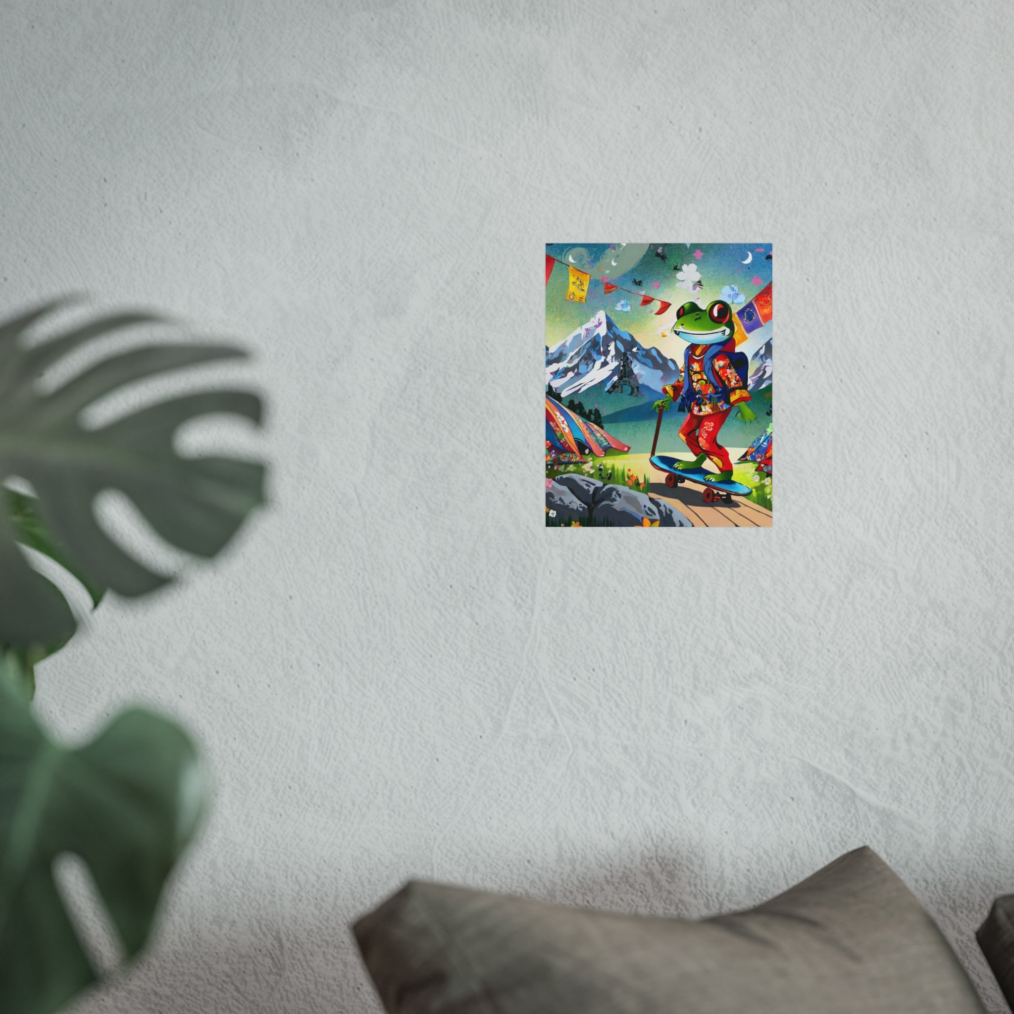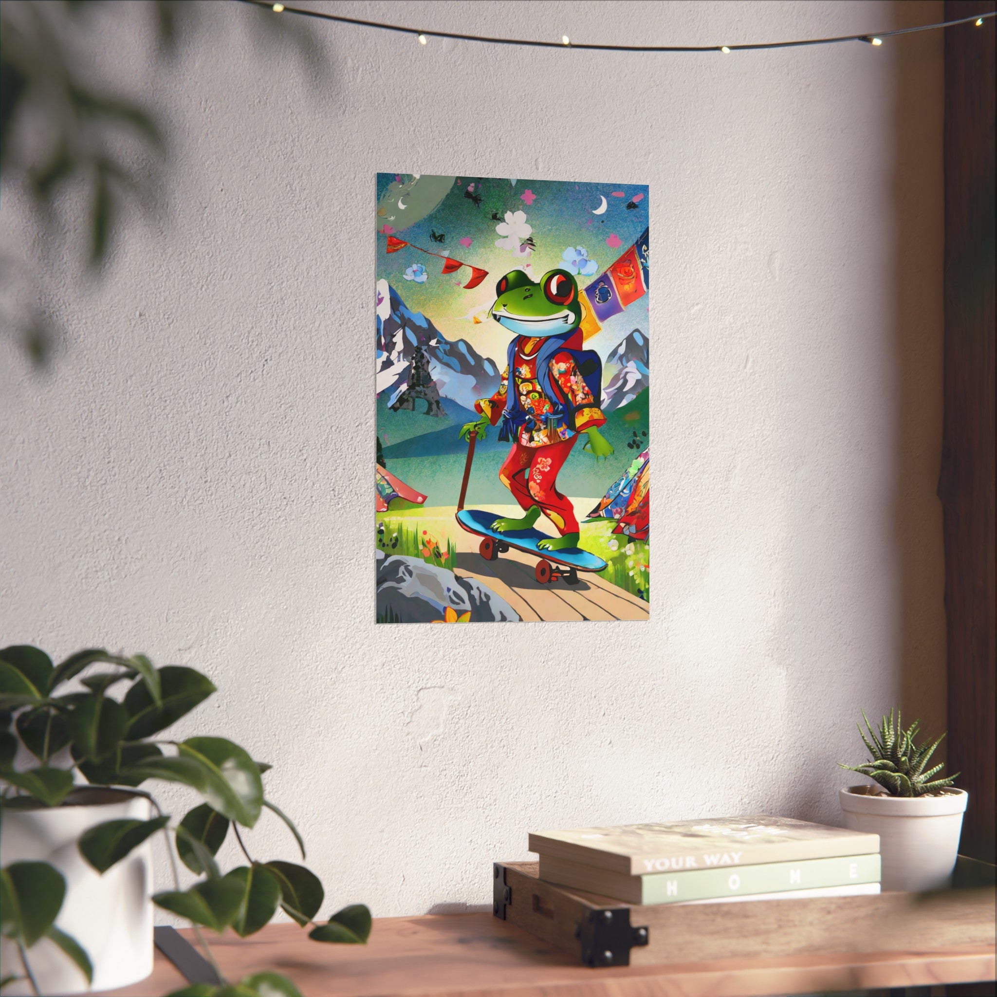 Artwork created, designed and digitally remastered by Sarasvati Designs. A whimsical illustration of a charming and fun frog riding a skateboard past colorful Tibetan tents and flags.