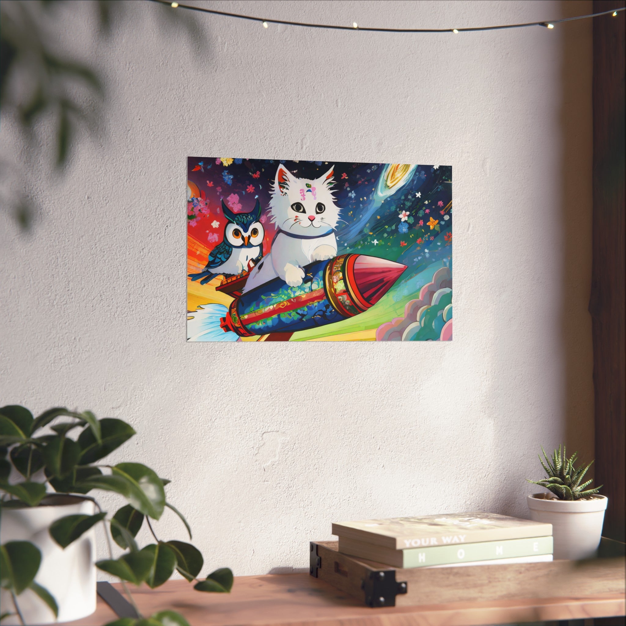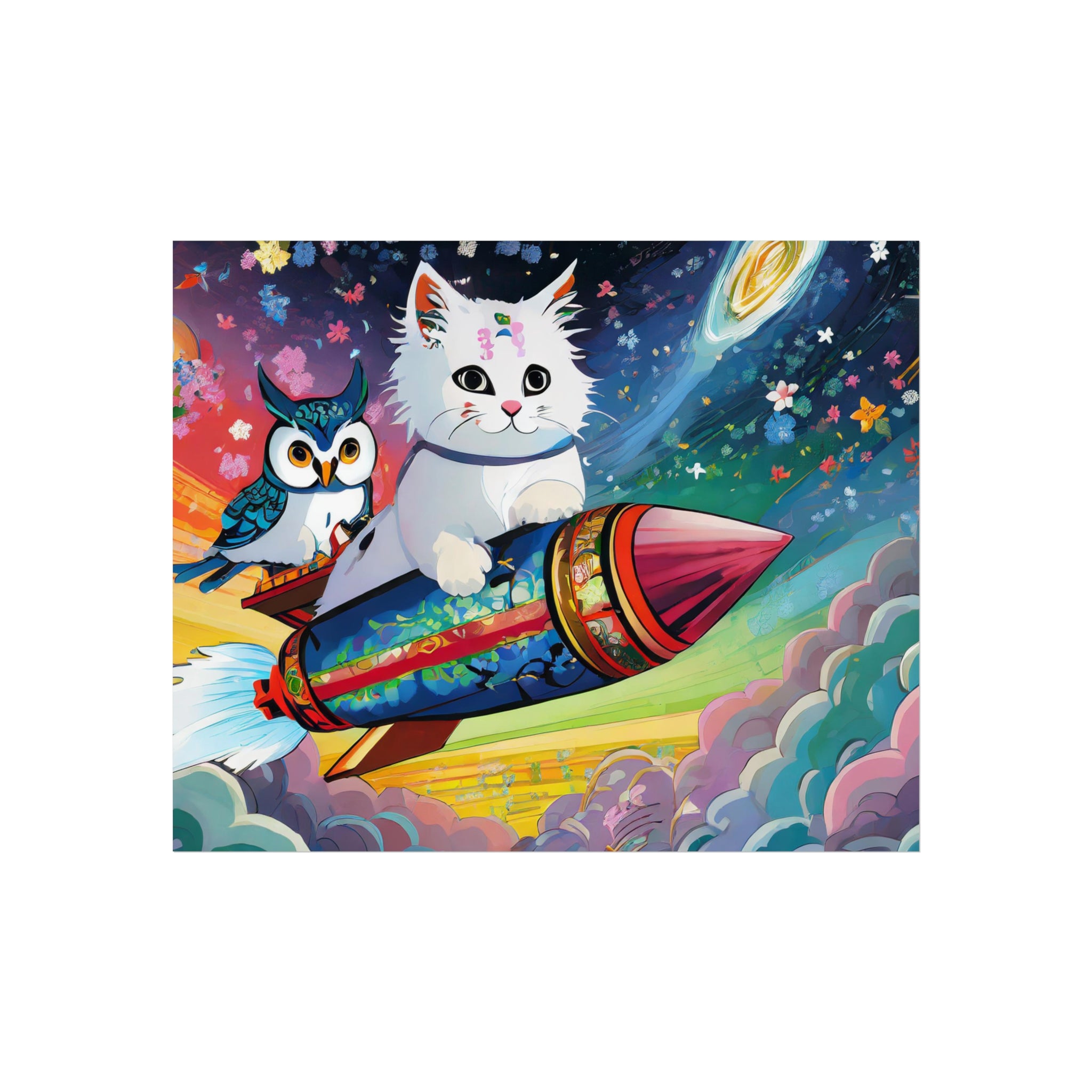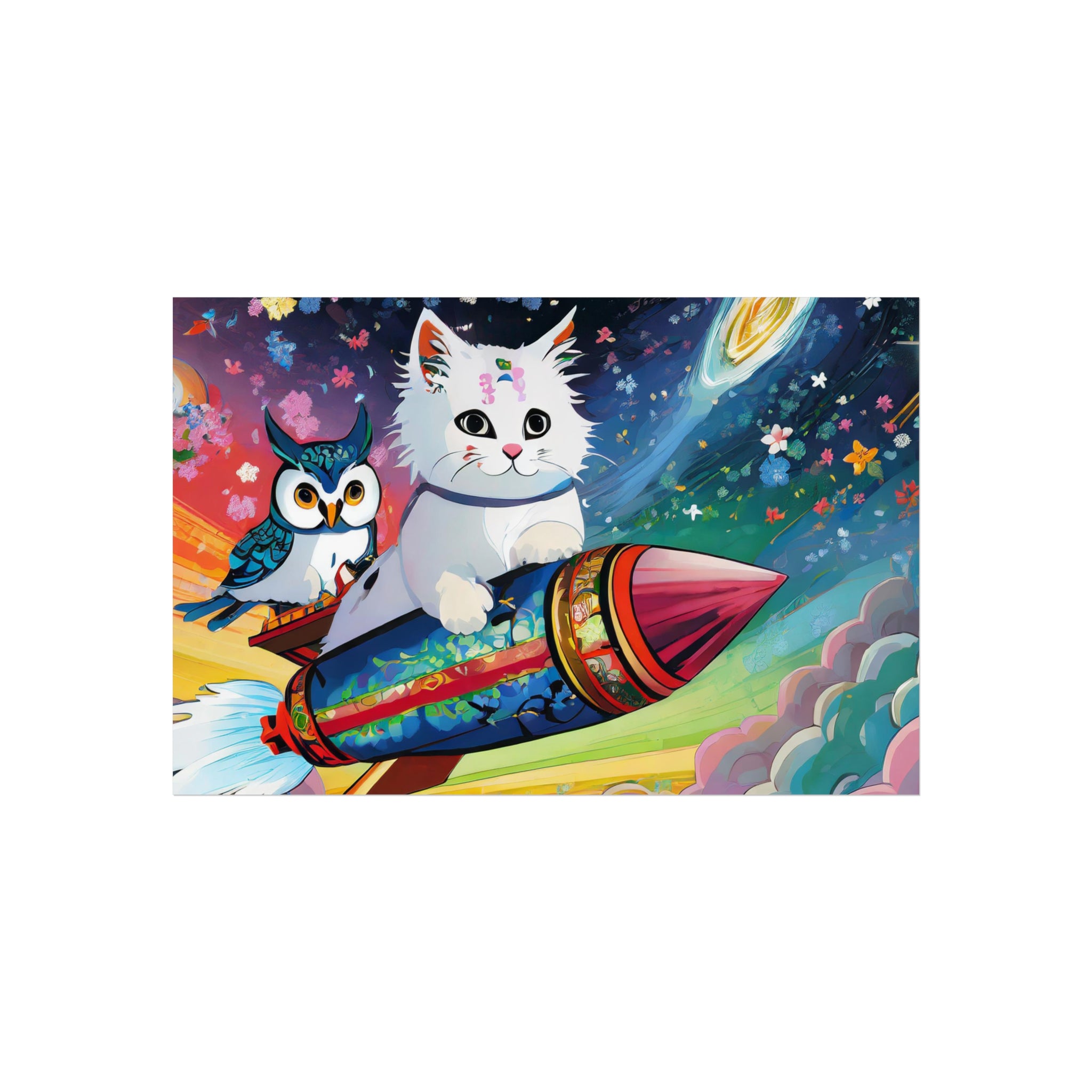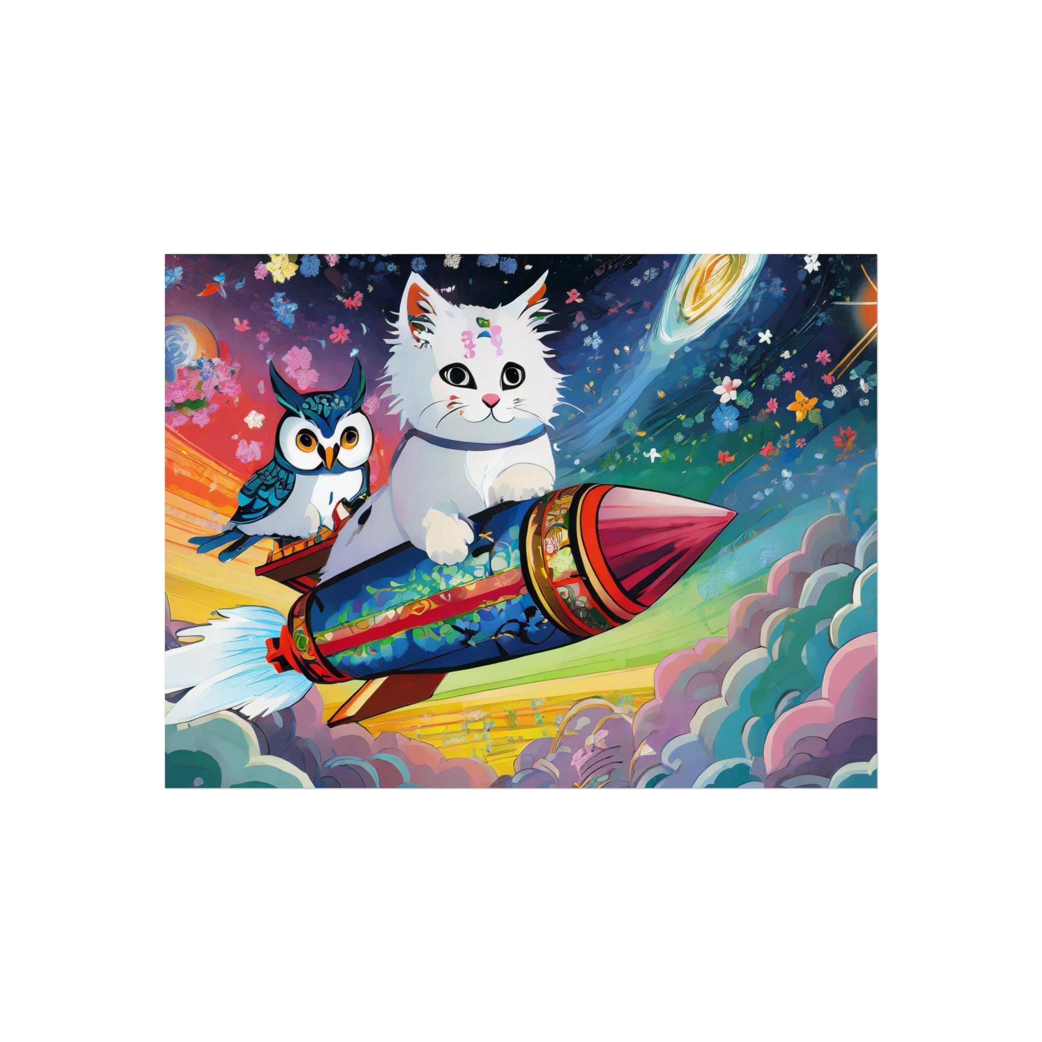 Artwork created, designed and digitally remastered by Sarasvati Designs. A whimsical illustration of a fluffy white cat and cute owl riding a rocket ship.