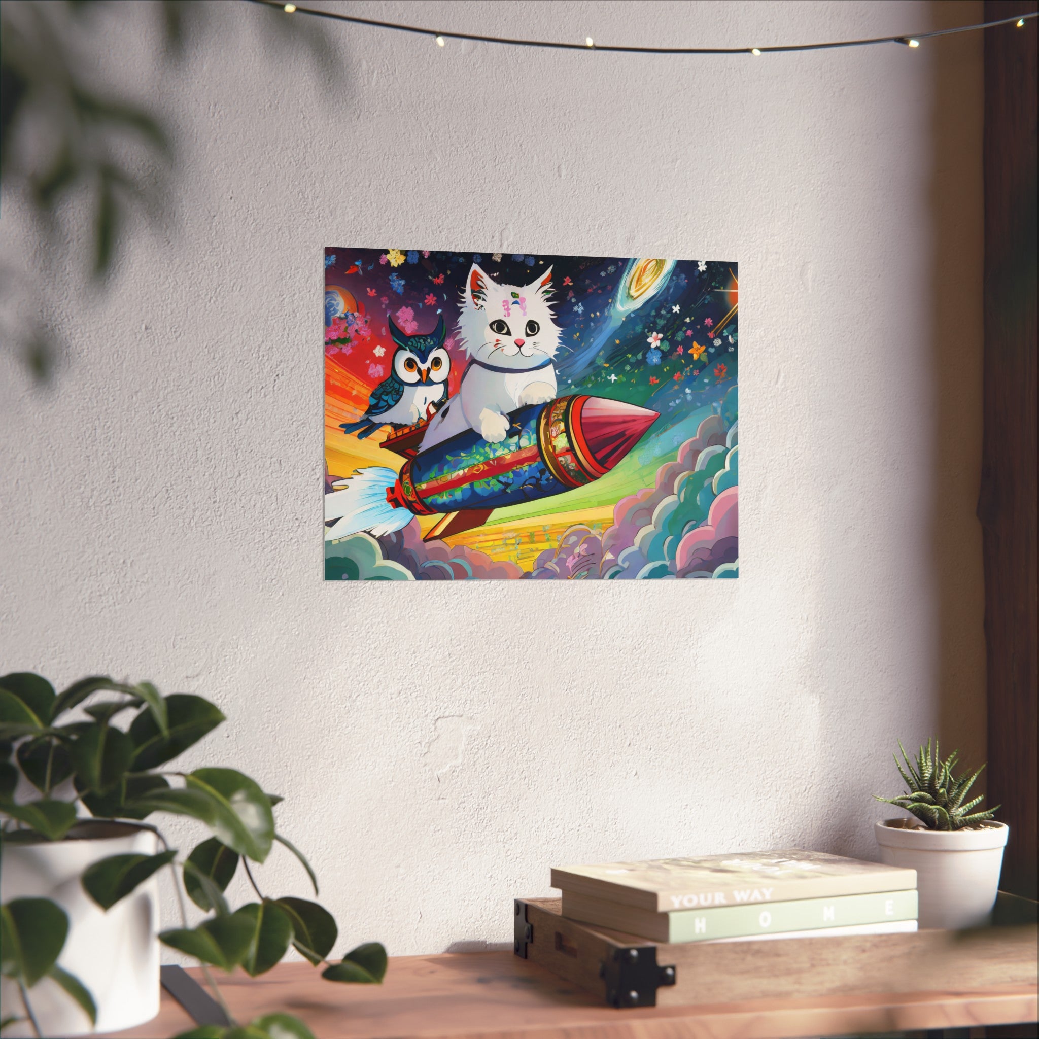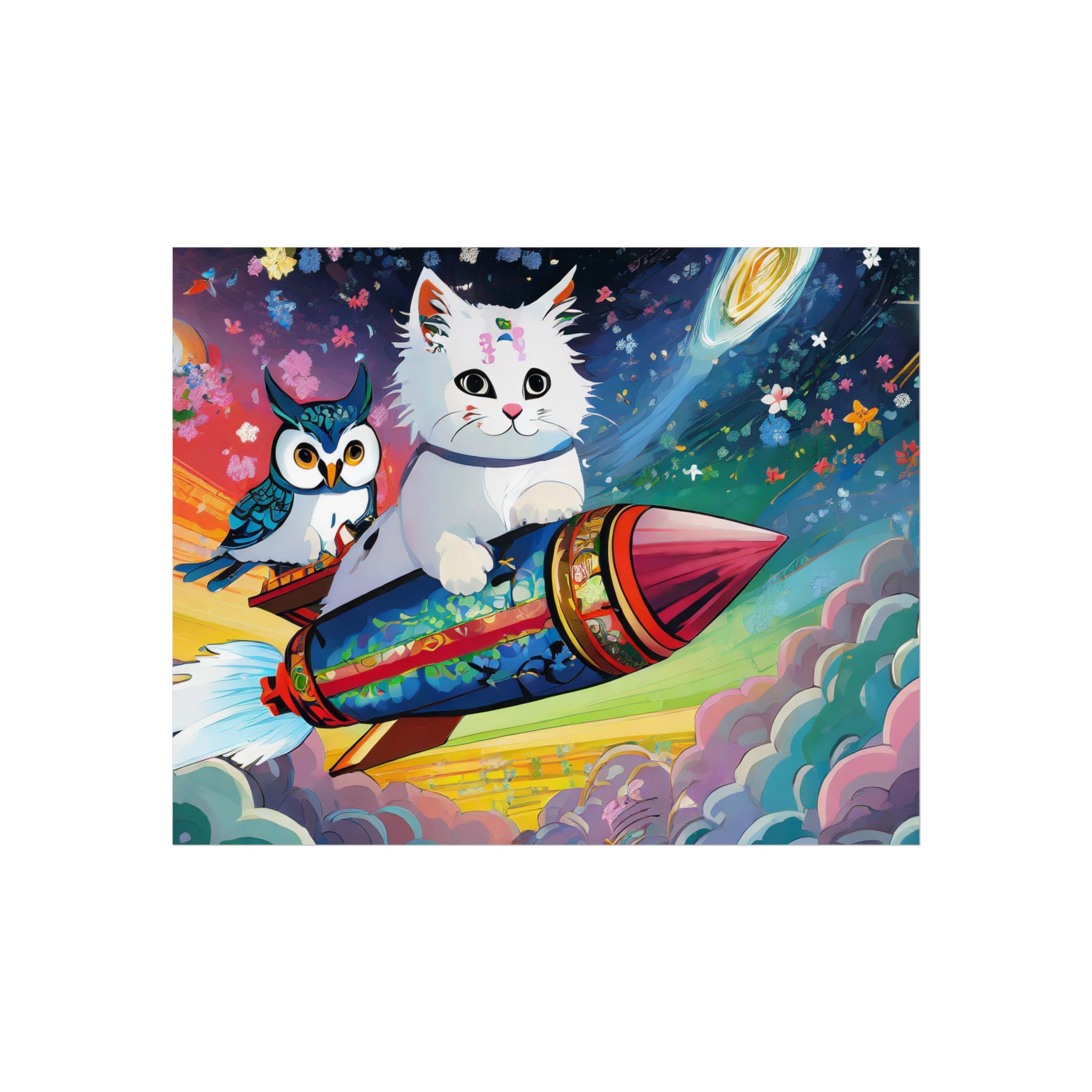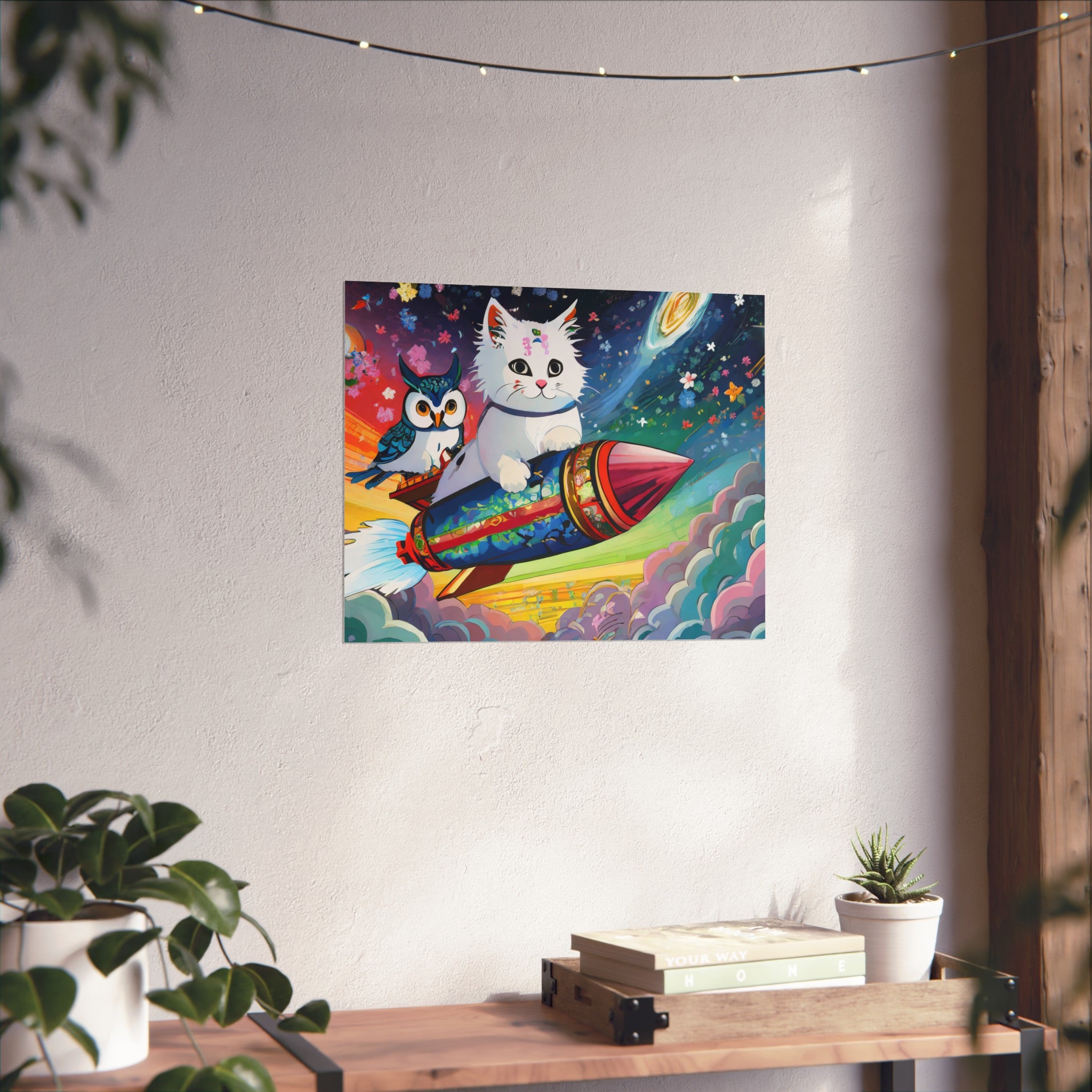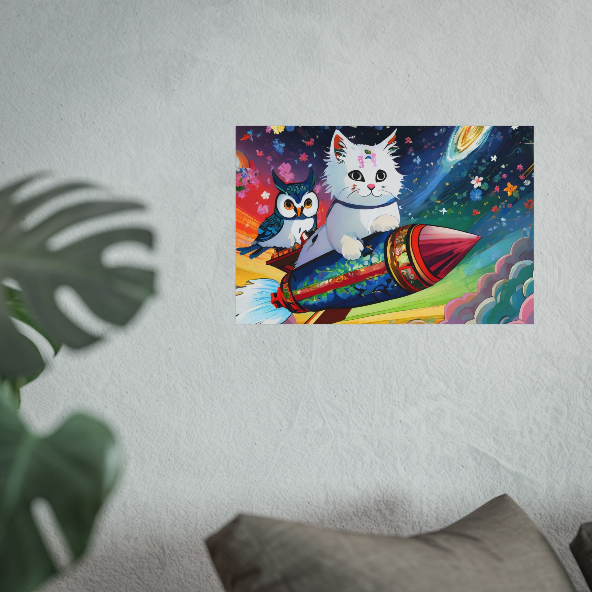Artwork created, designed and digitally remastered by Sarasvati Designs. A whimsical illustration of a fluffy white cat and cute owl riding a rocket ship.