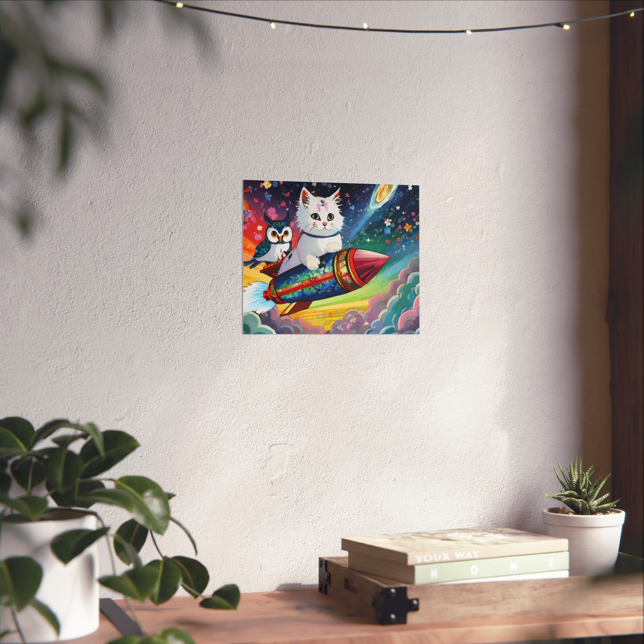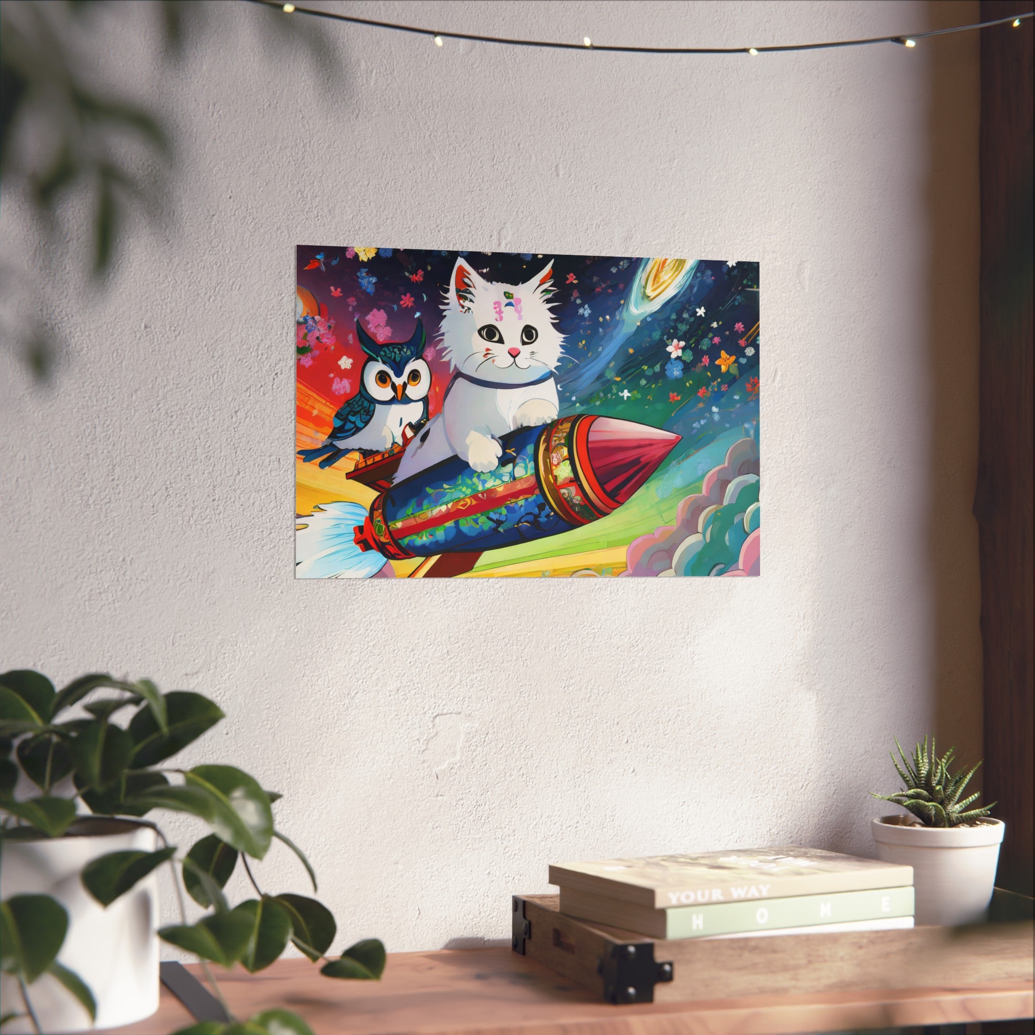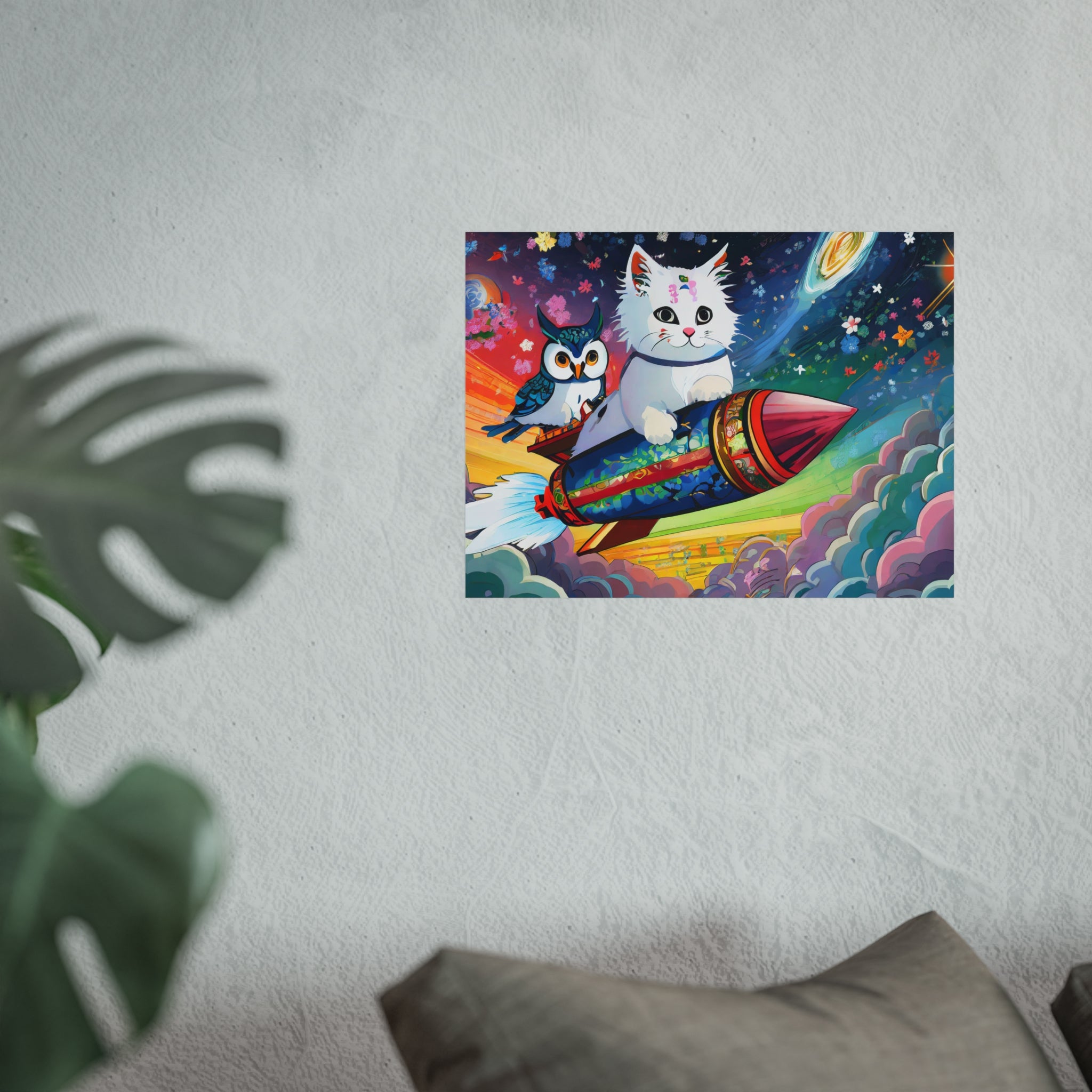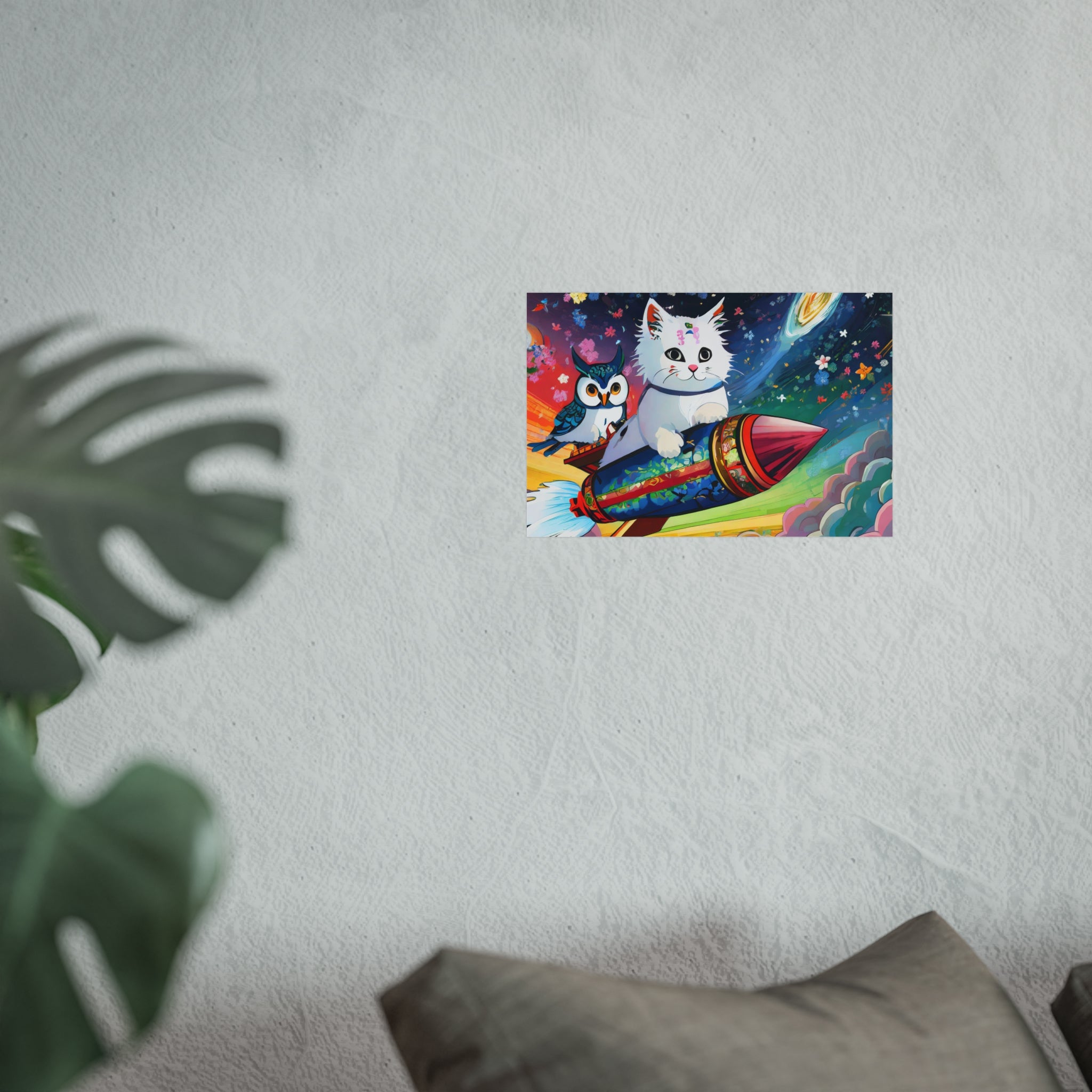 Artwork created, designed and digitally remastered by Sarasvati Designs. A whimsical illustration of a fluffy white cat and cute owl riding a rocket ship.