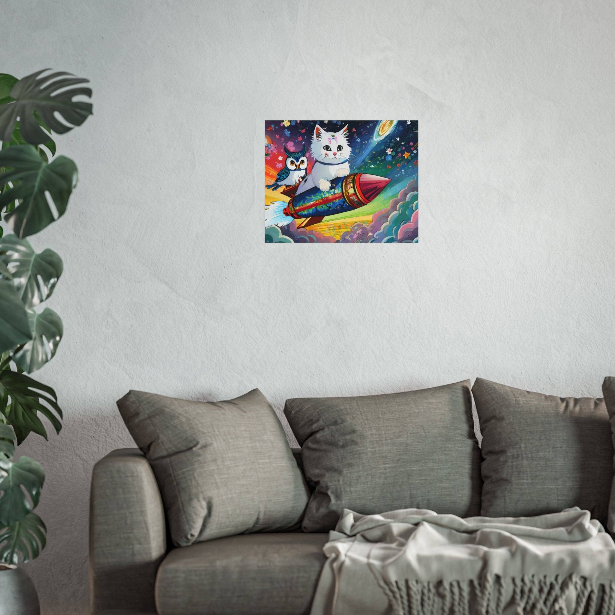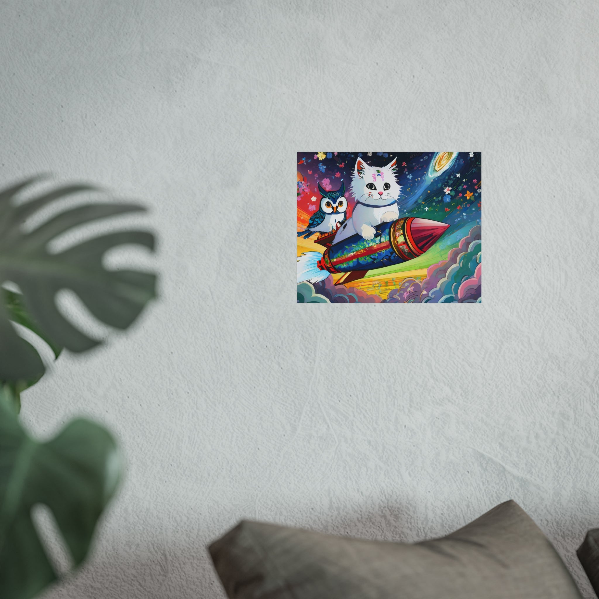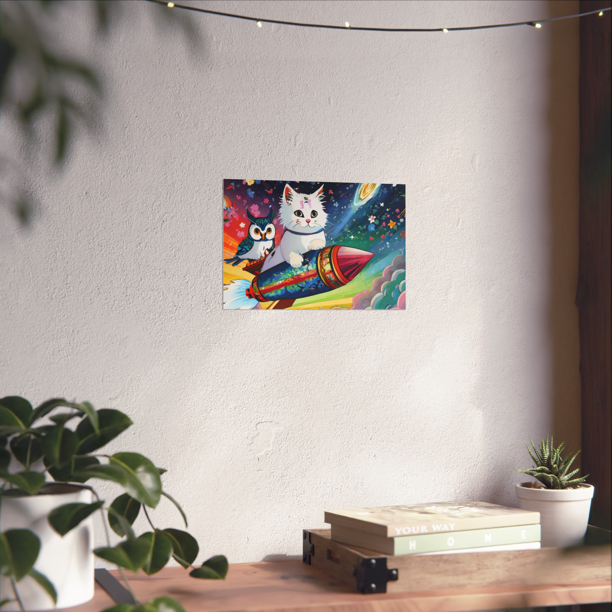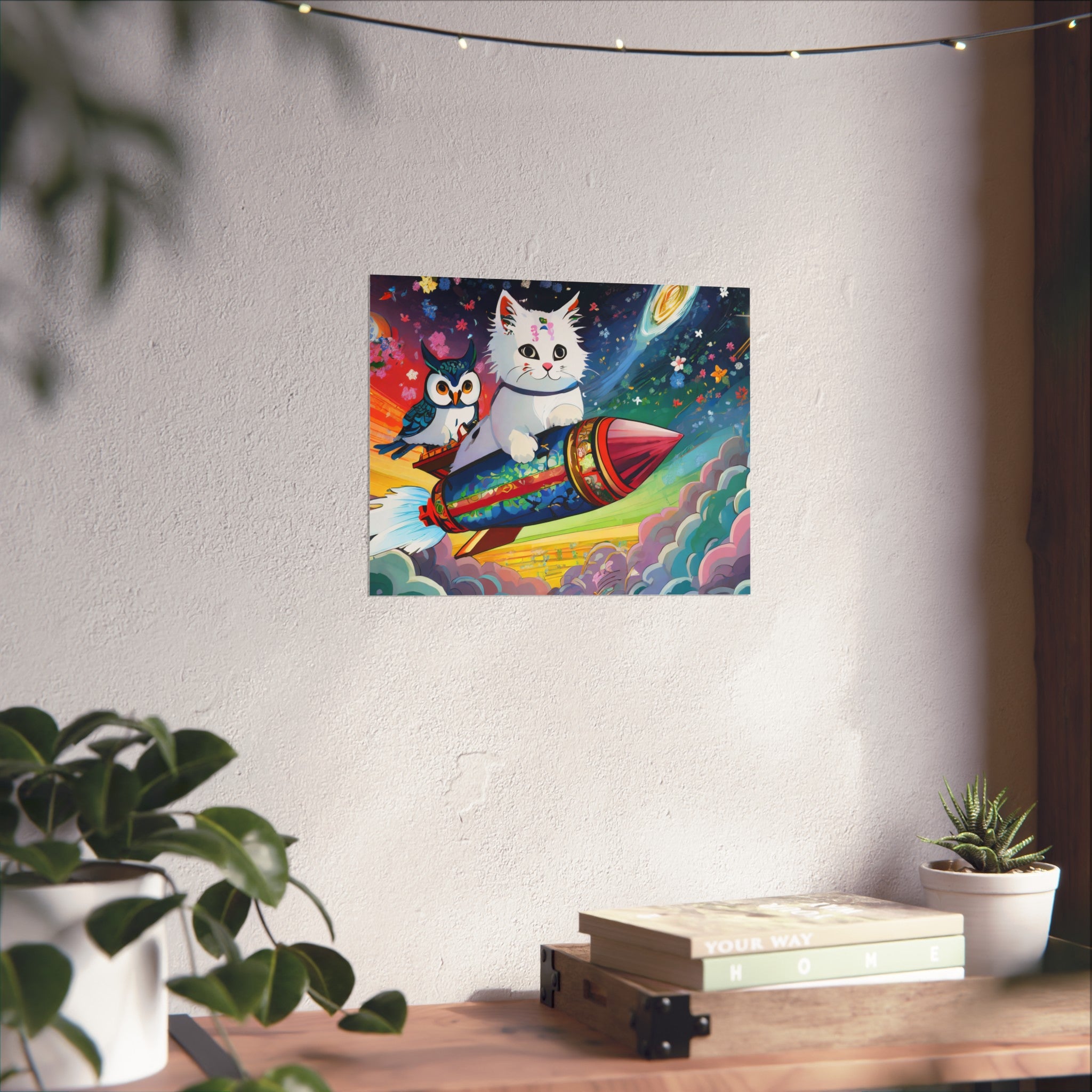 Artwork created, designed and digitally remastered by Sarasvati Designs. A whimsical illustration of a fluffy white cat and cute owl riding a rocket ship.