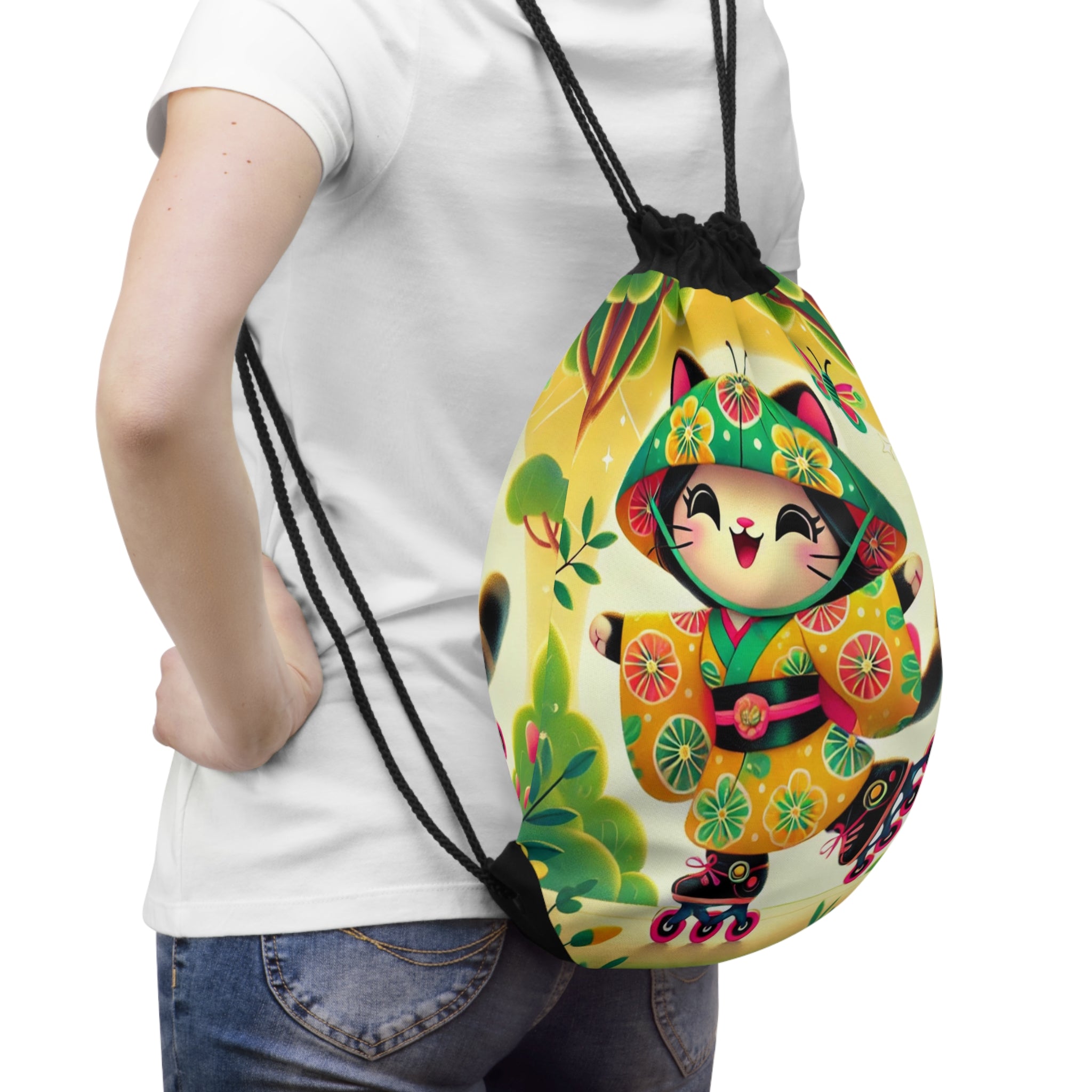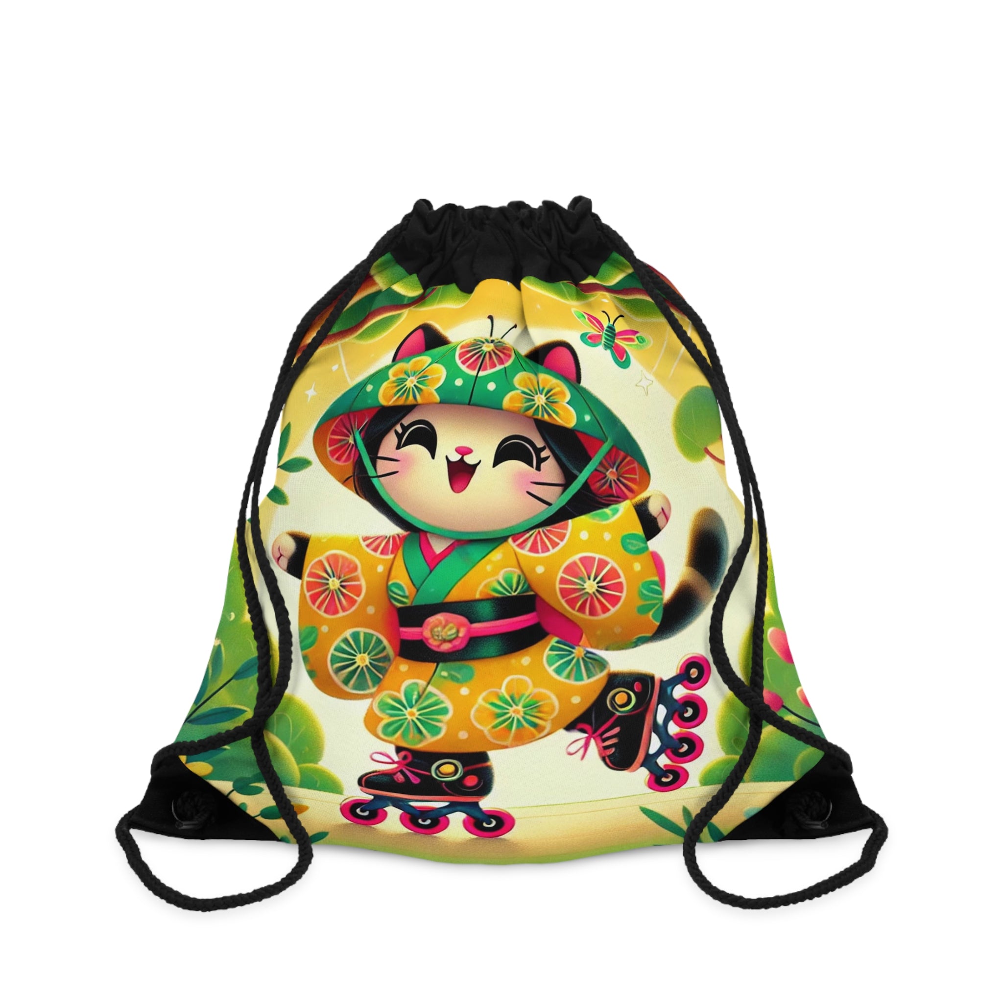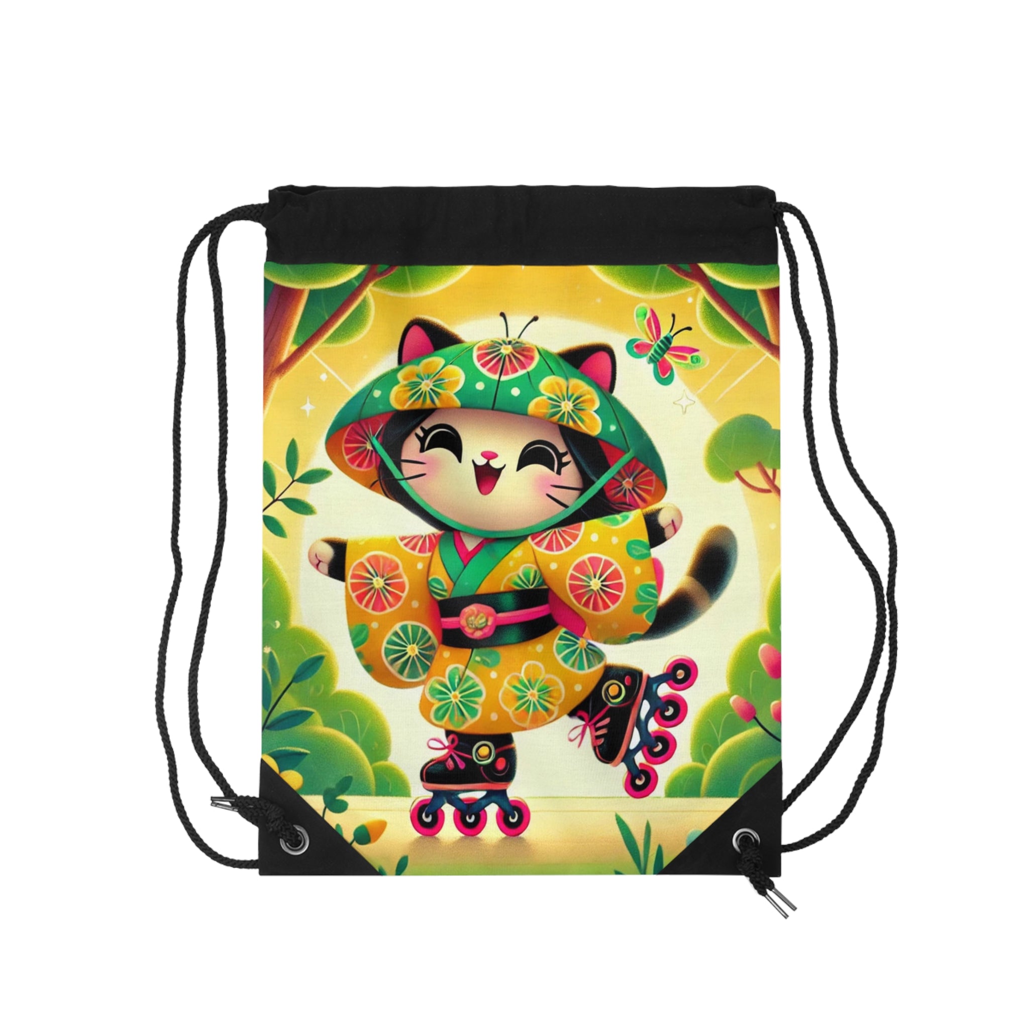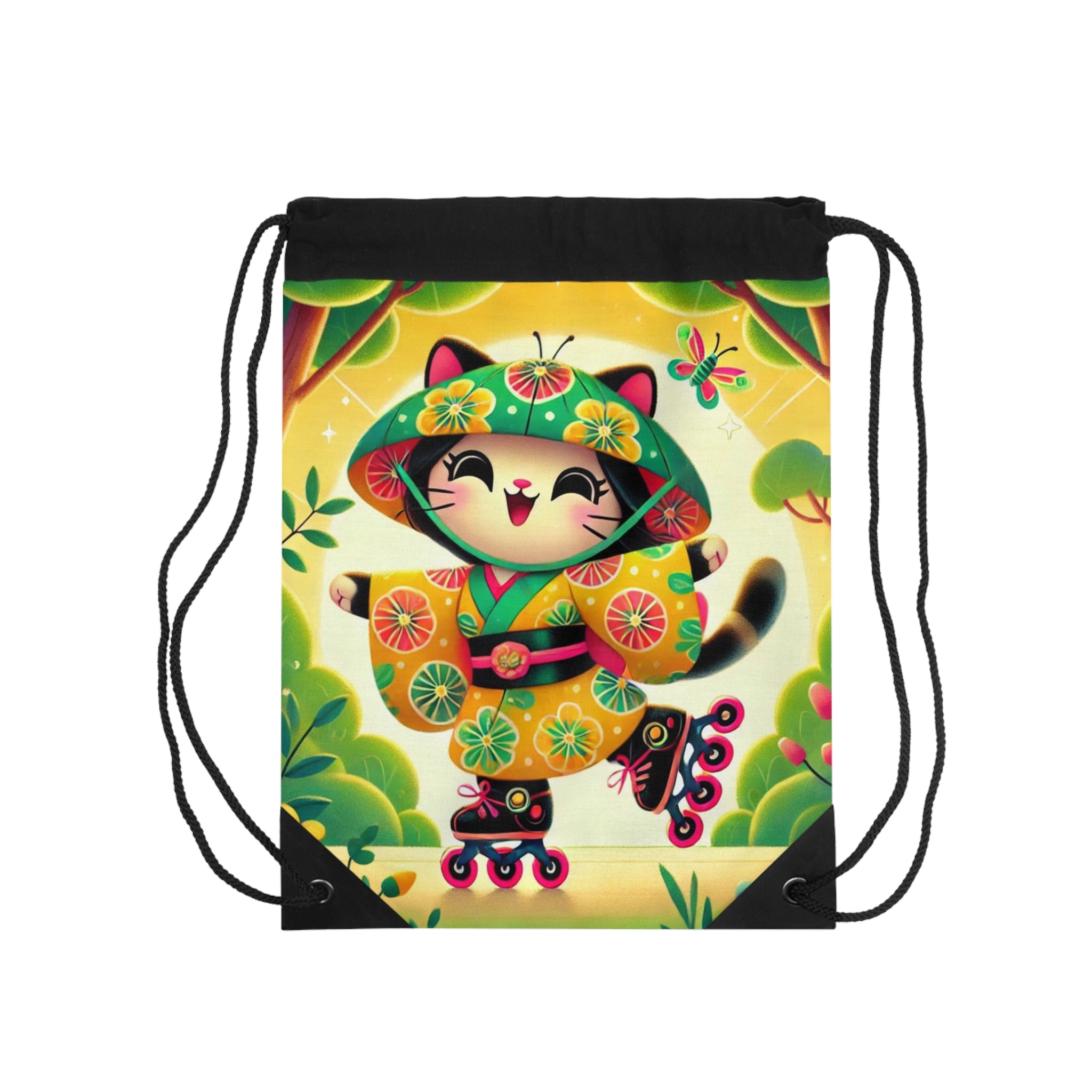 Firefly Dance on Wheels Drawstring Bag blends movement, joy, and artistry in a lightweight, durable design. Perfect for quick trips to the gym, store, or beach, this versatile drawstring bag brings both practicality and charm to your everyday adventures. The Firefly Dance on Wheels artwork features a cheerful geisha kitten gliding gracefully on rollerblades through a vivid, dreamlike landscape. Her flowing kimono, adorned with glowing firefly motifs, captures the sense of energy and motion as she spins through colorful trees and blooming flowers. The lively scene radiates light, spontaneity, and warmth—transforming a simple carryall into a whimsical celebration of freedom and imagination.