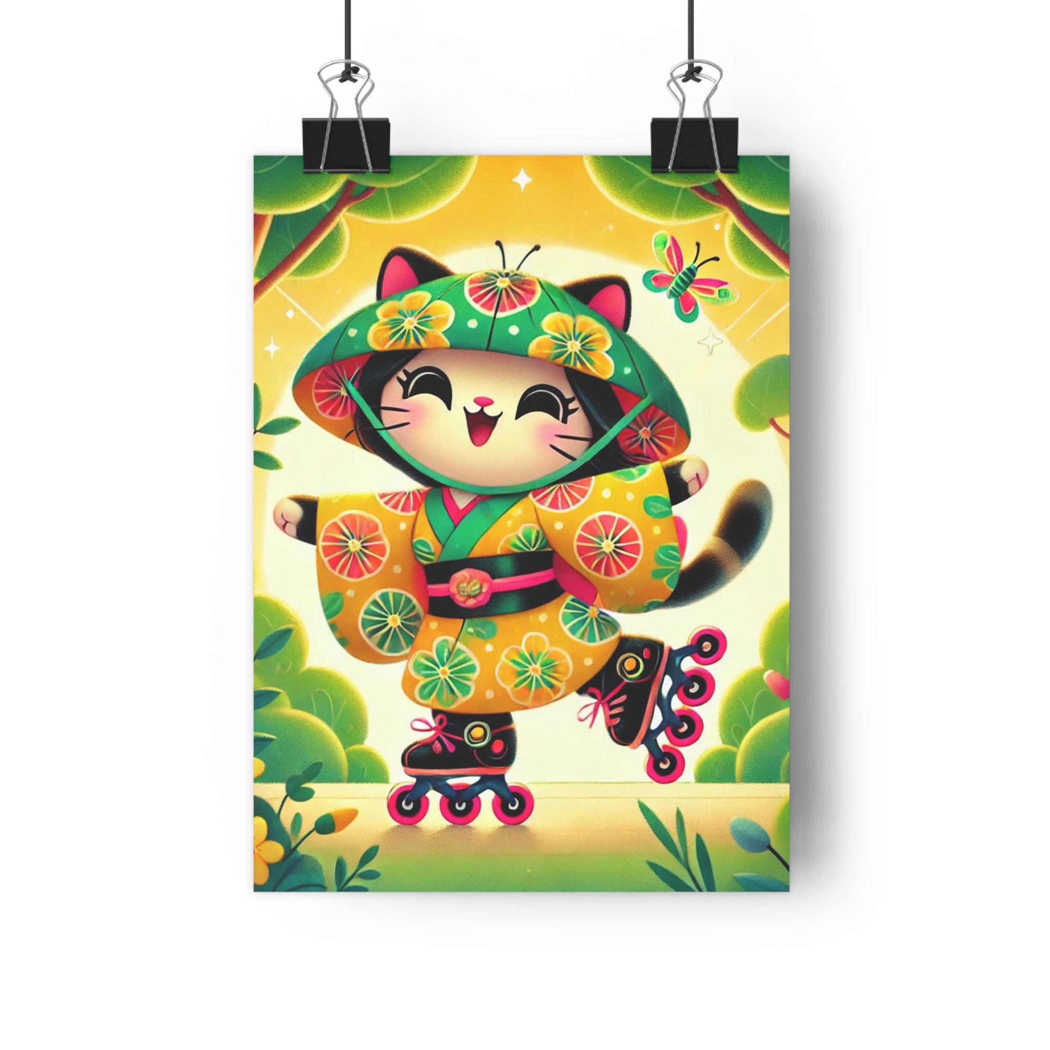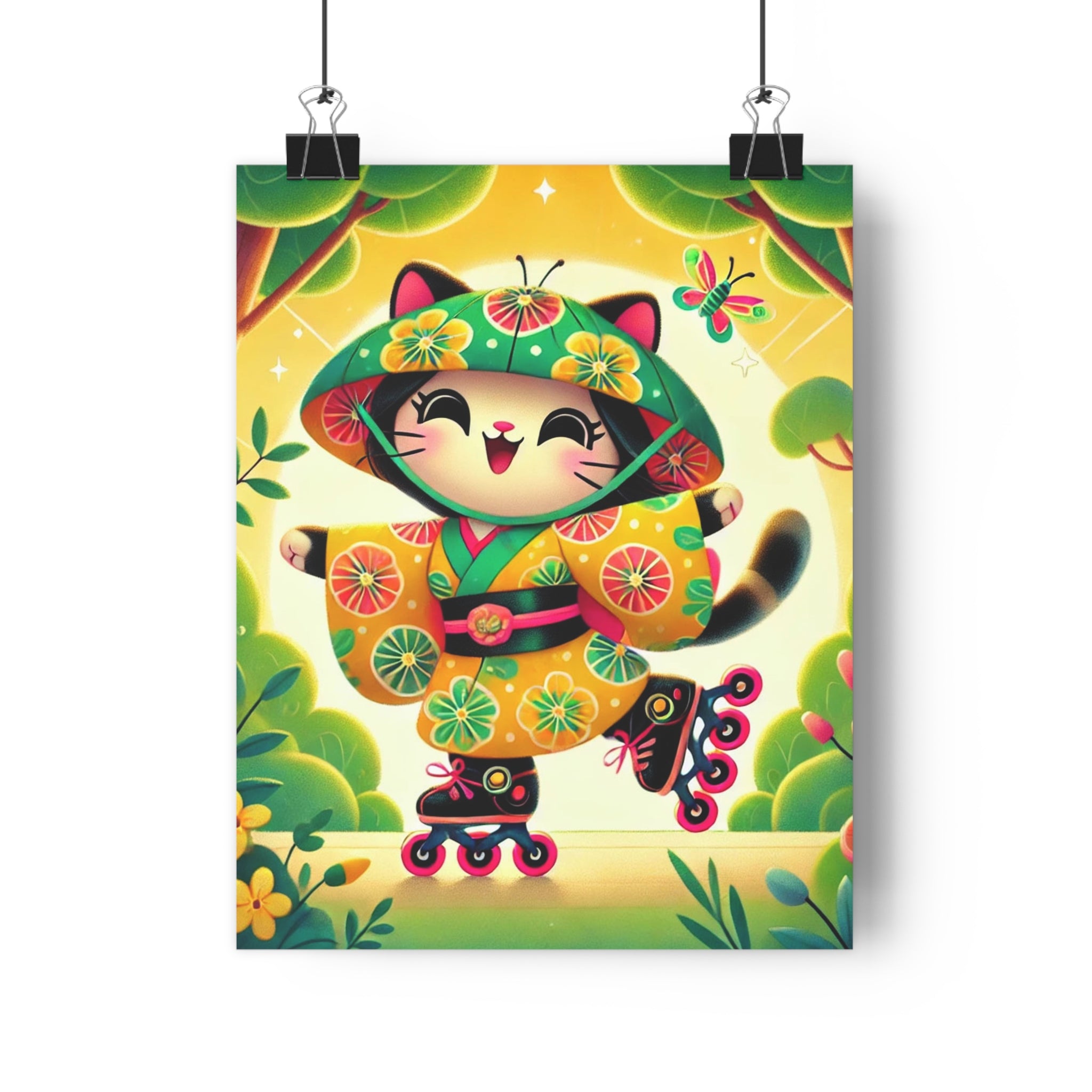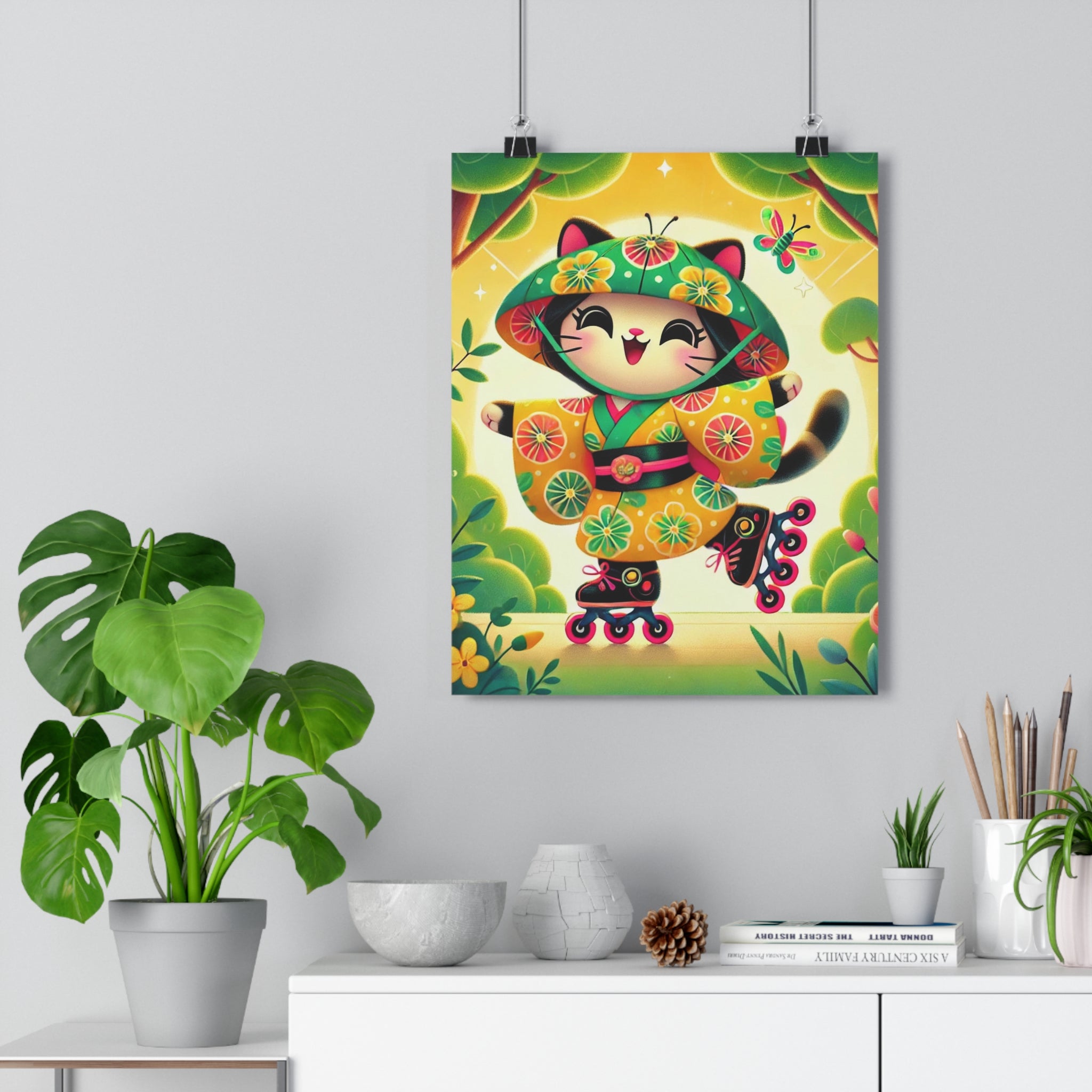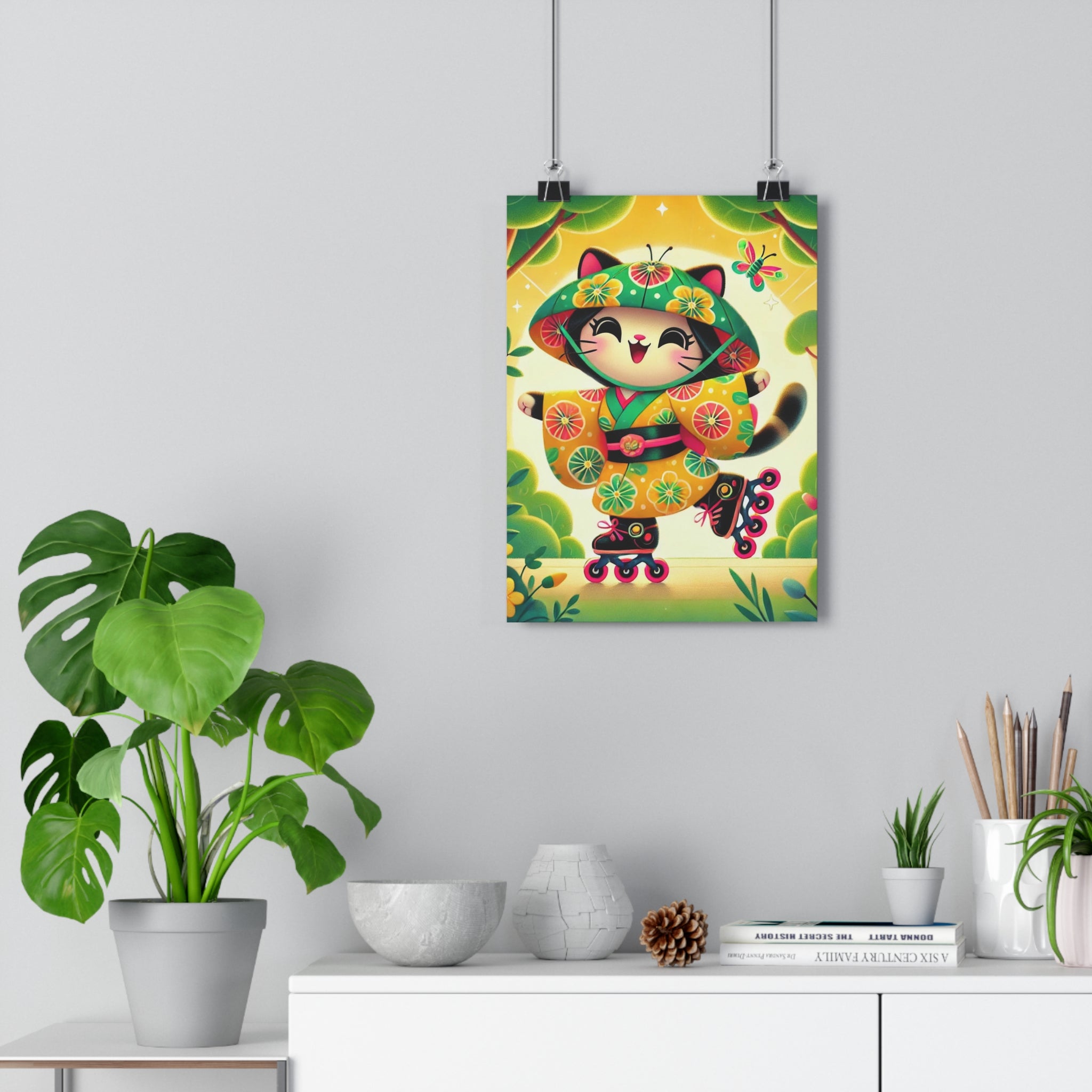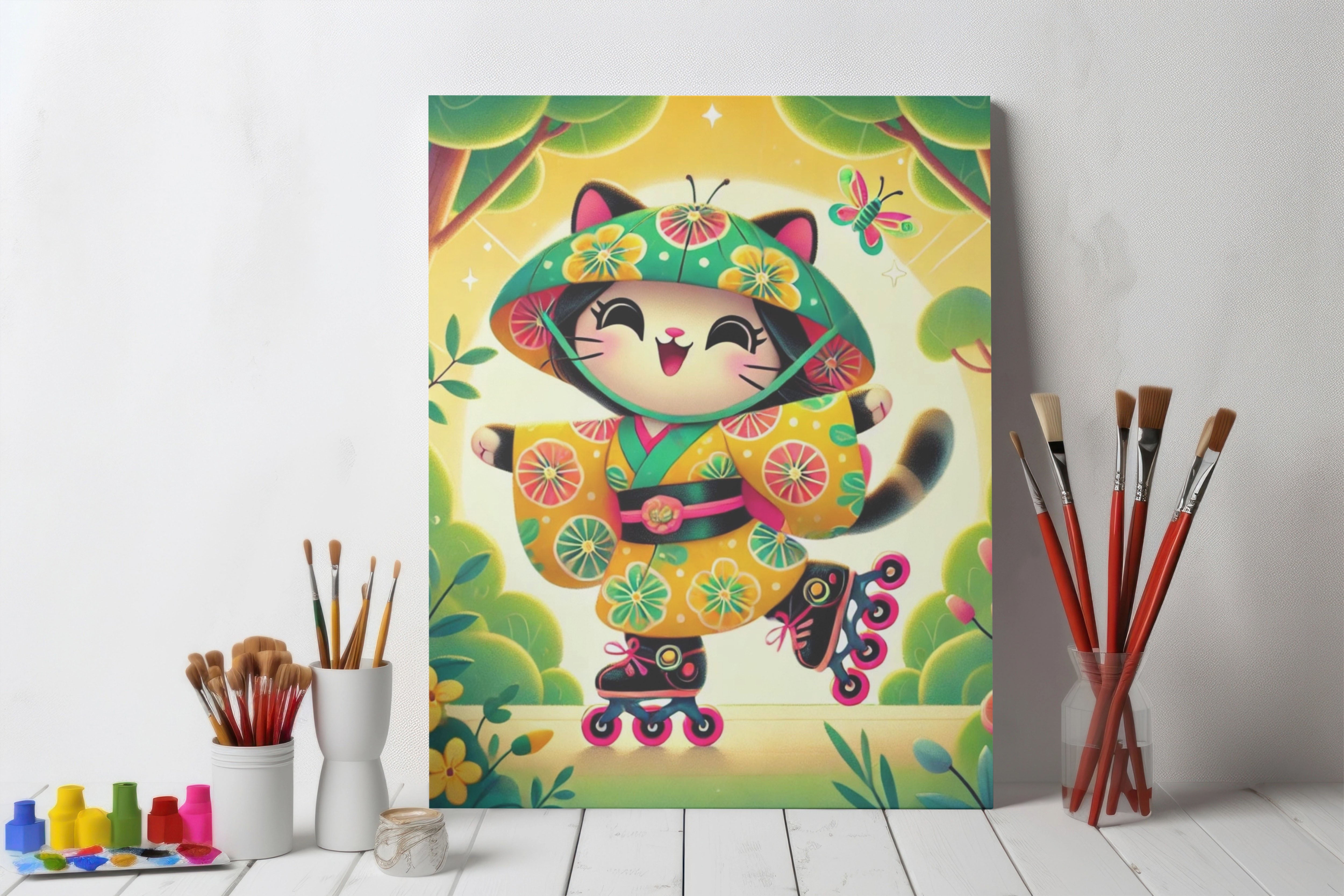 The enchanting artwork, Firefly Dance on Wheels, portrays a cheerful geisha kitten gliding effortlessly on rollerblades through a lush, colorful landscape. She wears a striking kimono adorned with glowing firefly patterns, the flowing fabric illuminated by her joyful motion. Around her, blooming flowers and vividly painted trees shimmer with energy, transforming the scene into a radiant dance of light and life. This delightful fusion of tradition and playfulness evokes the freedom of movement, the warmth of summer, and the magic of imagination.