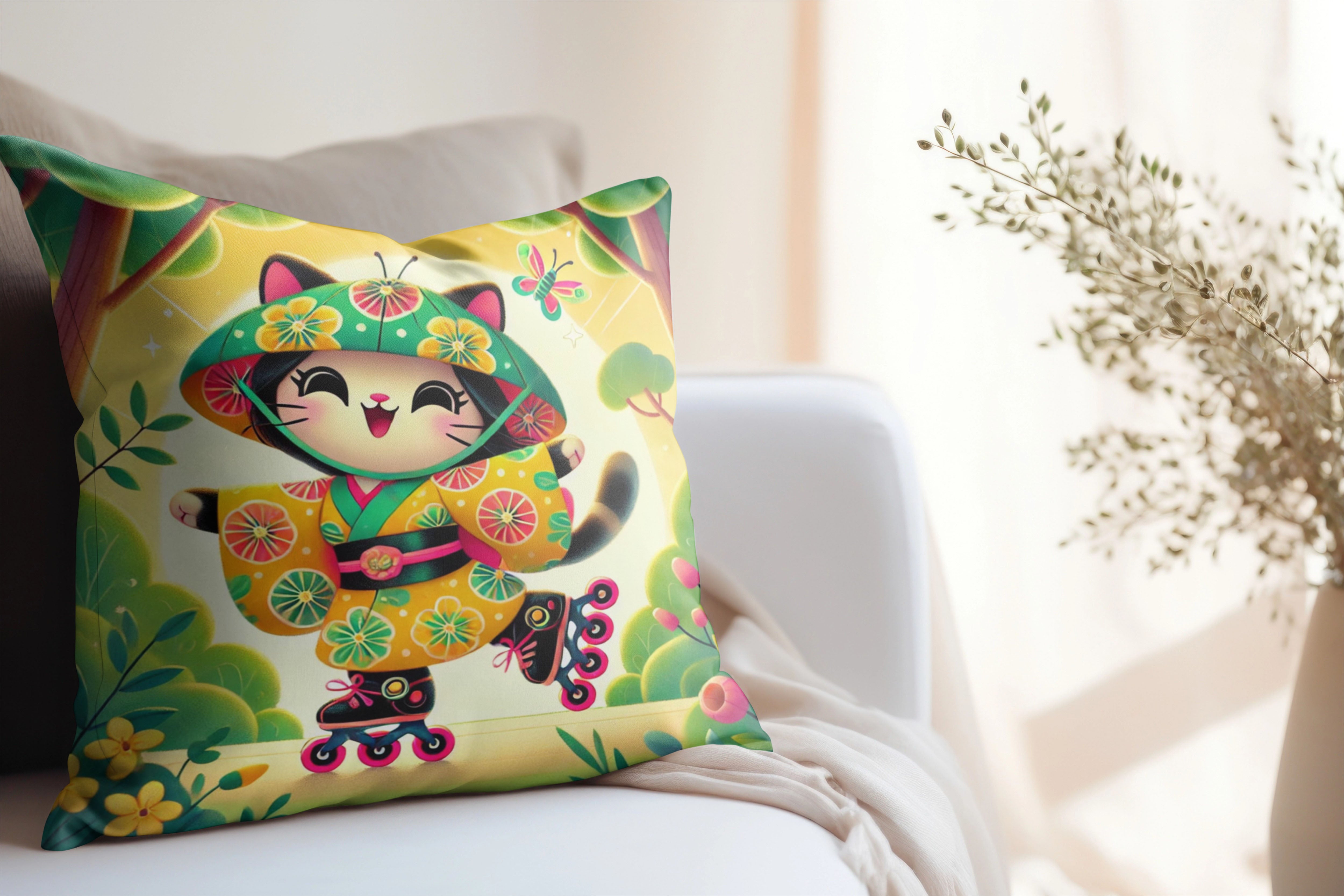 The enchanting artwork, Firefly Dance on Wheels, features a cheerful geisha kitten gliding gracefully on rollerblades through a luminous, dreamlike landscape. She wears a striking kimono adorned with glowing firefly patterns, its flowing fabric capturing the sparkle and motion of her joyful ride. Around her, colorful trees and blooming flowers add life and rhythm to the scene, blending tradition with modern playfulness. Radiating charm, motion, and lighthearted spirit, this design transforms any room into a storybook celebration of creativity and delight.