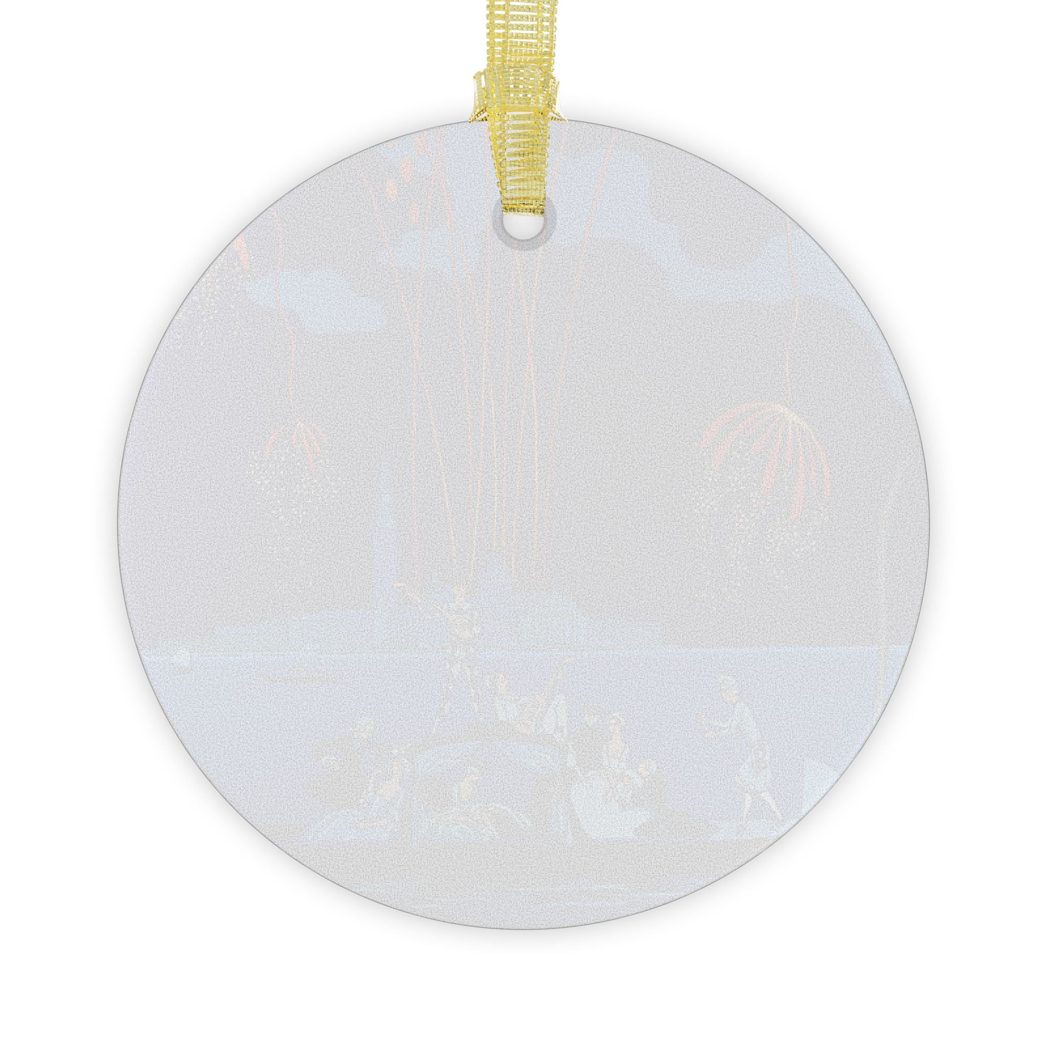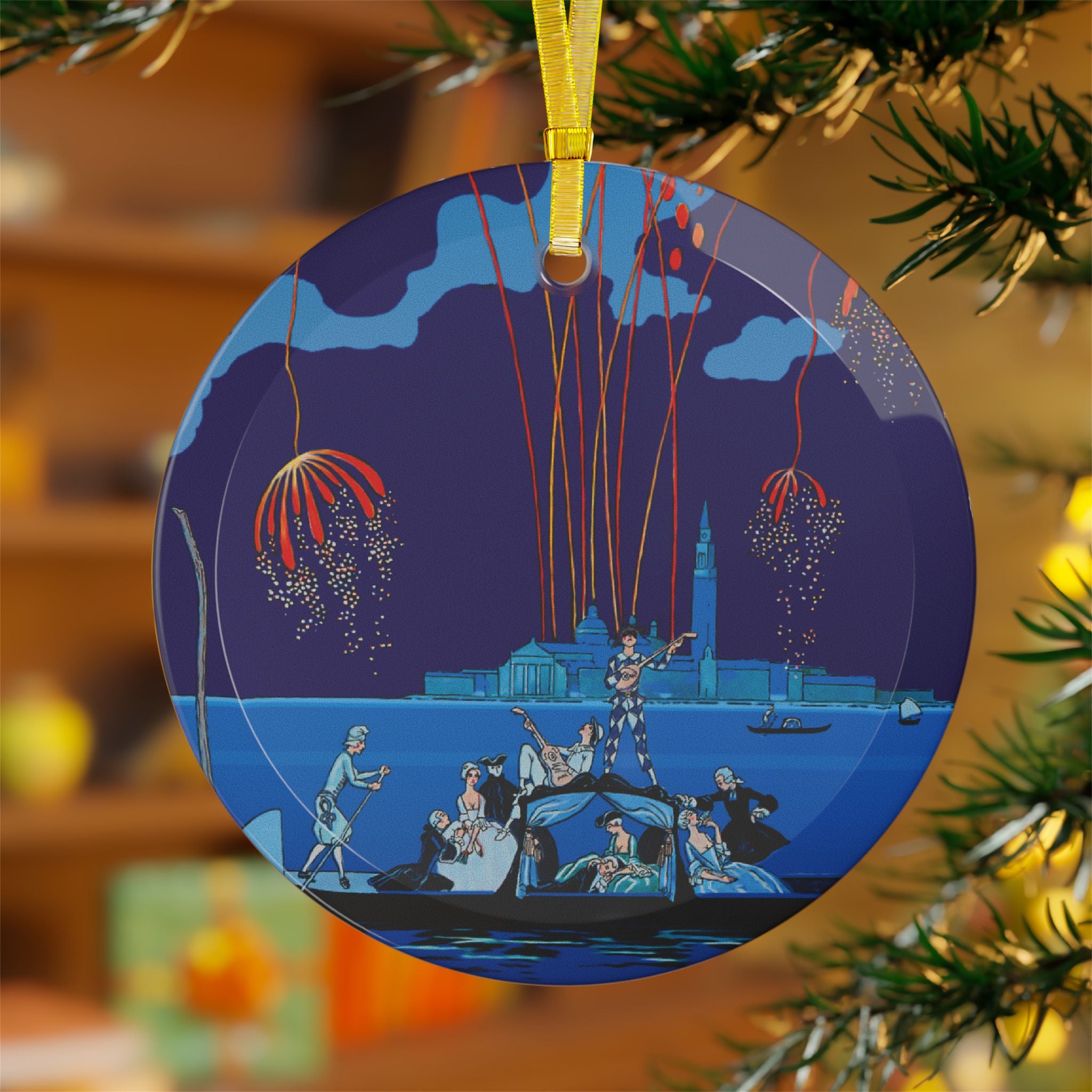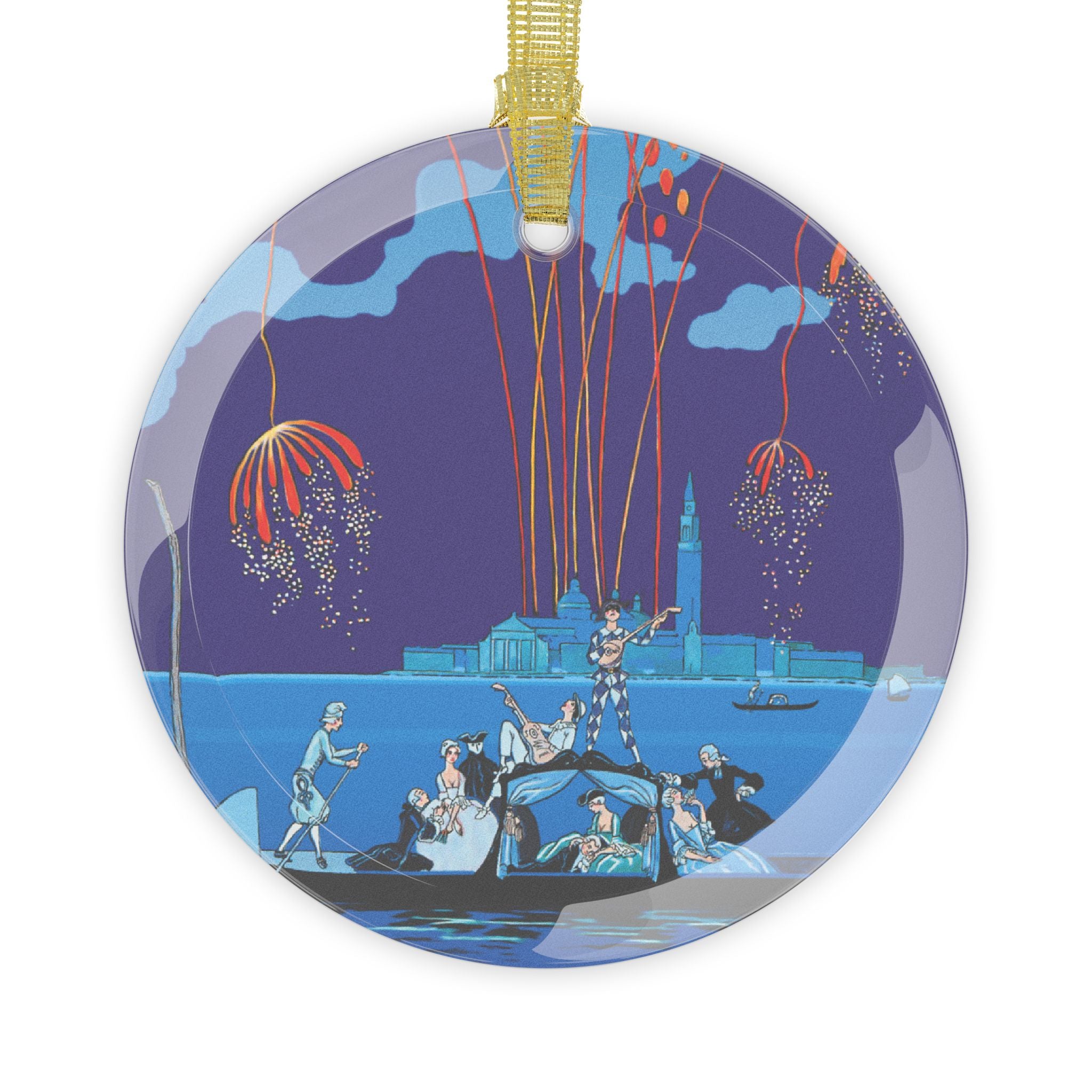 Fireworks in Venice Glass Ornament — Bring elegance to the holidays with this exquisite Art Deco–inspired glass ornament. Available as a single ornament, each piece is crafted from 100% glass and features beveled edges and a gold ribbon for a touch of festive luxury. Perfect for fine art lovers, collectors, and anyone who enjoys stylish décor during the holiday season.