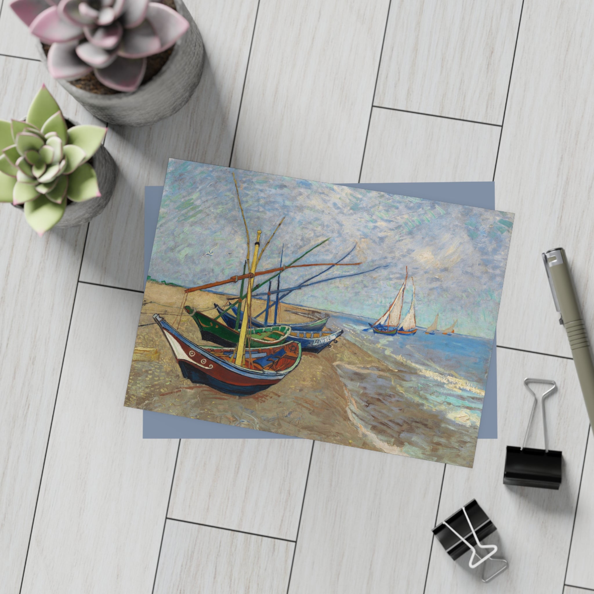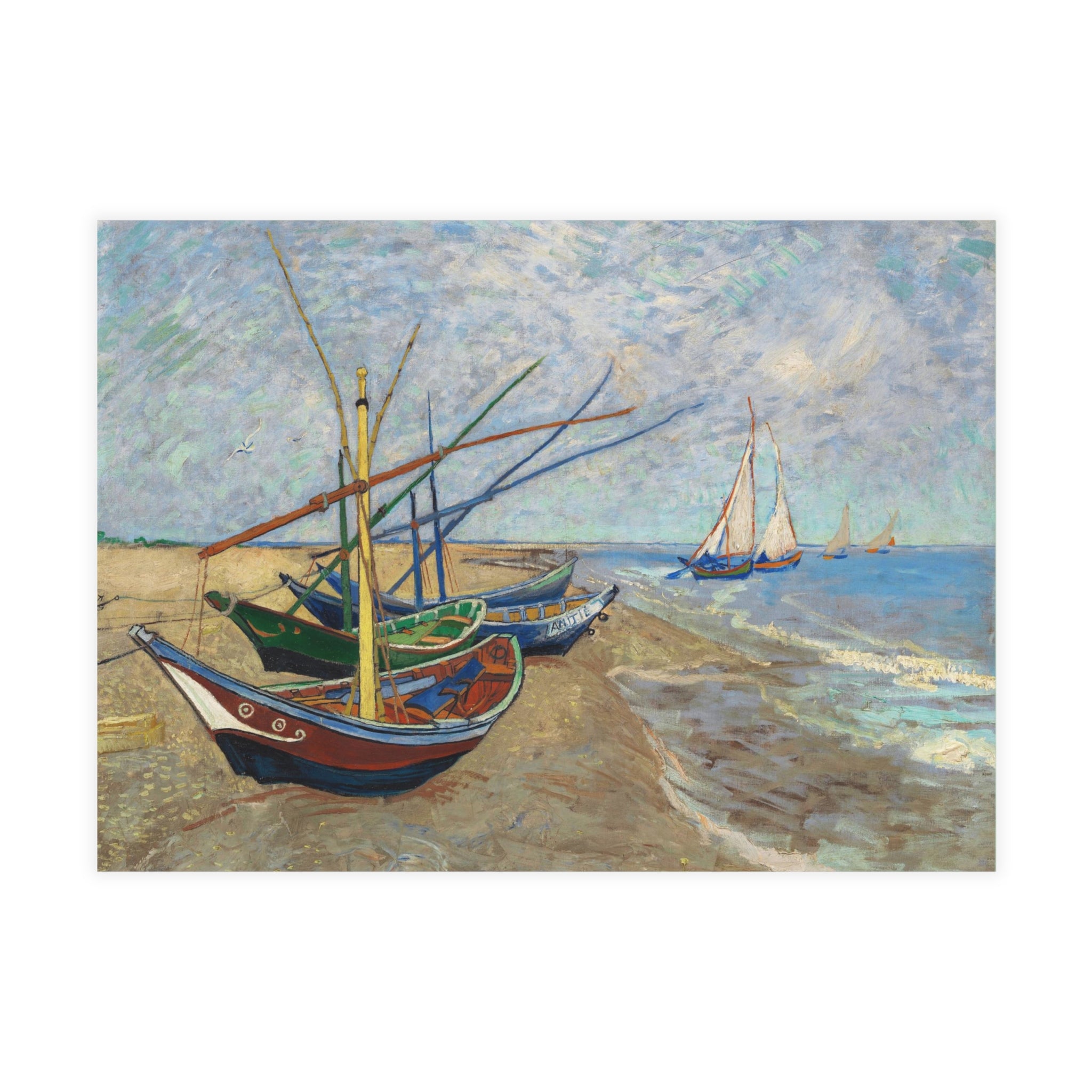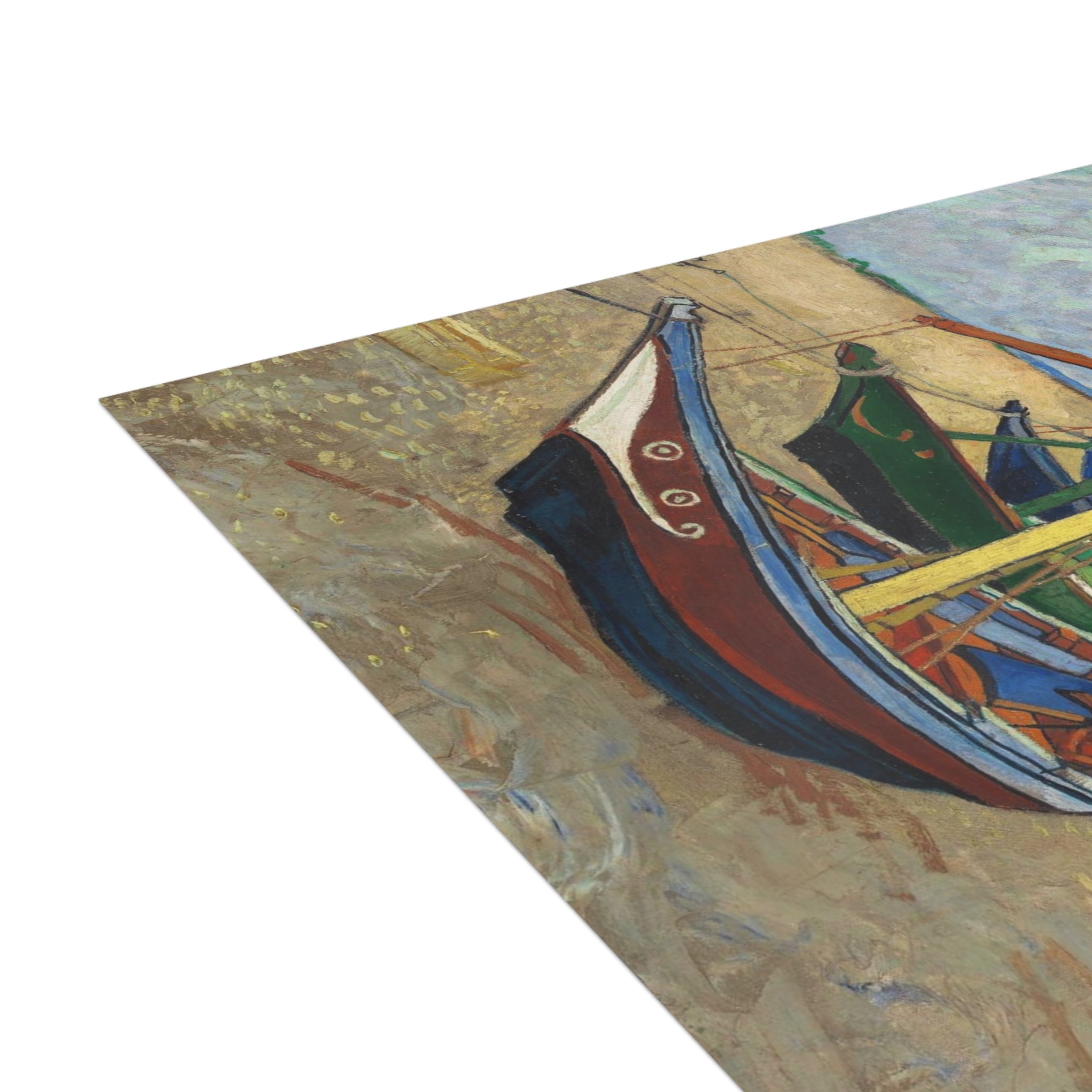 Artwork designed and digitally remastered by Sarasvati Designs. "Fishing Boats on the Beach at Saintes-Maries" is a masterpiece by Vincent Van Gogh, painted. This iconic artwork depicts a serene scene on the Mediterranean coast at Saintes-Maries-de-la-Mer. Van Gogh's use of bold and vibrant colors, such as deep blues and warm yellows, capture the essence of the coastal landscape.