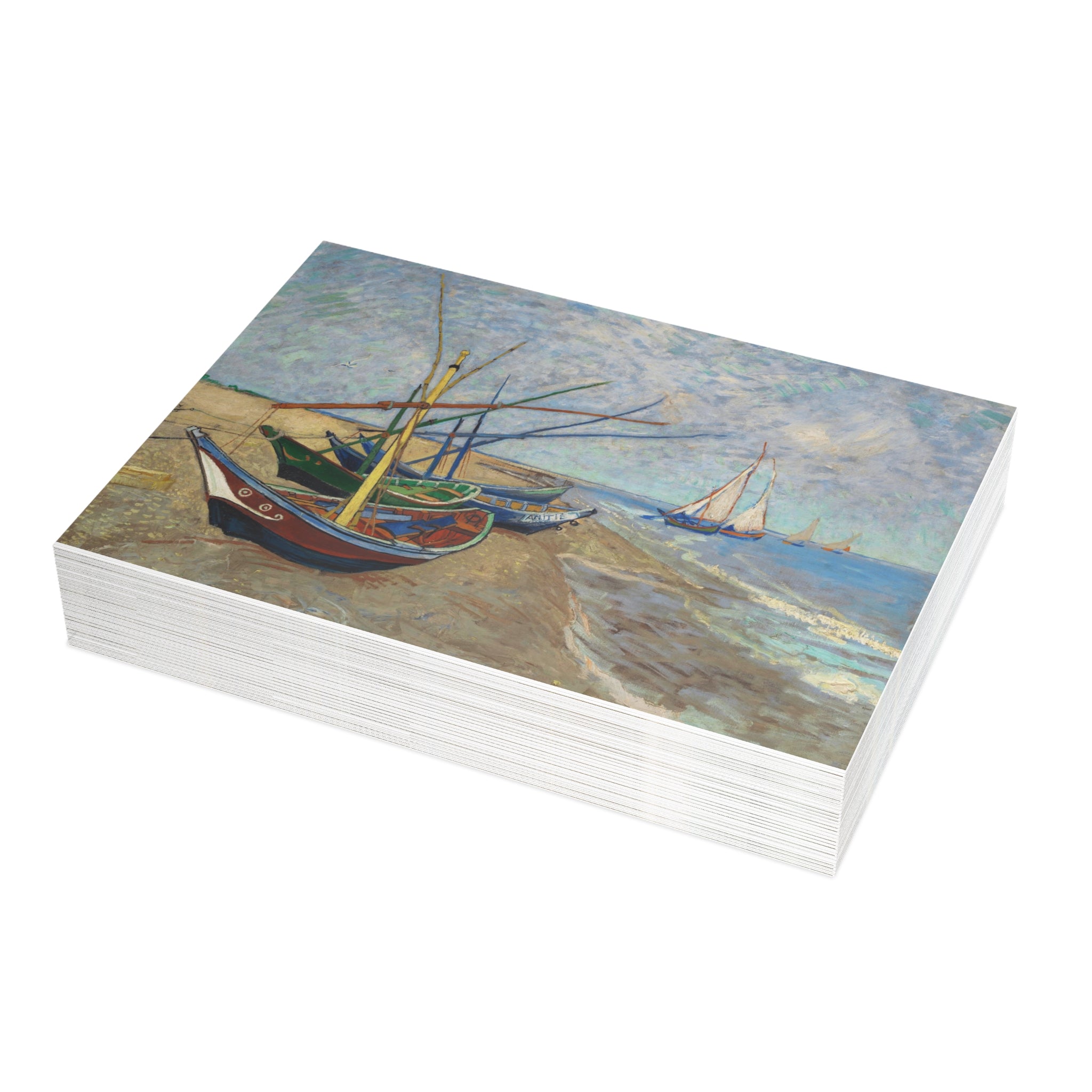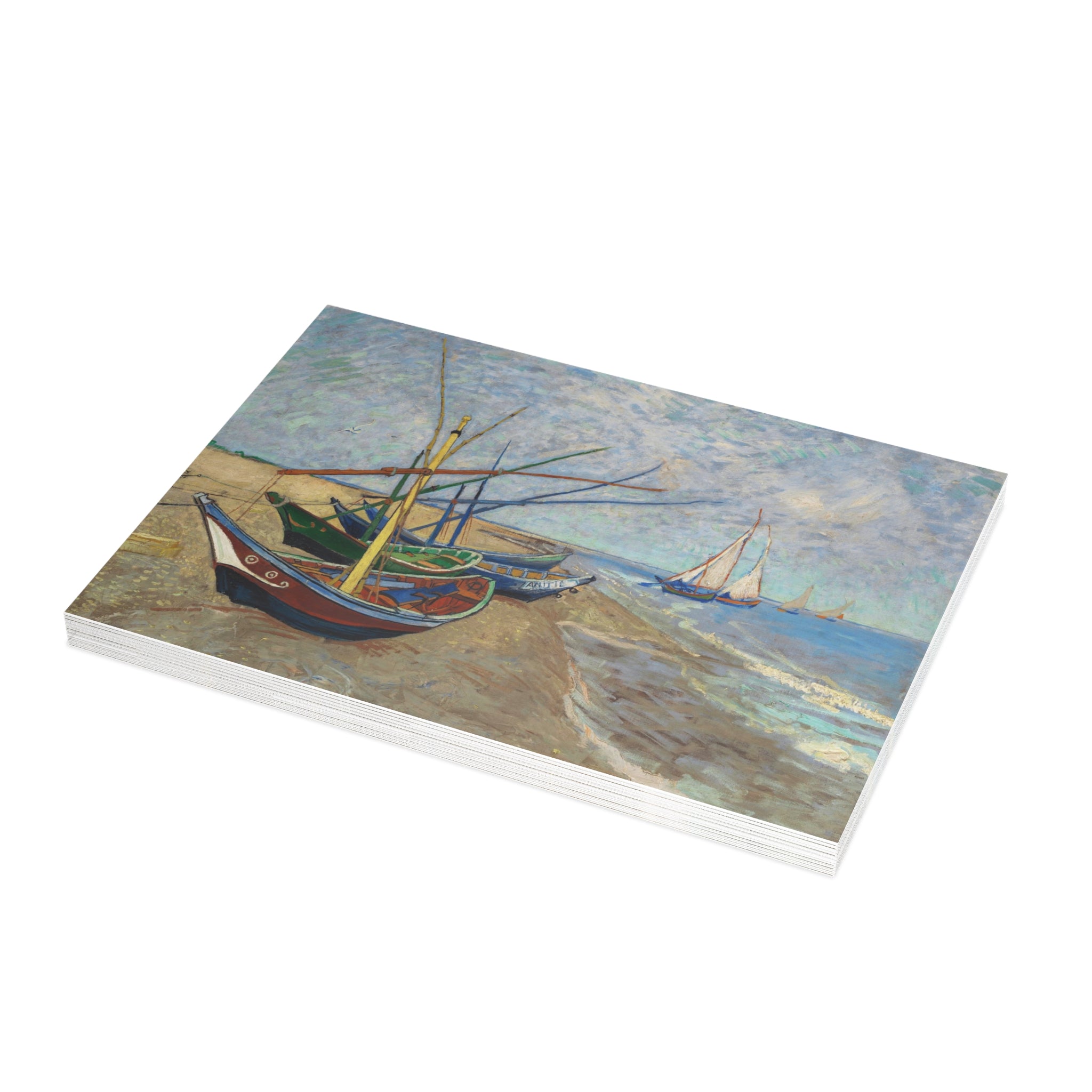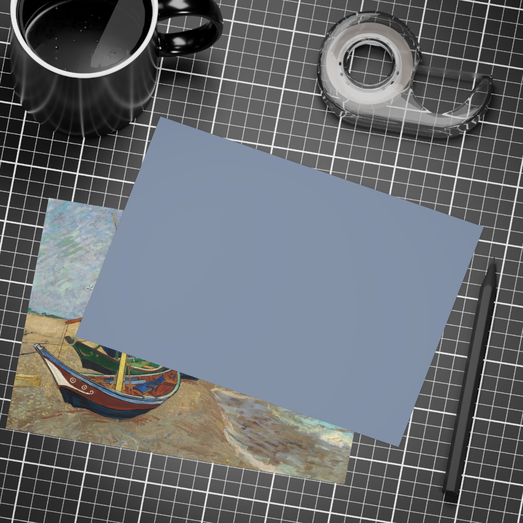 Artwork designed and digitally remastered by Sarasvati Designs. "Fishing Boats on the Beach at Saintes-Maries" is a masterpiece by Vincent Van Gogh, painted. This iconic artwork depicts a serene scene on the Mediterranean coast at Saintes-Maries-de-la-Mer. Van Gogh's use of bold and vibrant colors, such as deep blues and warm yellows, capture the essence of the coastal landscape.