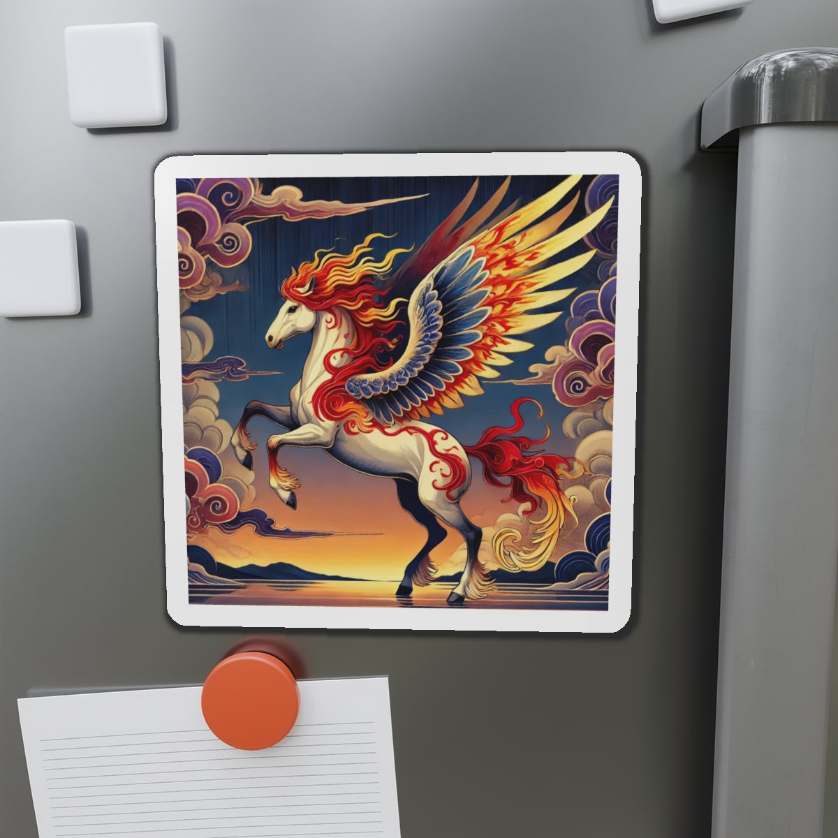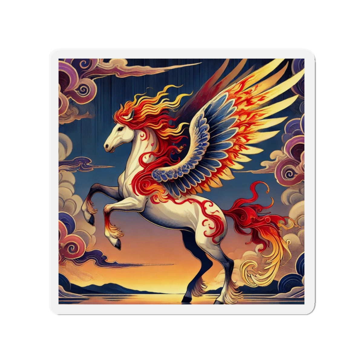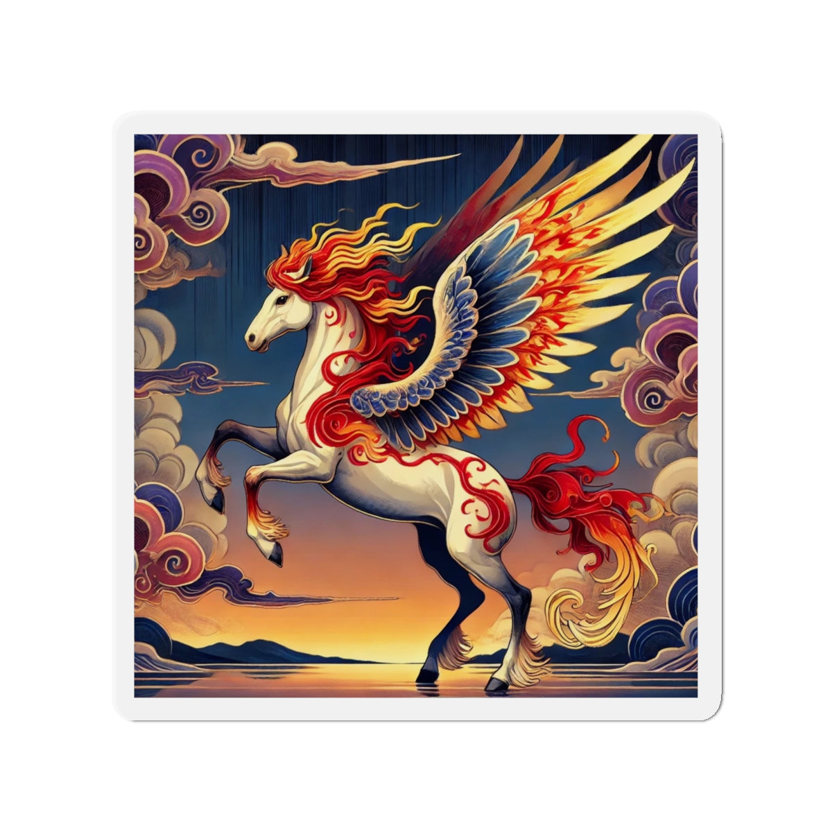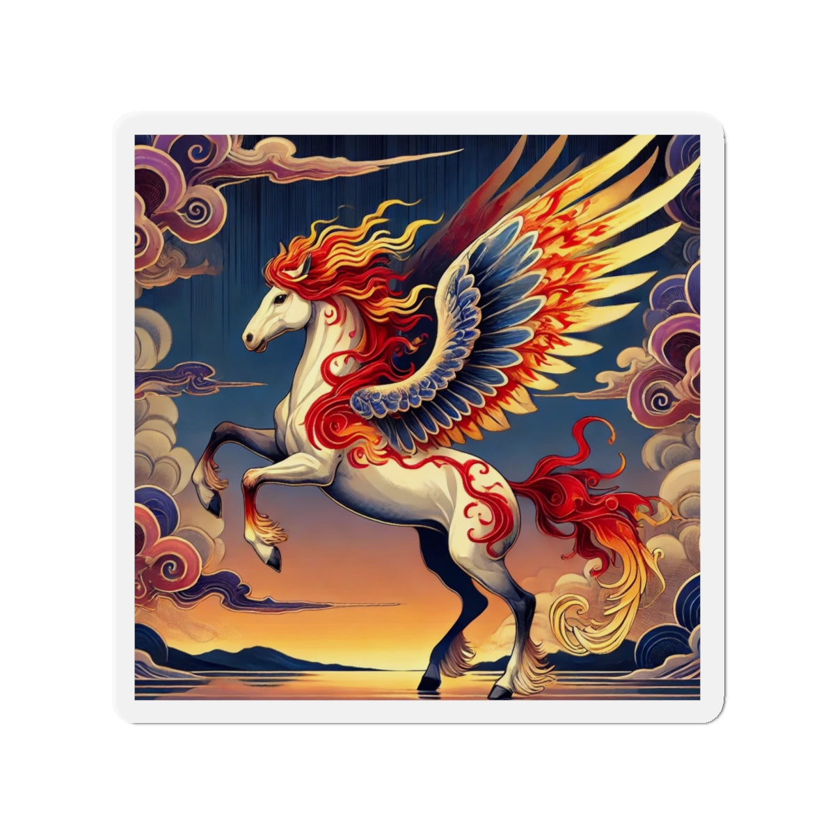 Durable die-cut magnets available in 4 sizes, combining practicality with art. They feature a flawless ukiyo-e inspired scene of a noble horse rearing with flame-patterned wings in red, orange, and gold. Indigo and silver markings swirl across its flanks, while a sunset sky of deep blues and purples reflects over a tranquil sea. Strong, flexible, and timeless, these magnets transform everyday spaces into showcases of mythic beauty.