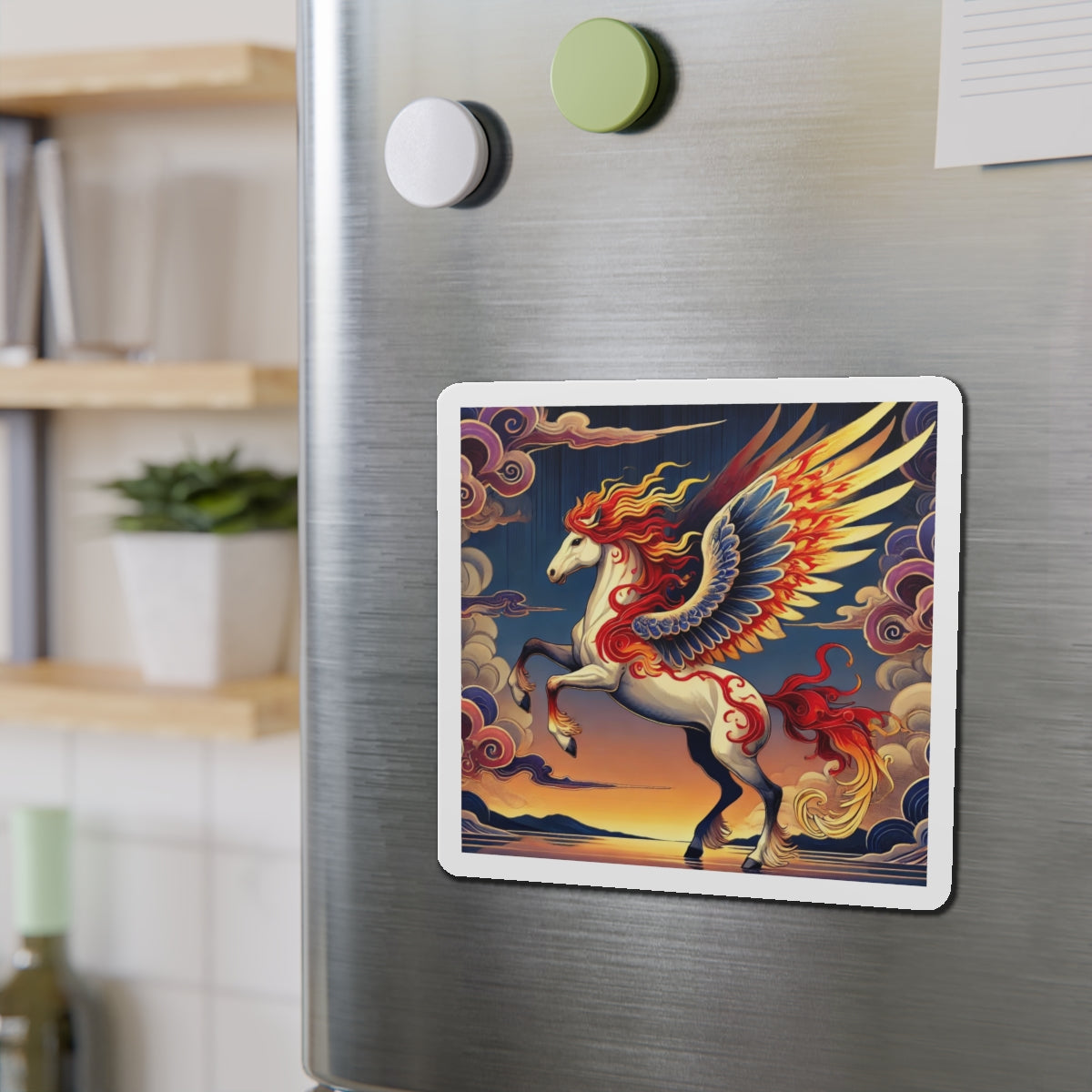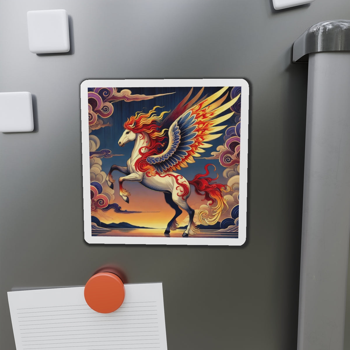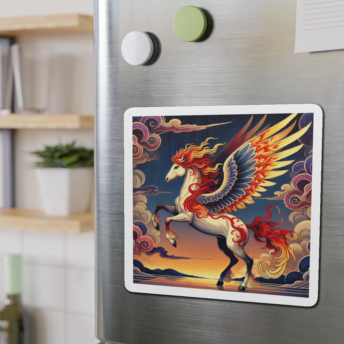 Durable die-cut magnets available in 4 sizes, combining practicality with art. They feature a flawless ukiyo-e inspired scene of a noble horse rearing with flame-patterned wings in red, orange, and gold. Indigo and silver markings swirl across its flanks, while a sunset sky of deep blues and purples reflects over a tranquil sea. Strong, flexible, and timeless, these magnets transform everyday spaces into showcases of mythic beauty.