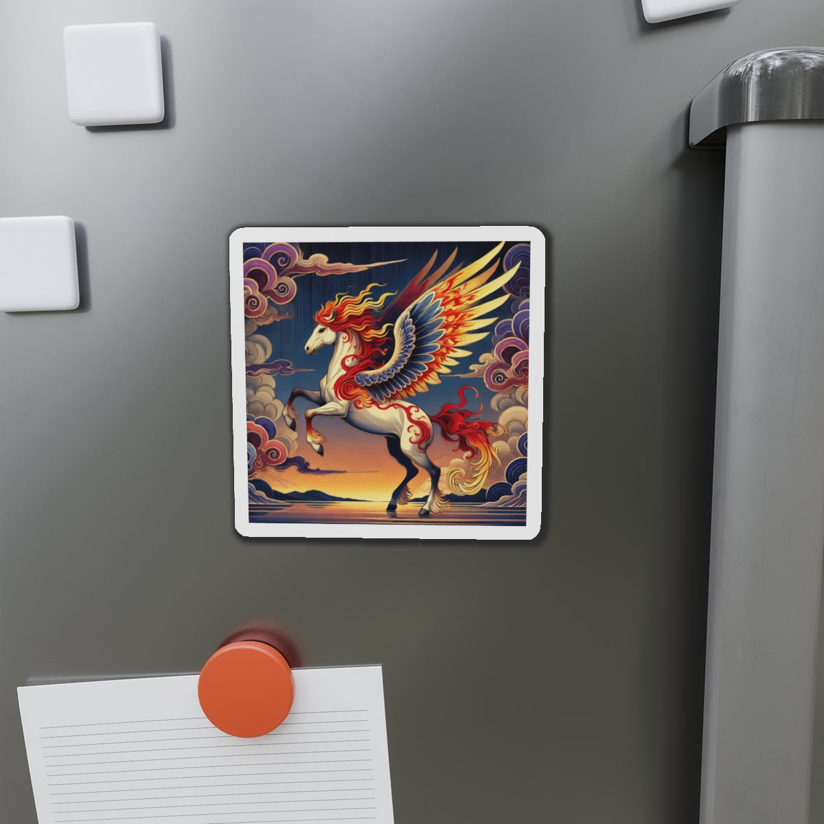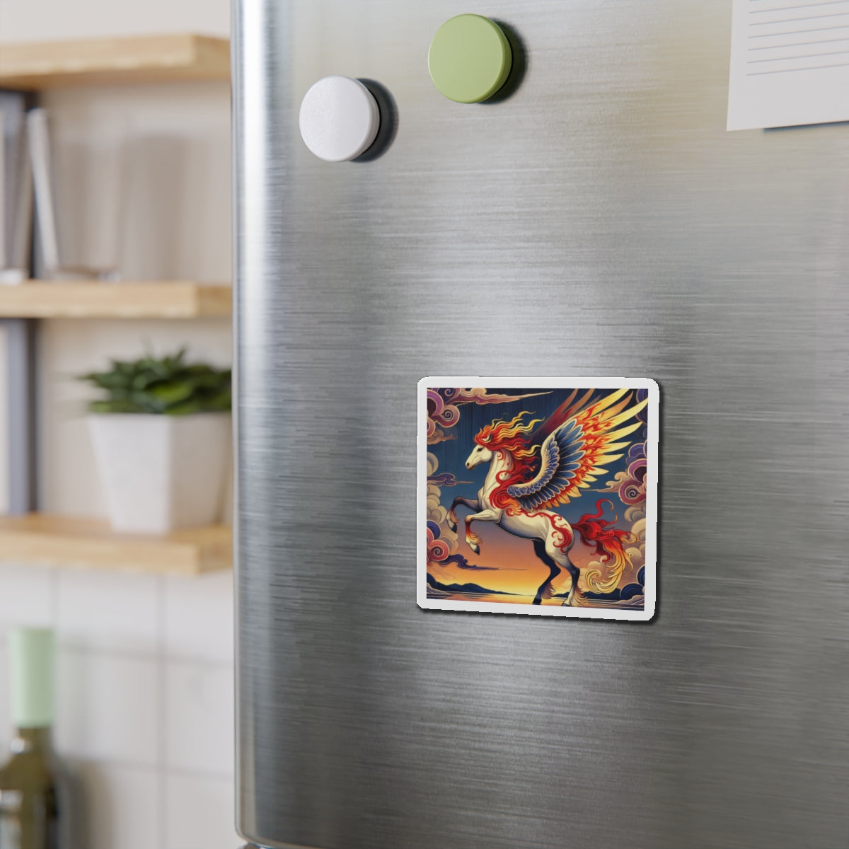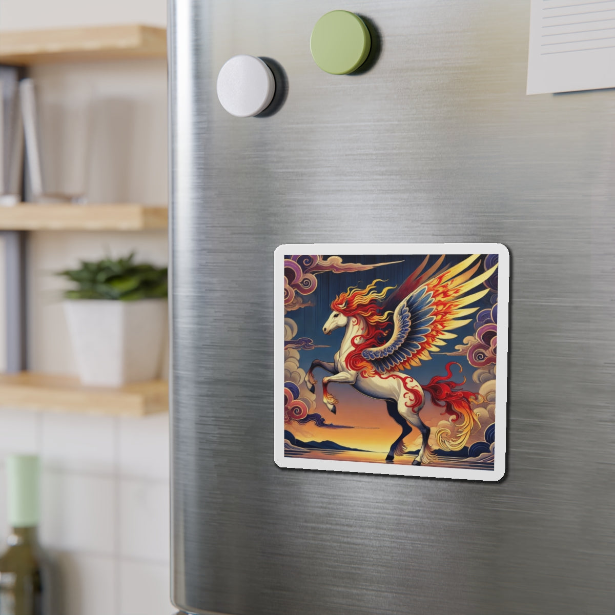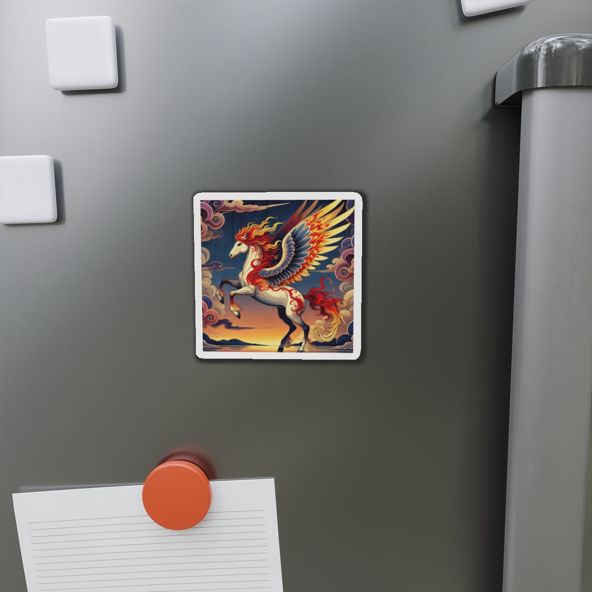 Durable die-cut magnets available in 4 sizes, combining practicality with art. They feature a flawless ukiyo-e inspired scene of a noble horse rearing with flame-patterned wings in red, orange, and gold. Indigo and silver markings swirl across its flanks, while a sunset sky of deep blues and purples reflects over a tranquil sea. Strong, flexible, and timeless, these magnets transform everyday spaces into showcases of mythic beauty.
