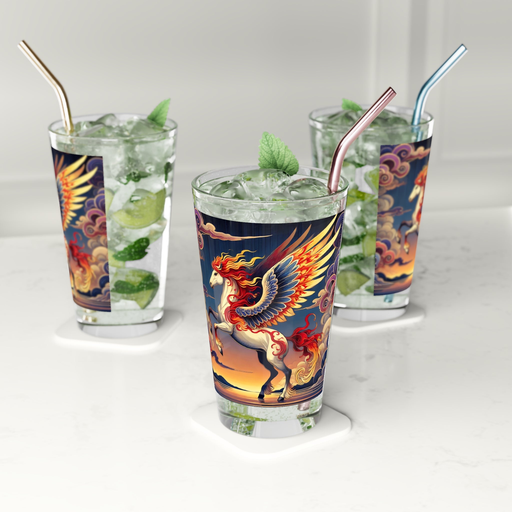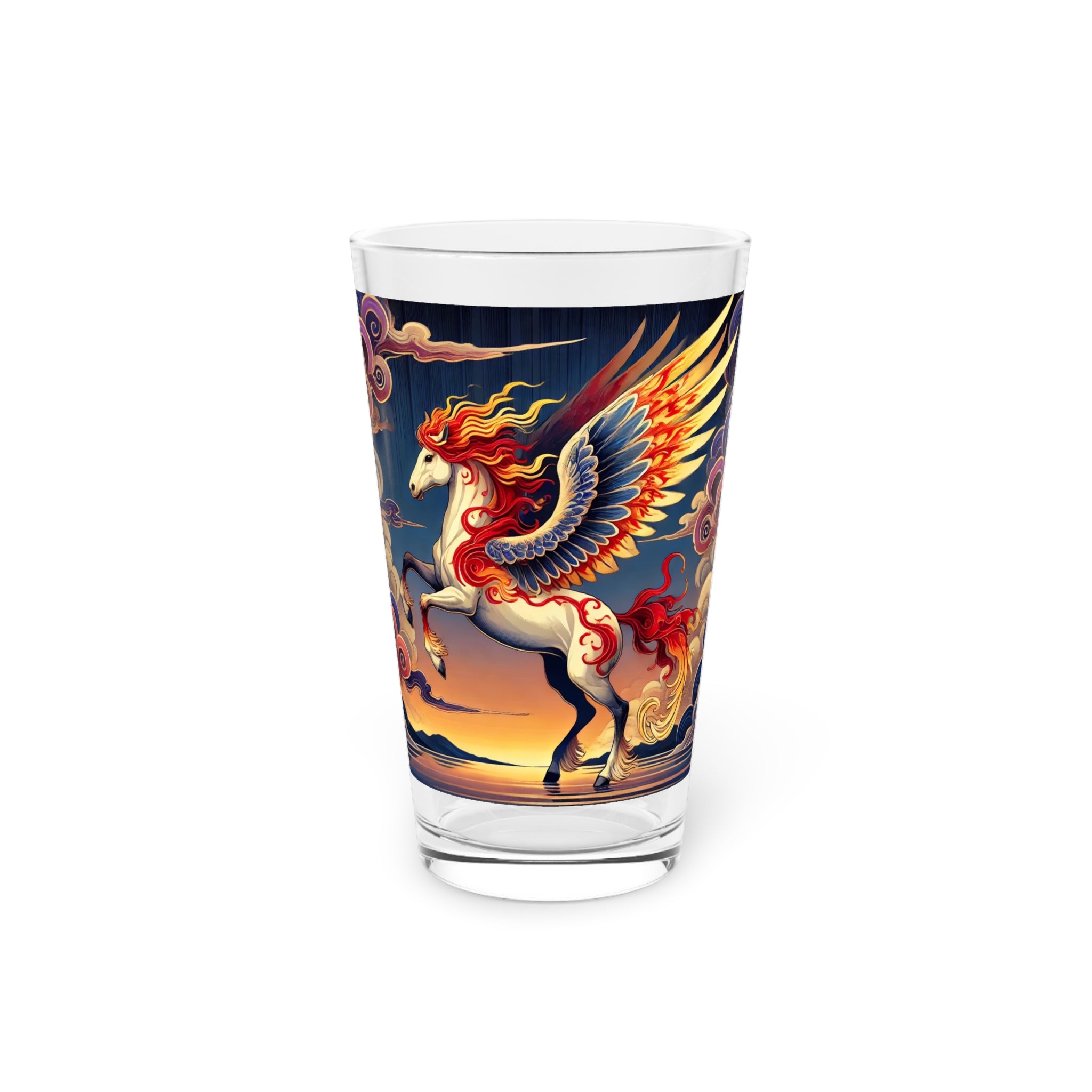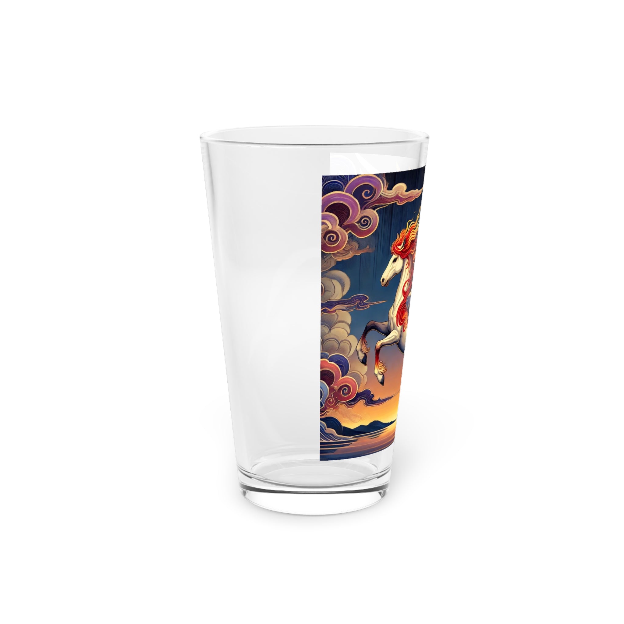 This 16oz pint glass is both practical and artistic, perfect for daily use or gifting. Its clear, durable design showcases a striking scene of a noble horse rearing with flame-patterned wings of red, orange, and gold. Indigo and silver markings swirl across its flanks as a stylized sunset sky reflects over a tranquil sea. Combining function with bold ukiyo-e elegance and Kabuki-inspired drama, this glass brings beauty to every pour.