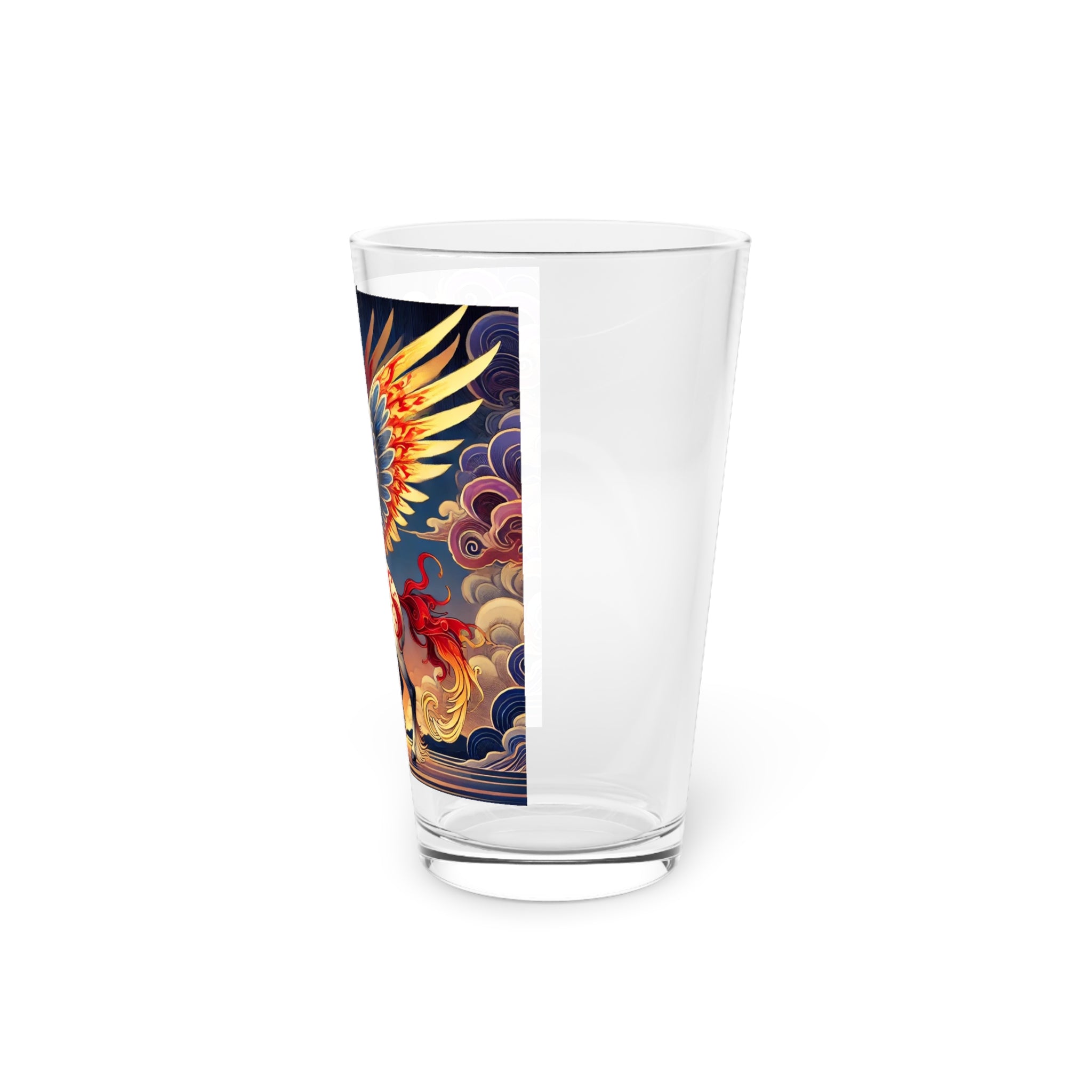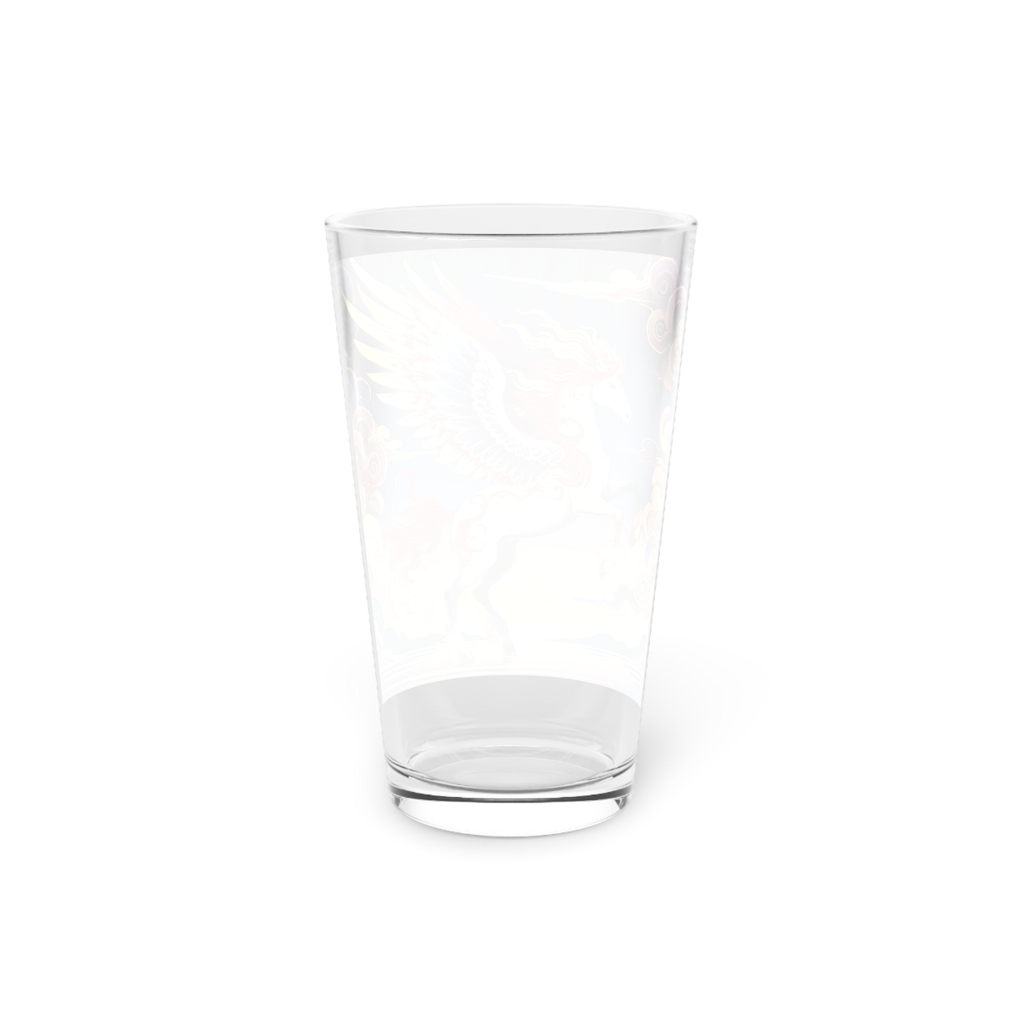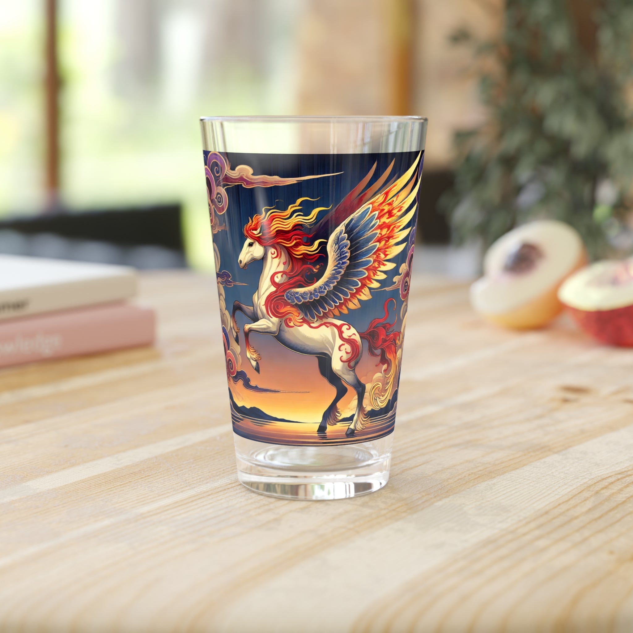 This 16oz pint glass is both practical and artistic, perfect for daily use or gifting. Its clear, durable design showcases a striking scene of a noble horse rearing with flame-patterned wings of red, orange, and gold. Indigo and silver markings swirl across its flanks as a stylized sunset sky reflects over a tranquil sea. Combining function with bold ukiyo-e elegance and Kabuki-inspired drama, this glass brings beauty to every pour.