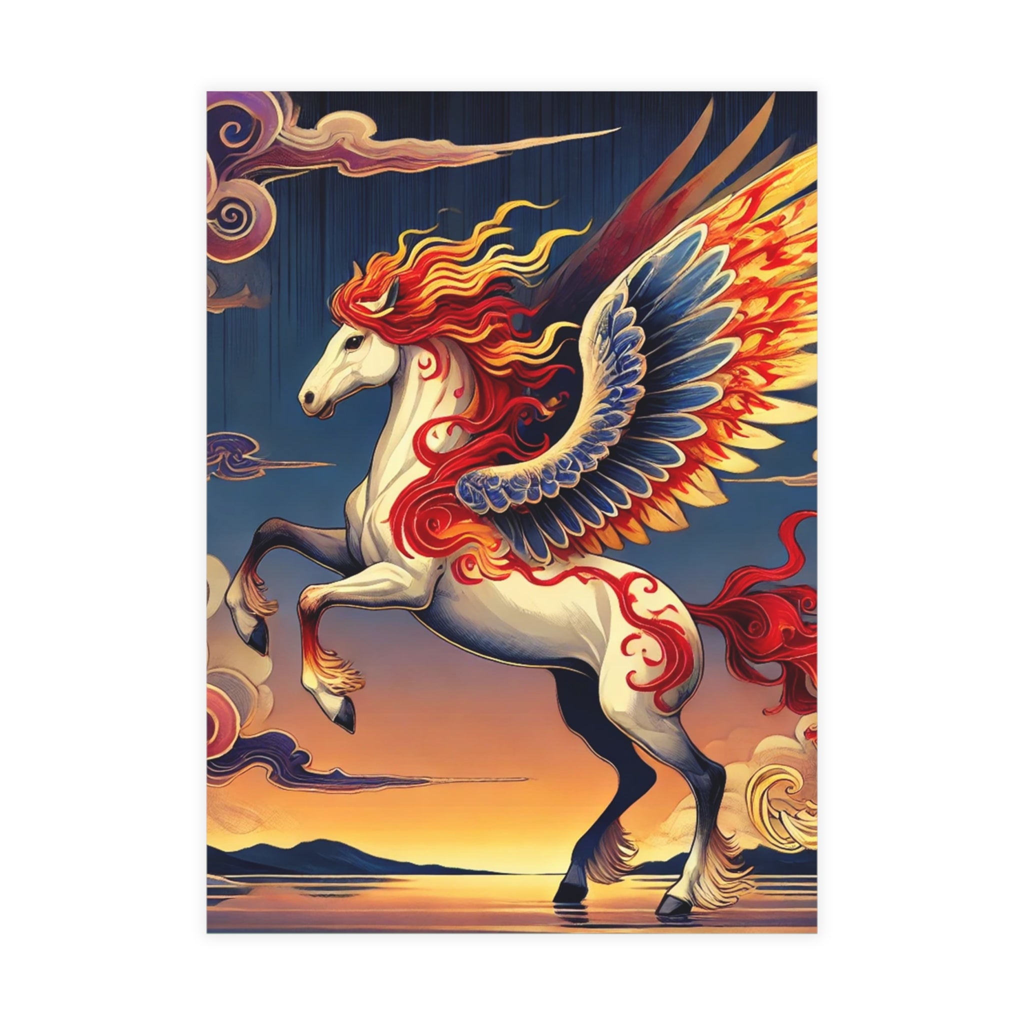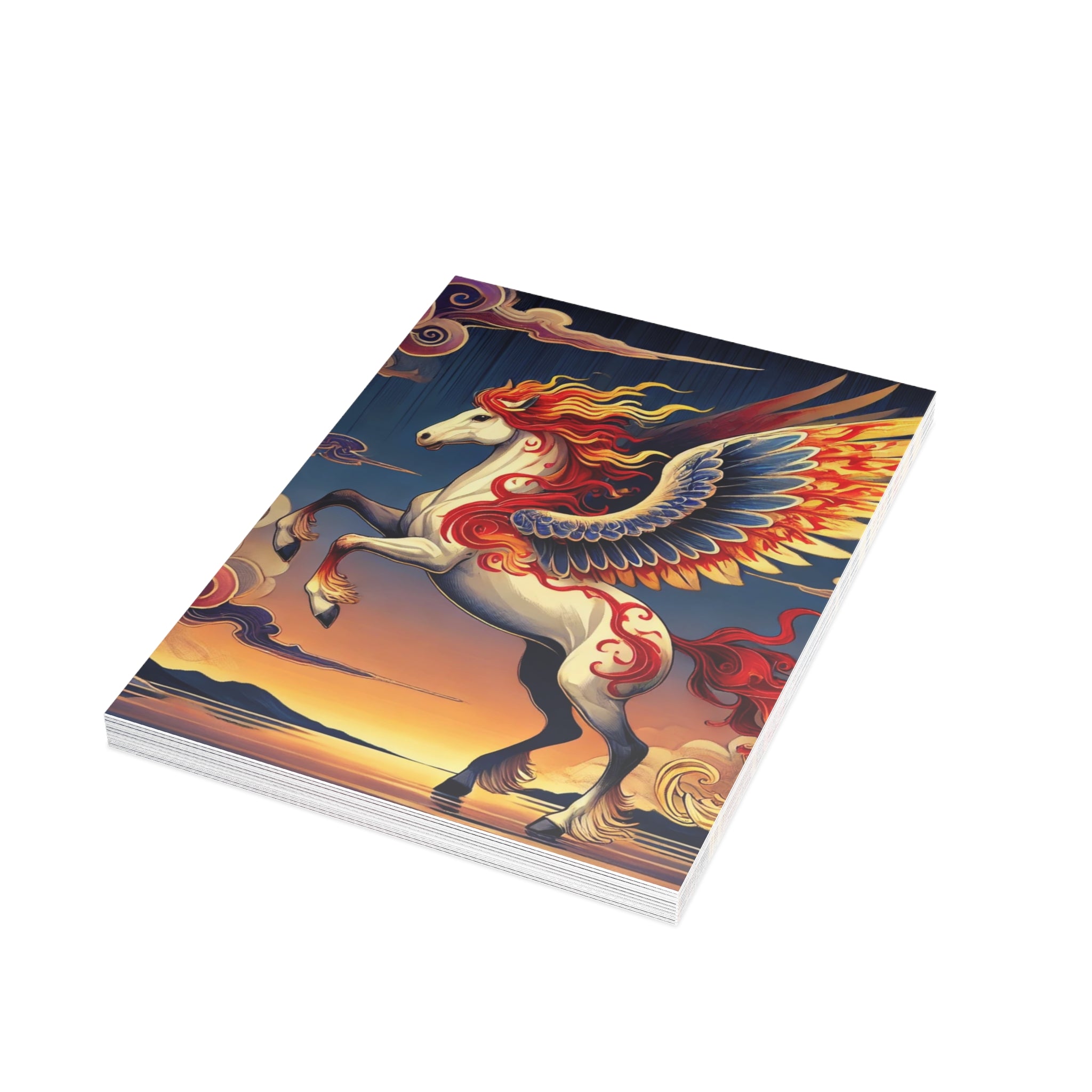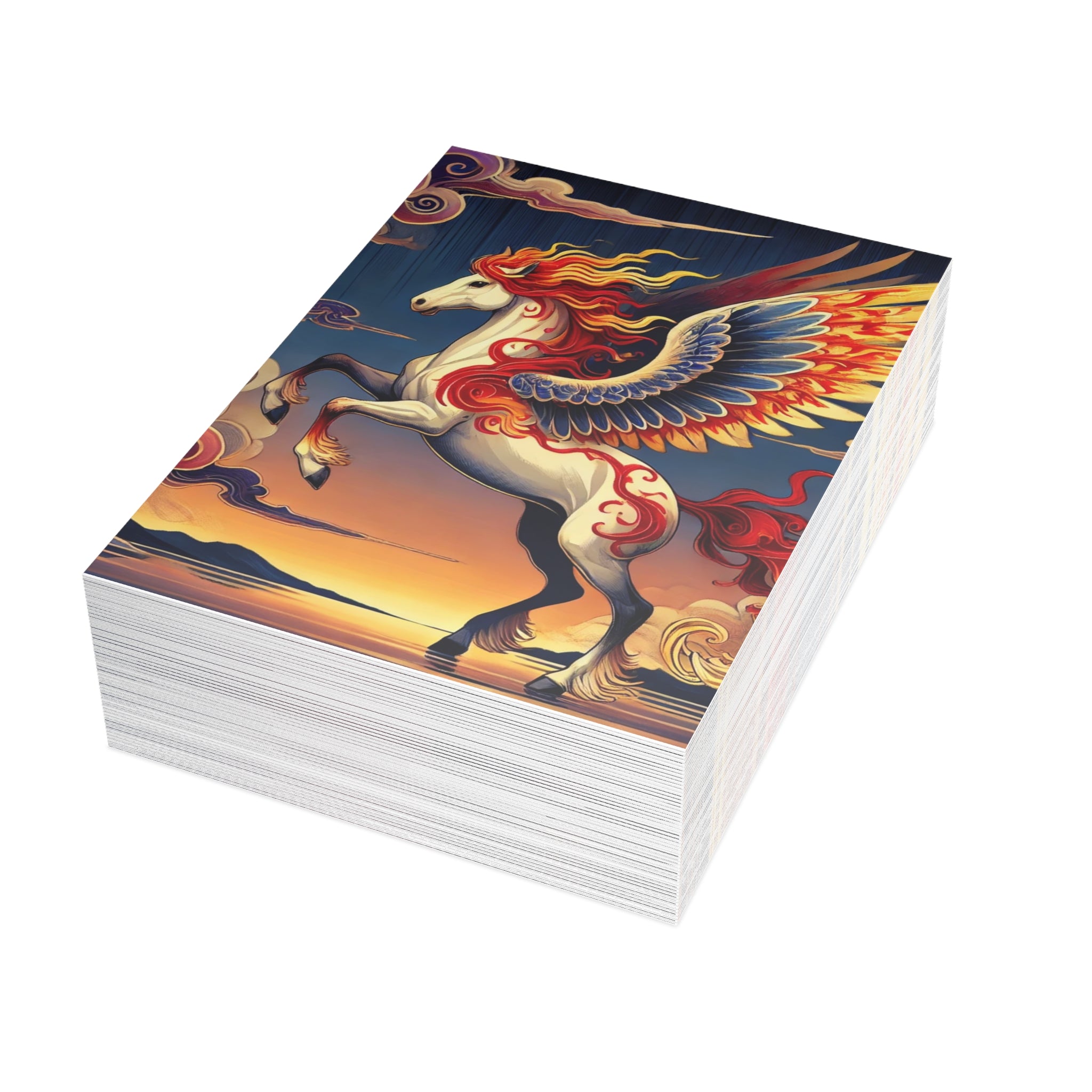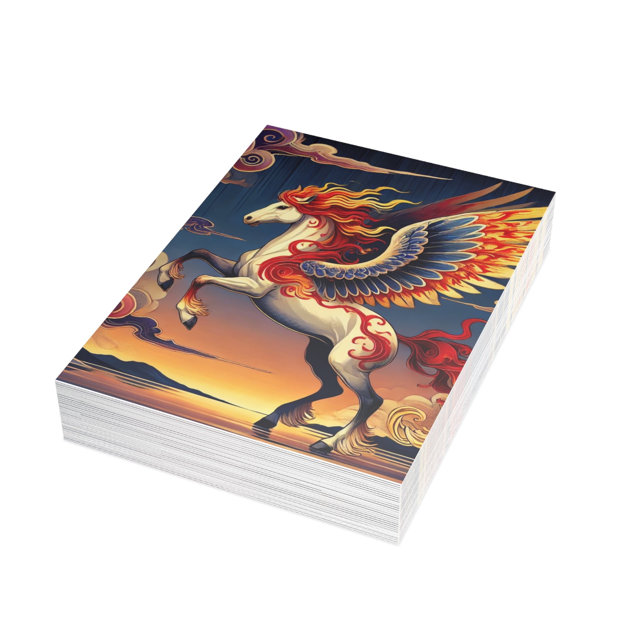 Send a message that feels like a work of art. These postcards showcase a flawless ukiyo-e inspired fantasy scene of a noble horse rearing with expansive wings embroidered in fiery patterns of red, orange, and gold. Its flowing mane and tail arc like ribbons as indigo and silver thunderclouds swirl across its flanks, all set against a stylized sunset sky of deep blues, purples, and warm tones reflecting over a tranquil sea. Each postcard becomes both a letter and a collectible artwork, printed on premium paper with your choice of four finishes—matte, uncoated, one-side coat, or two-side coat. Available in bundles of 10, 30, or 50 pieces, and complete with envelopes, they make every note, greeting, or keepsake as bold and timeless as the fantasy scene itself.