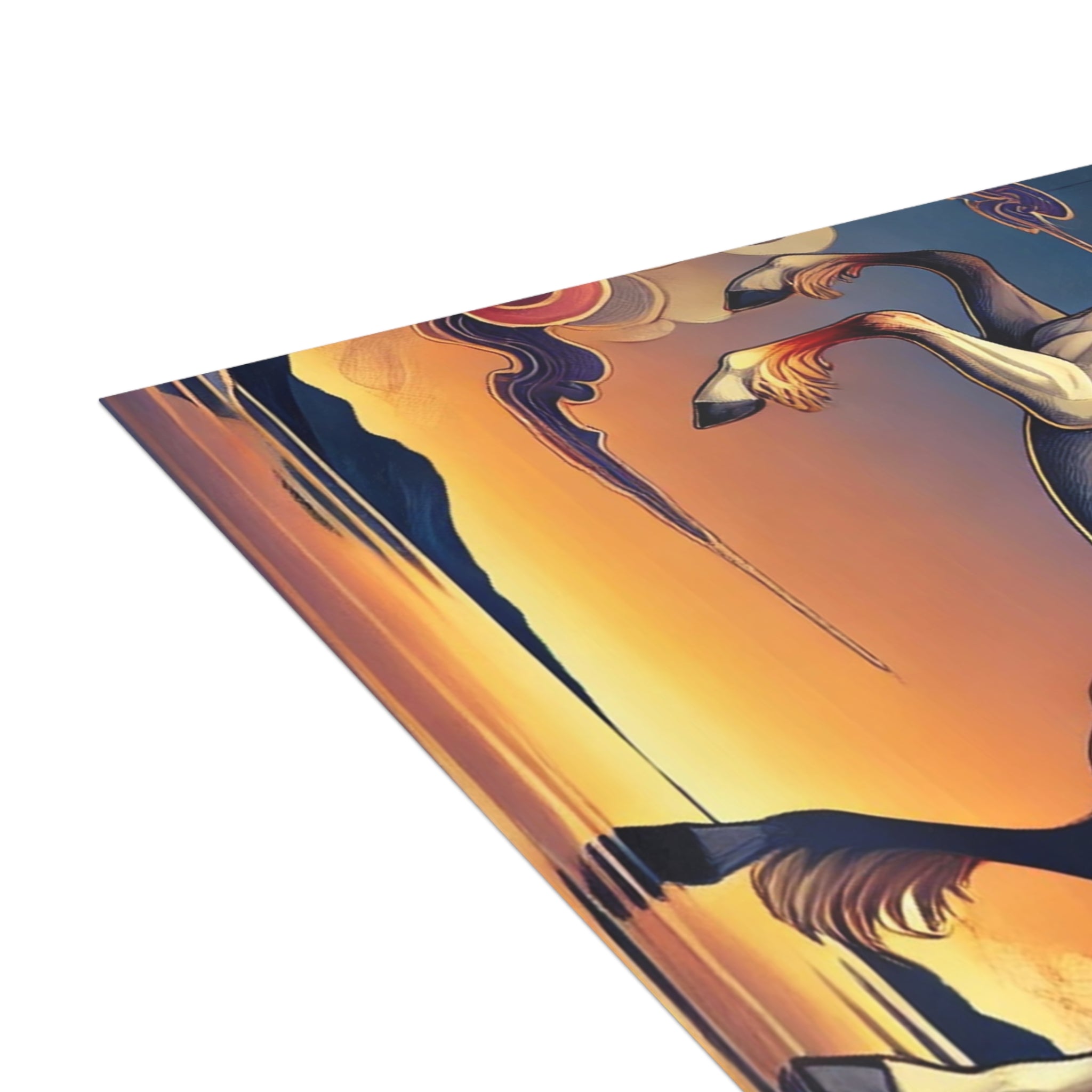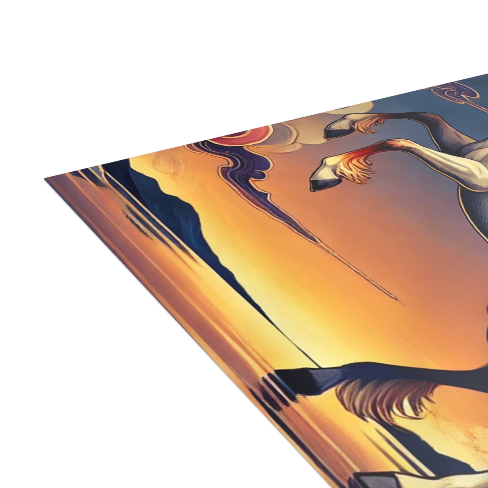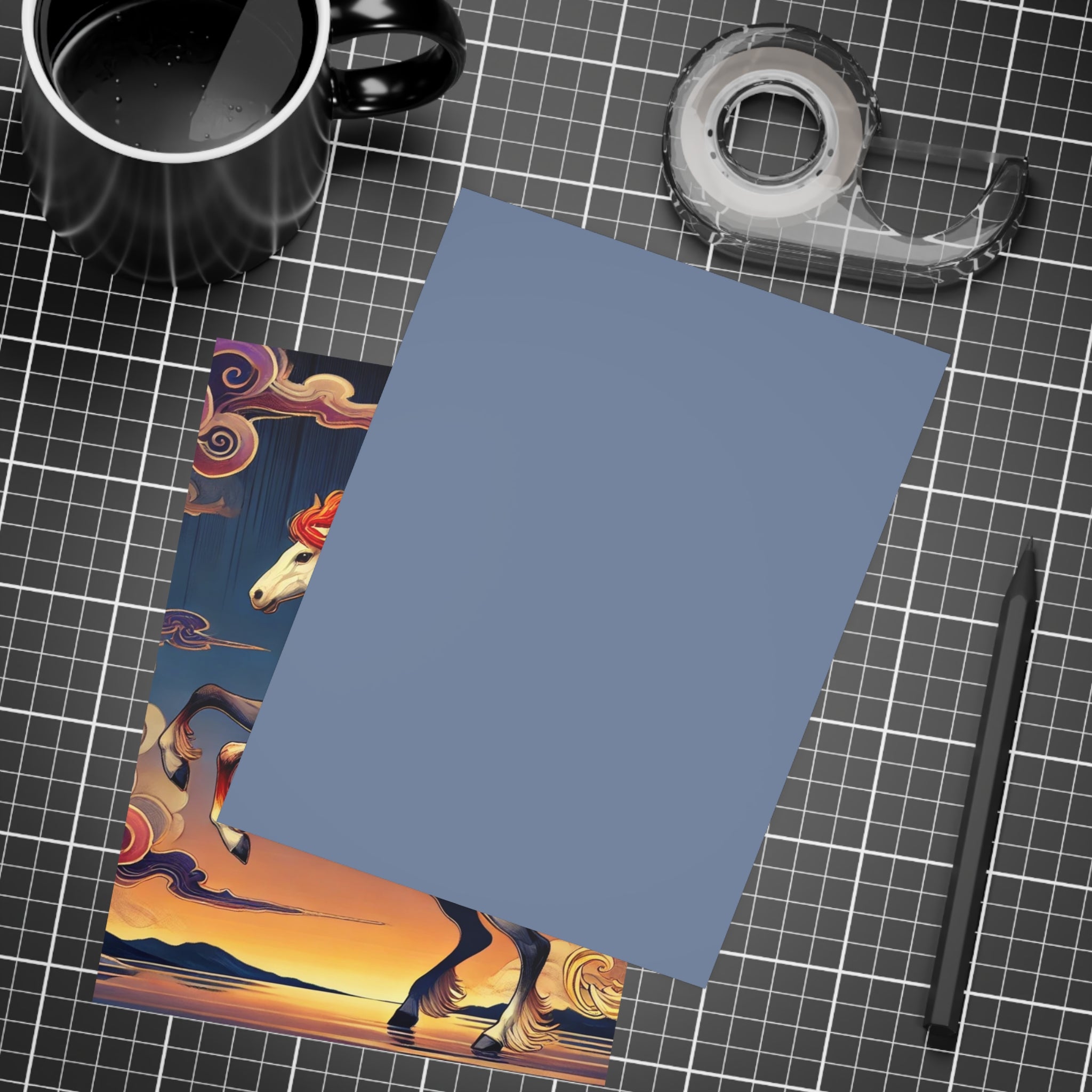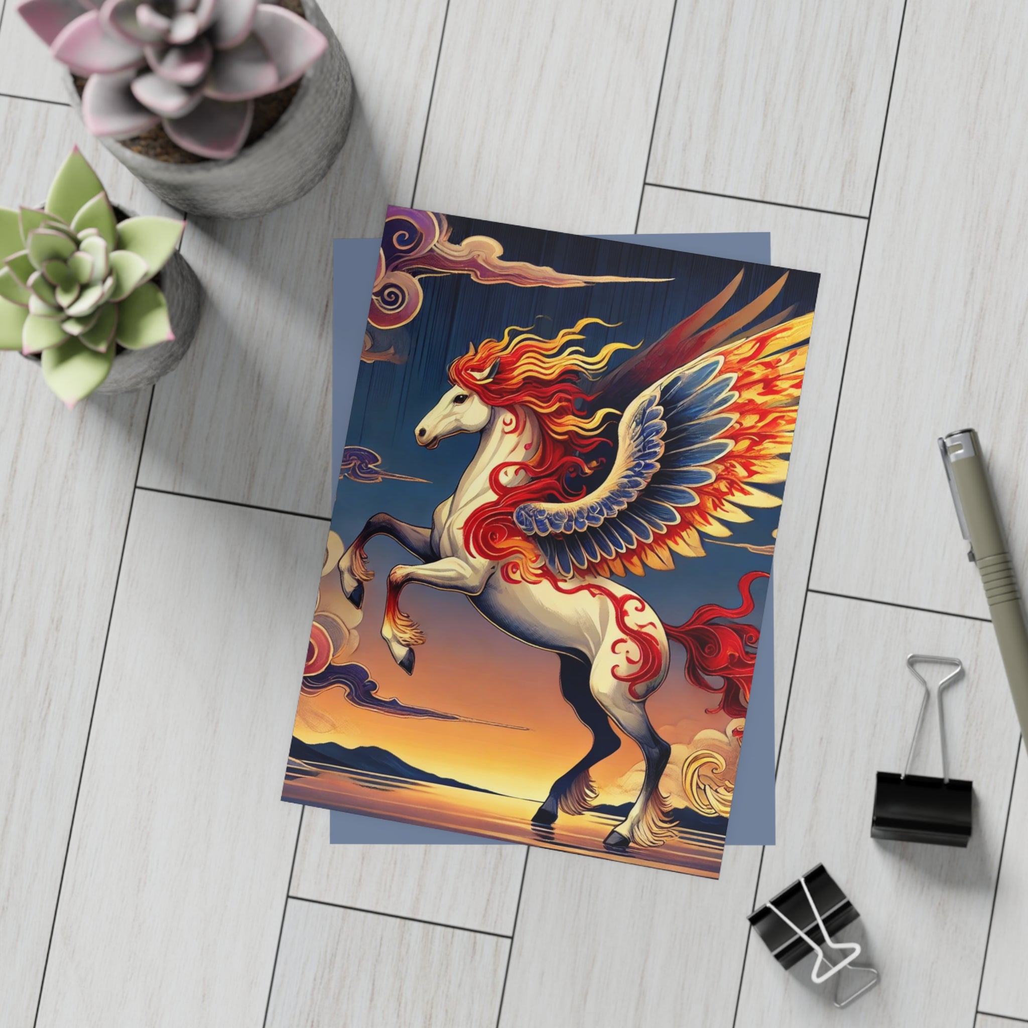 Send a message that feels like a work of art. These postcards showcase a flawless ukiyo-e inspired fantasy scene of a noble horse rearing with expansive wings embroidered in fiery patterns of red, orange, and gold. Its flowing mane and tail arc like ribbons as indigo and silver thunderclouds swirl across its flanks, all set against a stylized sunset sky of deep blues, purples, and warm tones reflecting over a tranquil sea. Each postcard becomes both a letter and a collectible artwork, printed on premium paper with your choice of four finishes—matte, uncoated, one-side coat, or two-side coat. Available in bundles of 10, 30, or 50 pieces, and complete with envelopes, they make every note, greeting, or keepsake as bold and timeless as the fantasy scene itself.