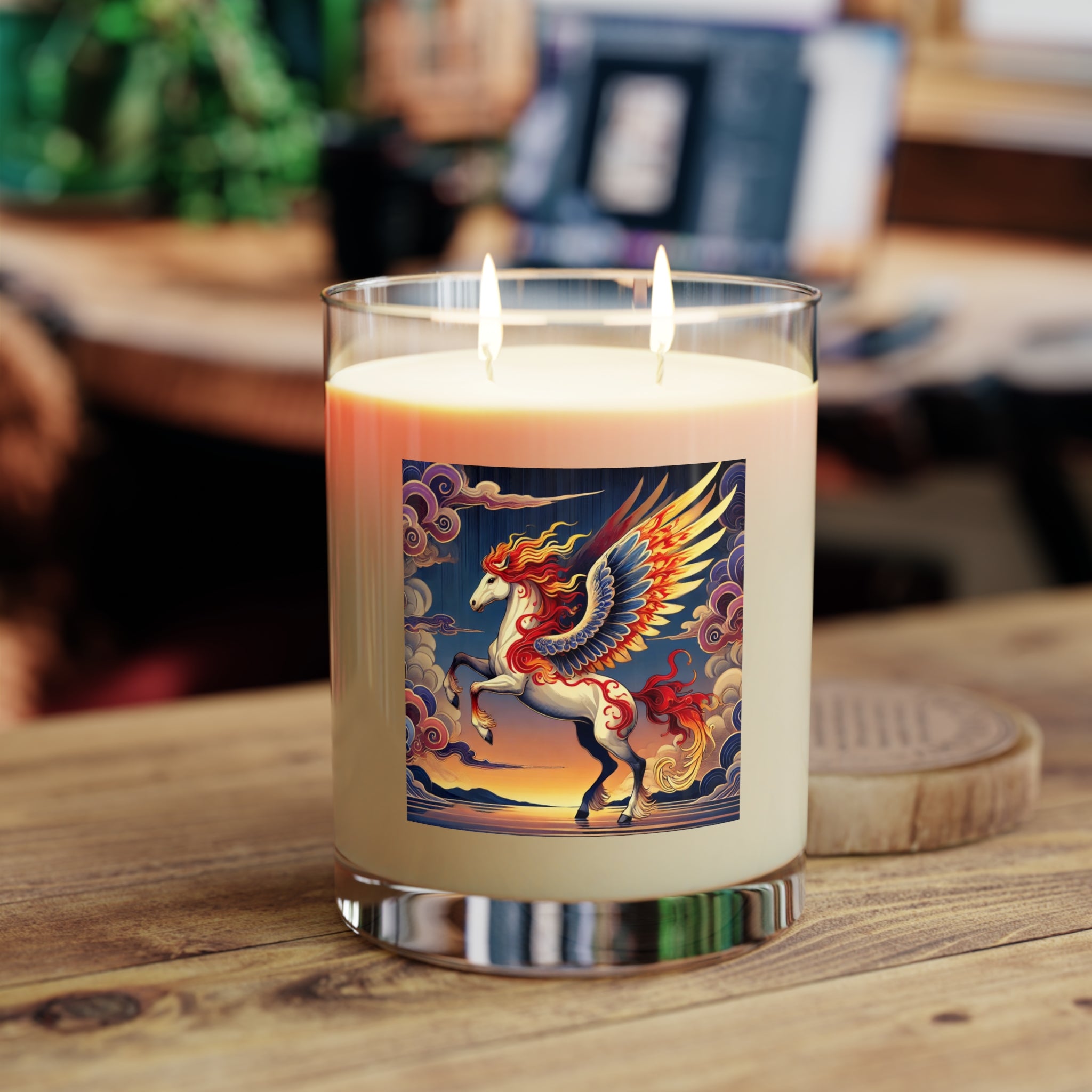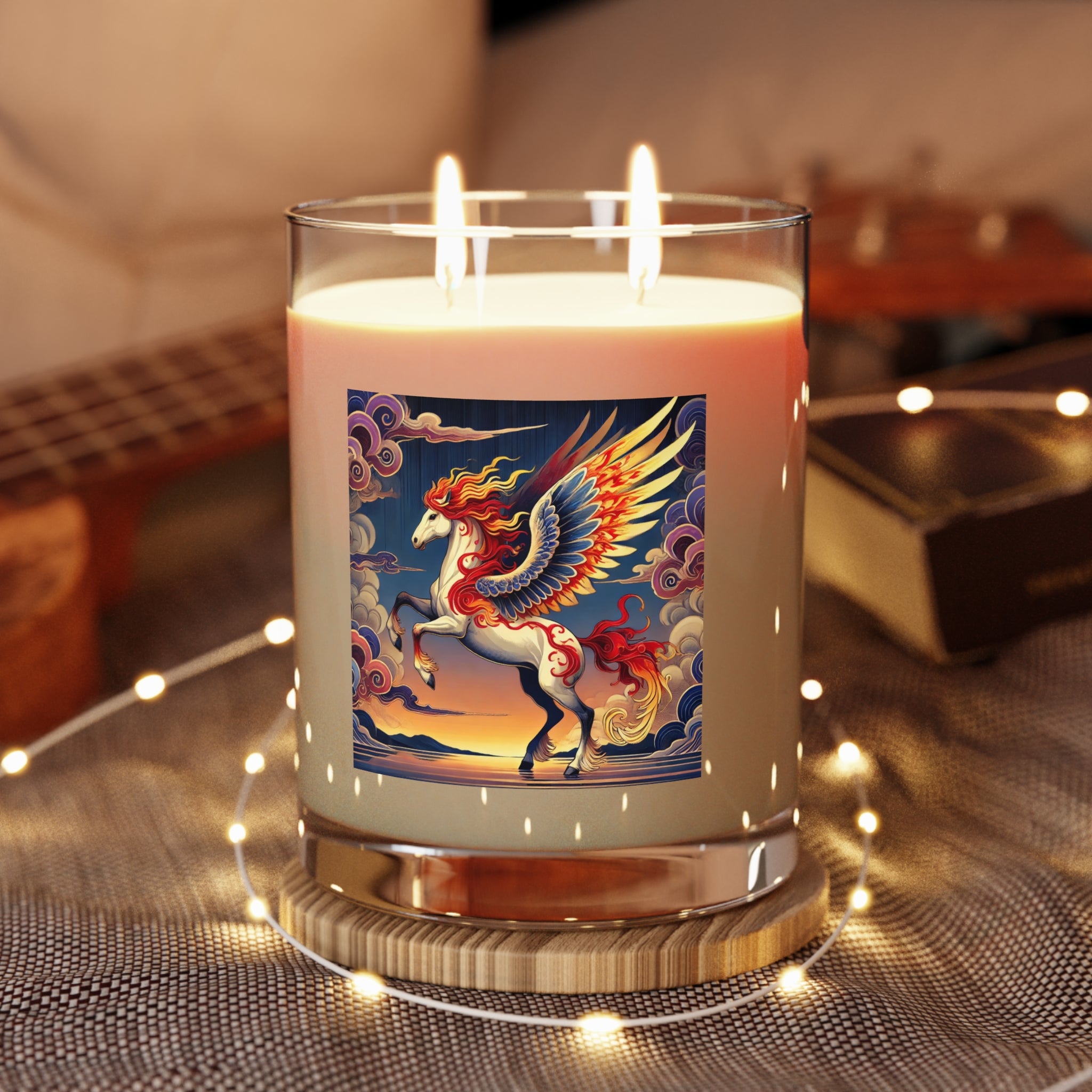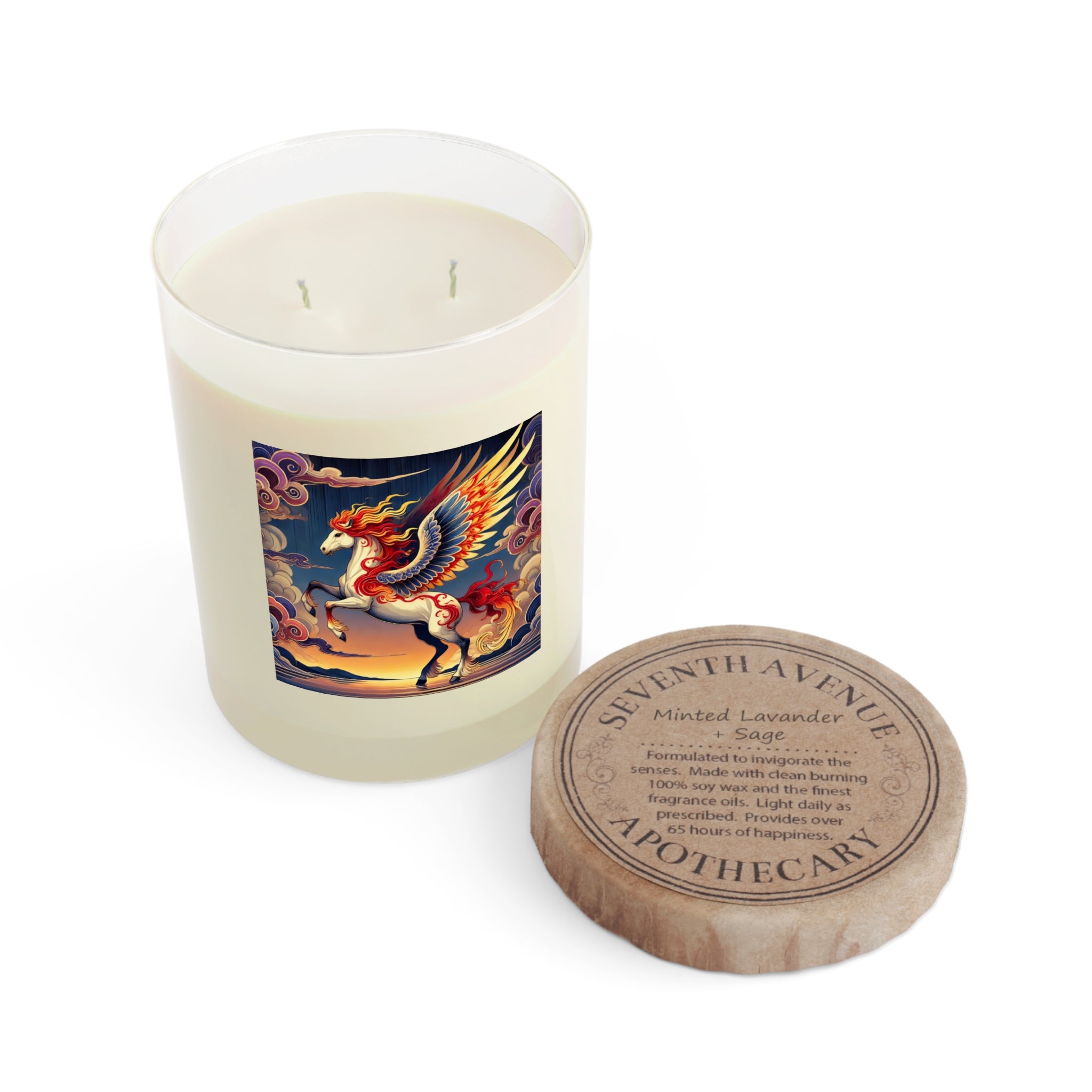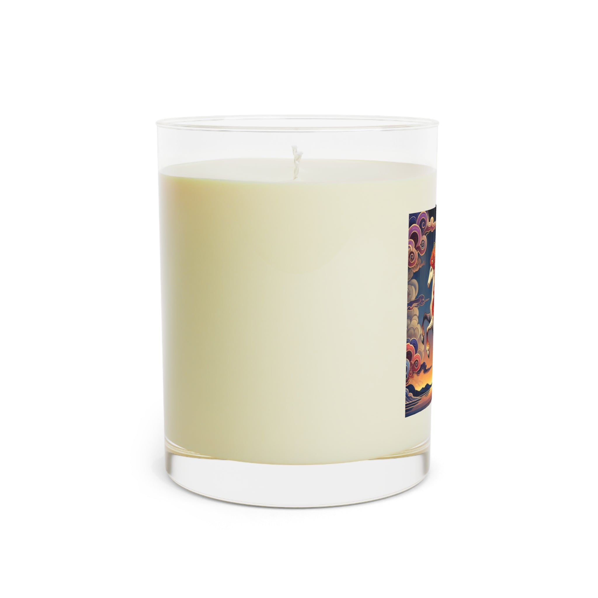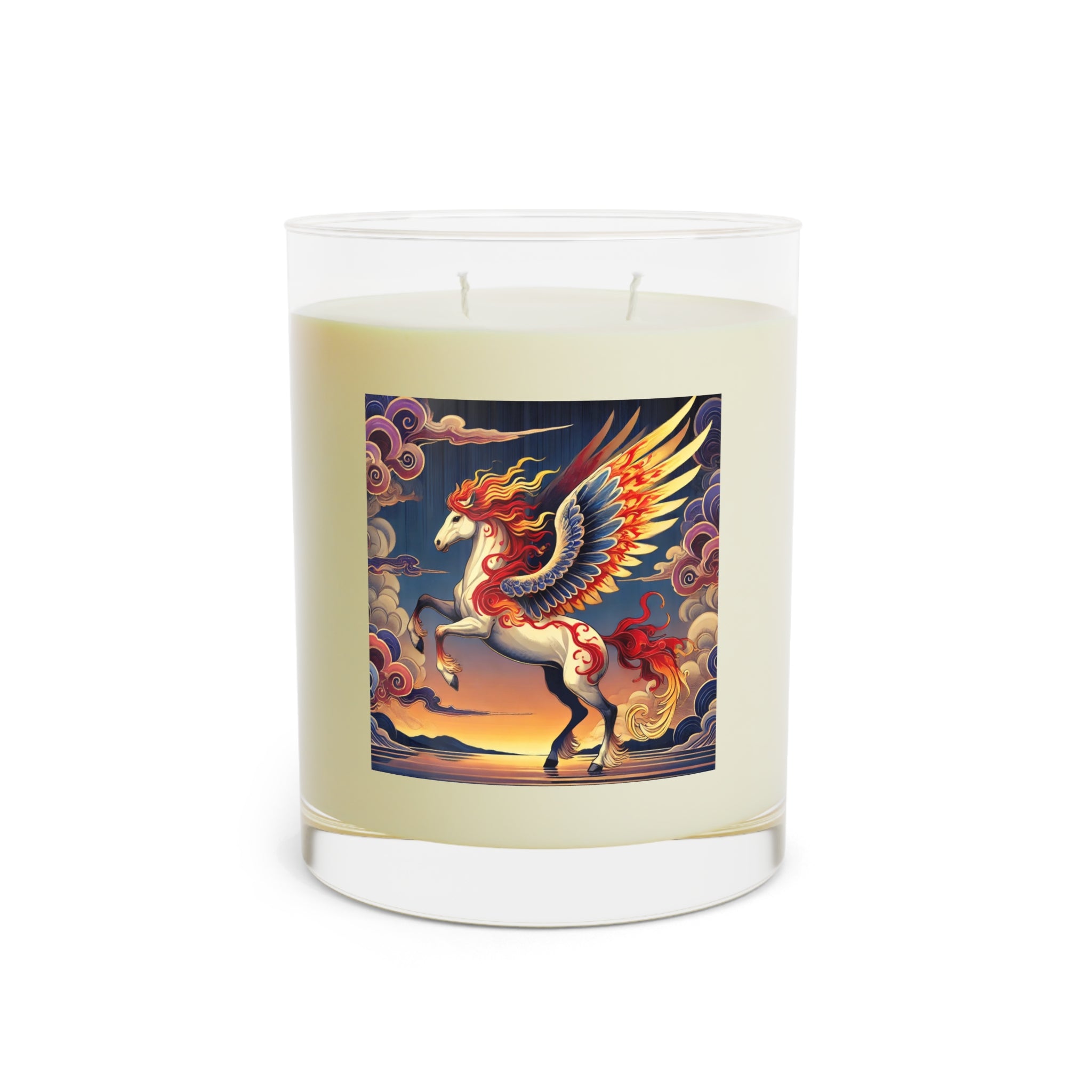 This exquisite 11oz scented candle transforms aromatherapy into an art form, crafted from 100% food-grade soy wax and the finest fragrance oils for a clean, phthalate- and lead-free burn that lasts up to 65 hours. As the flame flickers within the premium glass, the vessel itself becomes a canvas, glowing with a flawless ukiyo-e inspired scene of a noble horse rearing against a stylized sunset sky. Its expansive wings blaze with patterns of red, orange, and gold, while indigo and silver thunderclouds swirl across its flanks, mirroring the candle’s crackling warmth. The tranquil sea and distant mountains complete the serene backdrop, blending bold clarity with Kabuki-inspired drama. Available in three soothing scents—White Tea & Fig, Lavender & Sage, and Ocean Mist & Moss—this candle brings not only fragrance and ambiance, but also a striking centerpiece of fantasy art to any space.