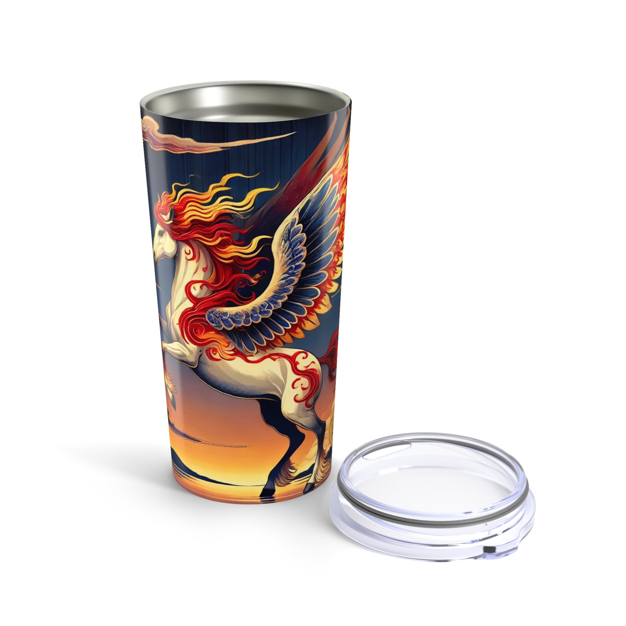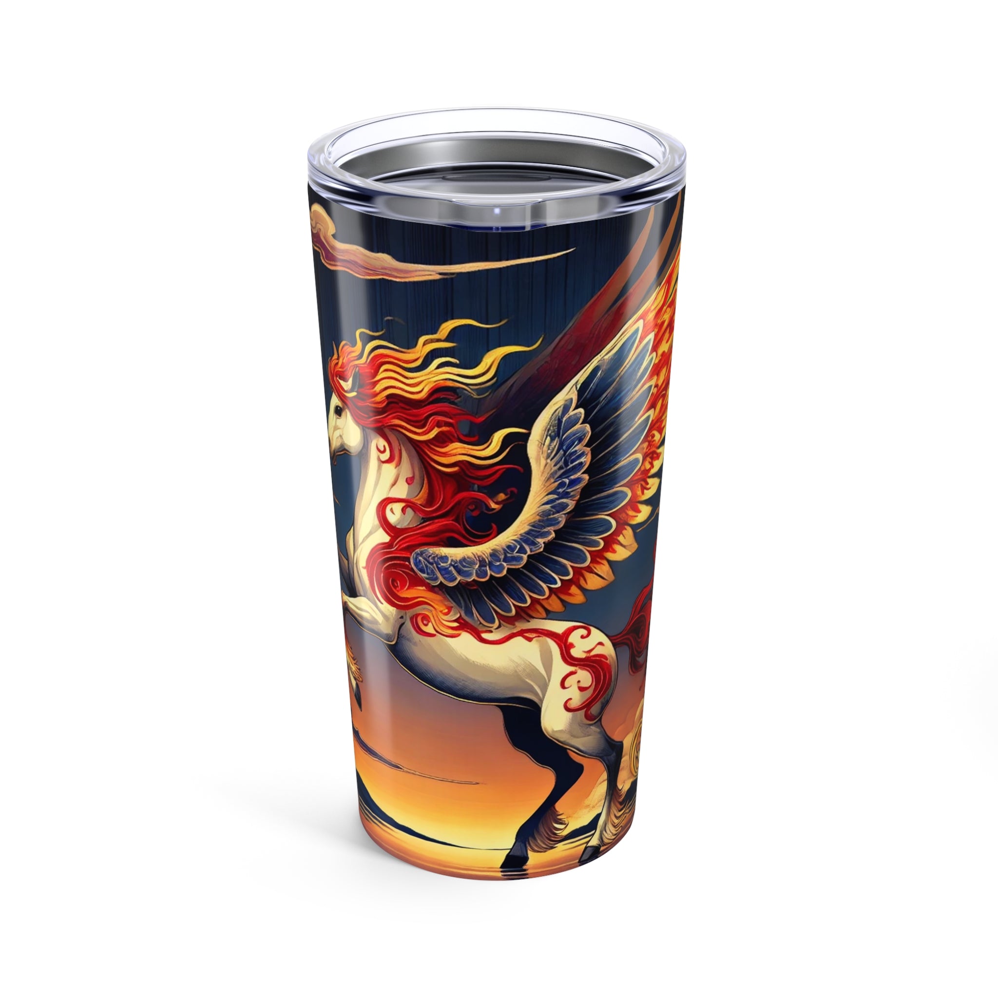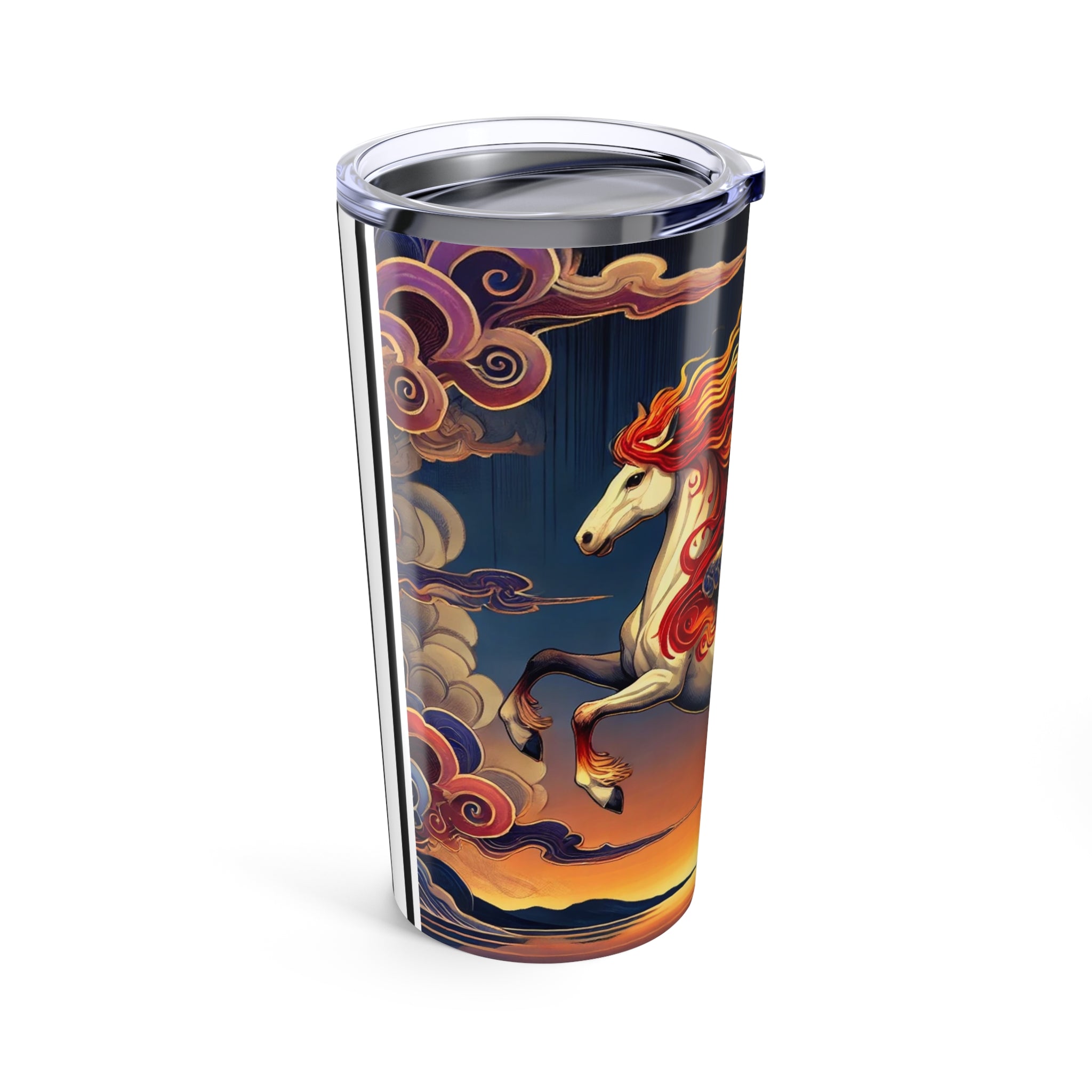 This 20oz stainless steel tumbler combines durability and double-wall insulation to keep drinks hot or cold while remaining lightweight and dishwasher safe. The design showcases a noble horse rearing with flame-patterned wings in vivid red, orange, and gold, its mane flowing like ribbons of fire against indigo markings and a dramatic sunset sky. Blending ukiyo-e elegance with fantasy drama, this tumbler is both a daily essential and a striking work of art.