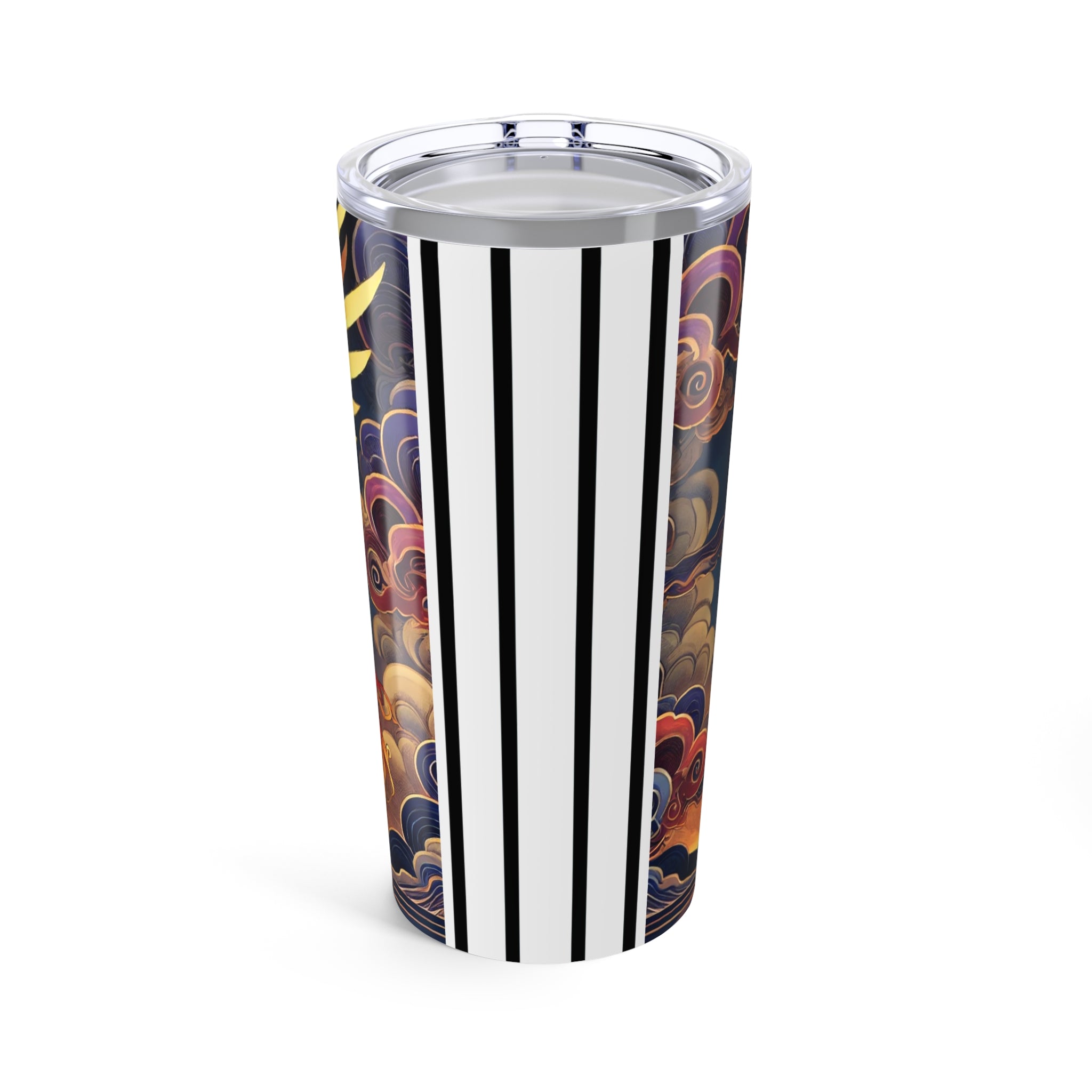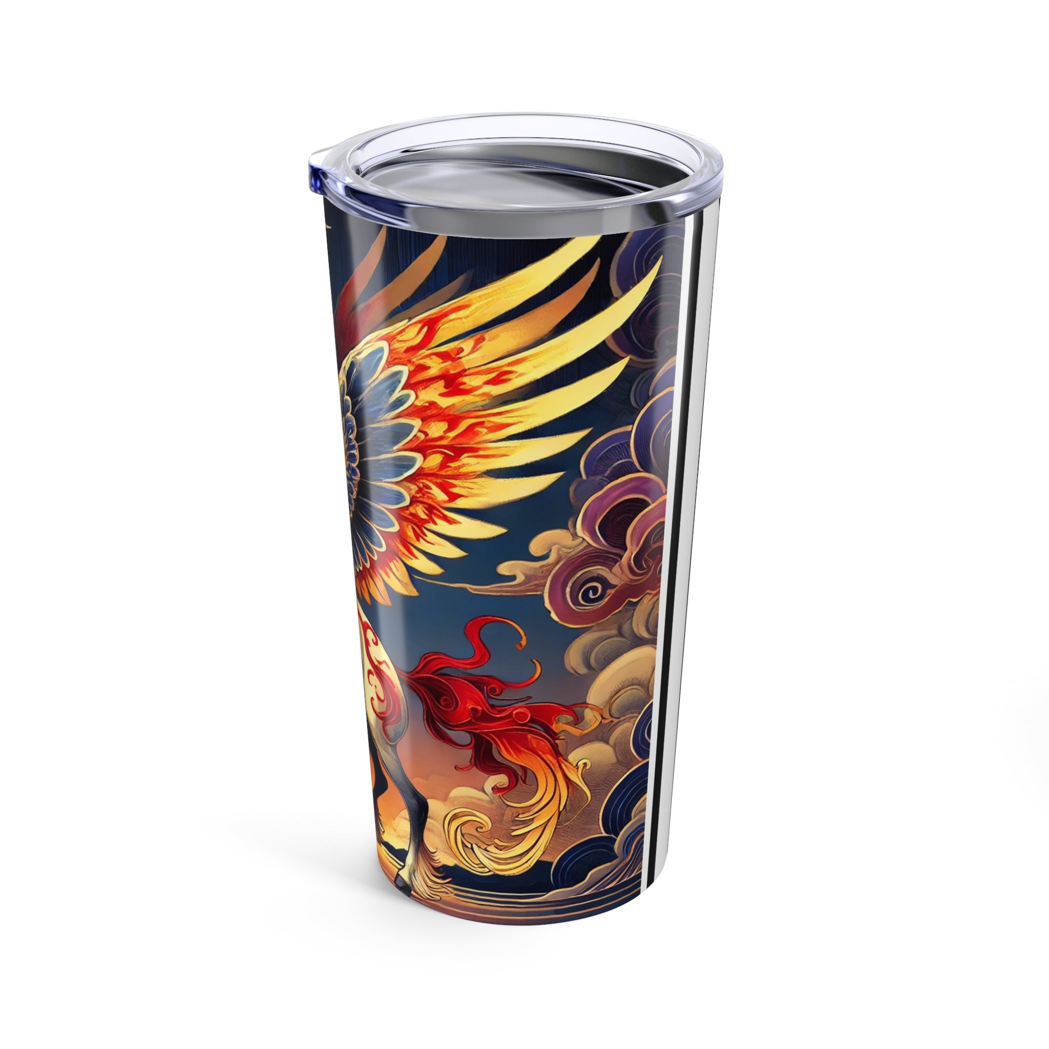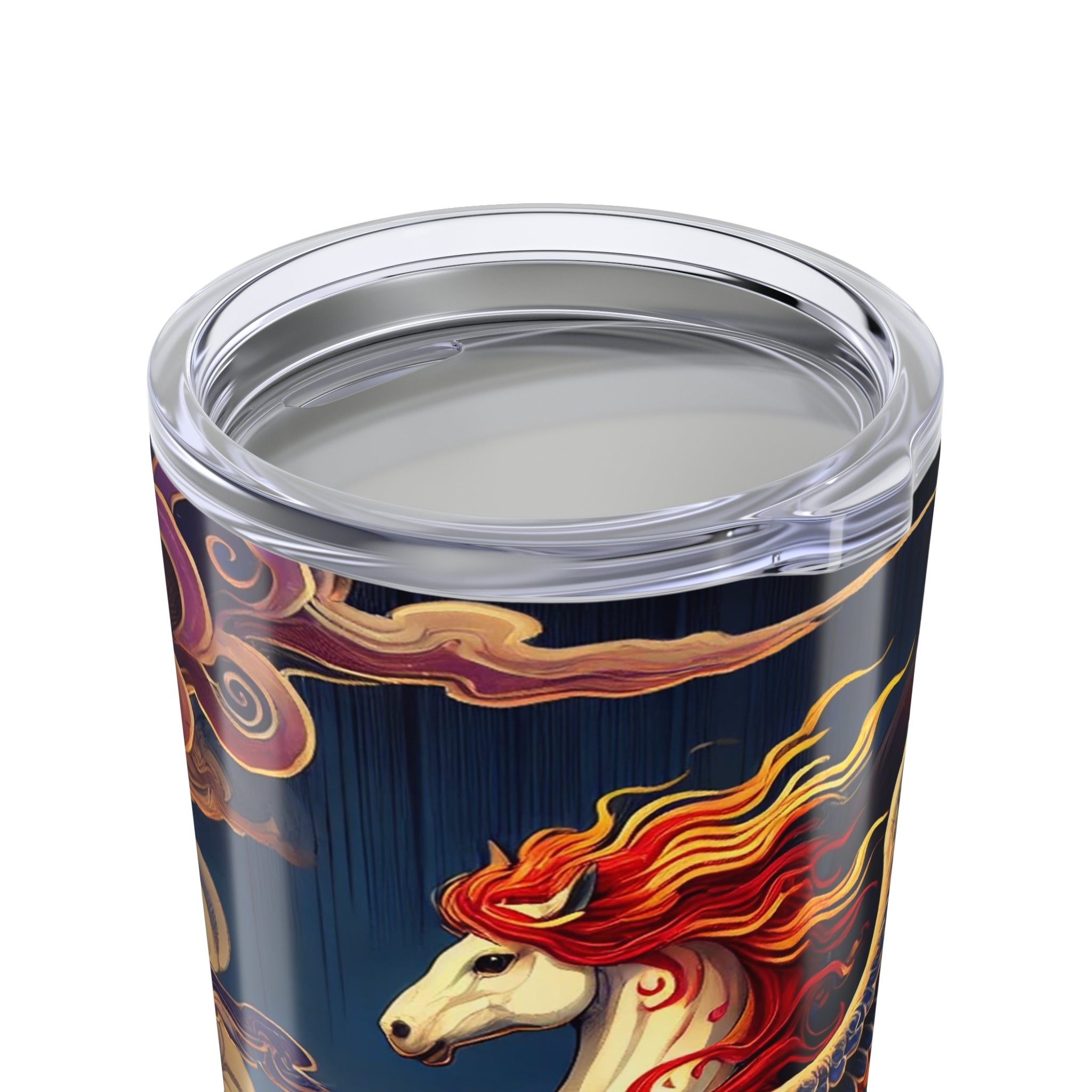 This 20oz stainless steel tumbler combines durability and double-wall insulation to keep drinks hot or cold while remaining lightweight and dishwasher safe. The design showcases a noble horse rearing with flame-patterned wings in vivid red, orange, and gold, its mane flowing like ribbons of fire against indigo markings and a dramatic sunset sky. Blending ukiyo-e elegance with fantasy drama, this tumbler is both a daily essential and a striking work of art.