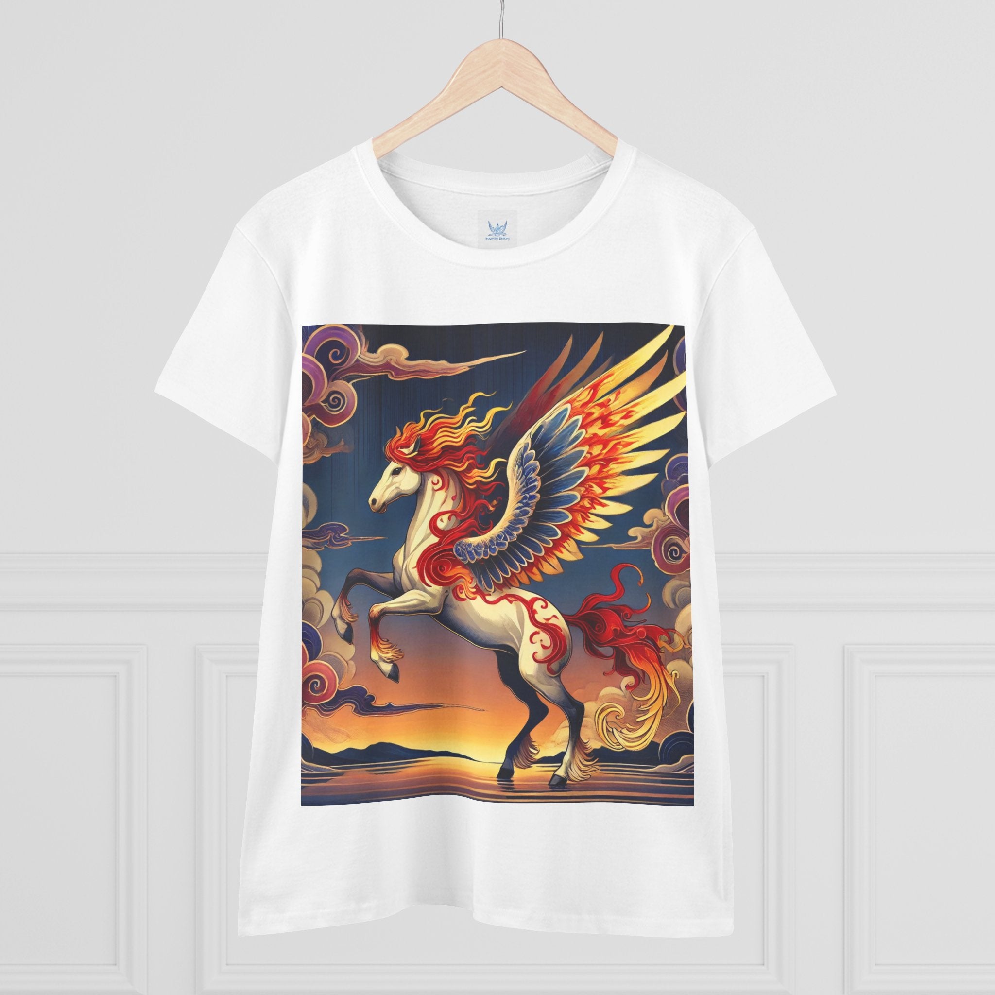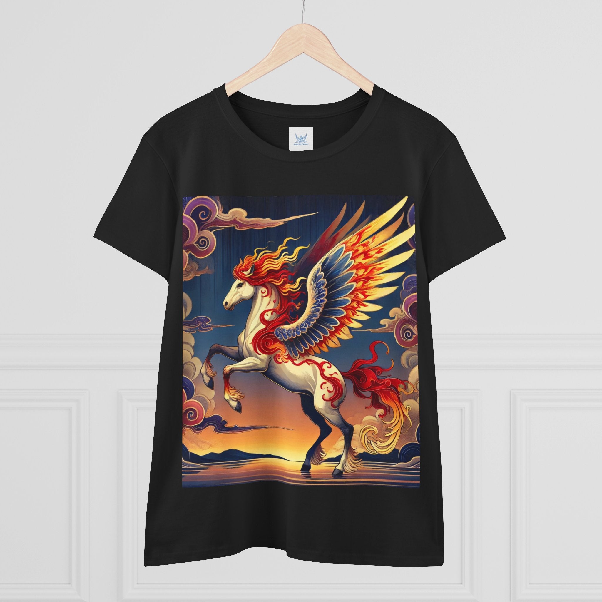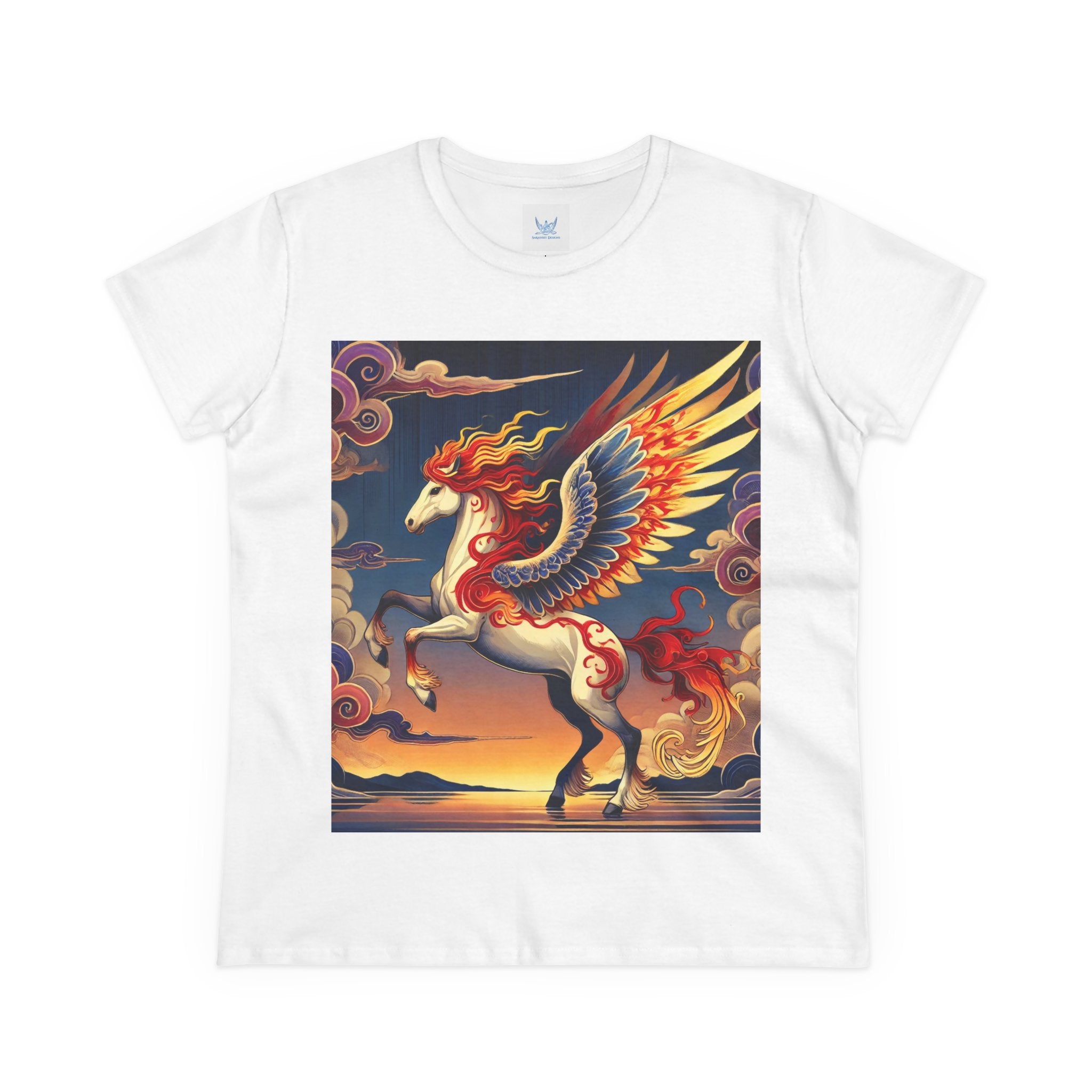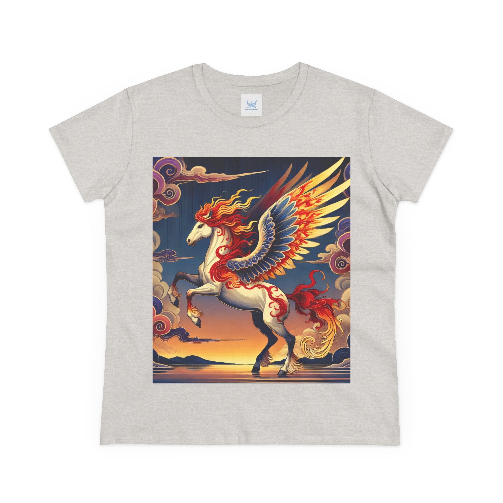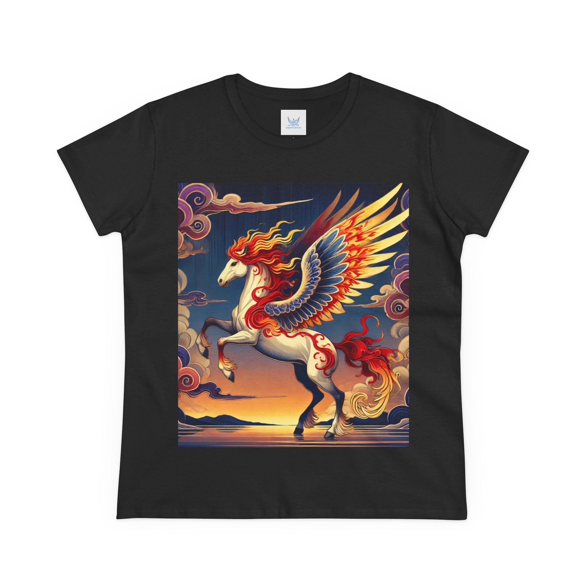 Slip into comfort and artistry with this women’s midweight cotton tee, crafted from 100% soft, breathable cotton and designed with a semi-fitted silhouette that flatters while staying easy to wear. Pre-shrunk for lasting shape and finished with cap sleeves and a taped neck and shoulders, it’s made to be both durable and stylish. Across the front, the fabric becomes a canvas for a flawless ukiyo-e inspired fantasy scene: a noble horse rearing with expansive flame-patterned wings in red, orange, and gold. Its flowing mane and tail arc gracefully while indigo and silver thundercloud markings swirl across its flanks. Behind it, a sunset sky of deep blues, purples, and warm tones reflects over a tranquil sea and distant mountains. Blending Kabuki-inspired drama with the elegance of ukiyo-e tradition, this tee turns everyday wear into a timeless piece of wearable fantasy art.