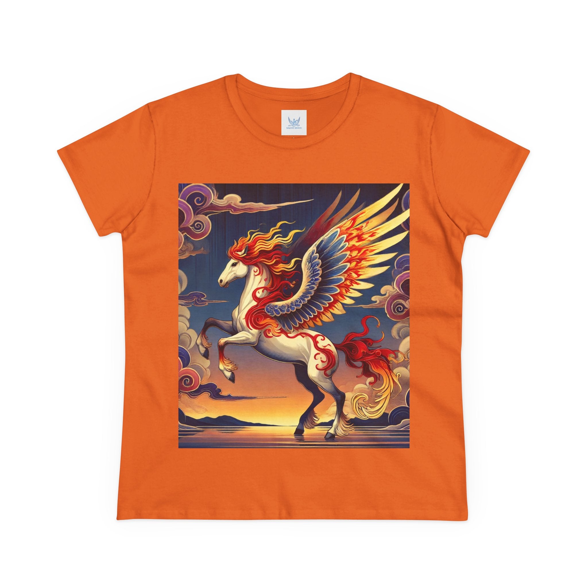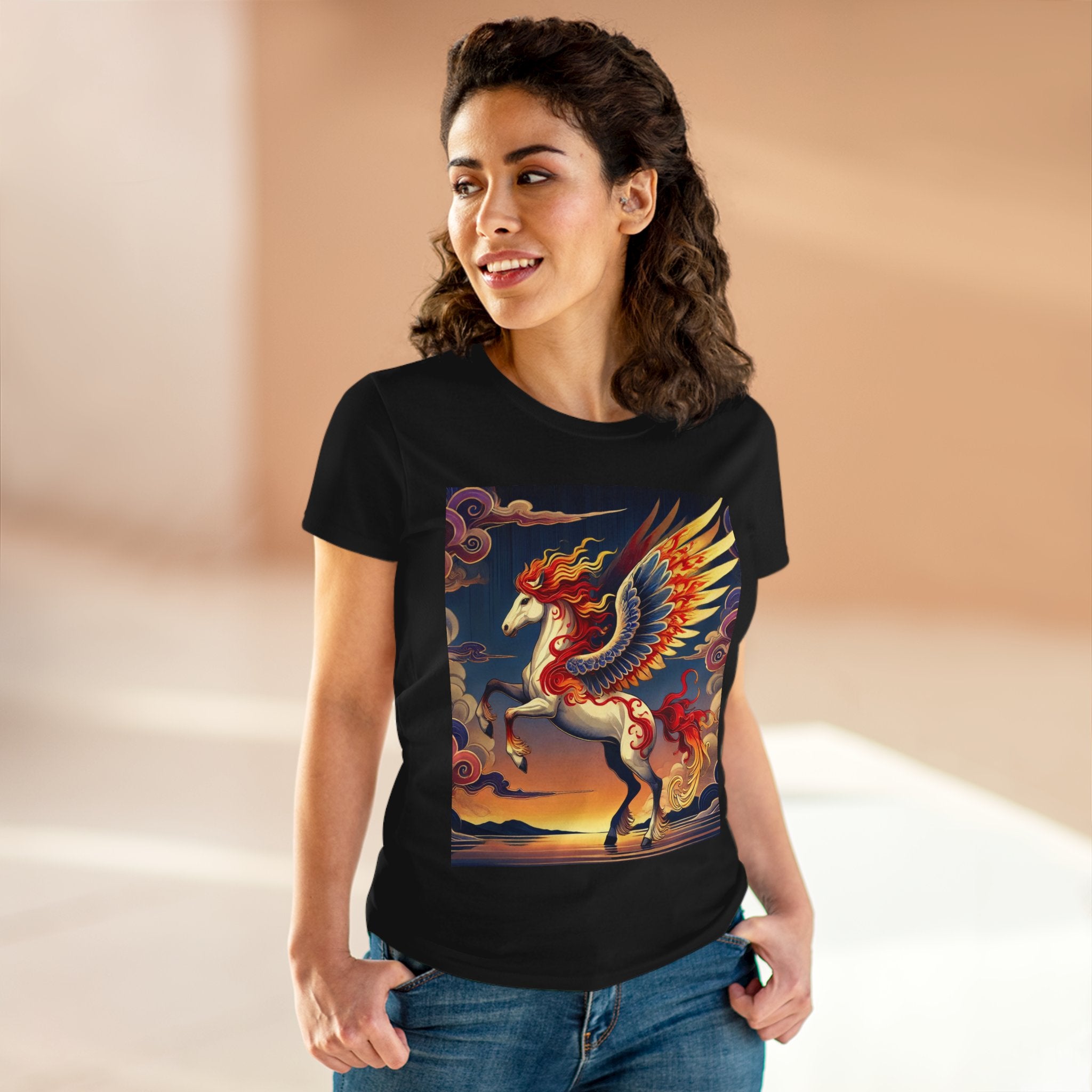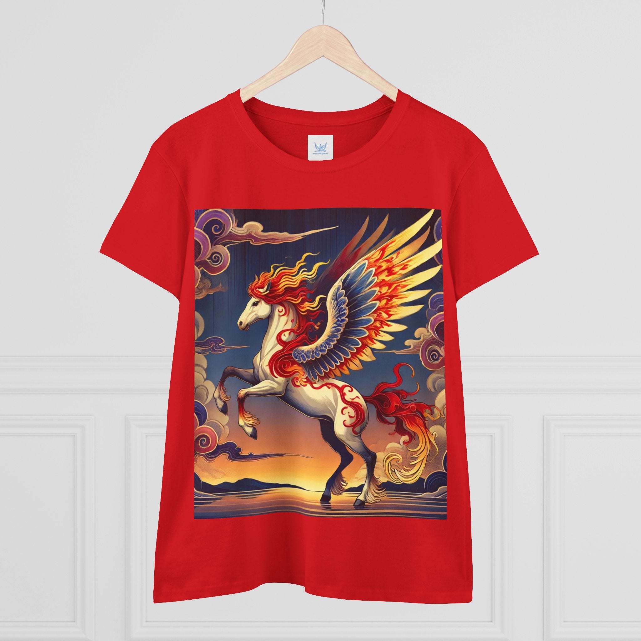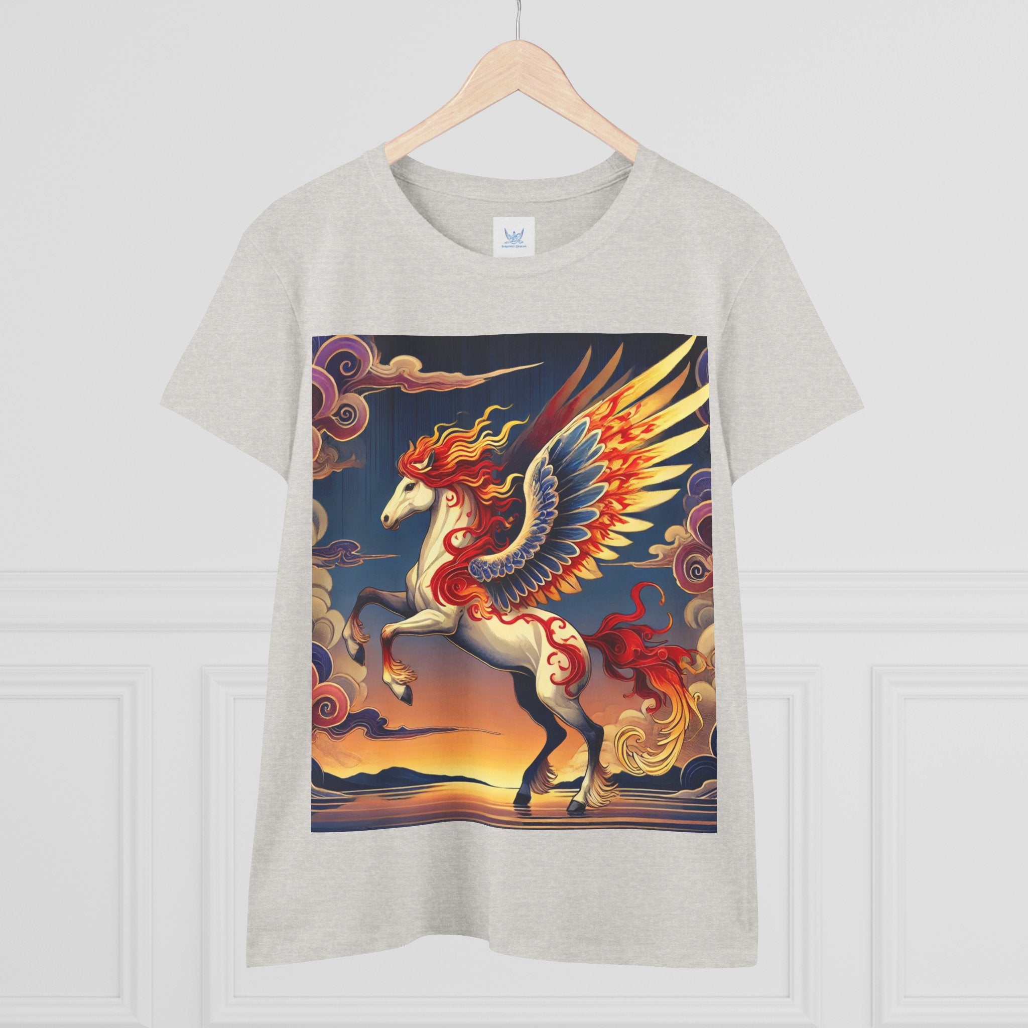Slip into comfort and artistry with this women’s midweight cotton tee, crafted from 100% soft, breathable cotton and designed with a semi-fitted silhouette that flatters while staying easy to wear. Pre-shrunk for lasting shape and finished with cap sleeves and a taped neck and shoulders, it’s made to be both durable and stylish. Across the front, the fabric becomes a canvas for a flawless ukiyo-e inspired fantasy scene: a noble horse rearing with expansive flame-patterned wings in red, orange, and gold. Its flowing mane and tail arc gracefully while indigo and silver thundercloud markings swirl across its flanks. Behind it, a sunset sky of deep blues, purples, and warm tones reflects over a tranquil sea and distant mountains. Blending Kabuki-inspired drama with the elegance of ukiyo-e tradition, this tee turns everyday wear into a timeless piece of wearable fantasy art.