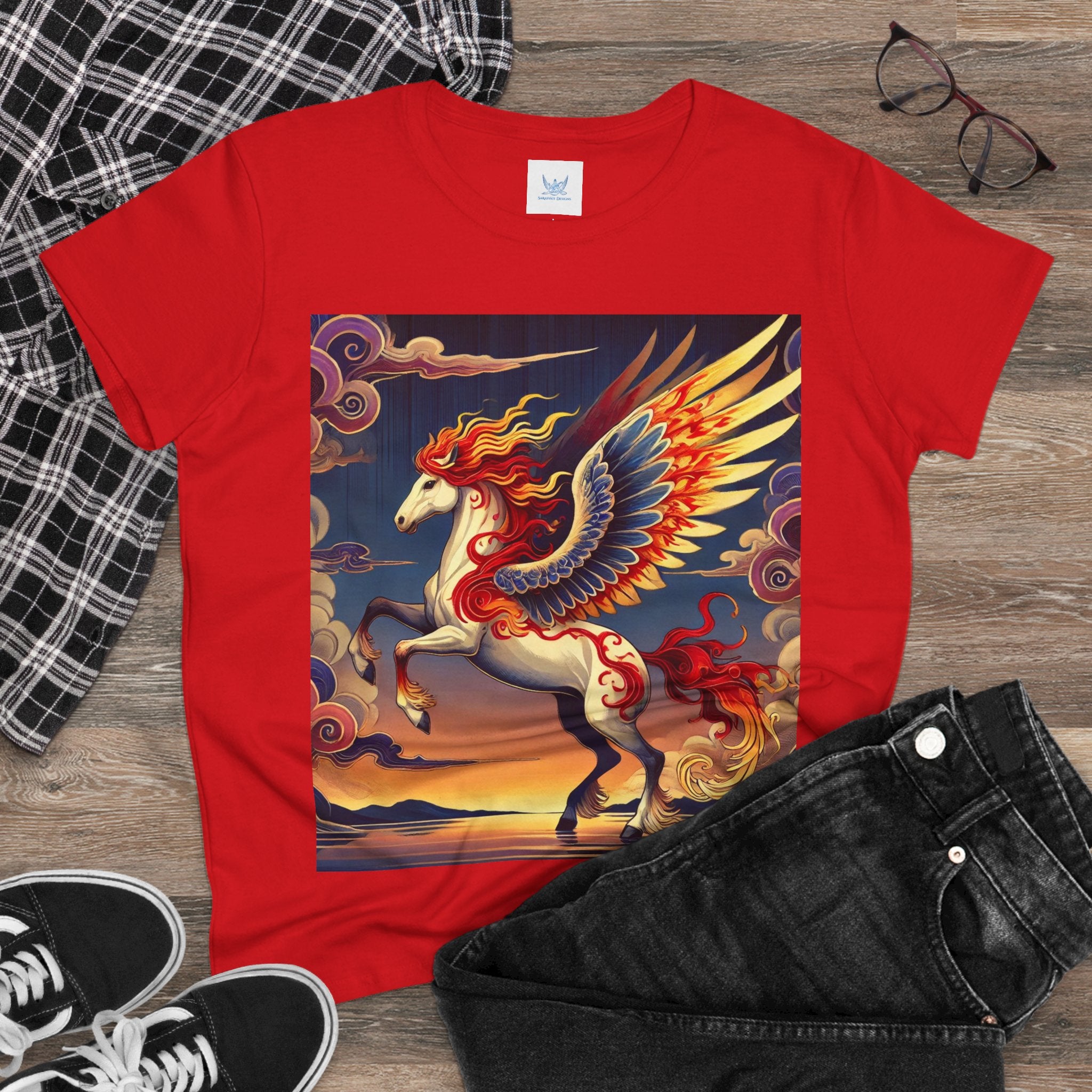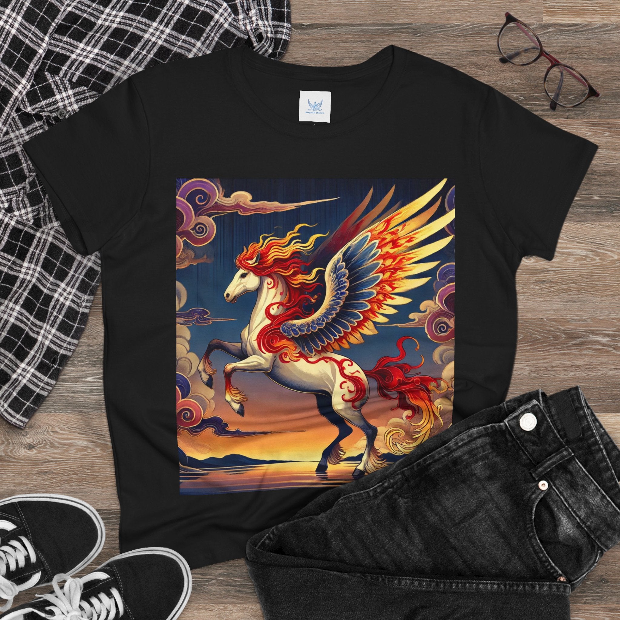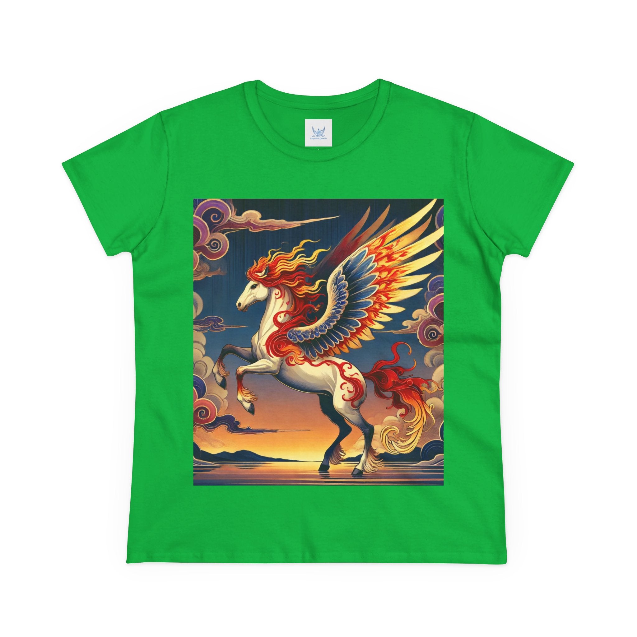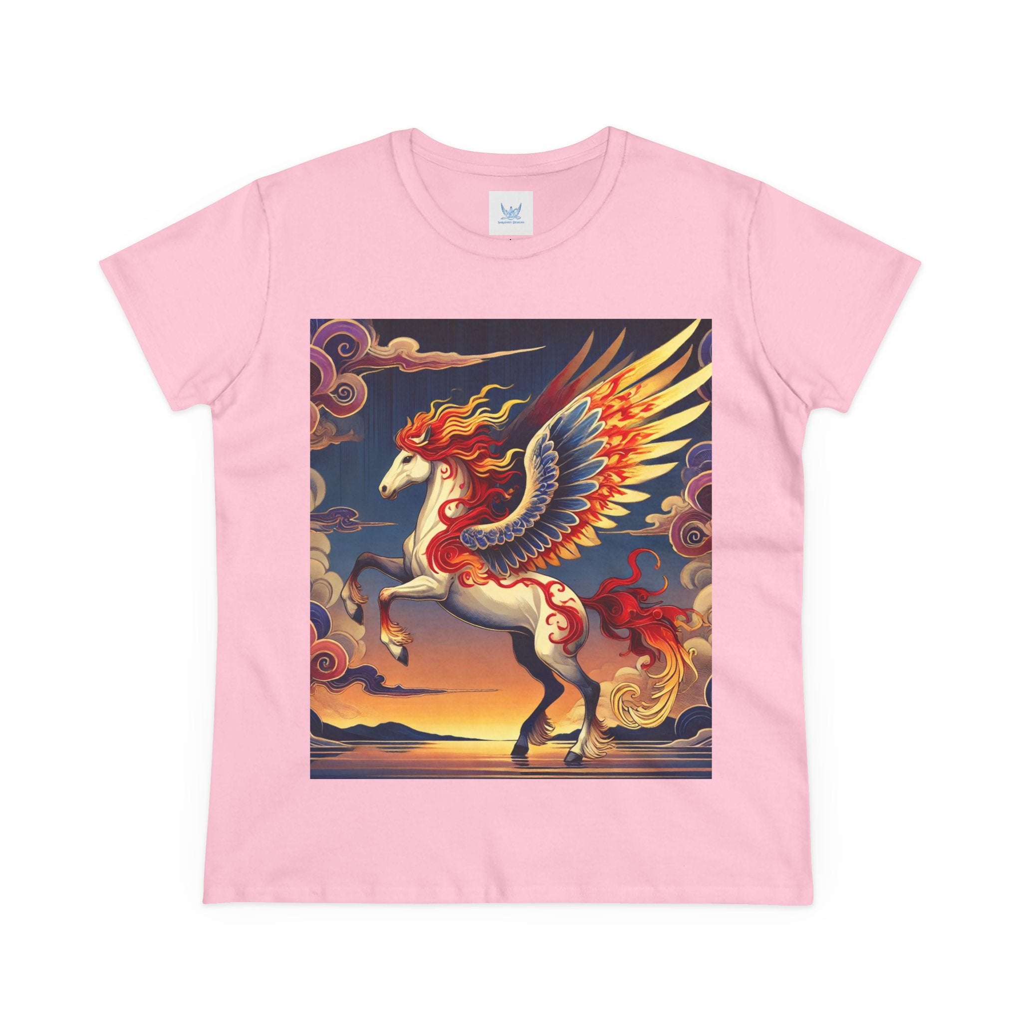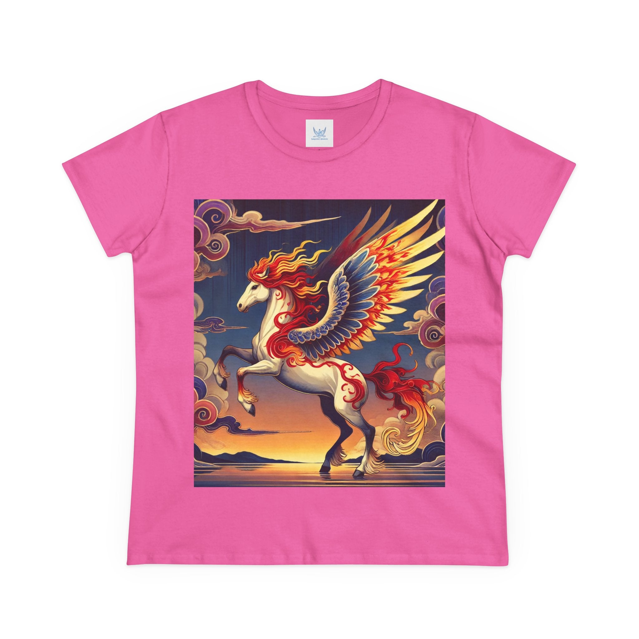 Slip into comfort and artistry with this women’s midweight cotton tee, crafted from 100% soft, breathable cotton and designed with a semi-fitted silhouette that flatters while staying easy to wear. Pre-shrunk for lasting shape and finished with cap sleeves and a taped neck and shoulders, it’s made to be both durable and stylish. Across the front, the fabric becomes a canvas for a flawless ukiyo-e inspired fantasy scene: a noble horse rearing with expansive flame-patterned wings in red, orange, and gold. Its flowing mane and tail arc gracefully while indigo and silver thundercloud markings swirl across its flanks. Behind it, a sunset sky of deep blues, purples, and warm tones reflects over a tranquil sea and distant mountains. Blending Kabuki-inspired drama with the elegance of ukiyo-e tradition, this tee turns everyday wear into a timeless piece of wearable fantasy art.
