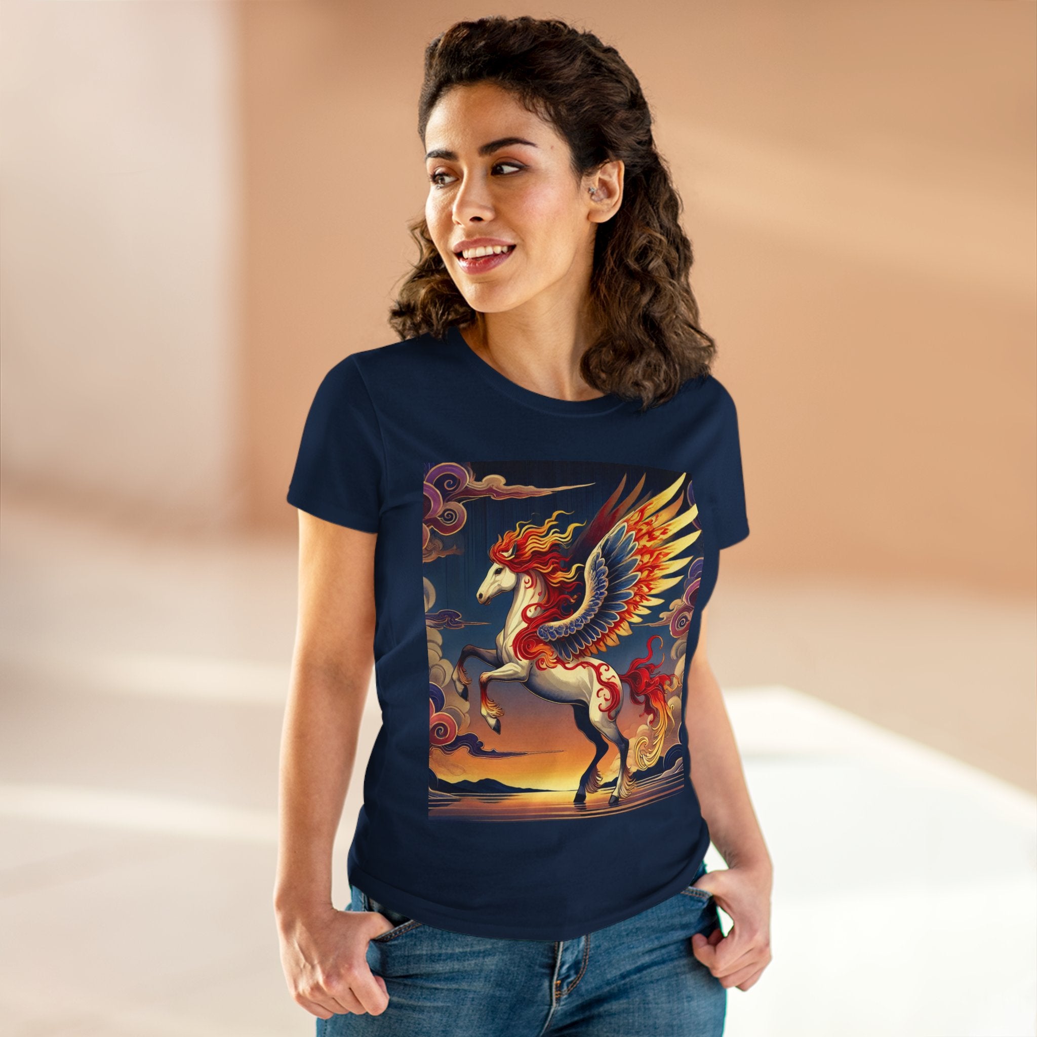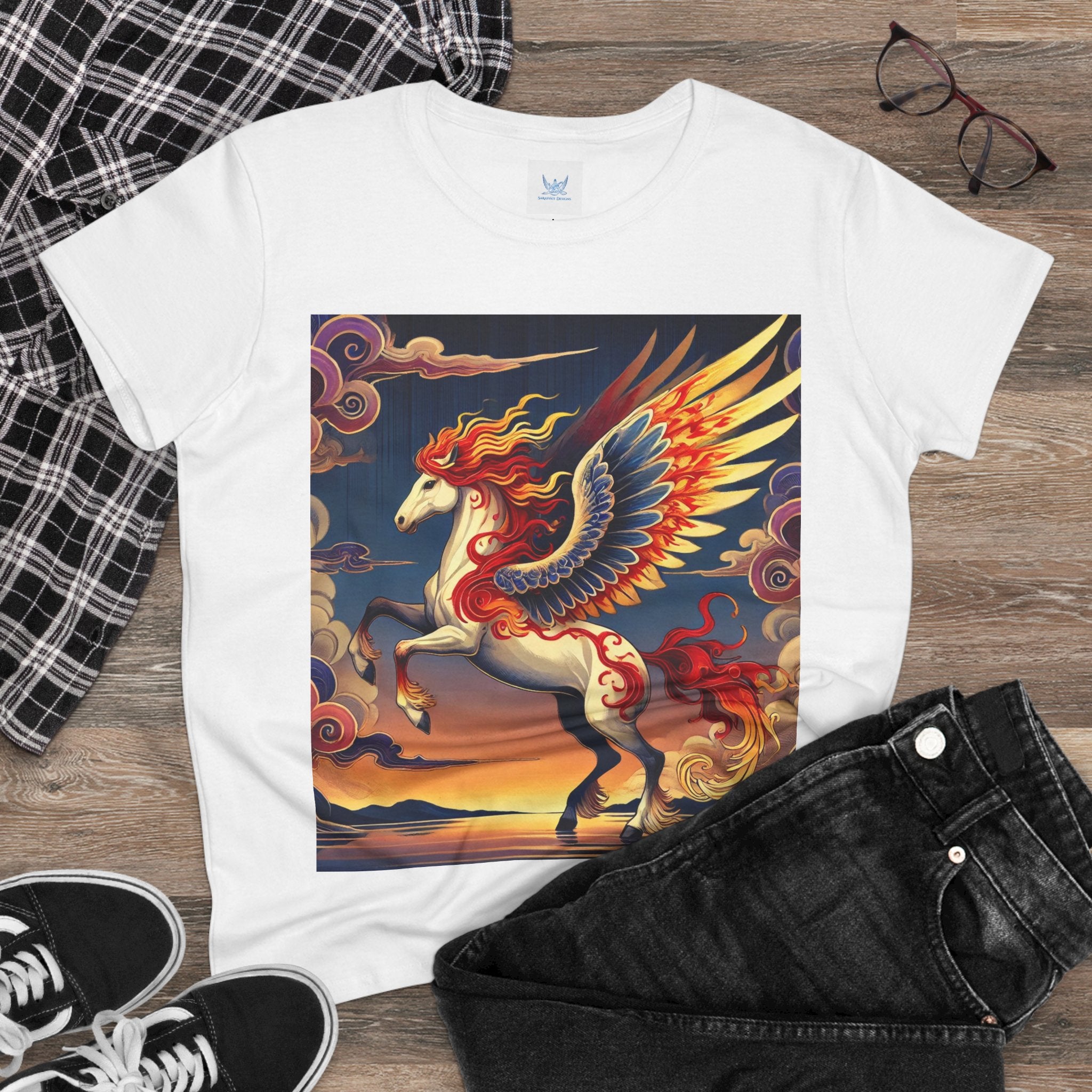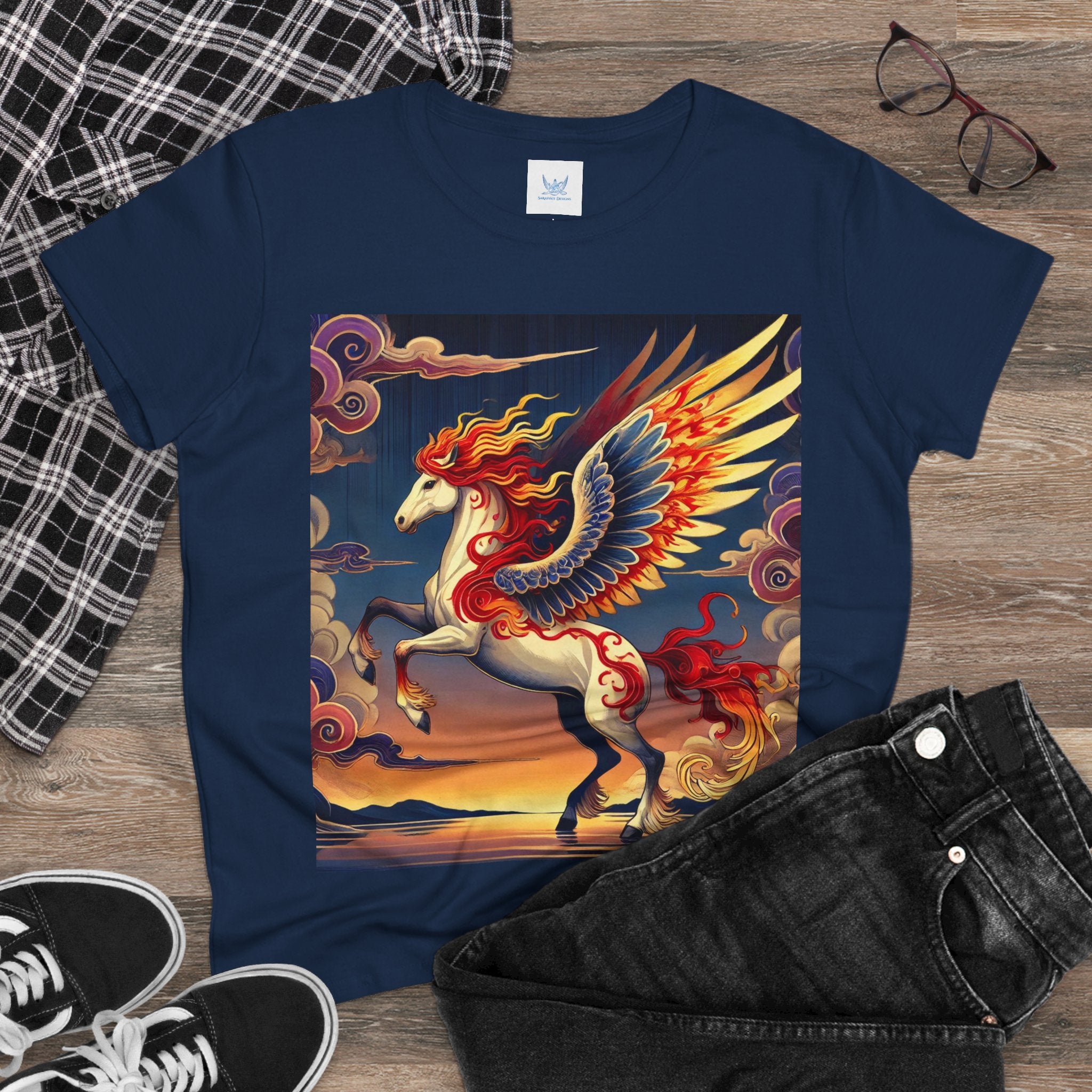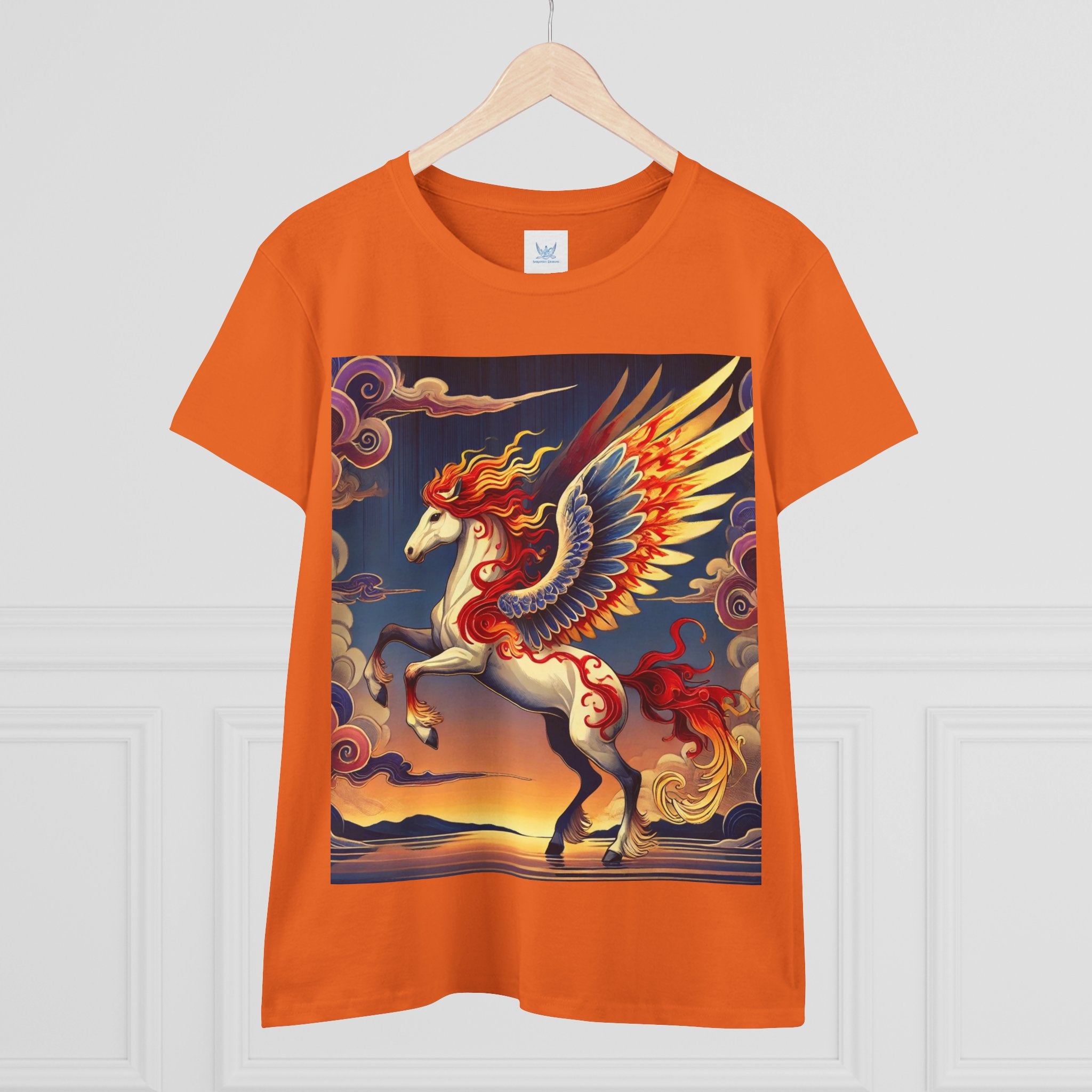Slip into comfort and artistry with this women’s midweight cotton tee, crafted from 100% soft, breathable cotton and designed with a semi-fitted silhouette that flatters while staying easy to wear. Pre-shrunk for lasting shape and finished with cap sleeves and a taped neck and shoulders, it’s made to be both durable and stylish. Across the front, the fabric becomes a canvas for a flawless ukiyo-e inspired fantasy scene: a noble horse rearing with expansive flame-patterned wings in red, orange, and gold. Its flowing mane and tail arc gracefully while indigo and silver thundercloud markings swirl across its flanks. Behind it, a sunset sky of deep blues, purples, and warm tones reflects over a tranquil sea and distant mountains. Blending Kabuki-inspired drama with the elegance of ukiyo-e tradition, this tee turns everyday wear into a timeless piece of wearable fantasy art.