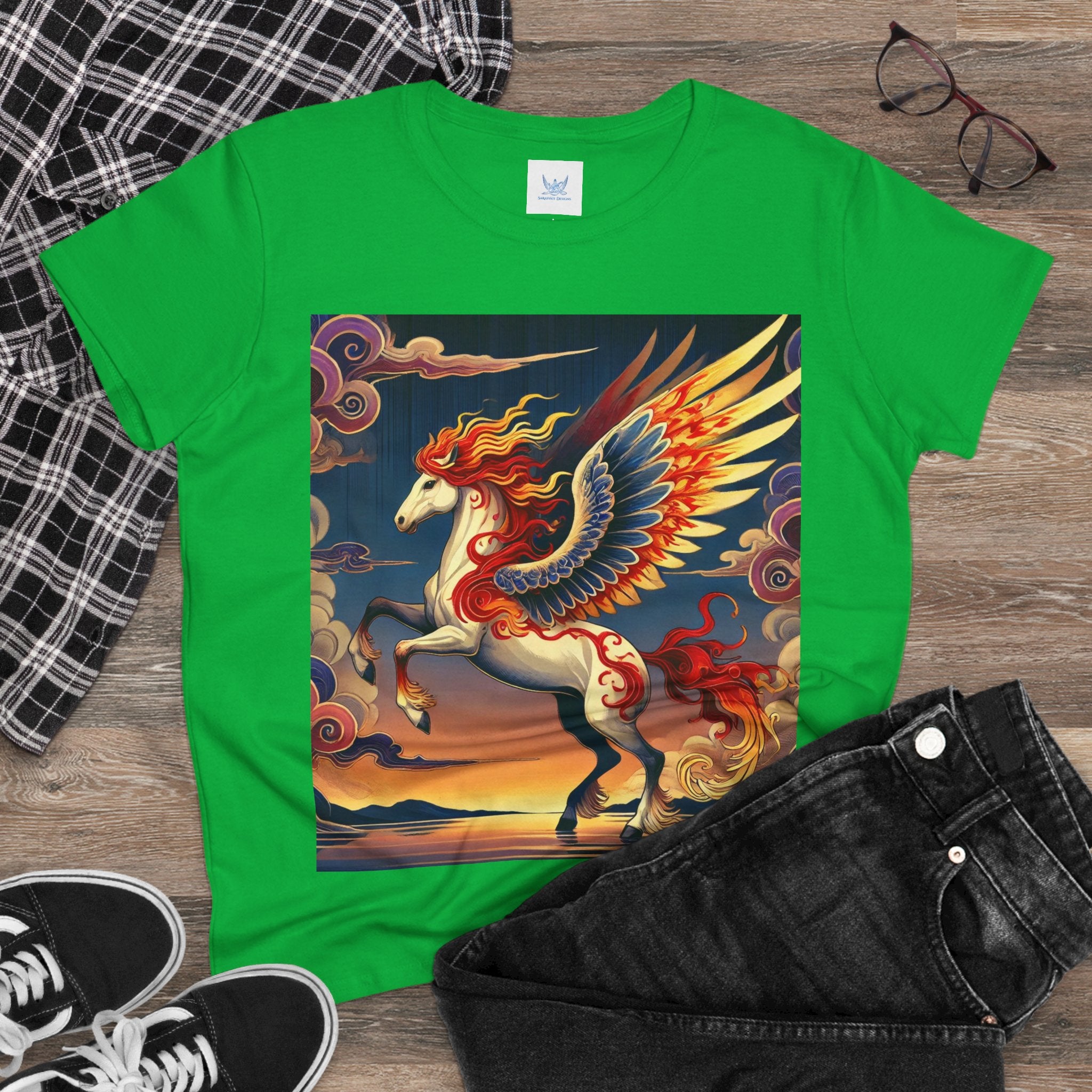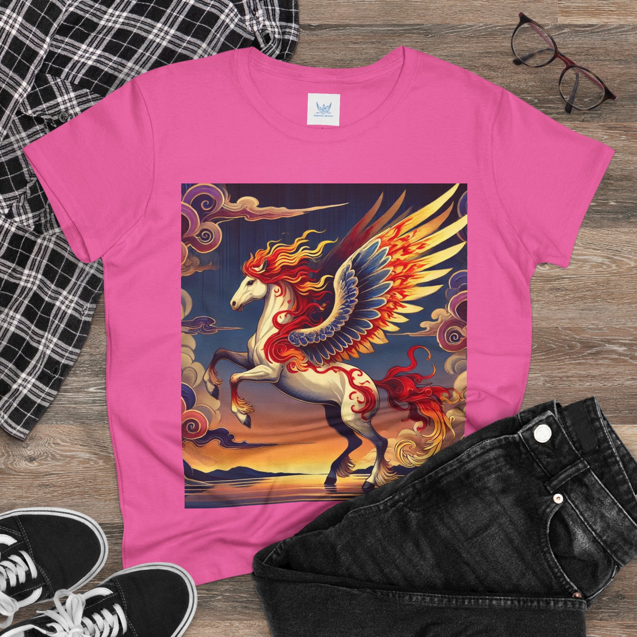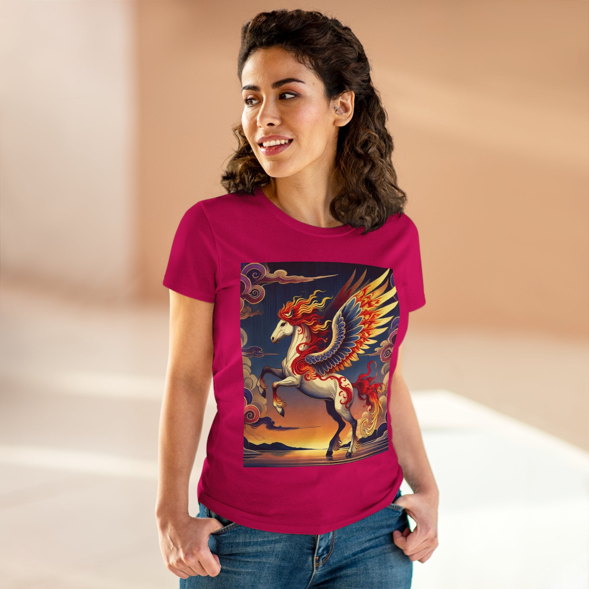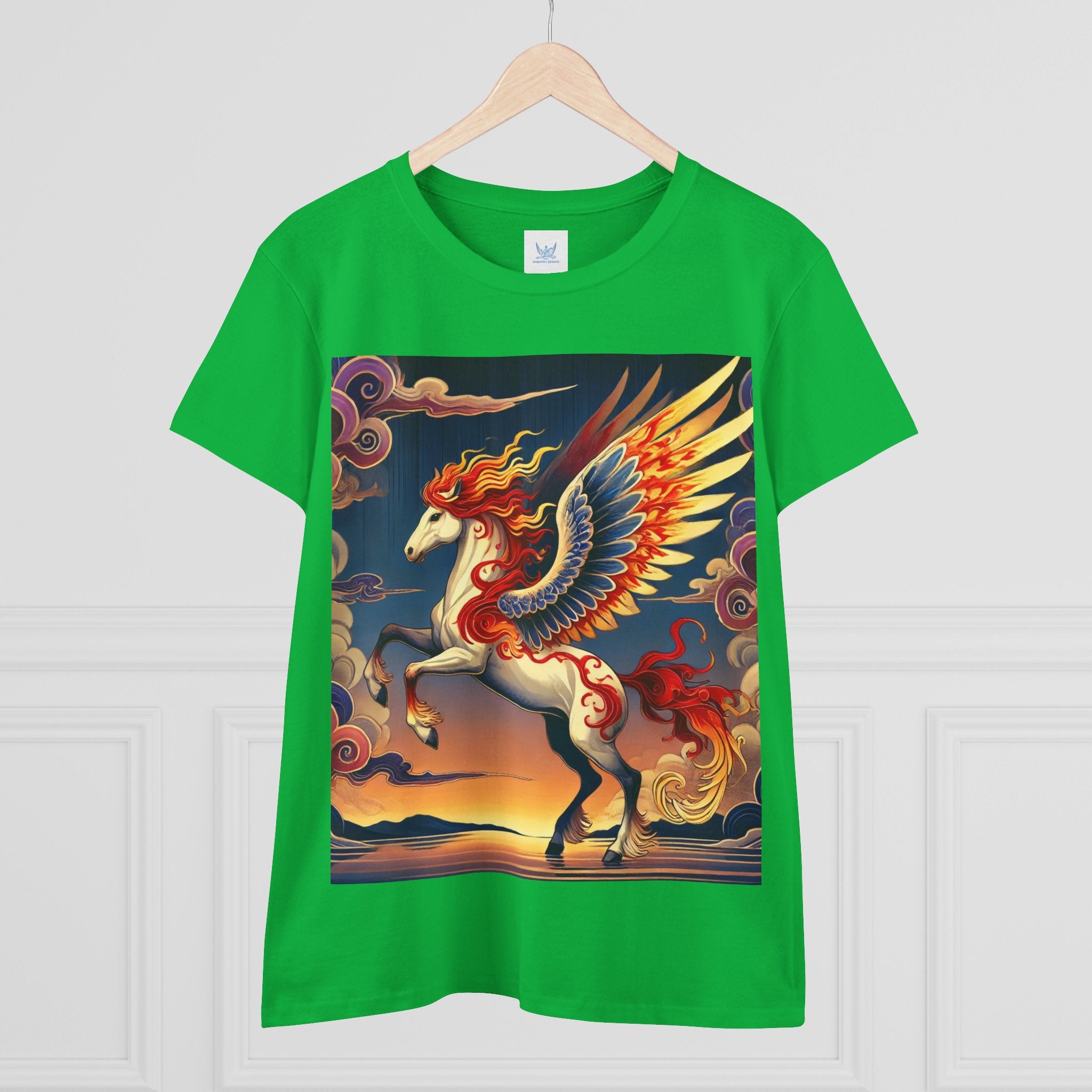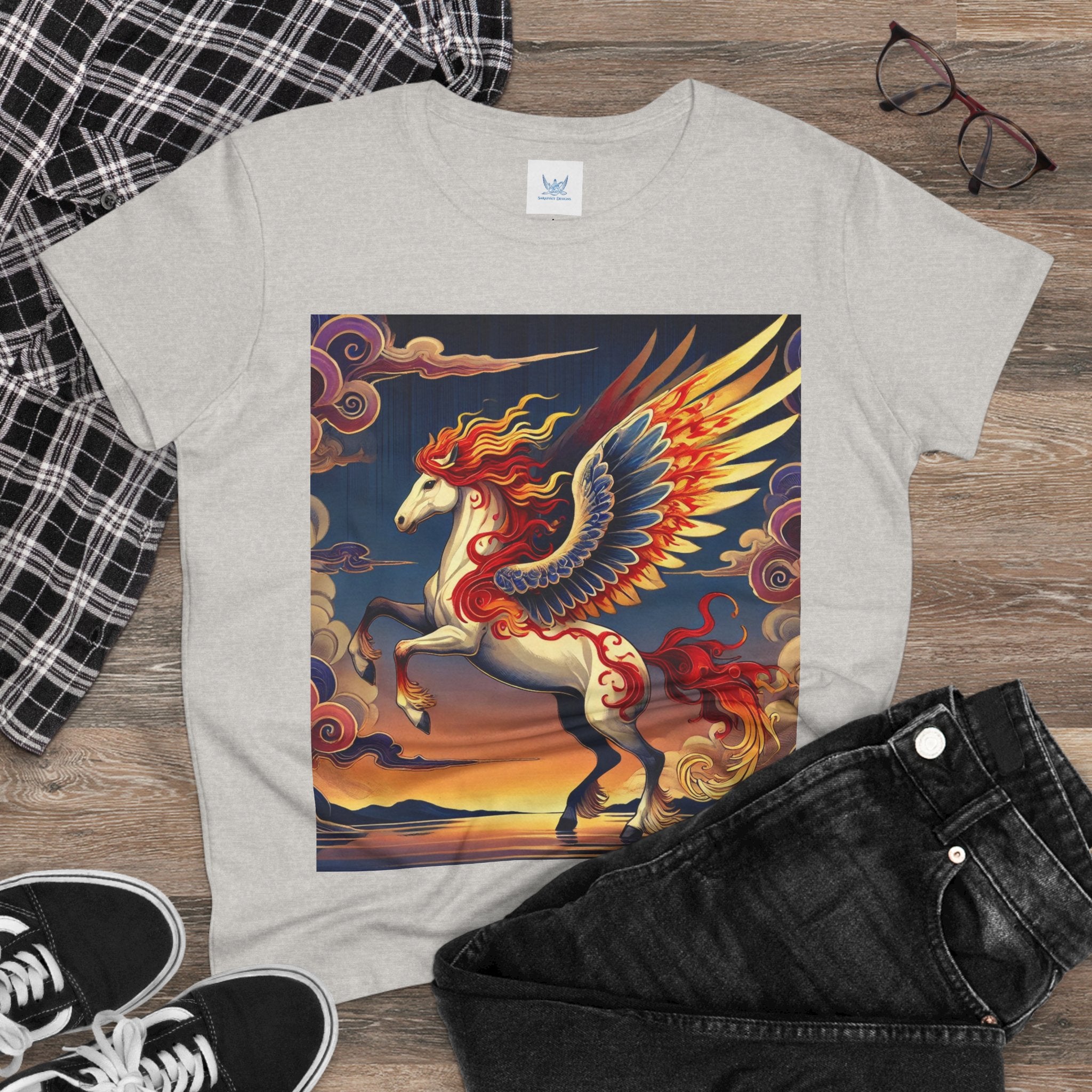Slip into comfort and artistry with this women’s midweight cotton tee, crafted from 100% soft, breathable cotton and designed with a semi-fitted silhouette that flatters while staying easy to wear. Pre-shrunk for lasting shape and finished with cap sleeves and a taped neck and shoulders, it’s made to be both durable and stylish. Across the front, the fabric becomes a canvas for a flawless ukiyo-e inspired fantasy scene: a noble horse rearing with expansive flame-patterned wings in red, orange, and gold. Its flowing mane and tail arc gracefully while indigo and silver thundercloud markings swirl across its flanks. Behind it, a sunset sky of deep blues, purples, and warm tones reflects over a tranquil sea and distant mountains. Blending Kabuki-inspired drama with the elegance of ukiyo-e tradition, this tee turns everyday wear into a timeless piece of wearable fantasy art.