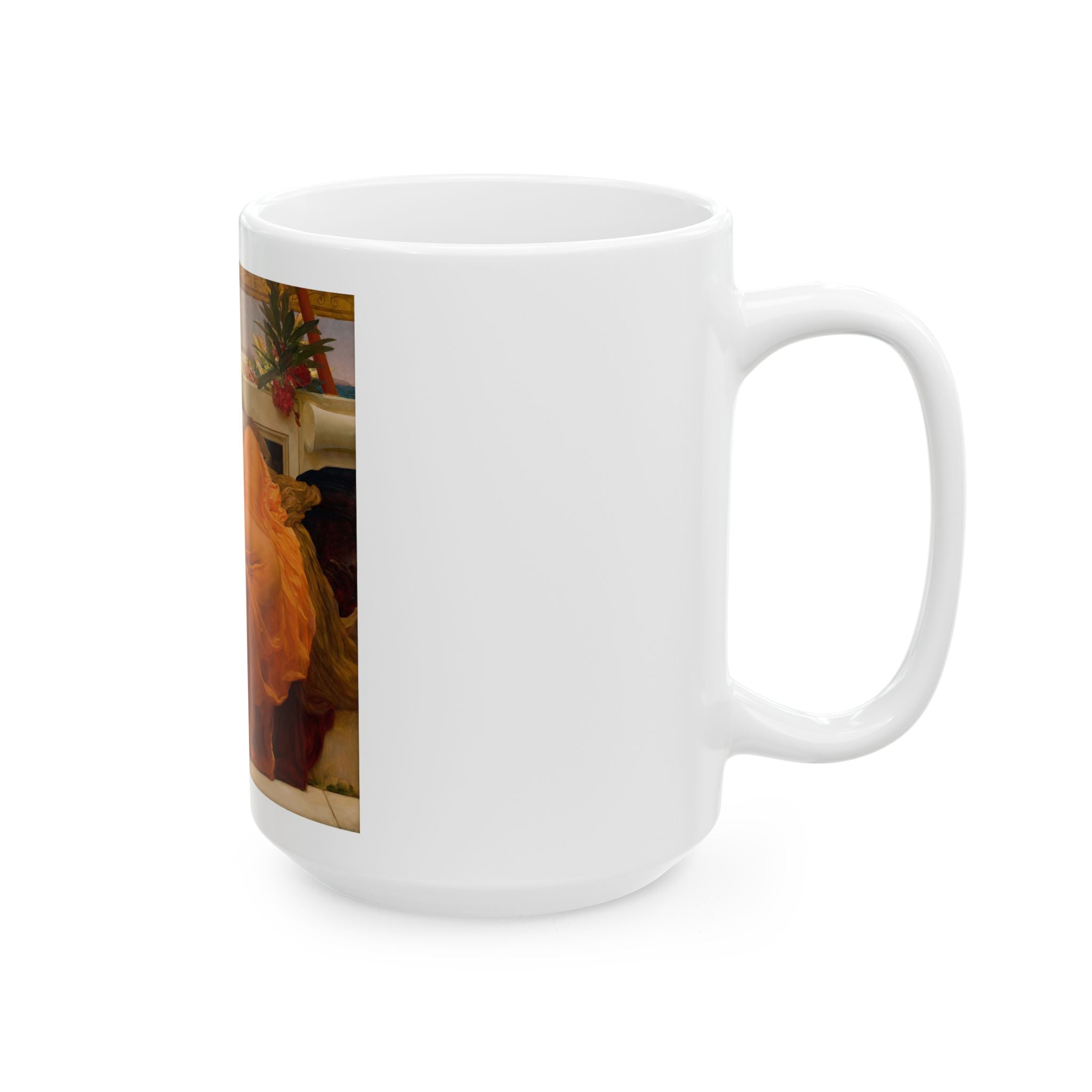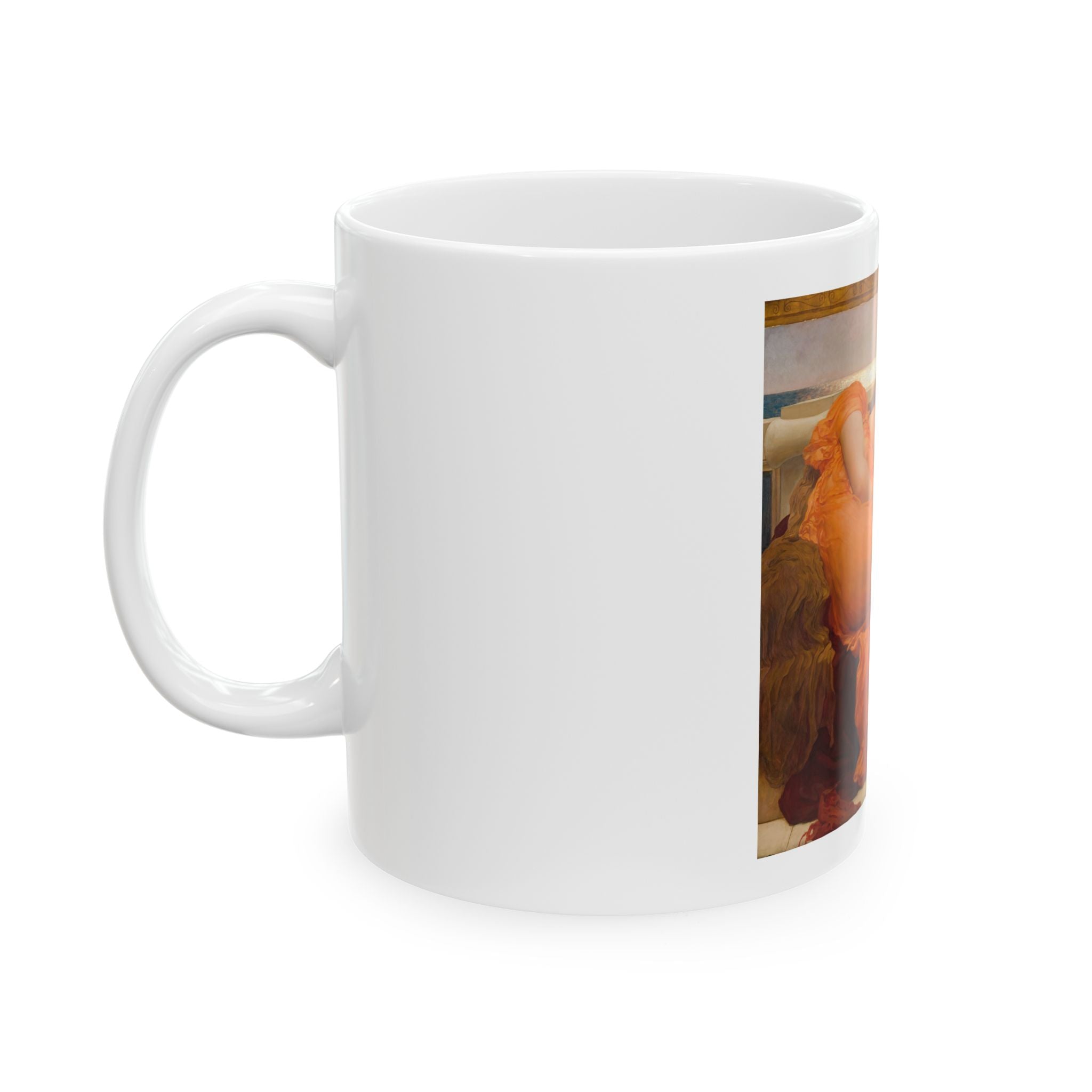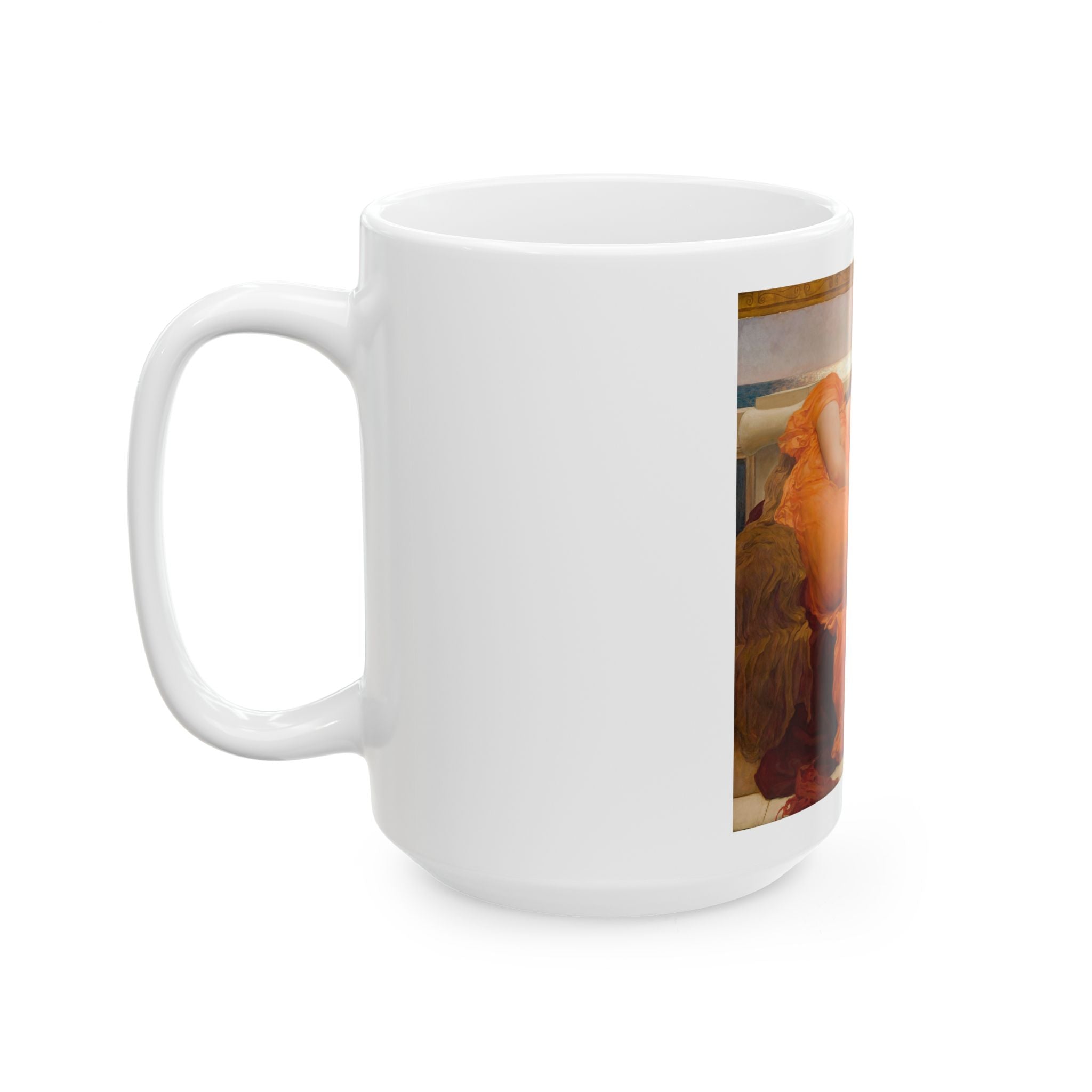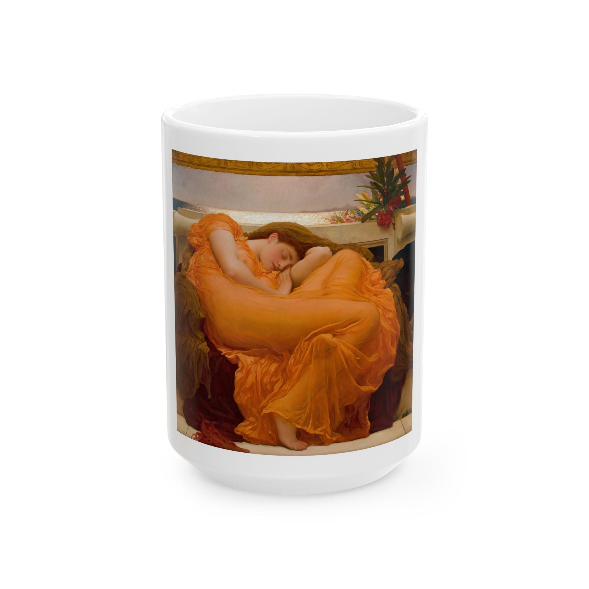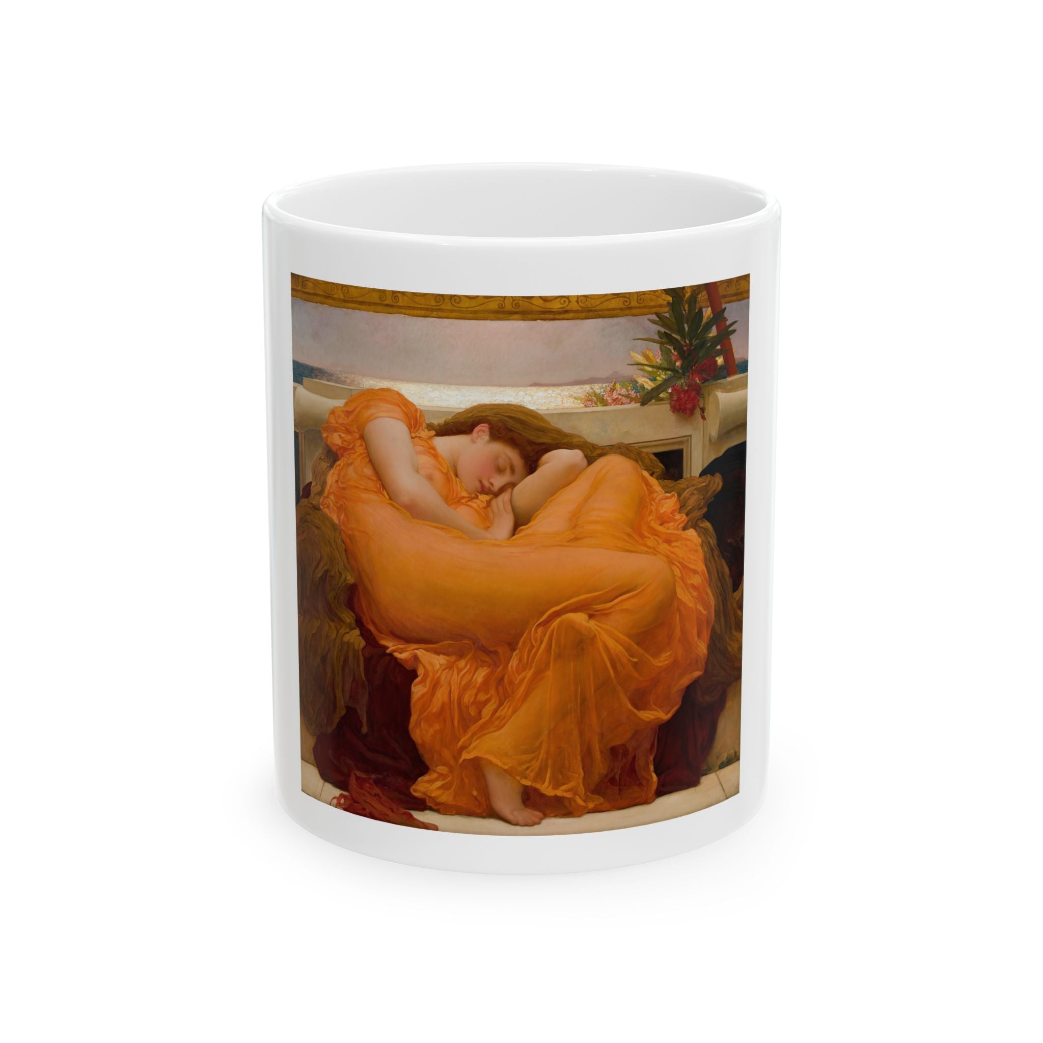 Artwork designed and digitally remastered by Sarasvati Designs. "Flaming June" is a masterpiece created by the English artist Frederic Leighton in 1895. The central subject of the painting is a young woman in a state of repose, reclining on a marble bench. Her figure is gracefully elongated, and she is bathed in the golden light of a Mediterranean summer. "Flaming June" is often associated with Neoclassicism, a style that drew inspiration from classical art and emphasized idealized forms and themes. The exquisite portrayal of the female form and the vibrant color palette make it a timeless masterpiece that continues to captivate art enthusiasts around the world.