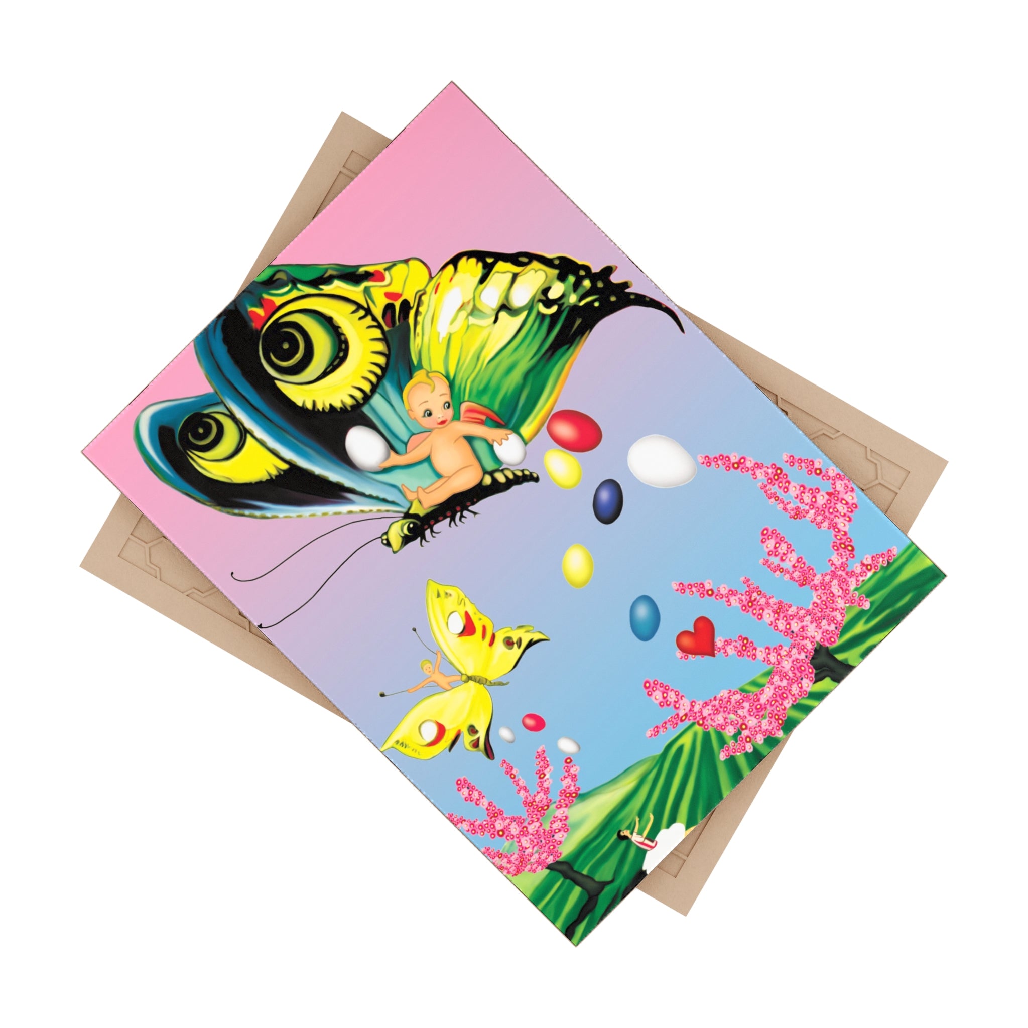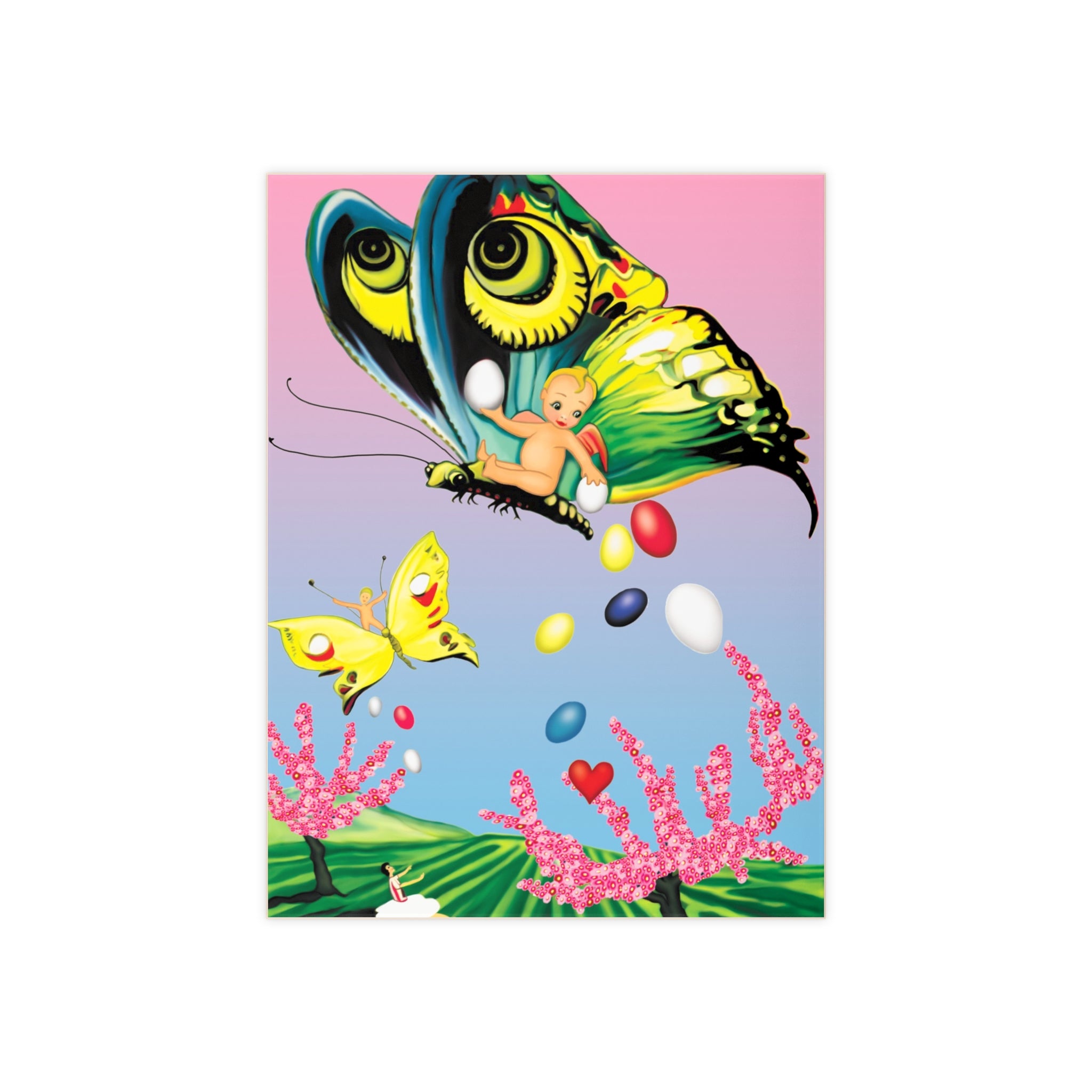 The artwork captures a dreamlike flight through pastel skies, where a wide-eyed butterfly carries a cherubic figure amid floating Easter eggs, hearts, and blossoms. Below, rolling green fields and blooming pink trees ground the scene in gentle wonder, while smaller butterflies and delicate details add motion and charm. Rendered in vivid colors with a playful, storybook sensibility, the design blends innocence, fantasy, and celebration—evoking the magic of Easter, renewal, and imagination in joyful flight.