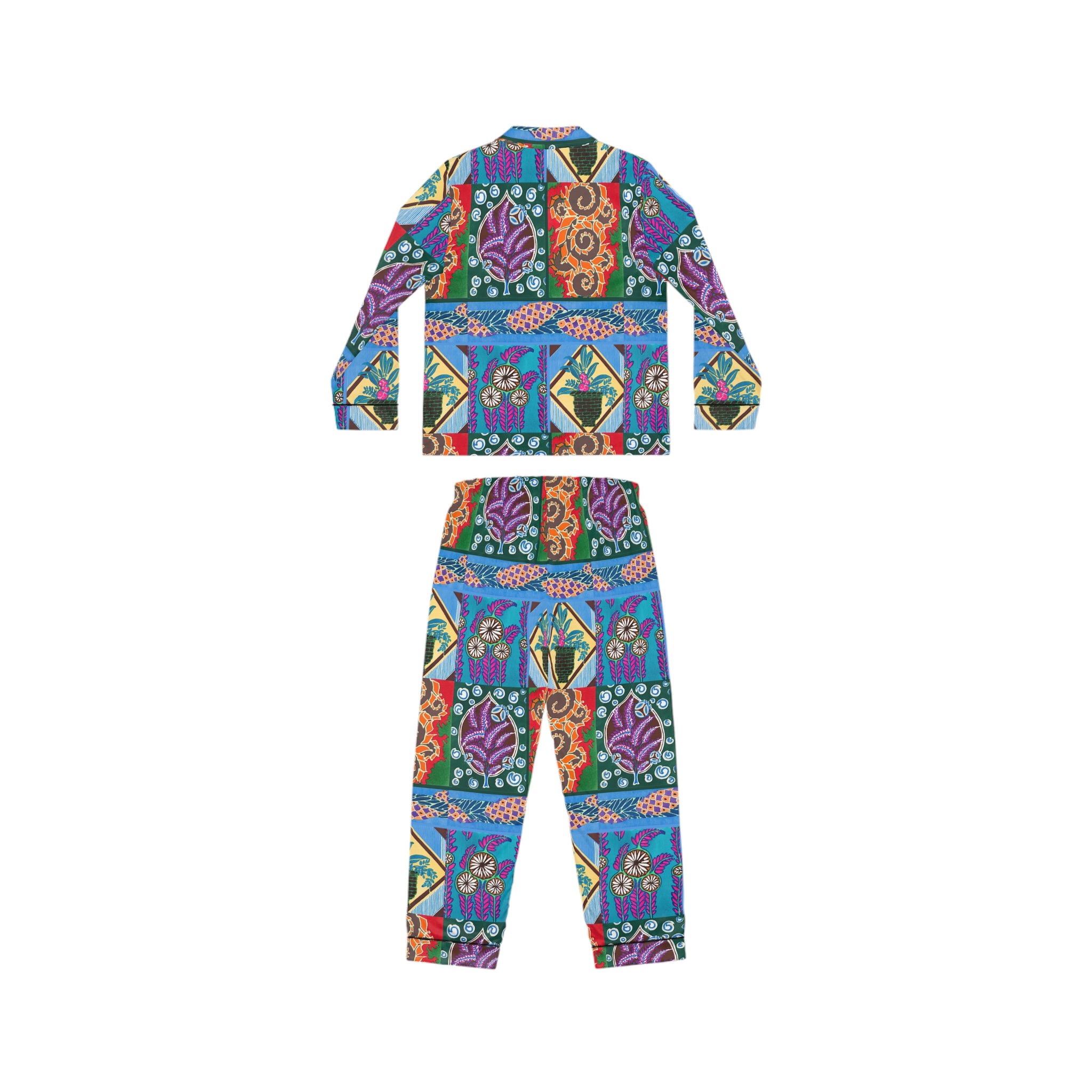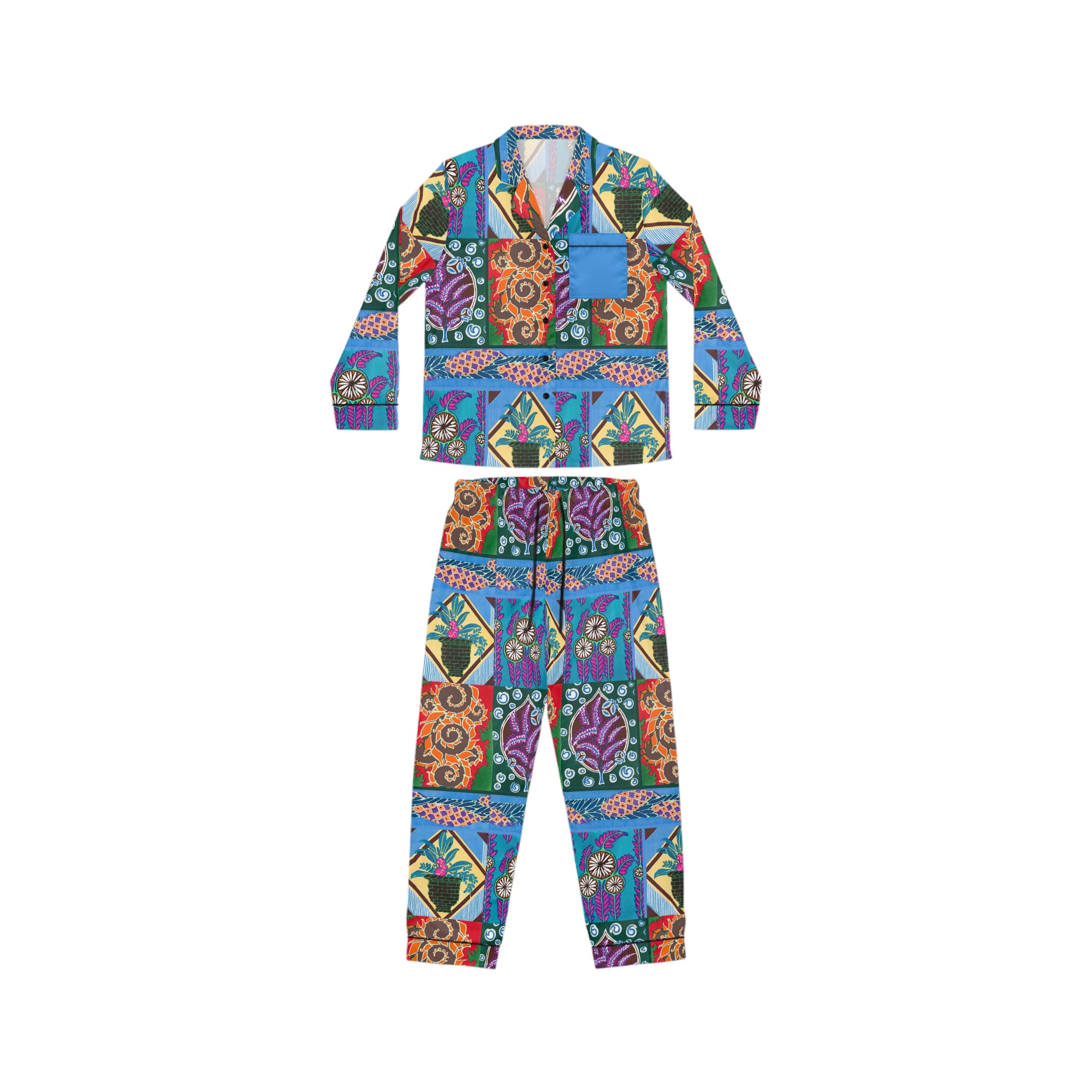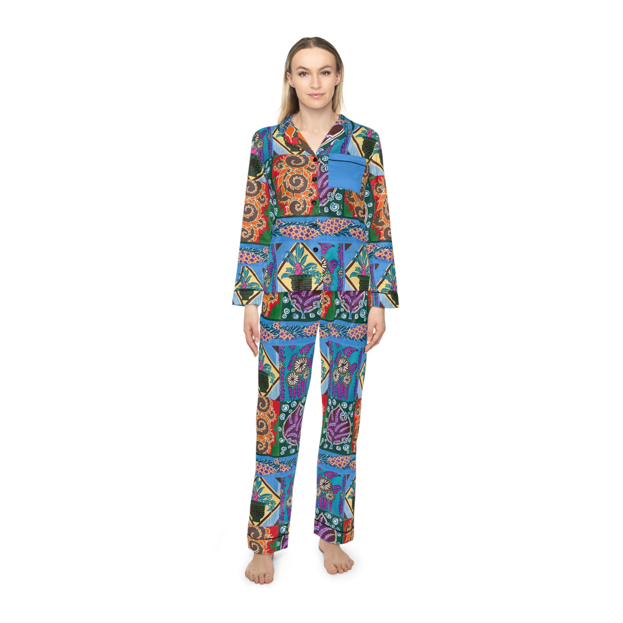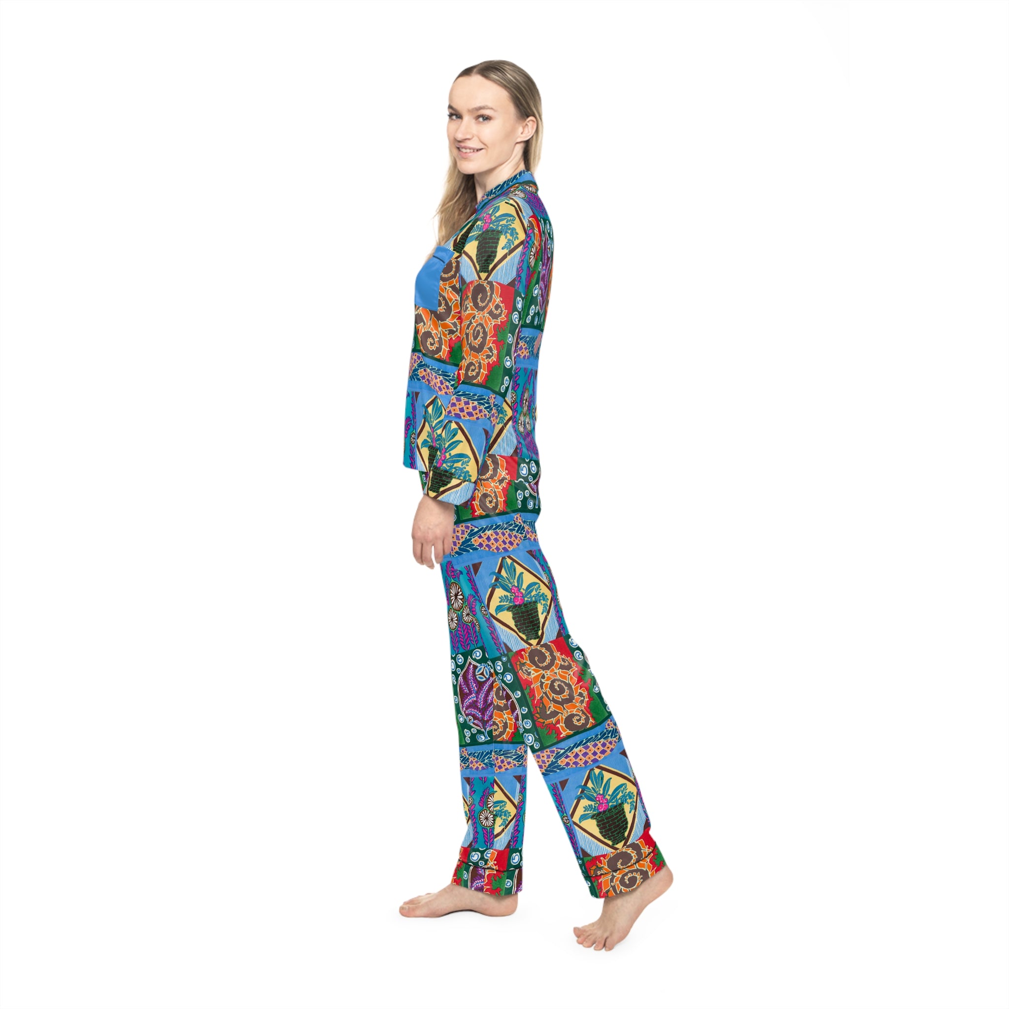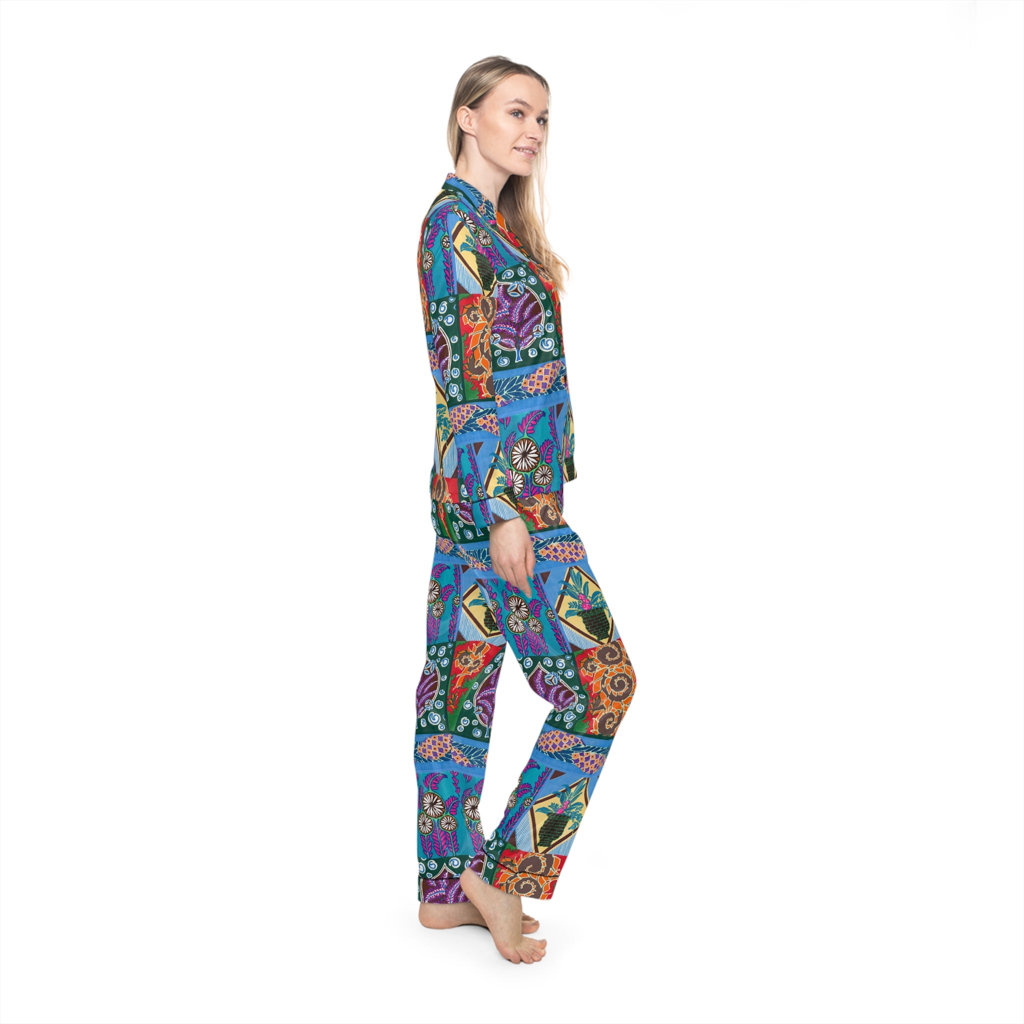Crafted with a blend of 95% polyester and 5% spandex, these vintage art-designed pajamas offer a luxuriously soft feel. The soft satin fabric contributes to the creation of distinctive pajama sets. Each set is complete with a notch lapel (collar style) and a drawstring waist, ensuring a comfortable and snug fit.
