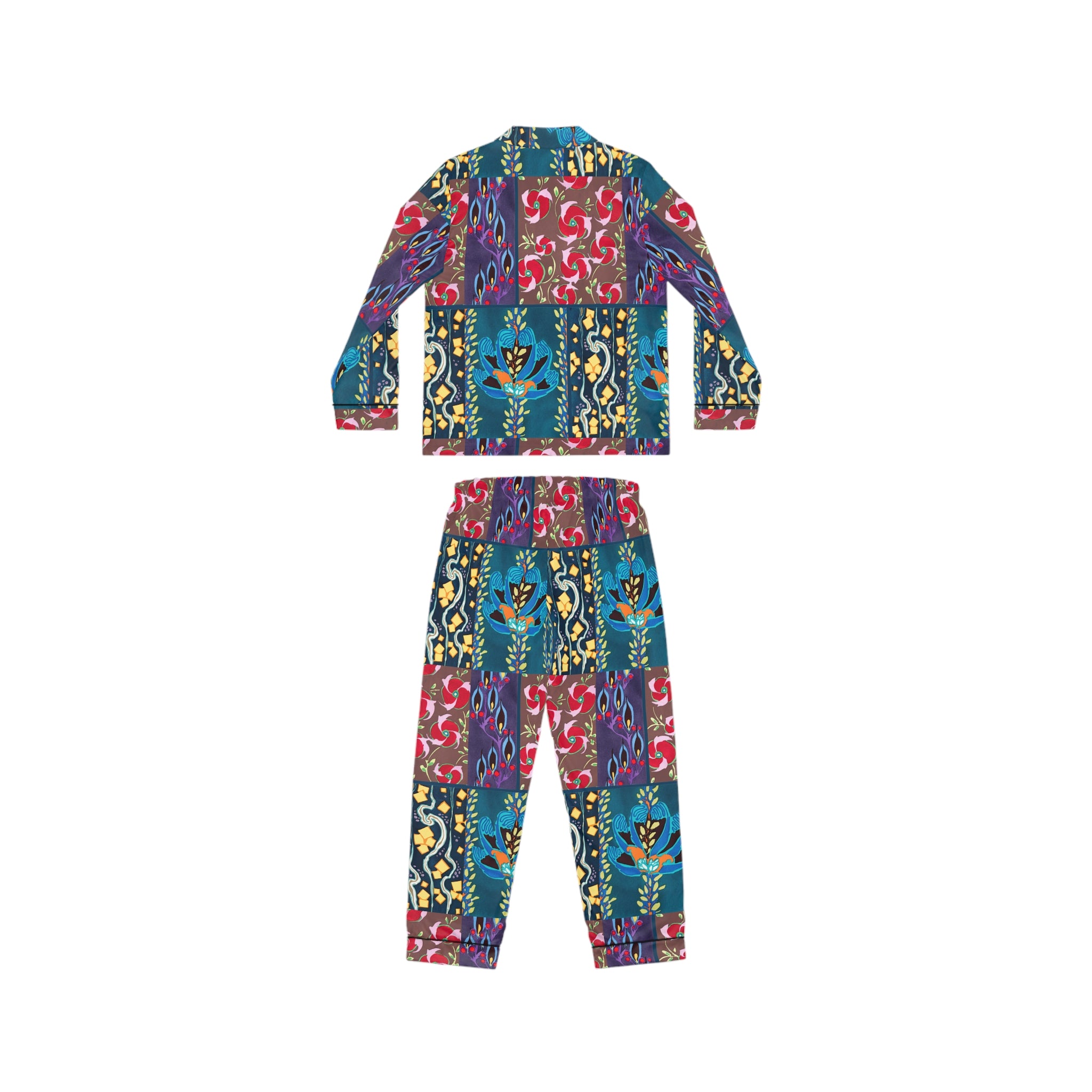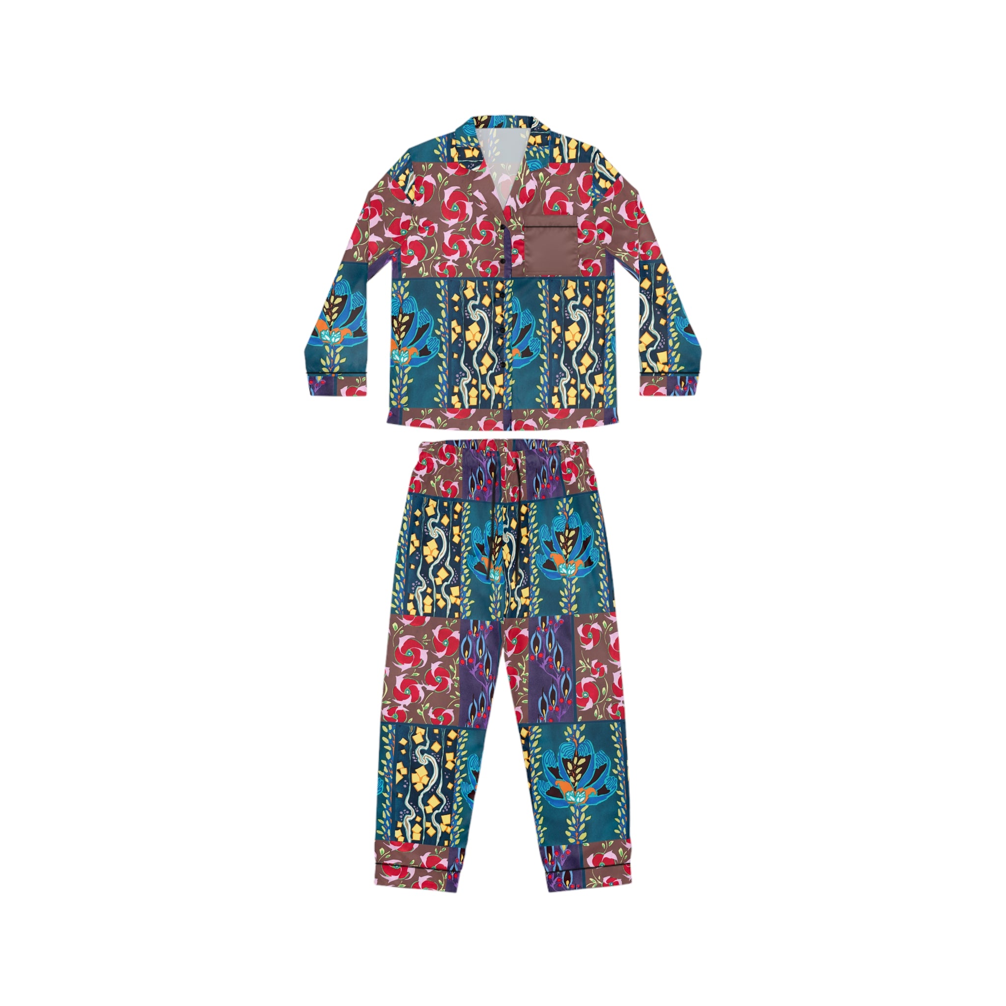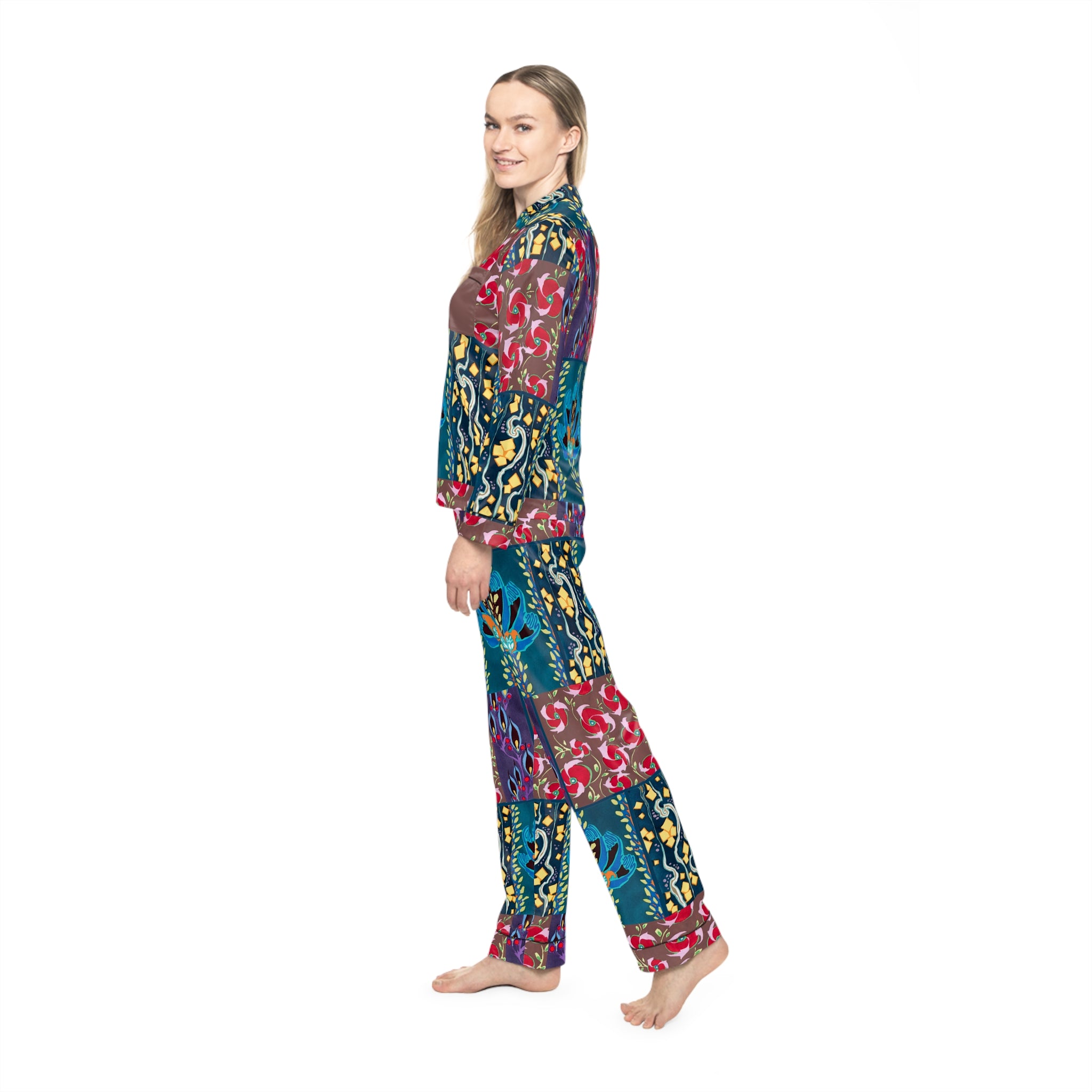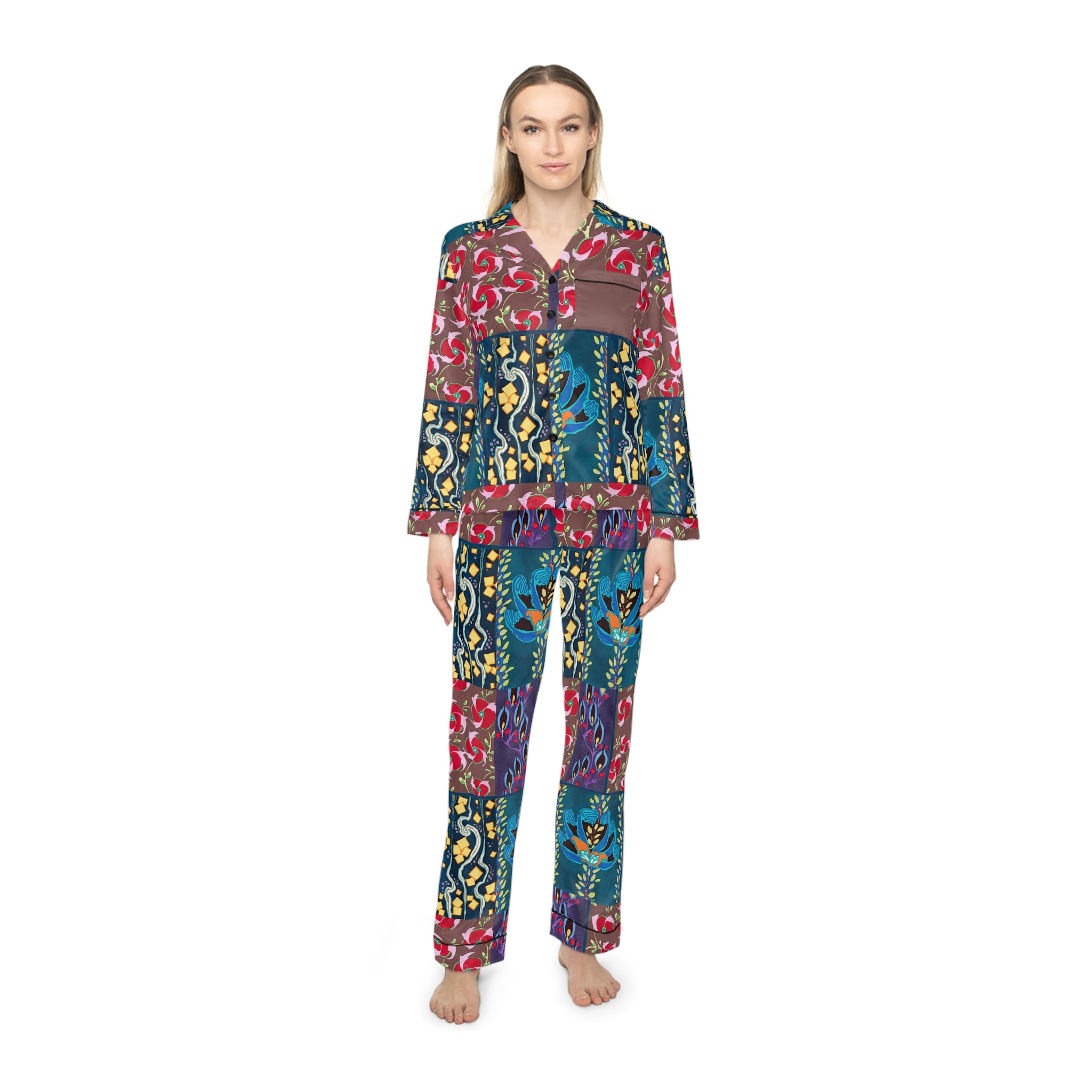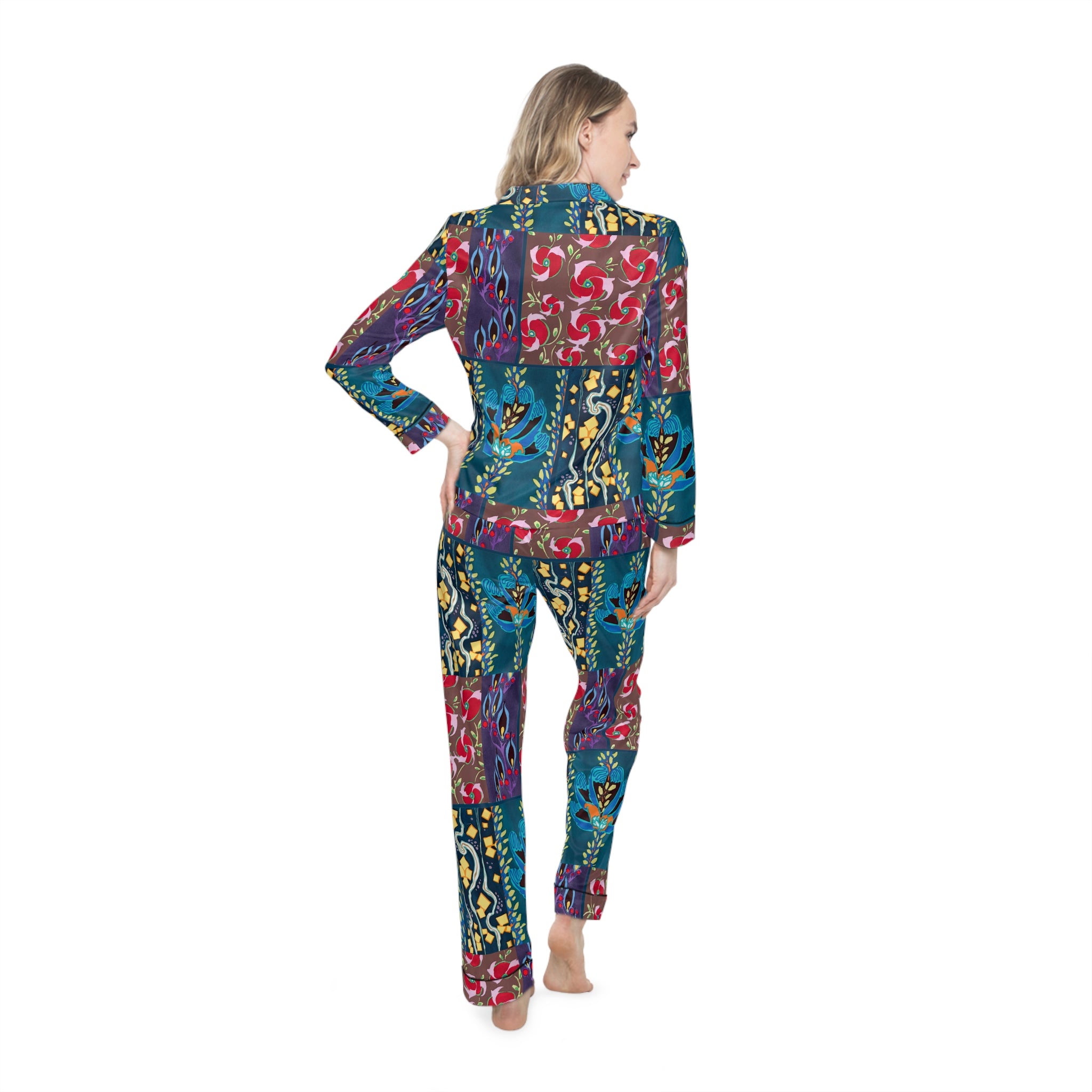 Crafted with a blend of 95% polyester and 5% spandex, these vintage art-designed pajamas offer a luxuriously soft feel. The soft satin fabric contributes to the creation of distinctive pajama sets. Each set is complete with a notch lapel (collar style) and a drawstring waist, ensuring a comfortable and snug fit.