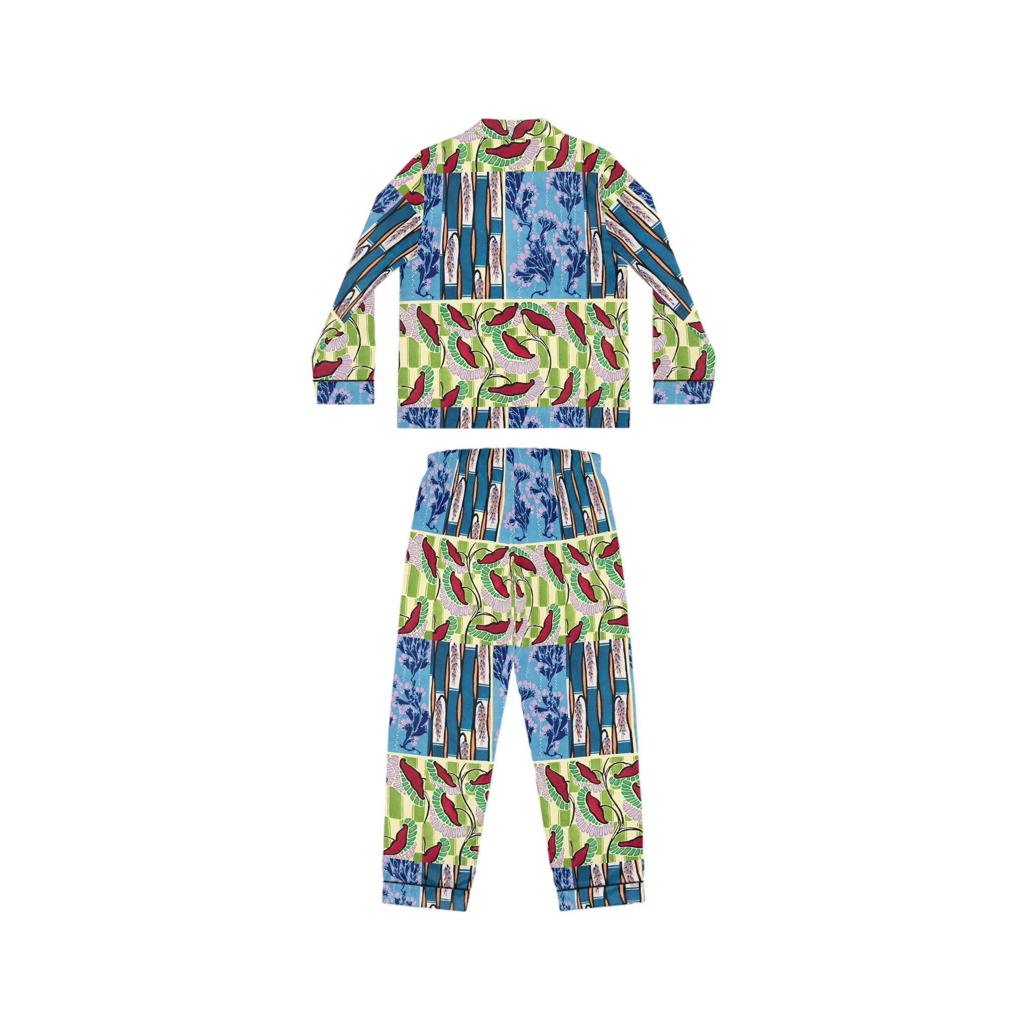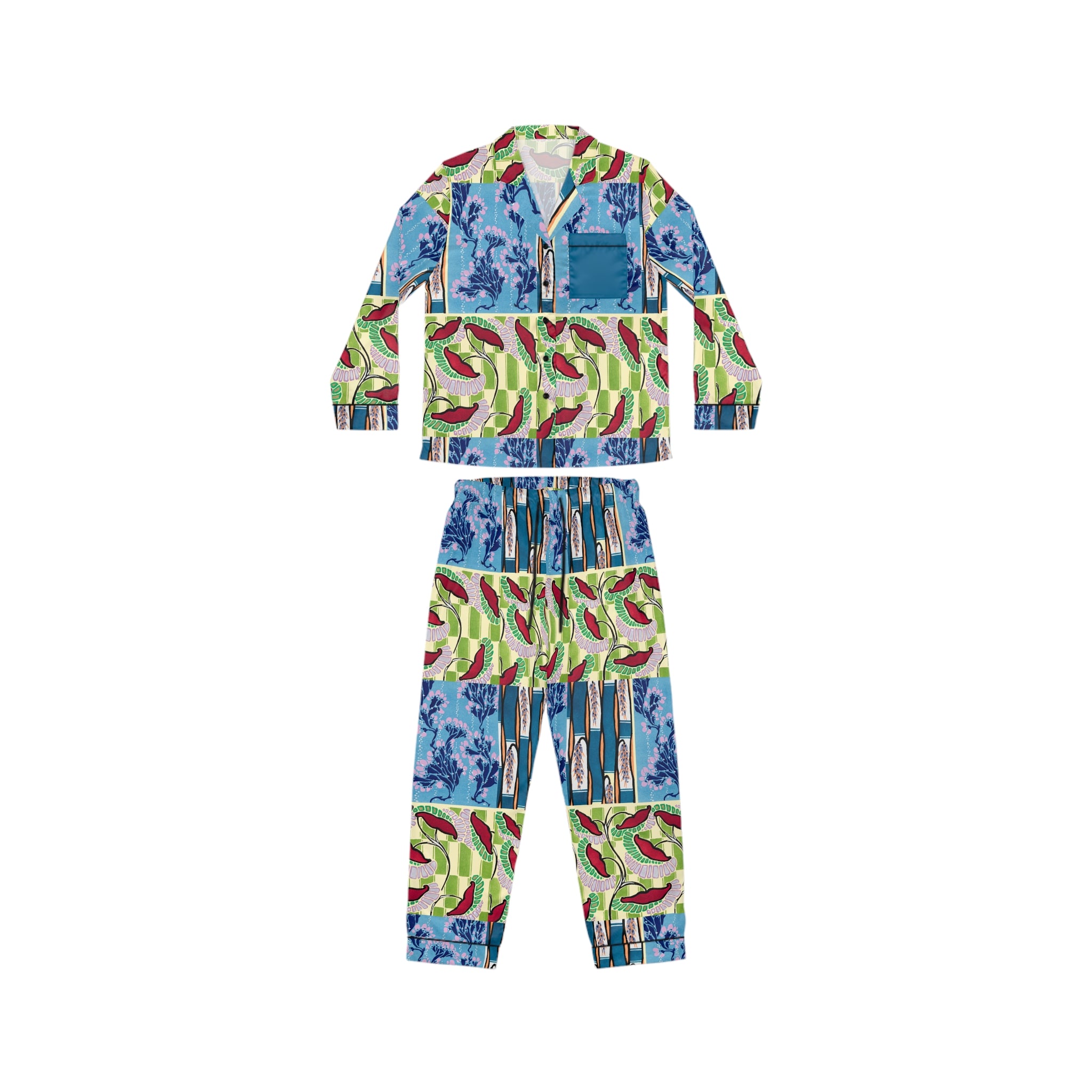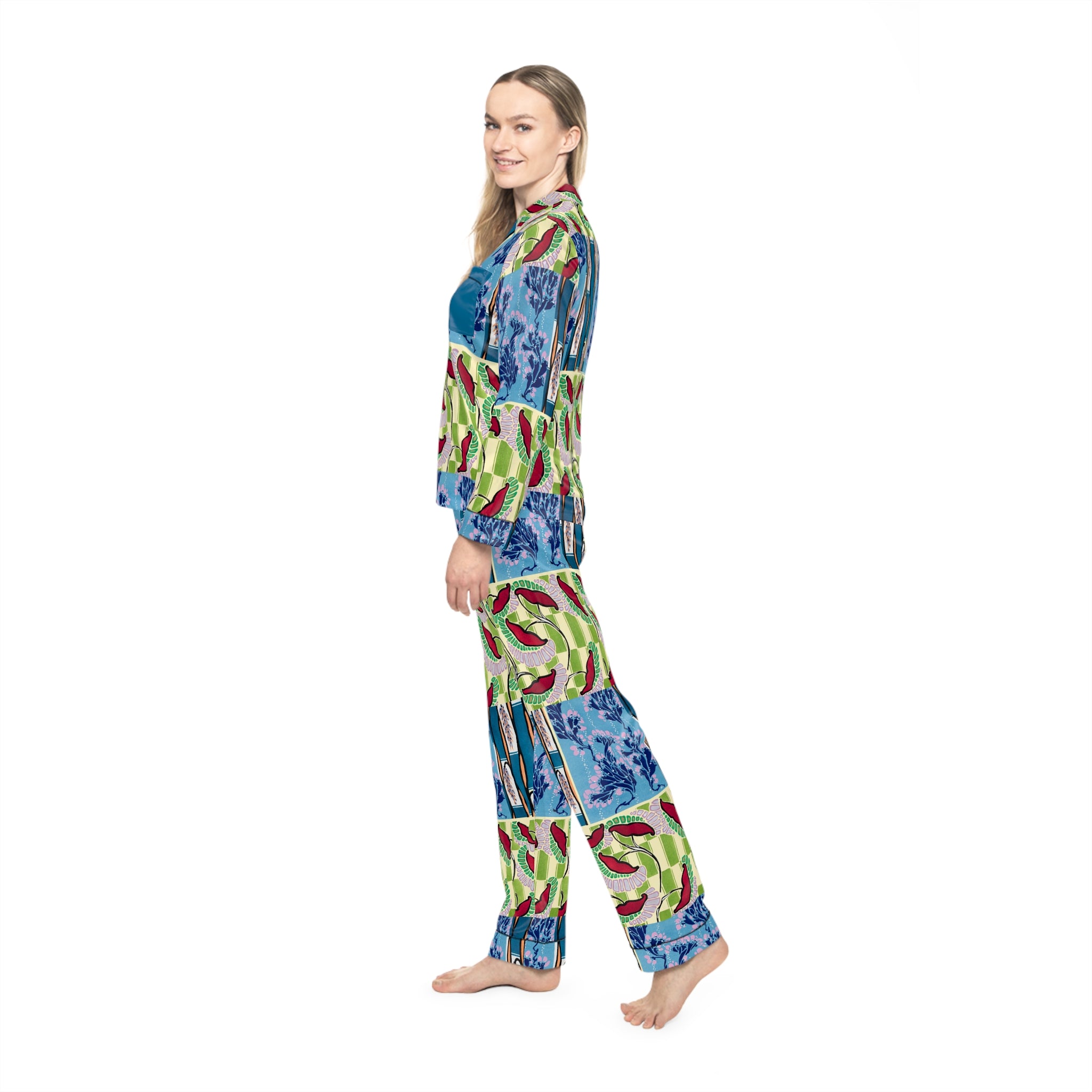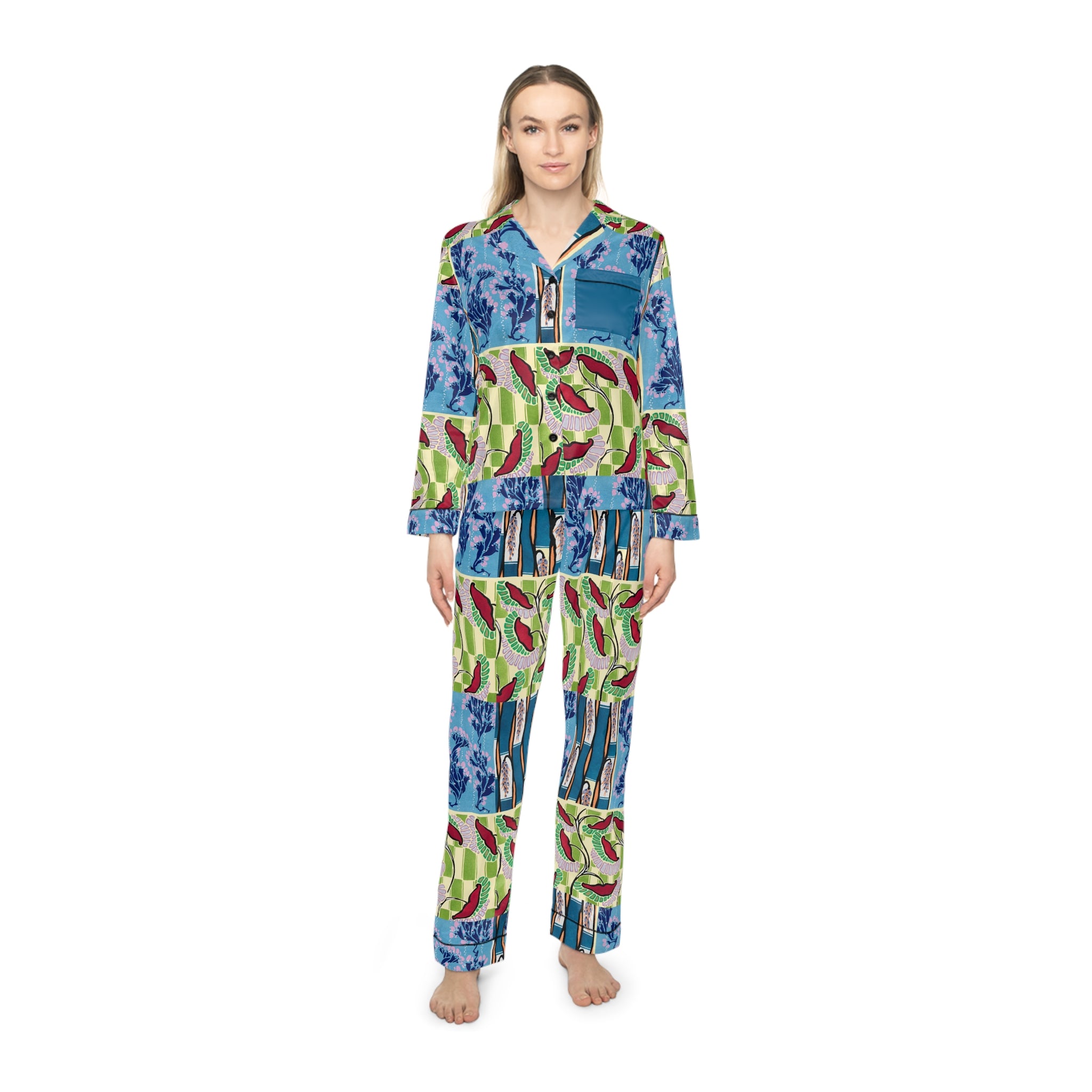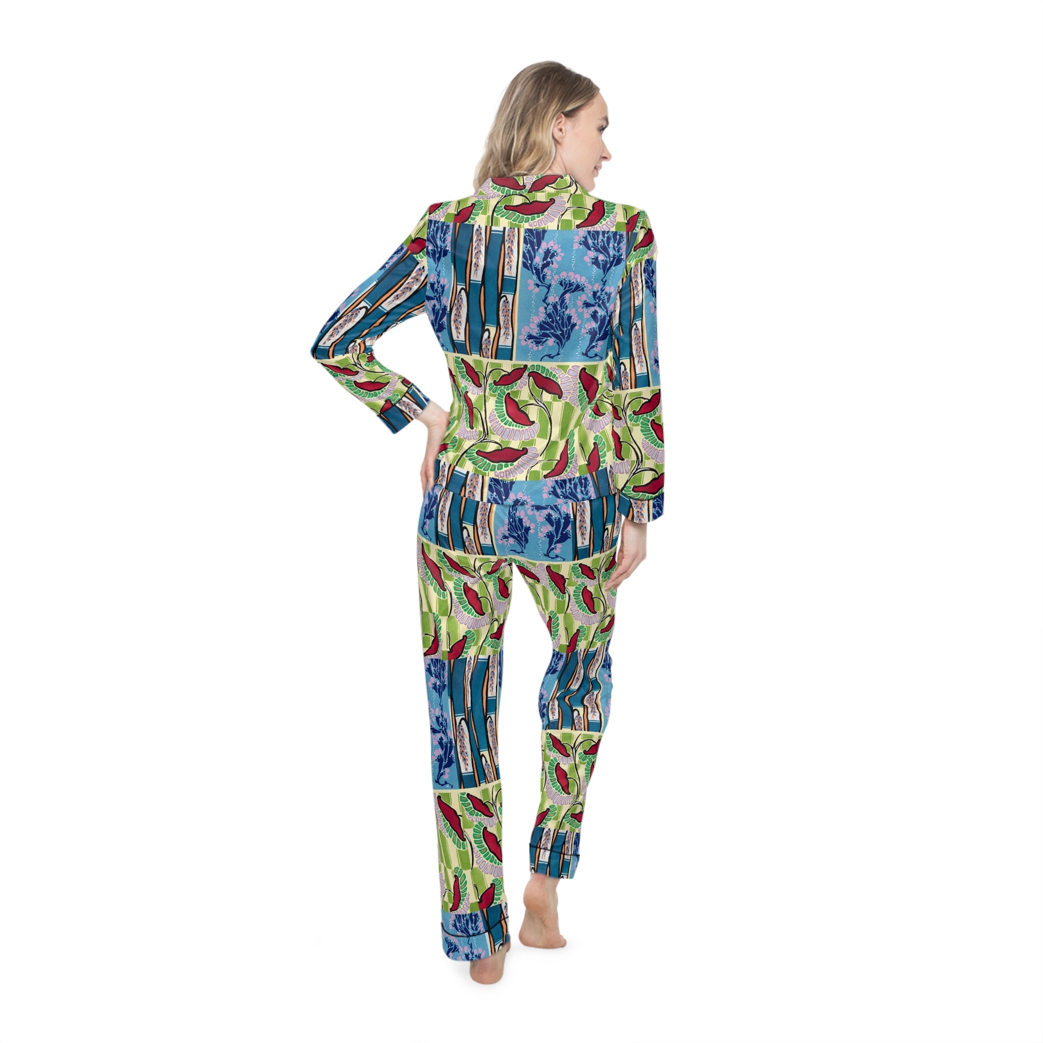 Crafted with a blend of 95% polyester and 5% spandex, these vintage art-designed pajamas offer a luxuriously soft feel. The soft satin fabric contributes to the creation of distinctive pajama sets. Each set is complete with a notch lapel (collar style) and a drawstring waist, ensuring a comfortable and snug fit.