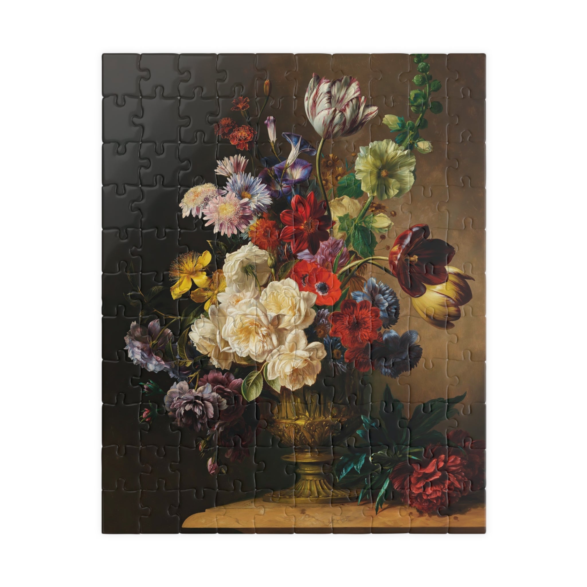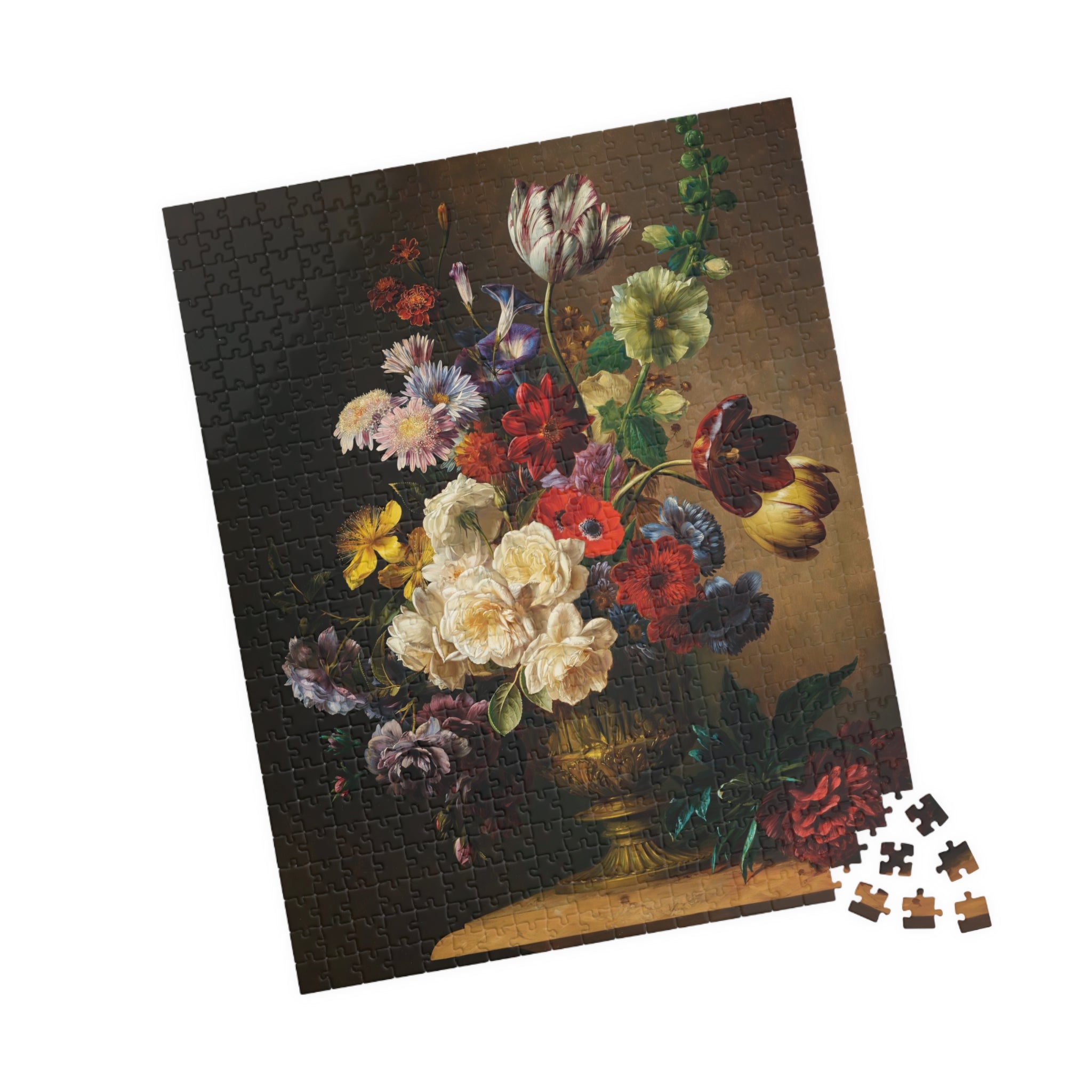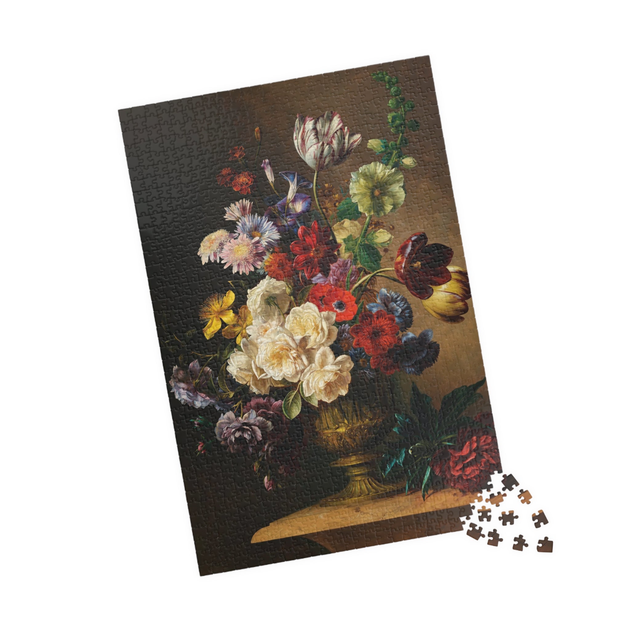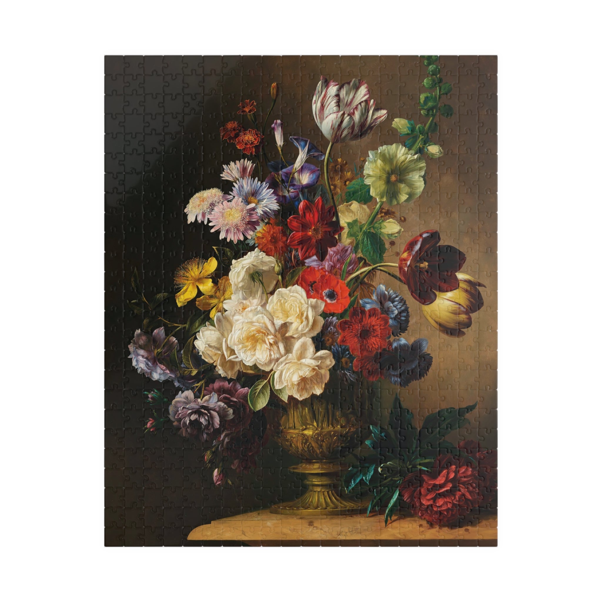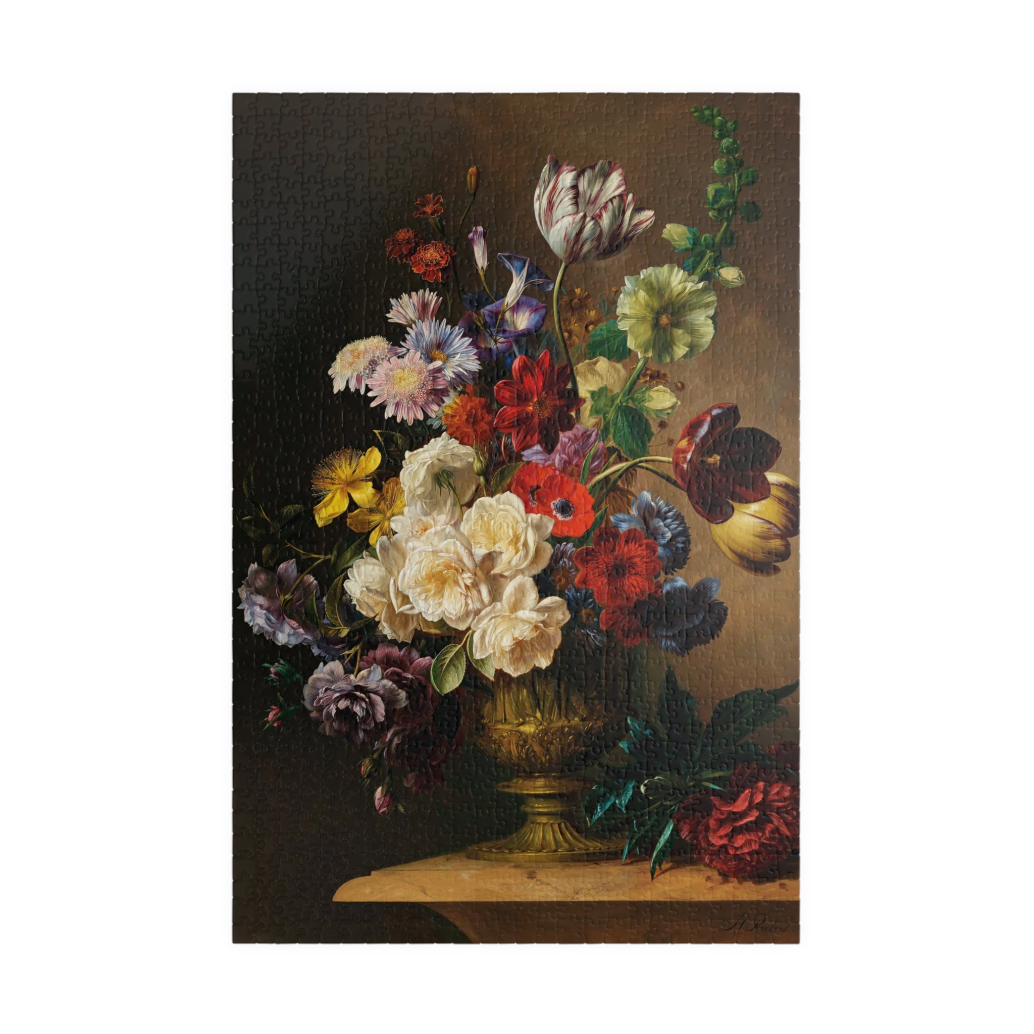 This puzzle invites you into a quiet stillness where each piece reveals a sliver of summertime abundance. Hendrik Reekers’ lush bouquet — roses, tulips, poppies and wildflowers spilling from an ornate gilded vase — is rendered in rich, saturated color and fine detail. Dark, moody backgrounds make the blossoms glow; soft highlights and subtle color shifts reward close inspection. As you assemble the glossy, chipboard pieces, the composition slowly reappears: a tactile, meditative experience that celebrates the elegance and fleeting beauty of a single summer moment. Display the finished image as a vignette of calm on your table, or frame it to bring a touch of refined floral still life into your home.