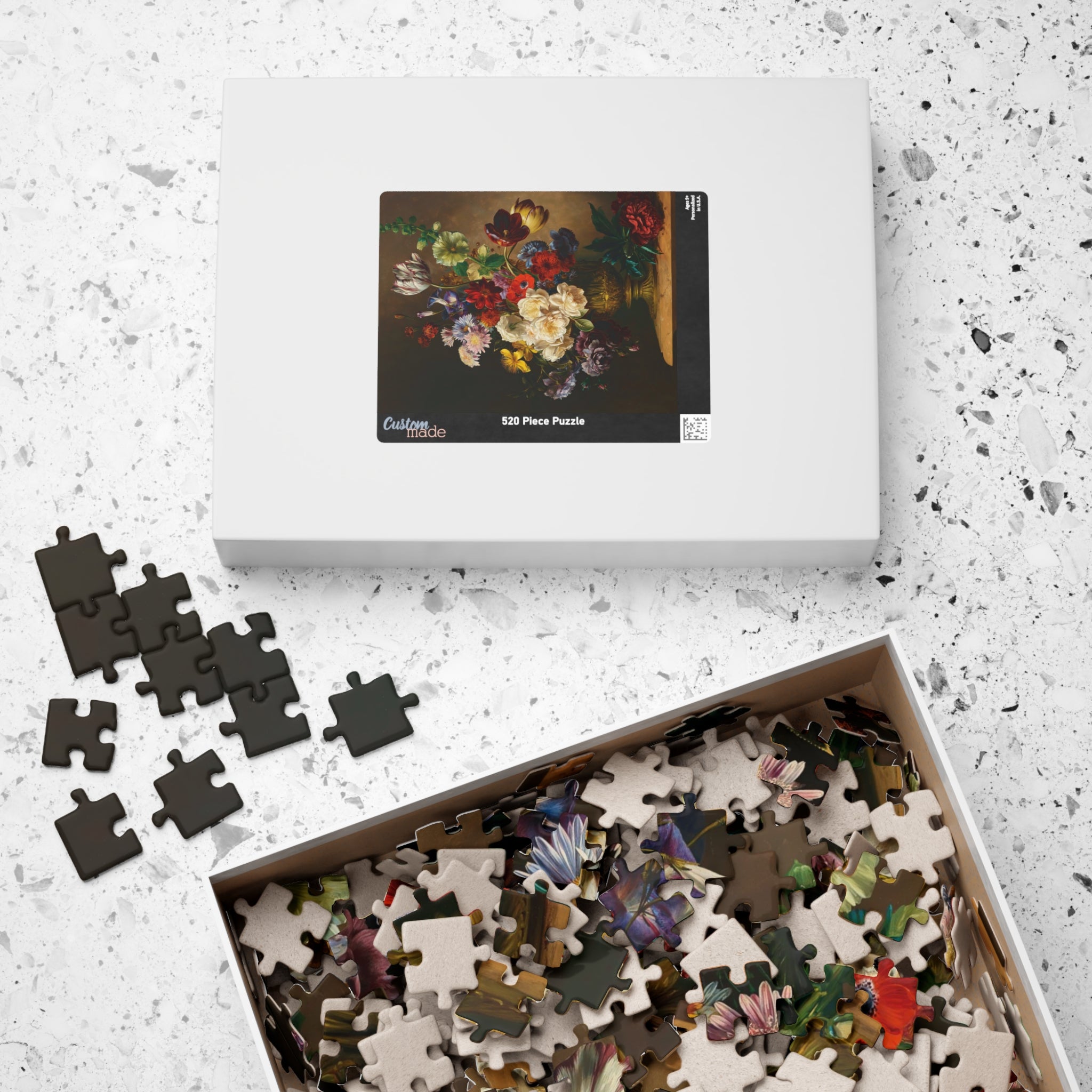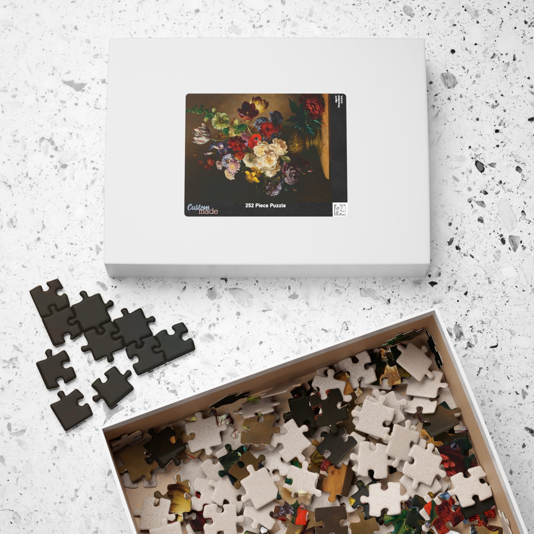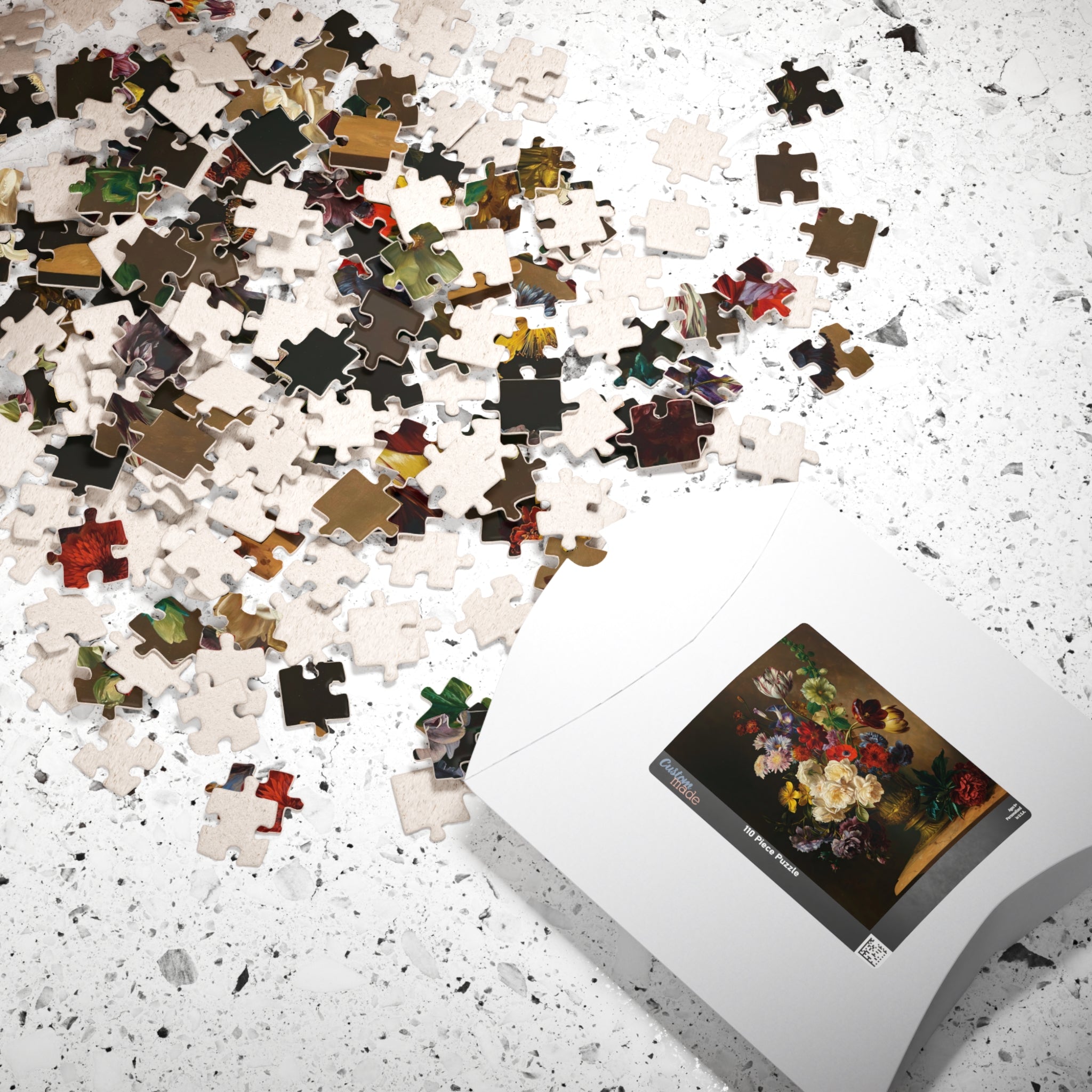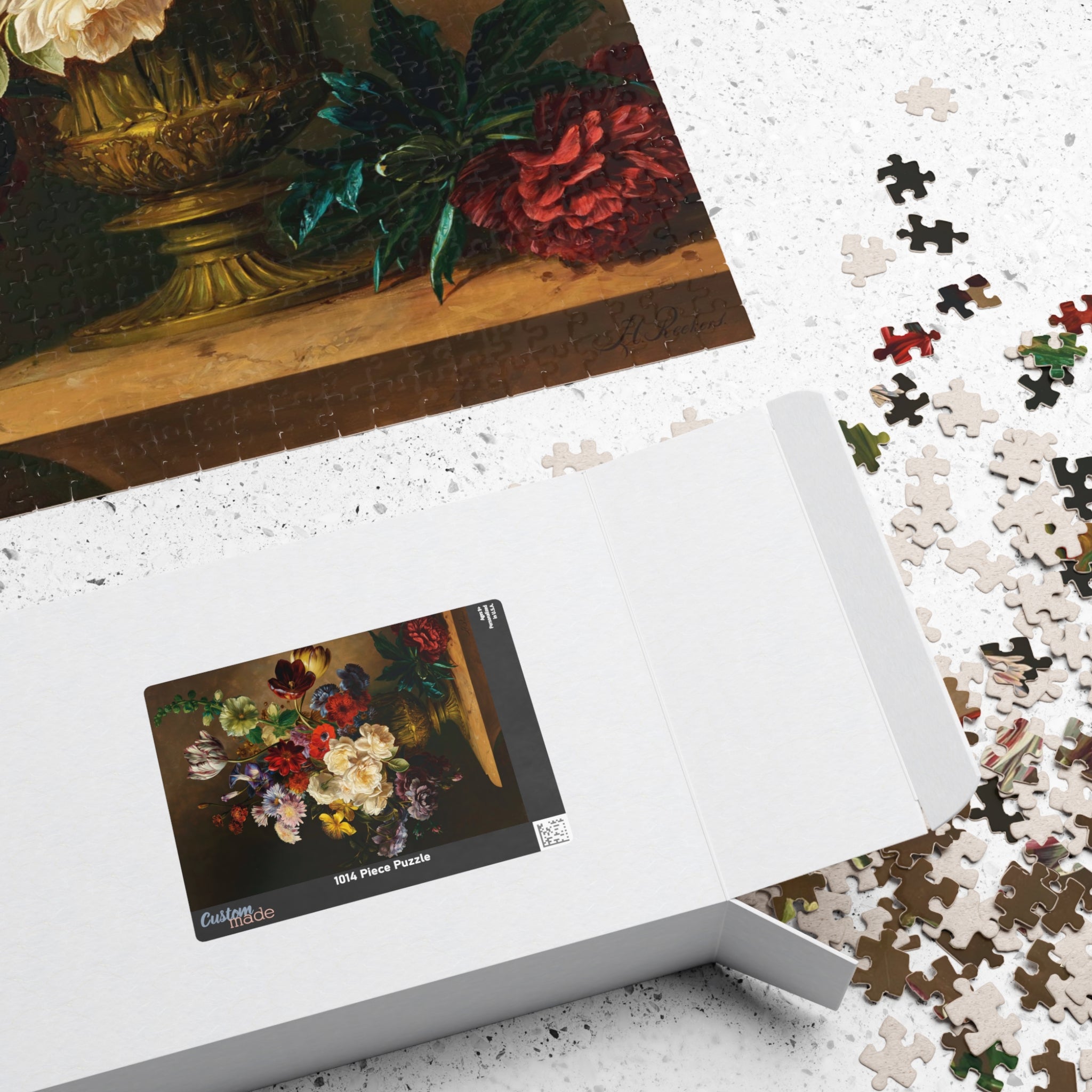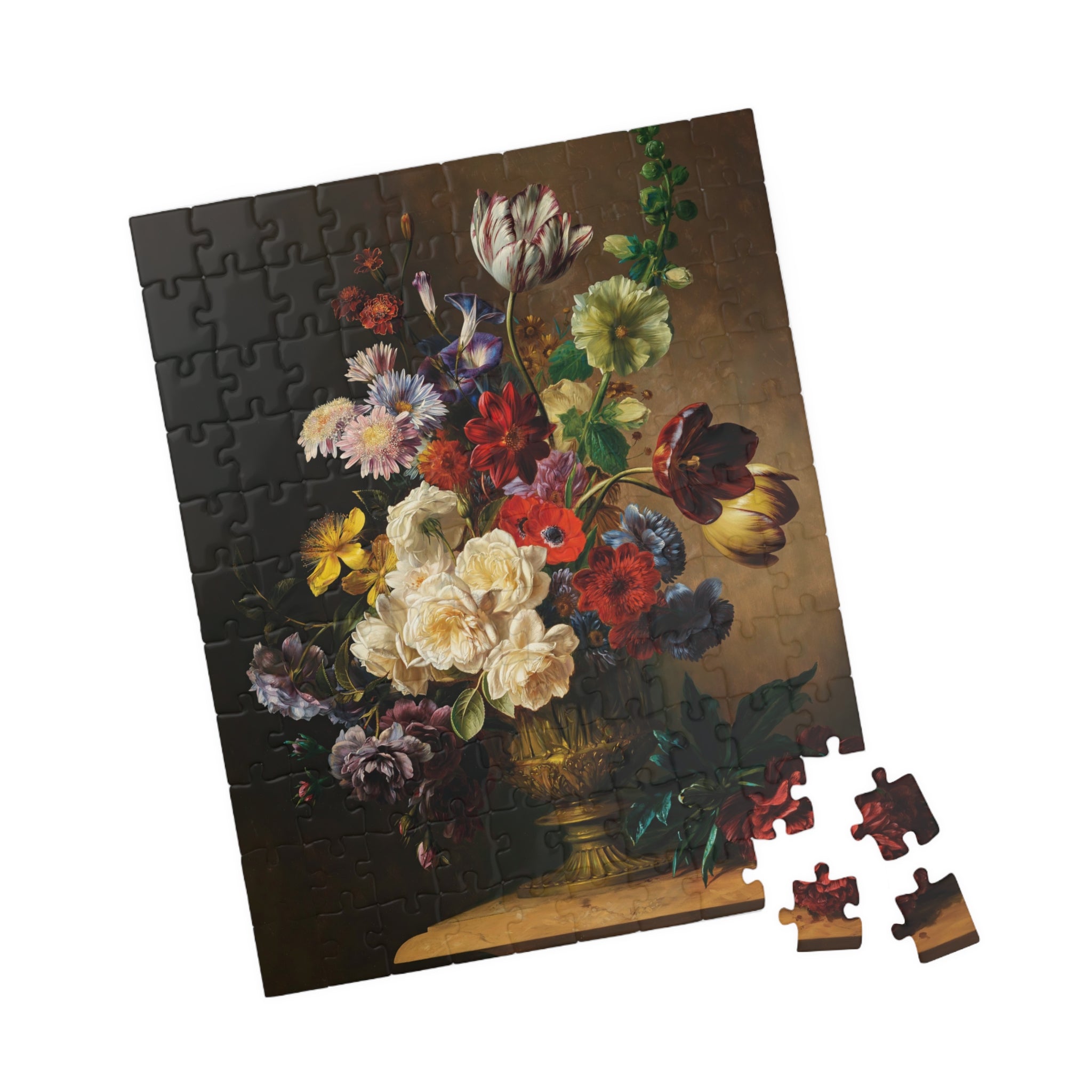 This puzzle invites you into a quiet stillness where each piece reveals a sliver of summertime abundance. Hendrik Reekers’ lush bouquet — roses, tulips, poppies and wildflowers spilling from an ornate gilded vase — is rendered in rich, saturated color and fine detail. Dark, moody backgrounds make the blossoms glow; soft highlights and subtle color shifts reward close inspection. As you assemble the glossy, chipboard pieces, the composition slowly reappears: a tactile, meditative experience that celebrates the elegance and fleeting beauty of a single summer moment. Display the finished image as a vignette of calm on your table, or frame it to bring a touch of refined floral still life into your home.