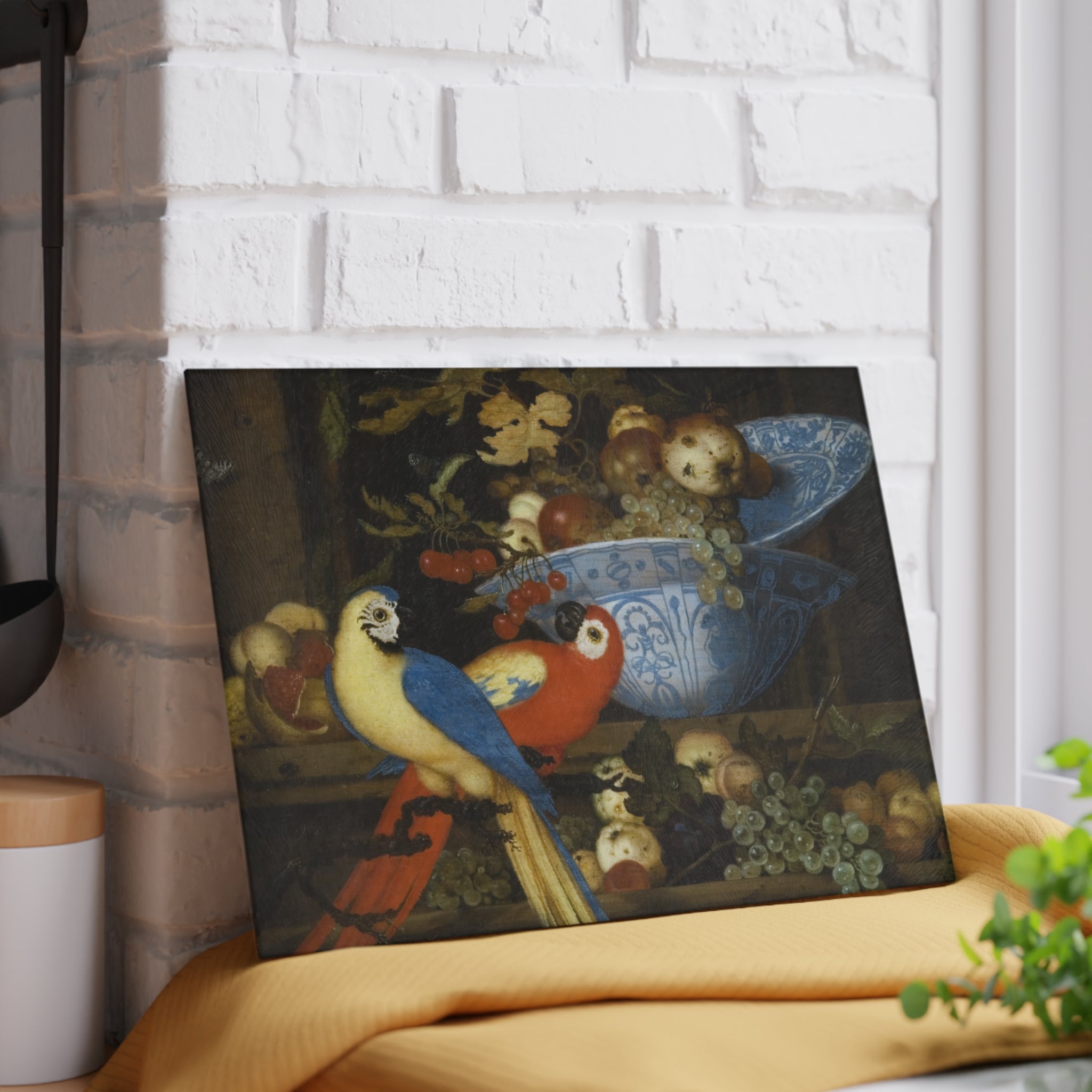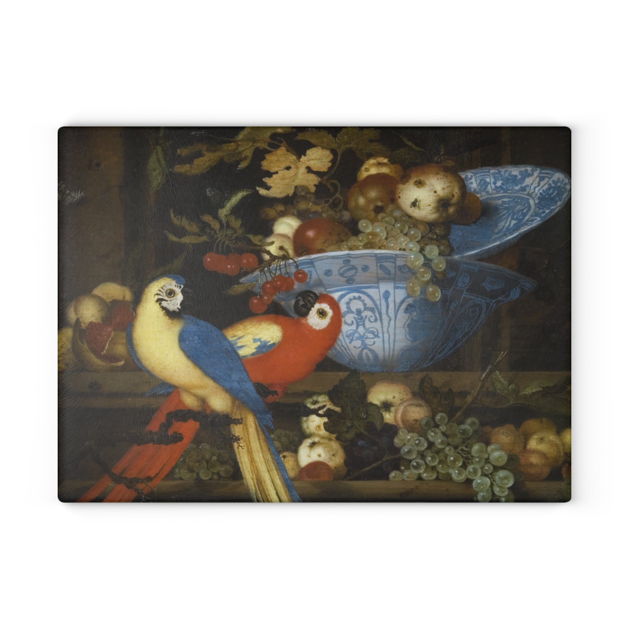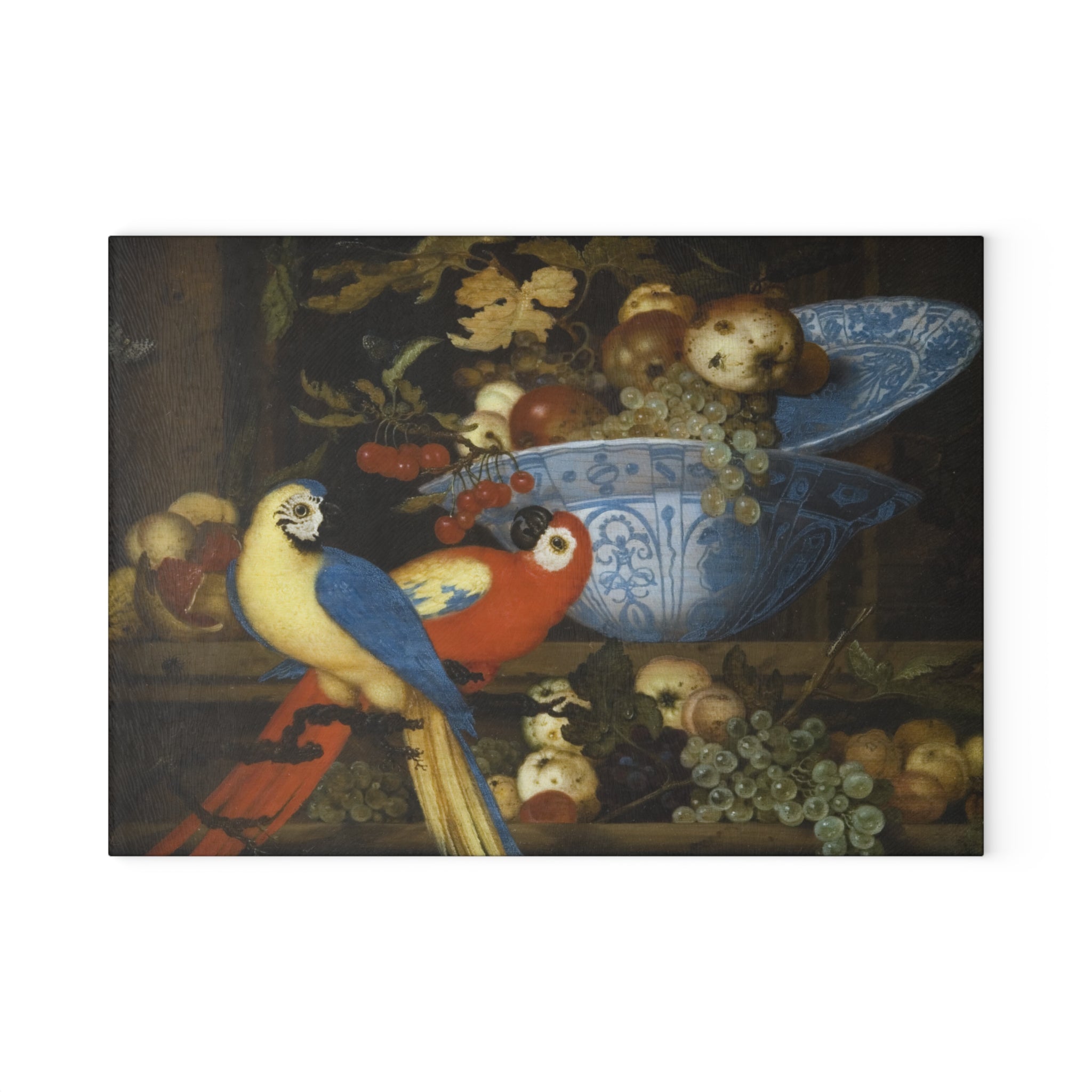 Artwork designed and digitally remastered by Sarasvati Designs. The original artwork "Fruit Still Life With Two Parrots" by Balthasar van der Ast is a captivating still life that showcases the artist's meticulous attention to detail and his ability to create a harmonious composition. The painting depicts a variety of luscious fruits, including grapes, peaches, and pomegranates, arranged in an abundant display. Two vibrant parrots perch amidst the fruits, adding a sense of liveliness and exoticism to the scene.