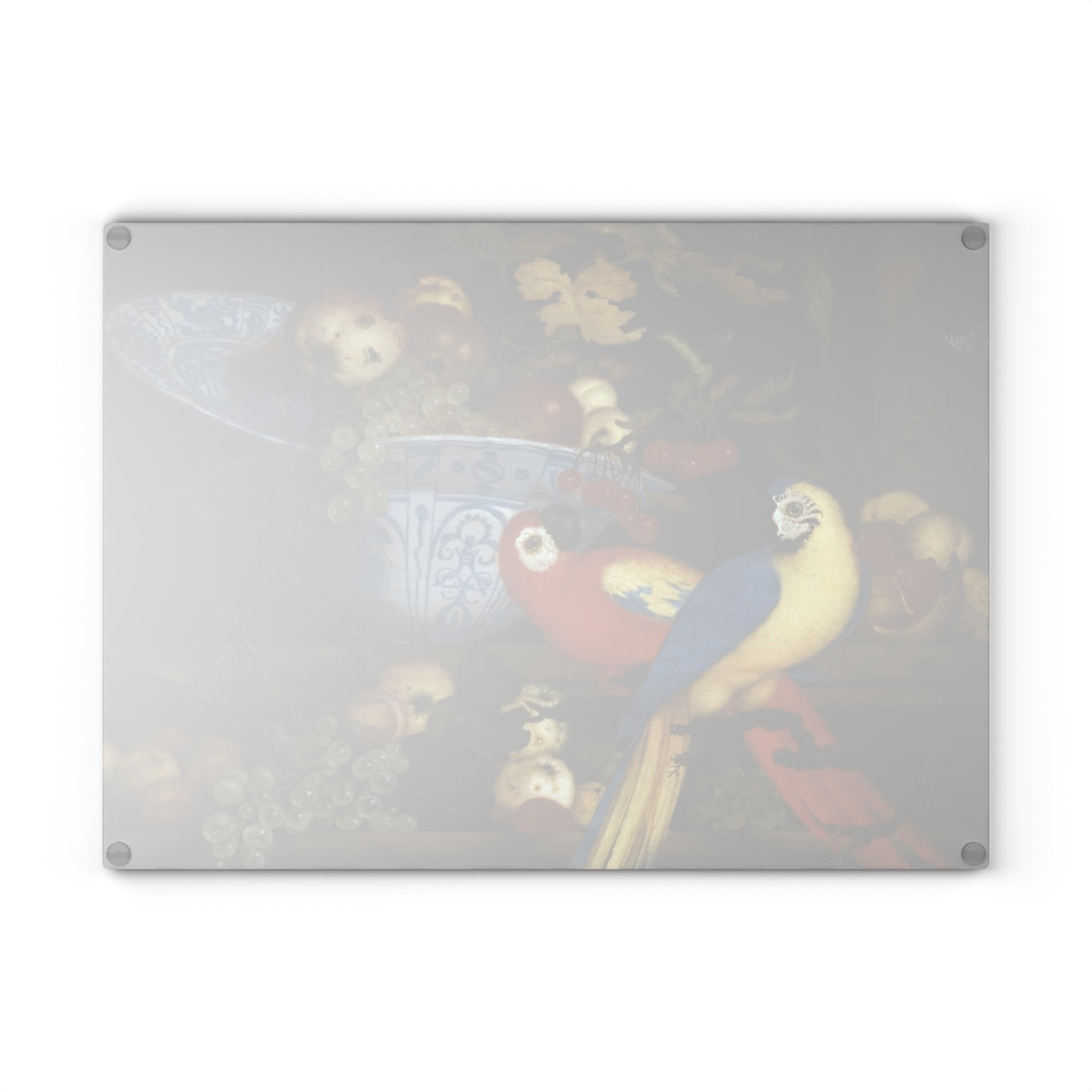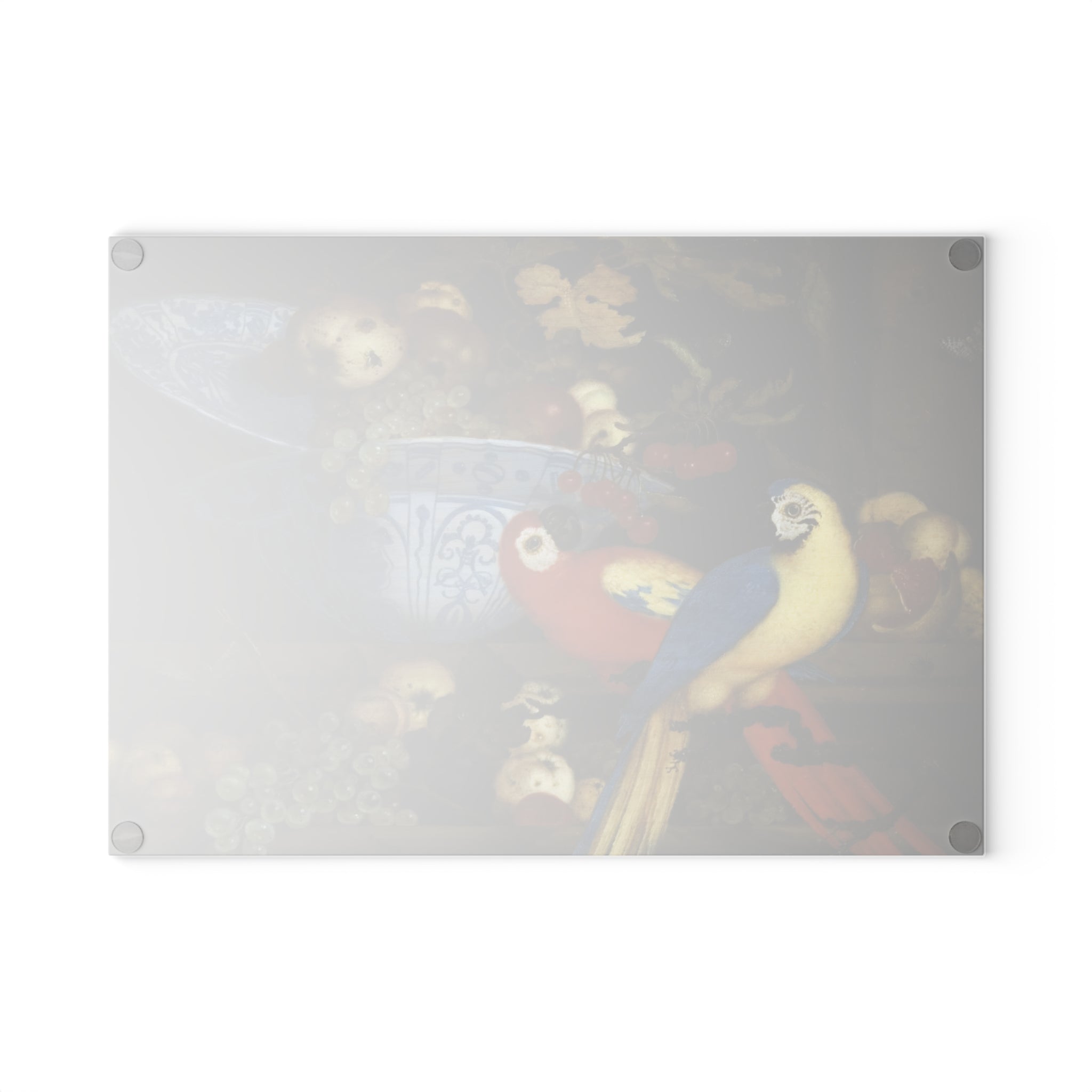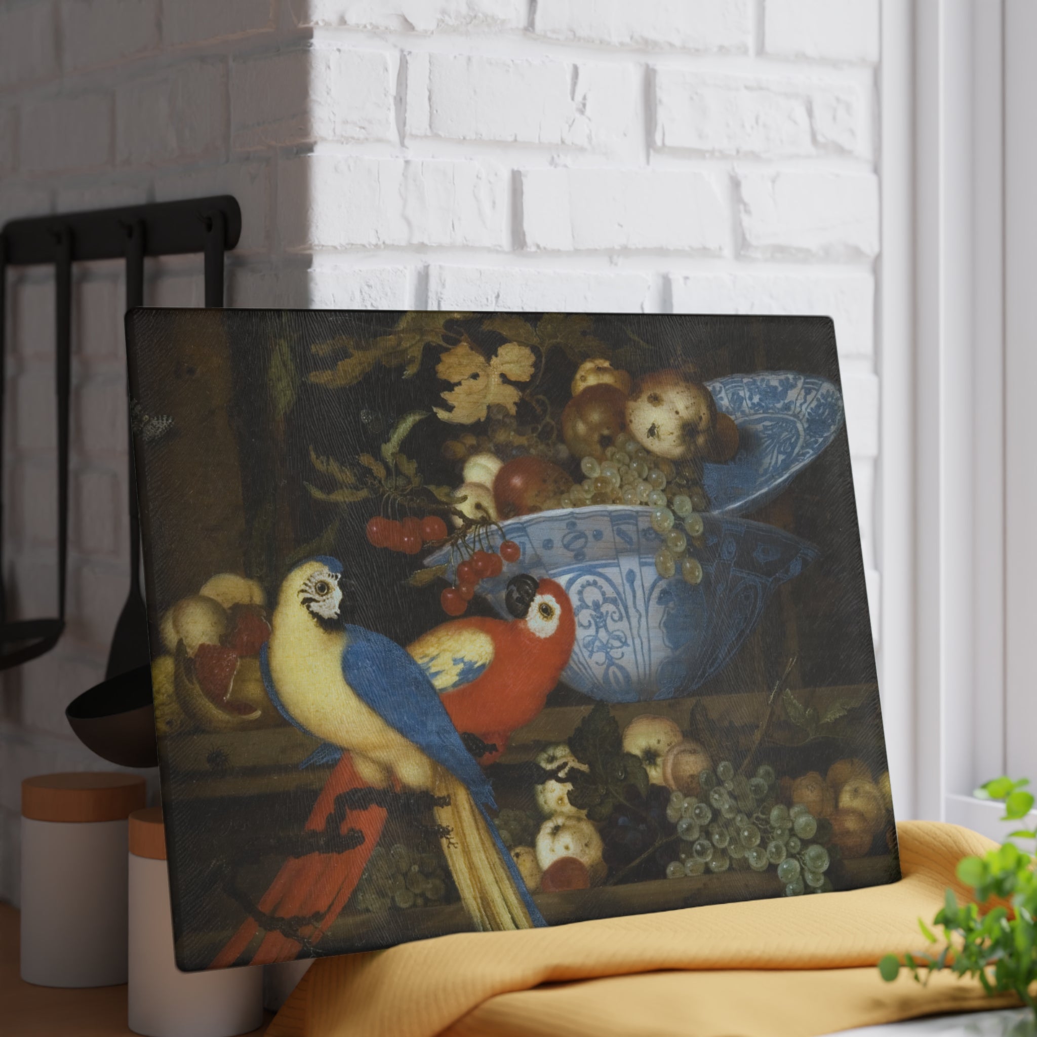 Artwork designed and digitally remastered by Sarasvati Designs. The original artwork "Fruit Still Life With Two Parrots" by Balthasar van der Ast is a captivating still life that showcases the artist's meticulous attention to detail and his ability to create a harmonious composition. The painting depicts a variety of luscious fruits, including grapes, peaches, and pomegranates, arranged in an abundant display. Two vibrant parrots perch amidst the fruits, adding a sense of liveliness and exoticism to the scene.