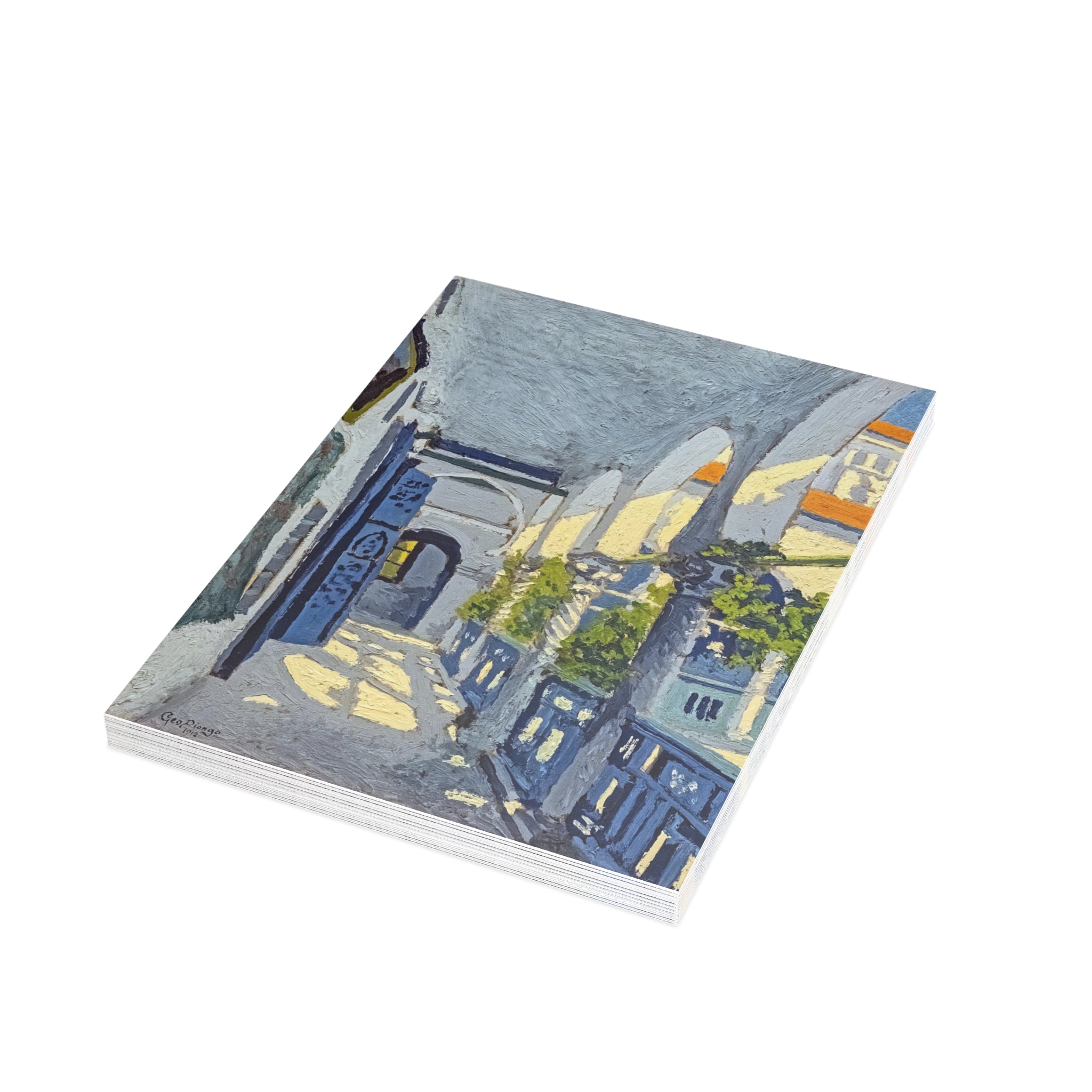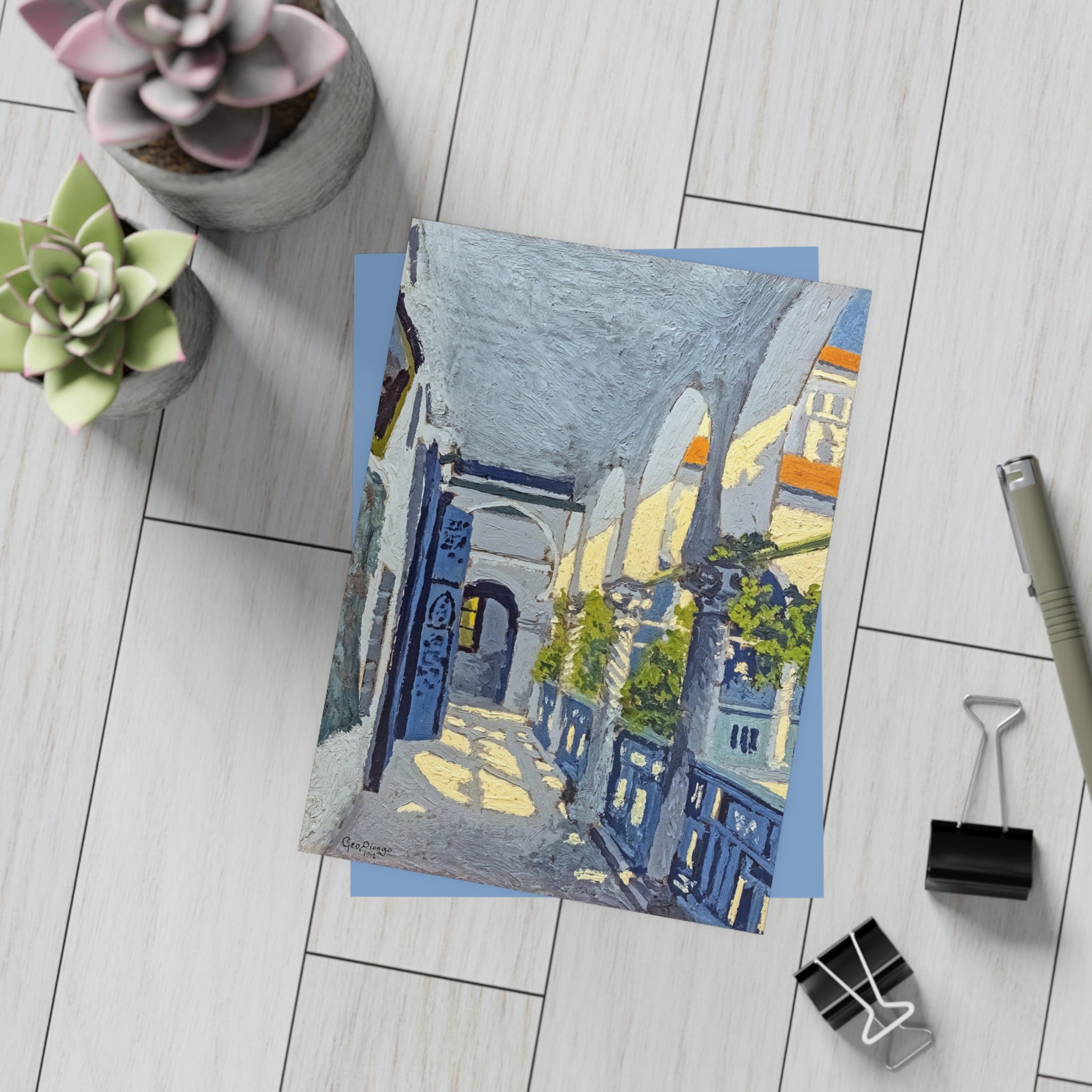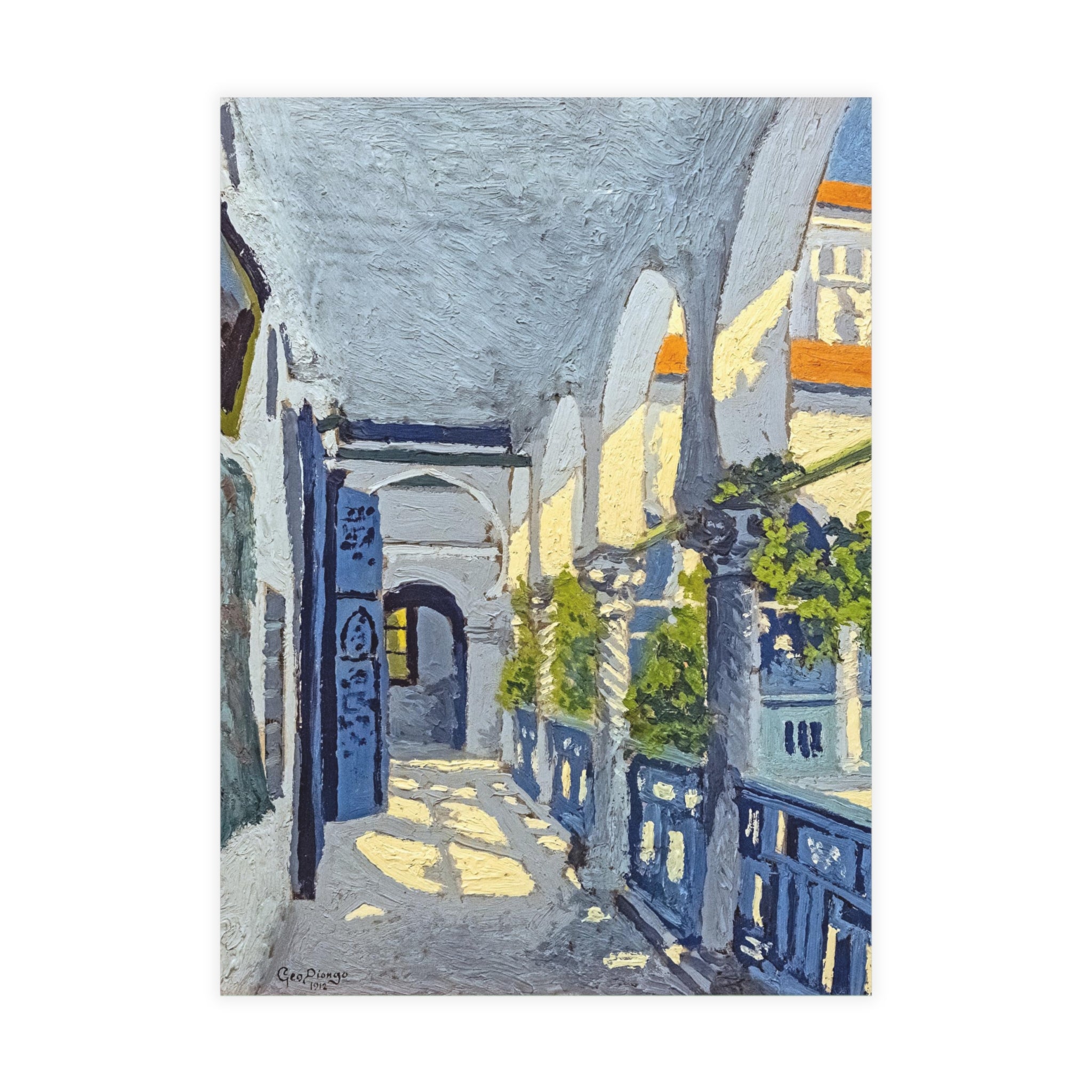 Artwork designed and digitally remastered by Sarasvati Designs. "Gallery of a Moroccan Riad" is an evocative artwork created by George Gaudion. The painting depicts the interior of a Moroccan riad (a type of traditional Moroccan house or palace), specifically focusing on a captivating gallery adorned with intricate architectural details. Gaudion's skilled brushwork brings the scene to life, showcasing the rich textures, vibrant colors, and play of light and shadow. The artwork captures the essence of Moroccan aesthetics, with its ornate patterns, geometric motifs, and cultural influences. The viewer is transported into the serene ambiance of a riad, immersing themselves in the beauty and tranquility of the Moroccan architectural marvel. Gaudion's artwork beautifully captures the charm and allure of the riad's gallery, inviting viewers to appreciate the craftsmanship and cultural heritage of Morocco.