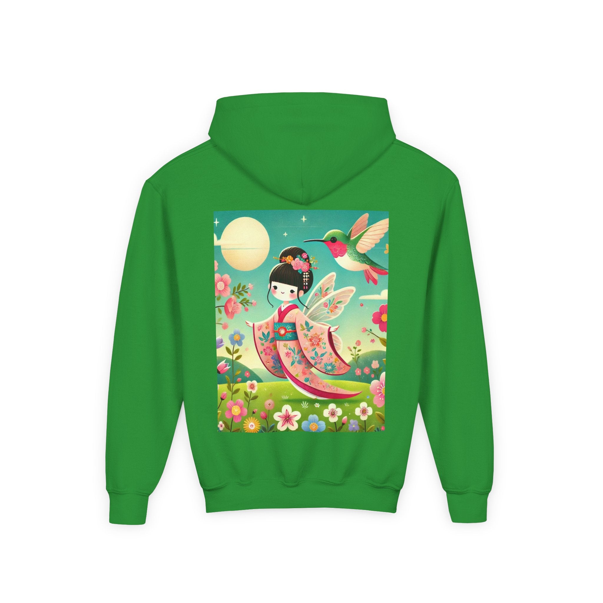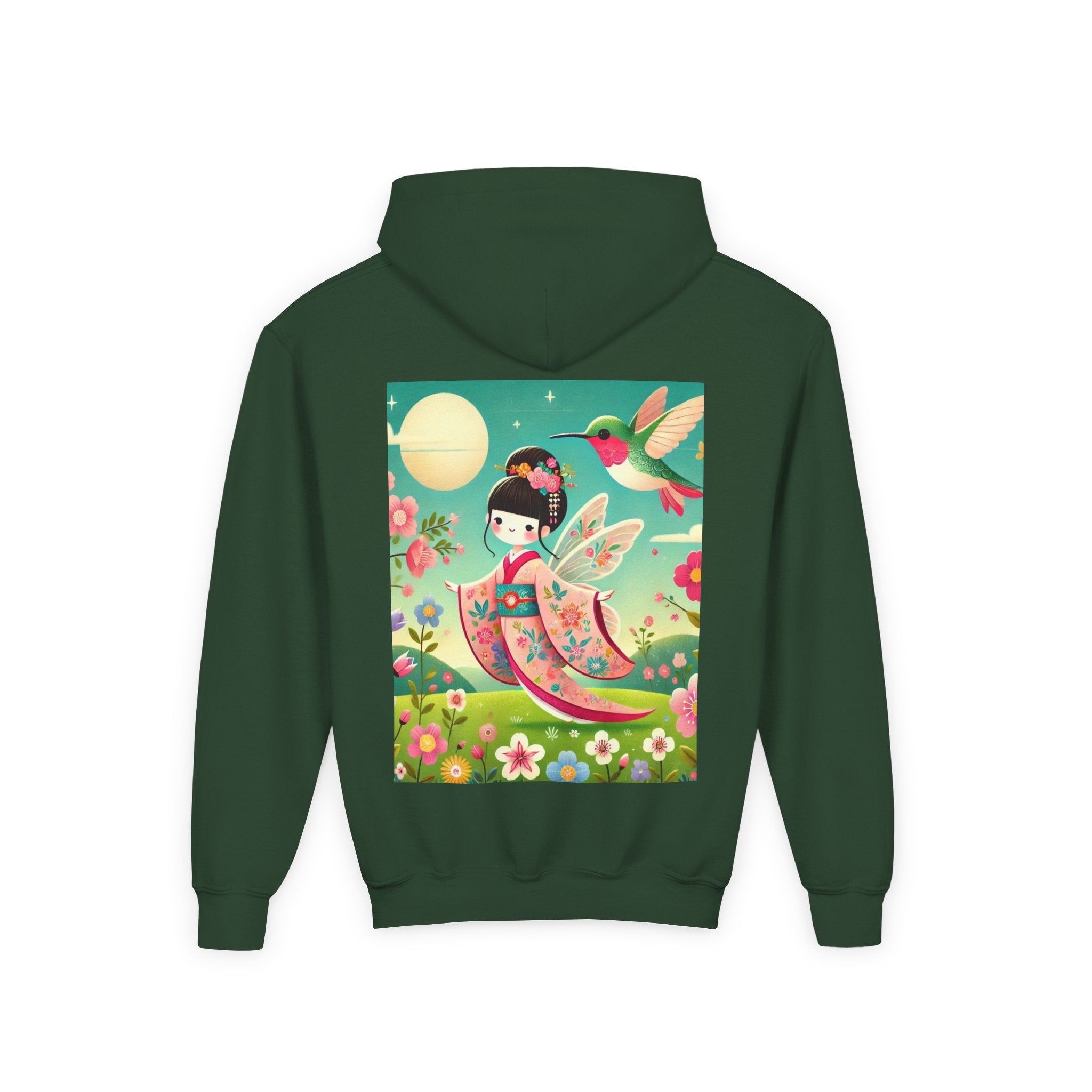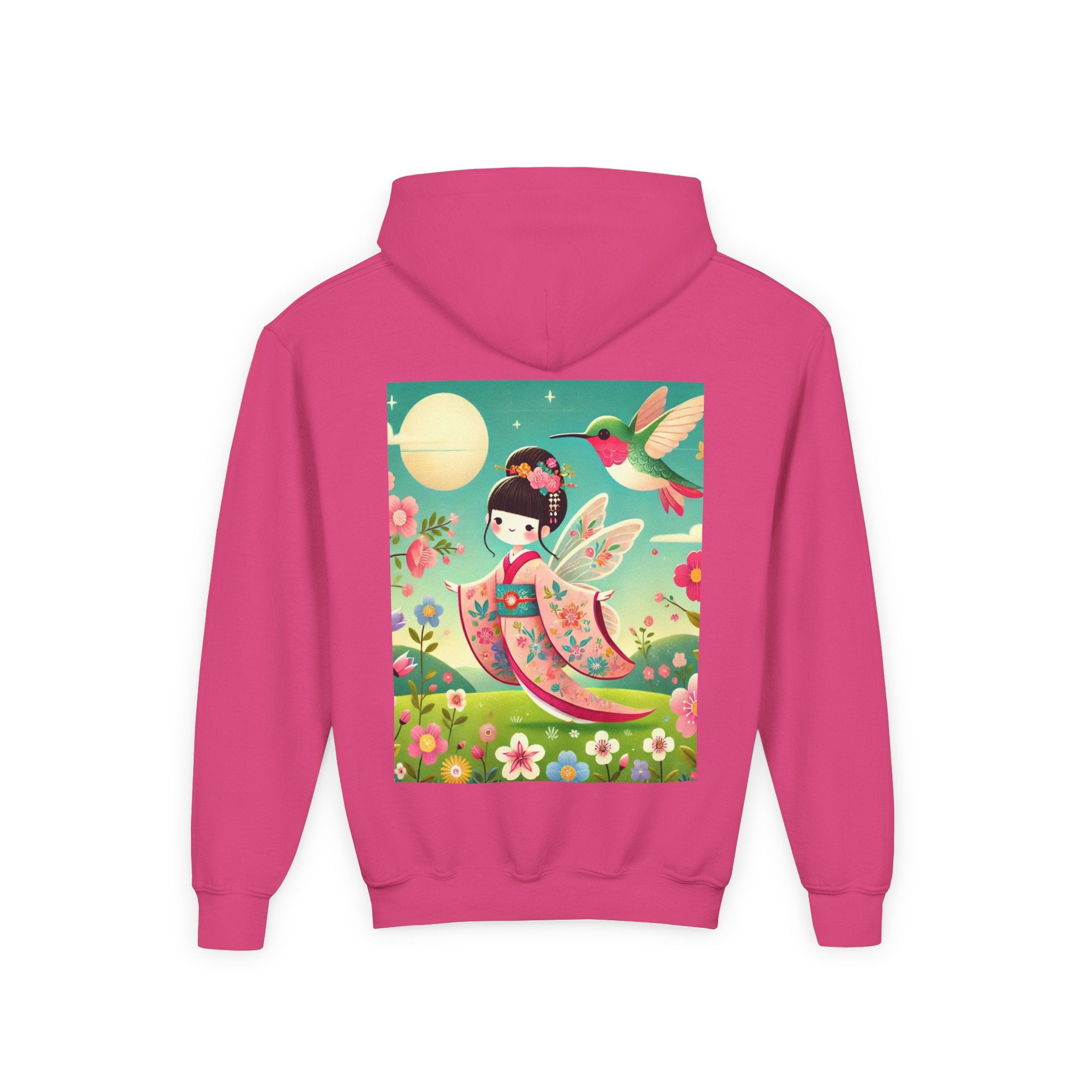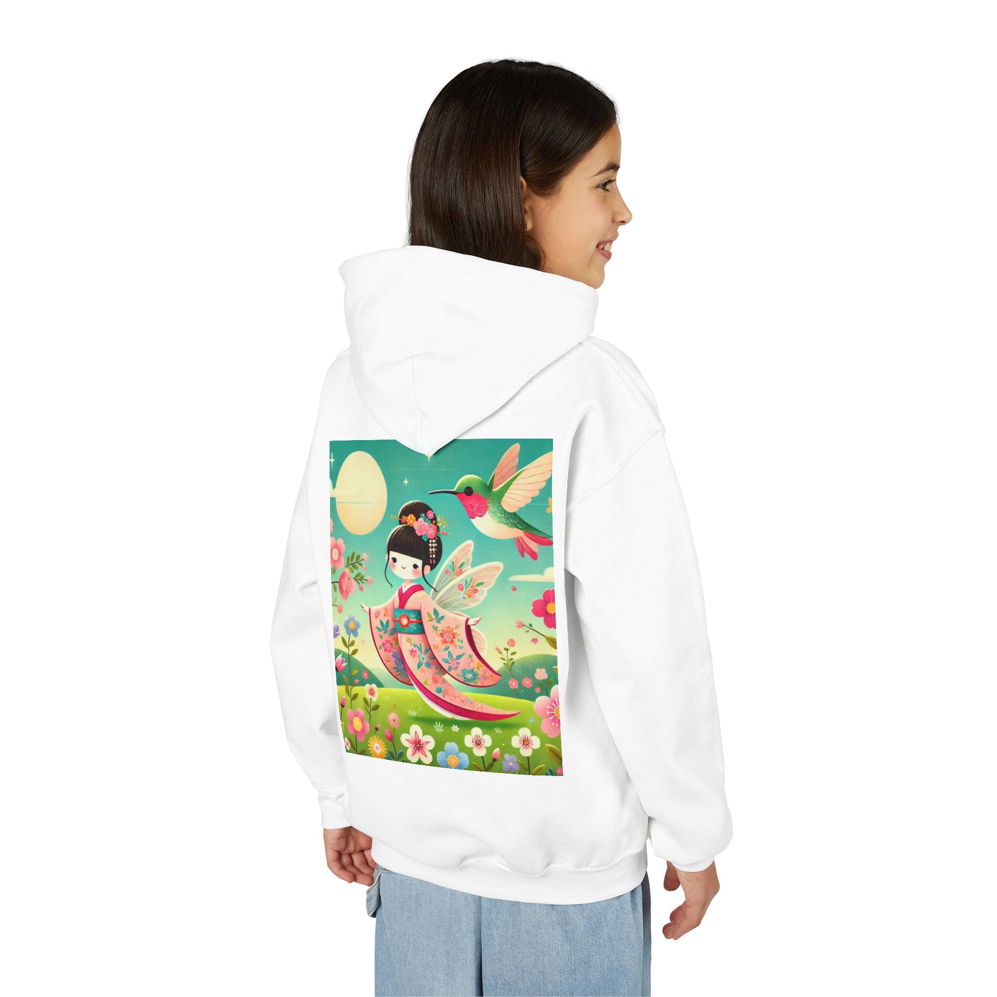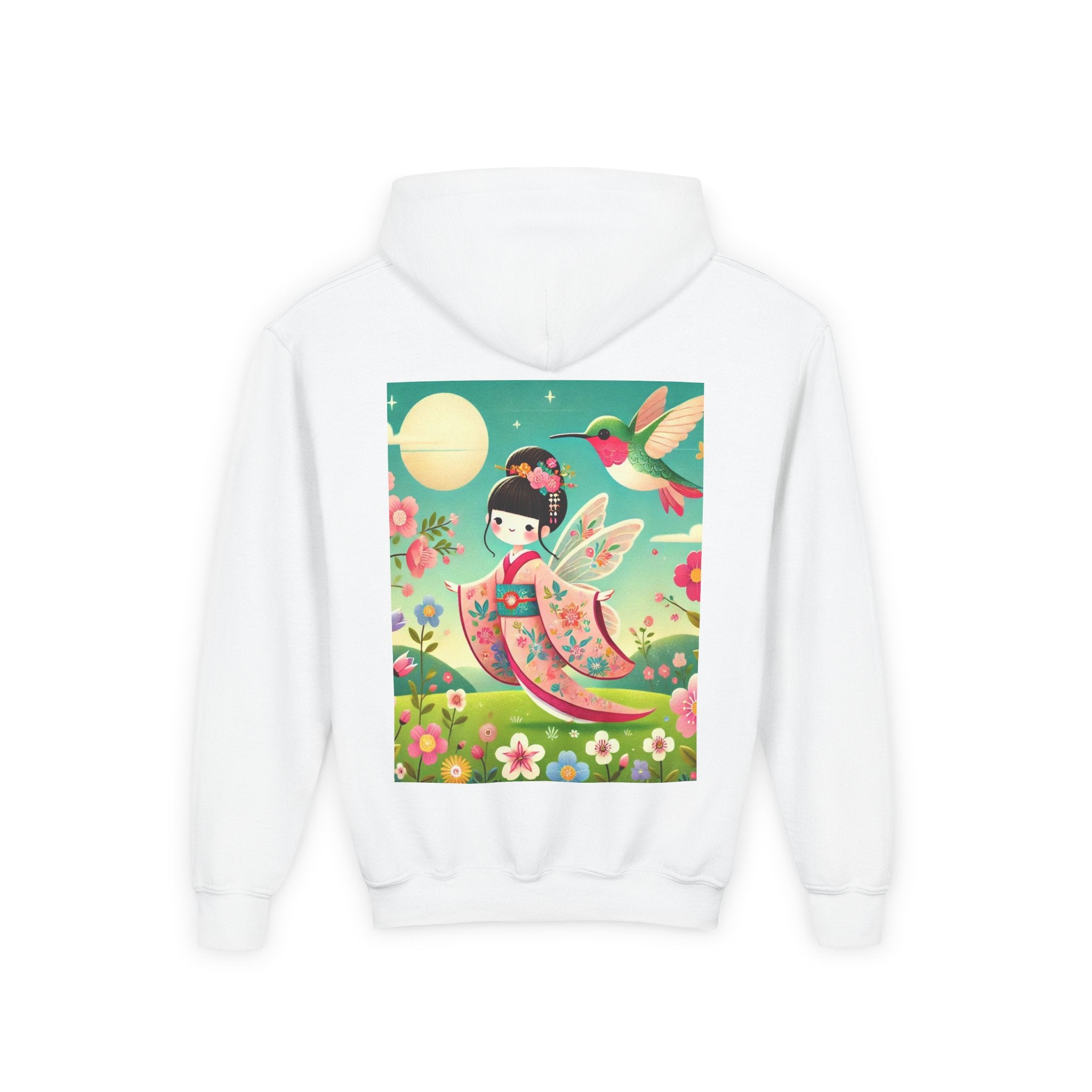 Geisha Fairy and the Hummingbird Blossom Youth Heavy Blend Hooded Sweatshirt combines cozy comfort with enchanting artistry. Made from ultra-soft, preshrunk fleece, this hoodie provides a smooth and warm feel while reducing lint buildup for lasting wear. Its 50/50 cotton-polyester blend ensures durability and softness, complemented by a roomy kangaroo pocket and twill-reinforced neck for structure and ease. Please note: due to fabric properties, the White color variant may appear slightly off-white.