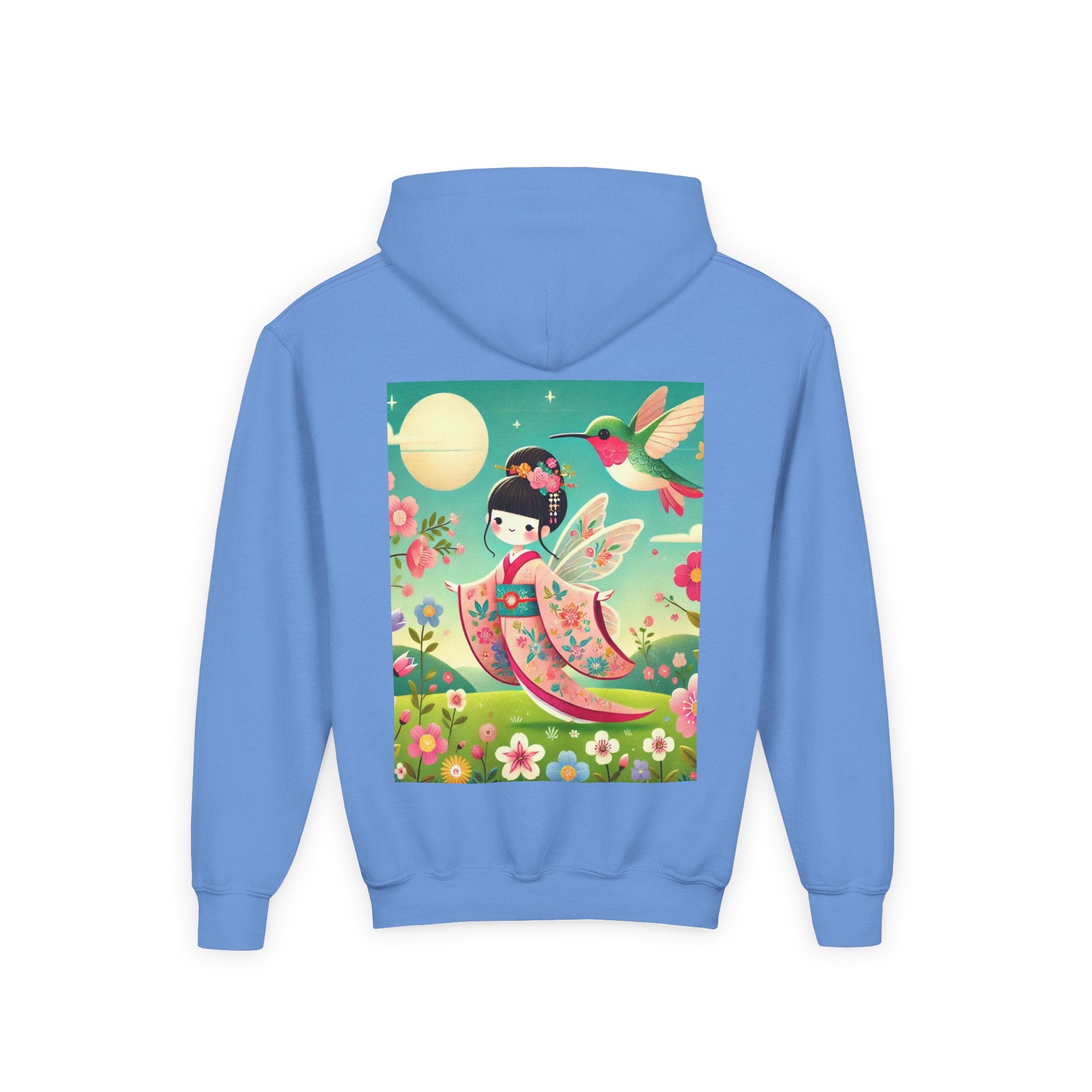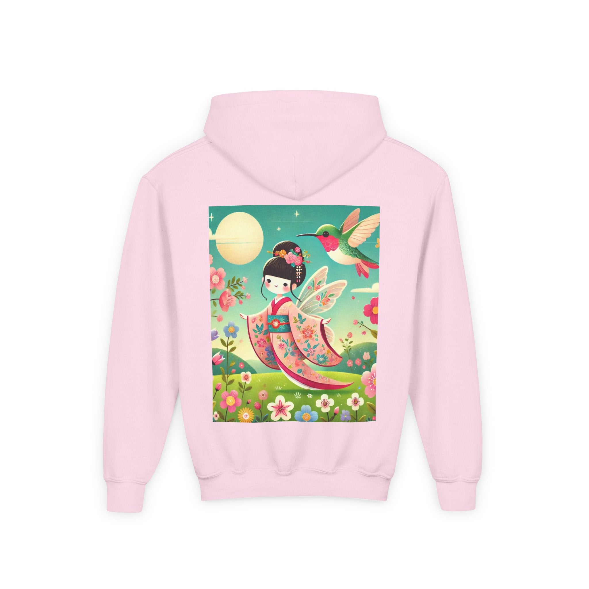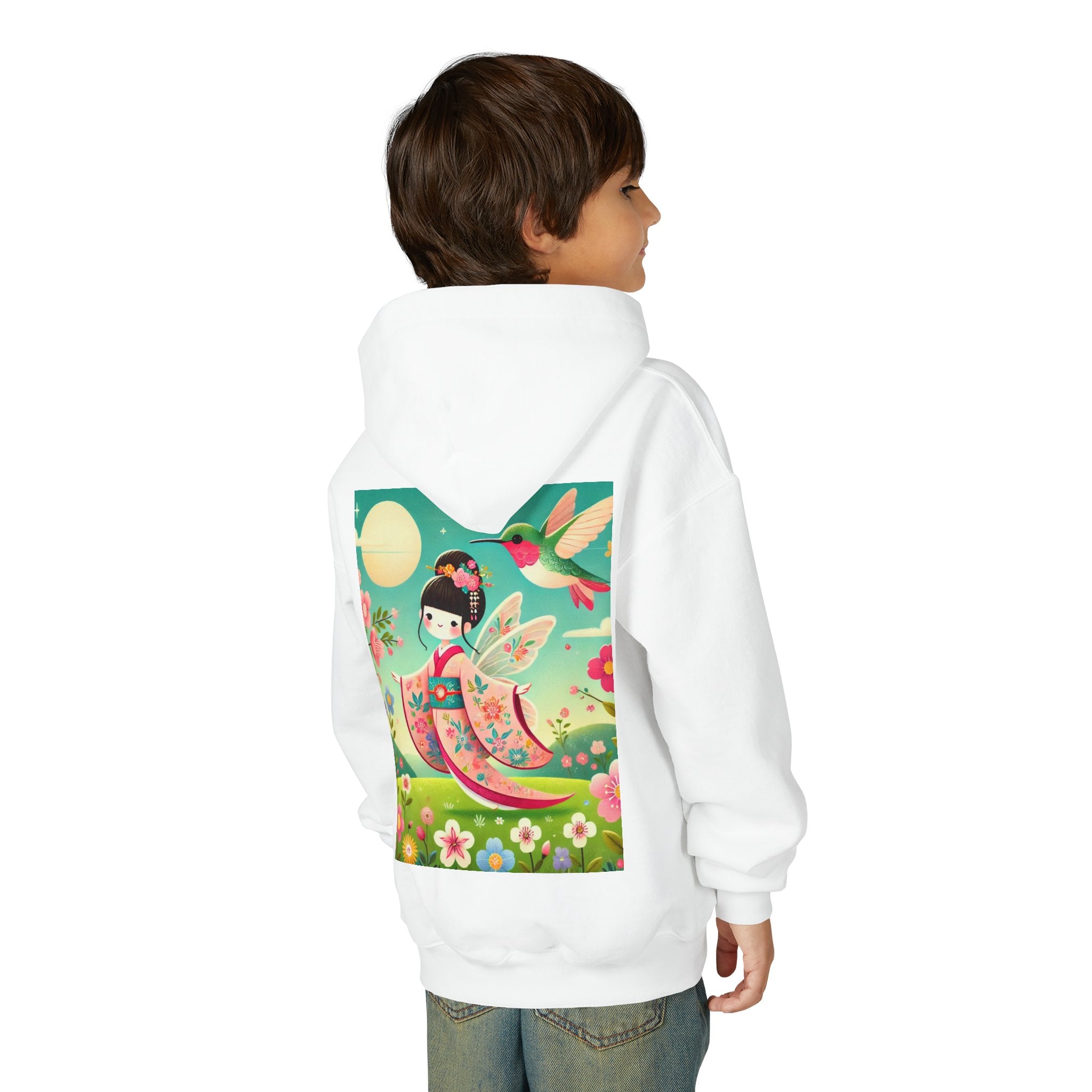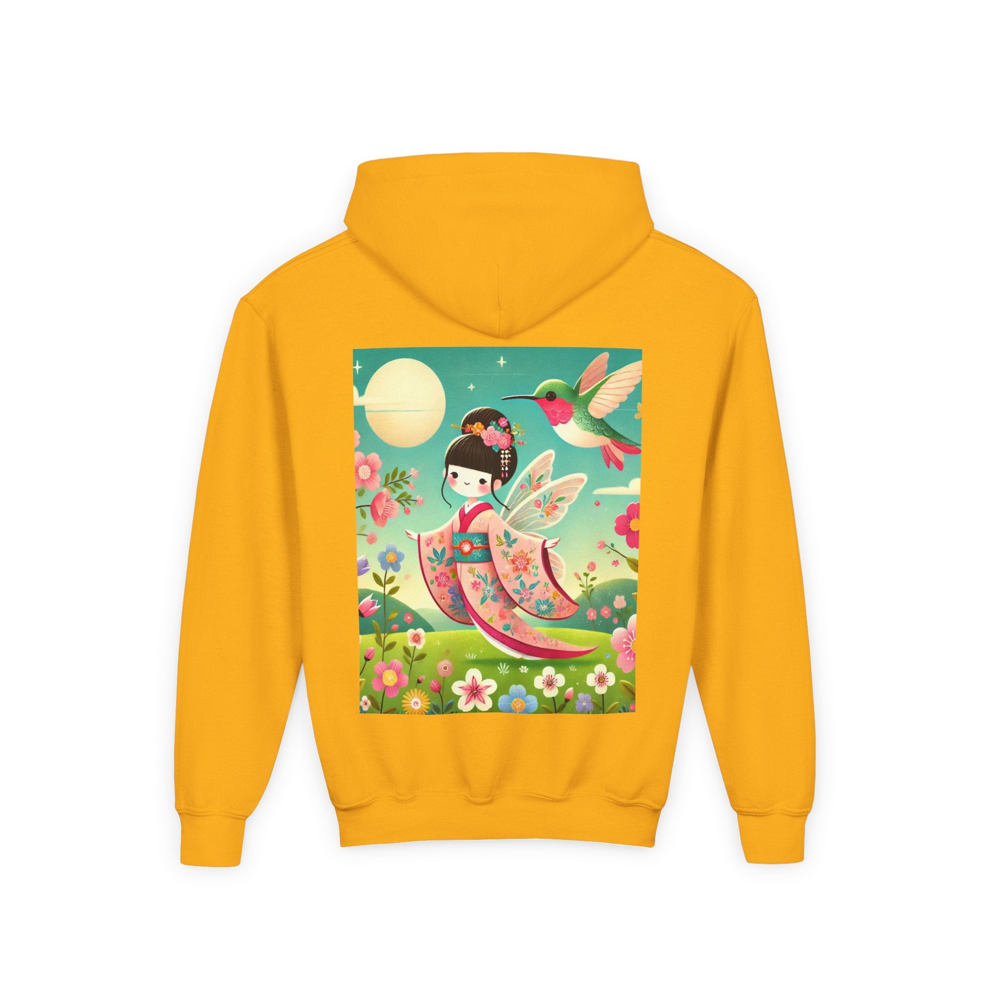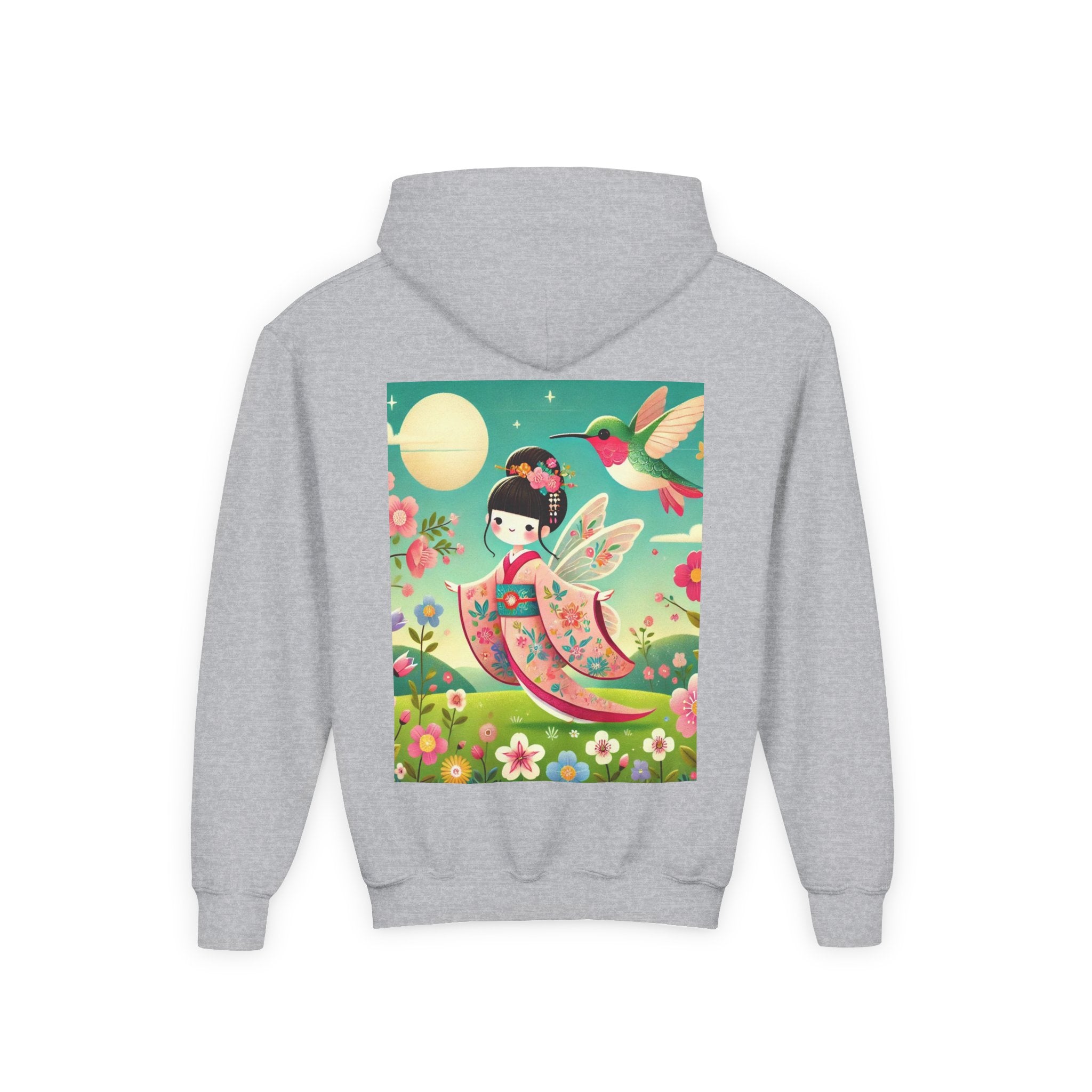 Geisha Fairy and the Hummingbird Blossom Youth Heavy Blend Hooded Sweatshirt combines cozy comfort with enchanting artistry. Made from ultra-soft, preshrunk fleece, this hoodie provides a smooth and warm feel while reducing lint buildup for lasting wear. Its 50/50 cotton-polyester blend ensures durability and softness, complemented by a roomy kangaroo pocket and twill-reinforced neck for structure and ease. Please note: due to fabric properties, the White color variant may appear slightly off-white.