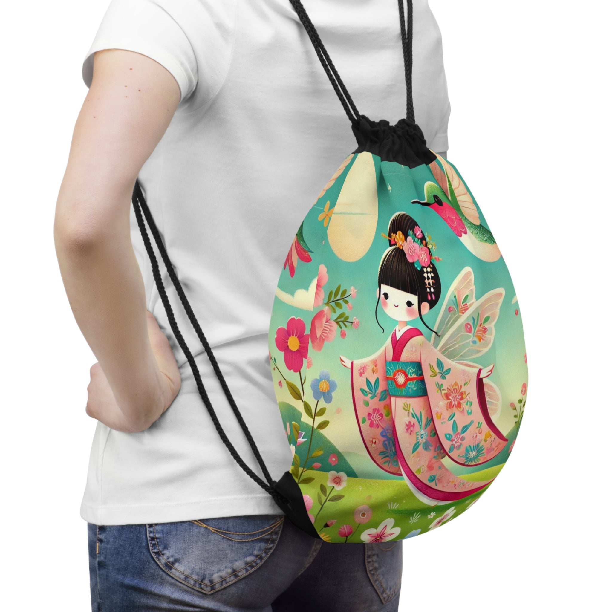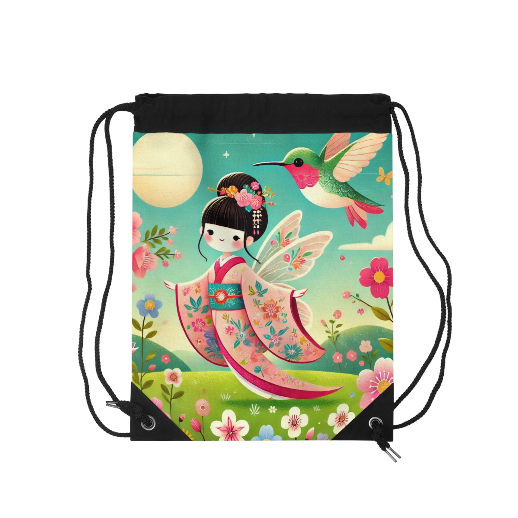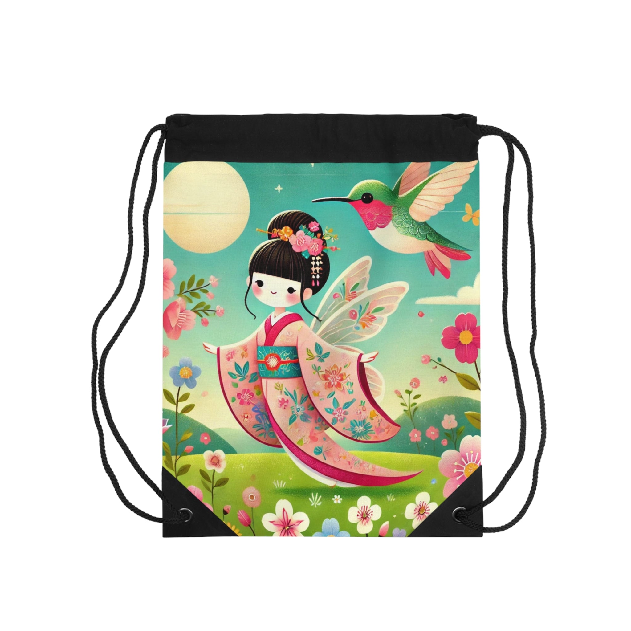 Geisha Fairy and the Hummingbird Drawstring Bag captures the spirit of elegance and imagination in one lightweight, durable design. Perfect for quick trips to the gym, store, or beach, this versatile drawstring bag offers effortless style and practicality for light travels. The artwork features a graceful geisha fairy dressed in a flowing kimono adorned with delicate hummingbird motifs, harmonizing with a vibrant hummingbird that flutters nearby. The scene evokes a sense of serenity and wonder, blending traditional Japanese beauty with ethereal fairy charm—transforming an everyday accessory into a portable work of art.