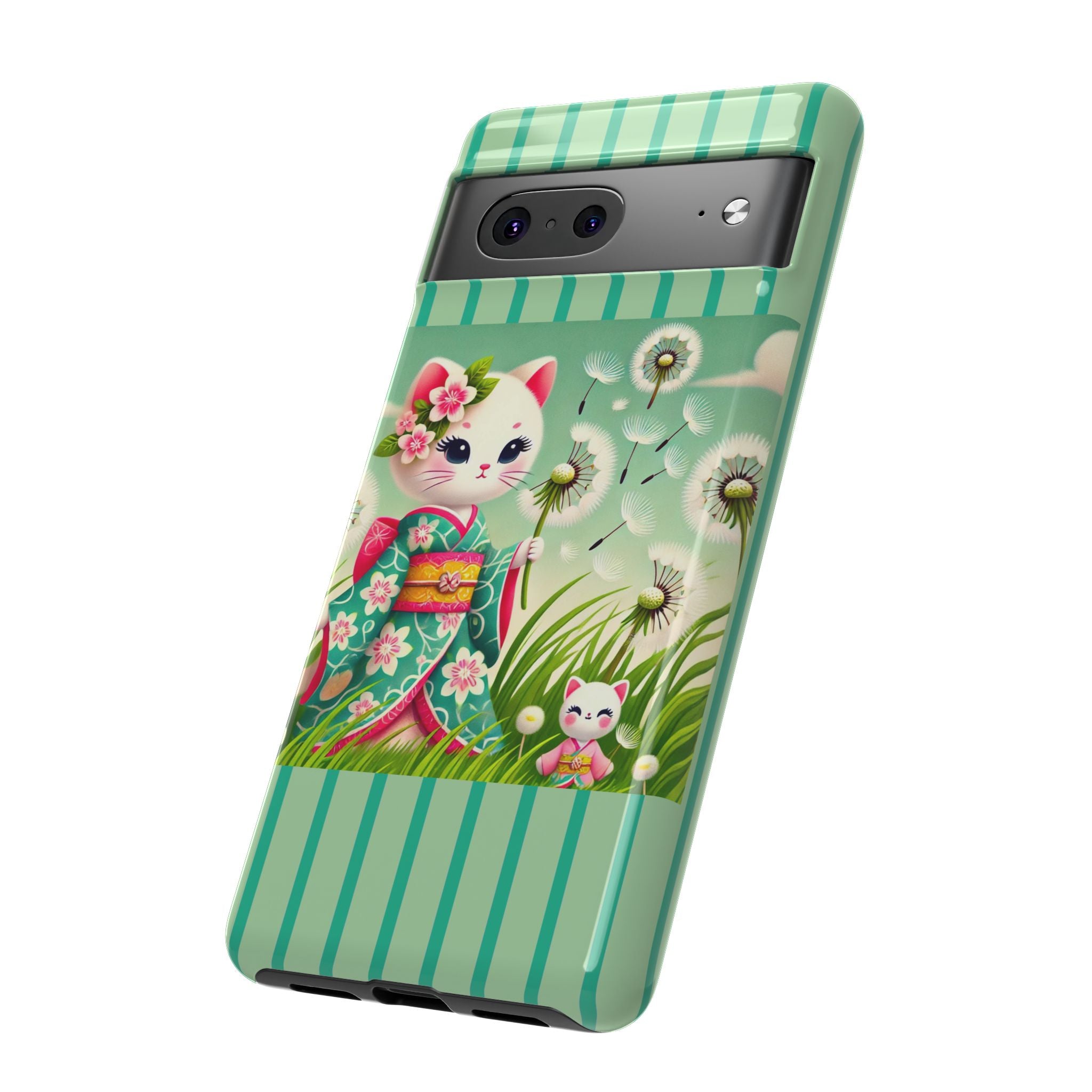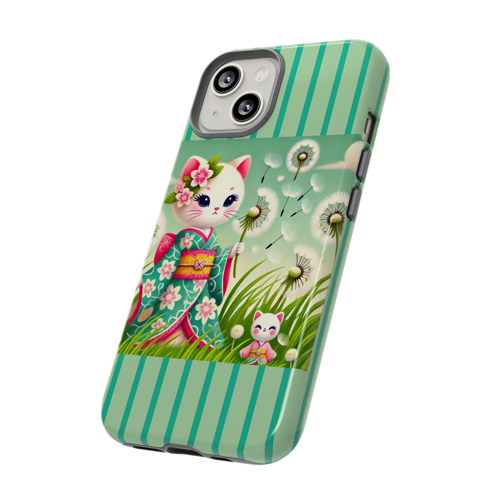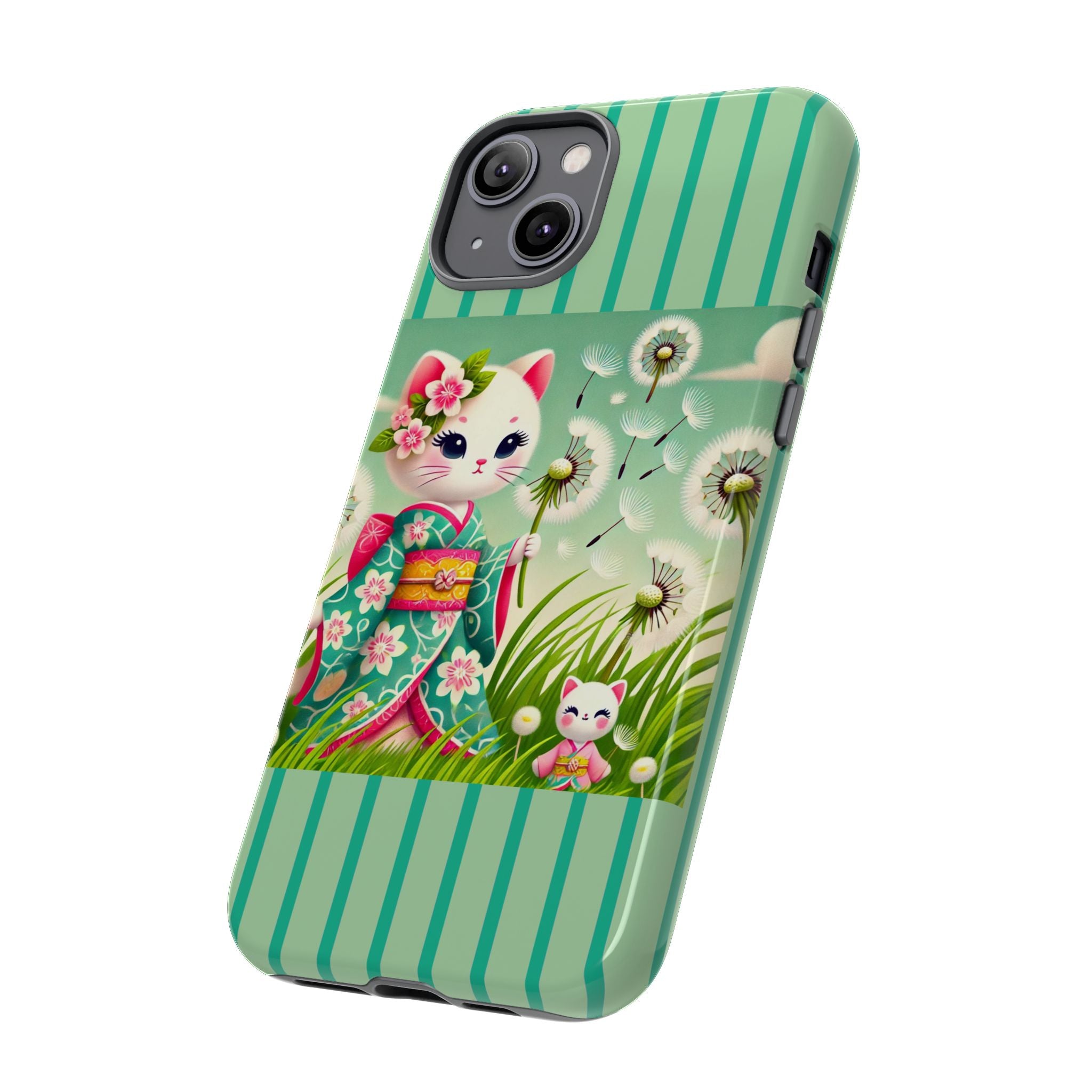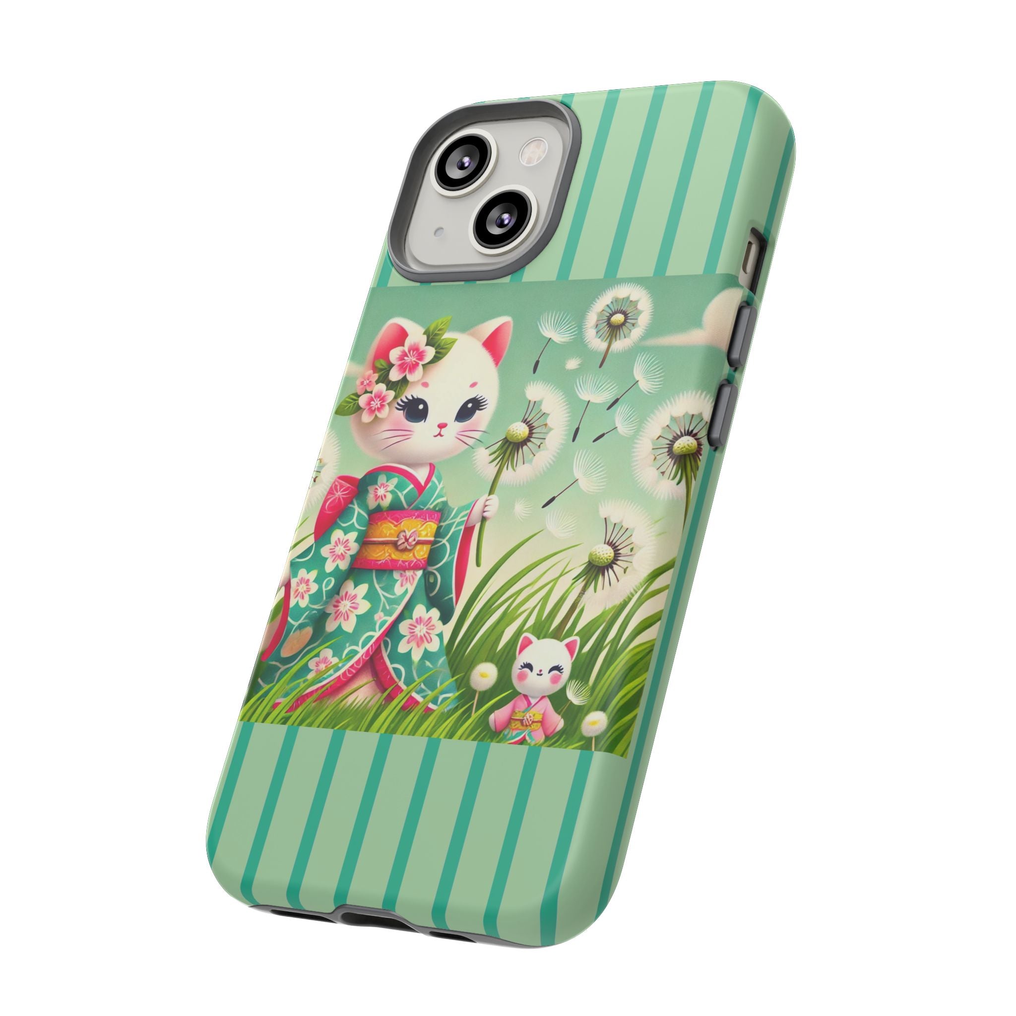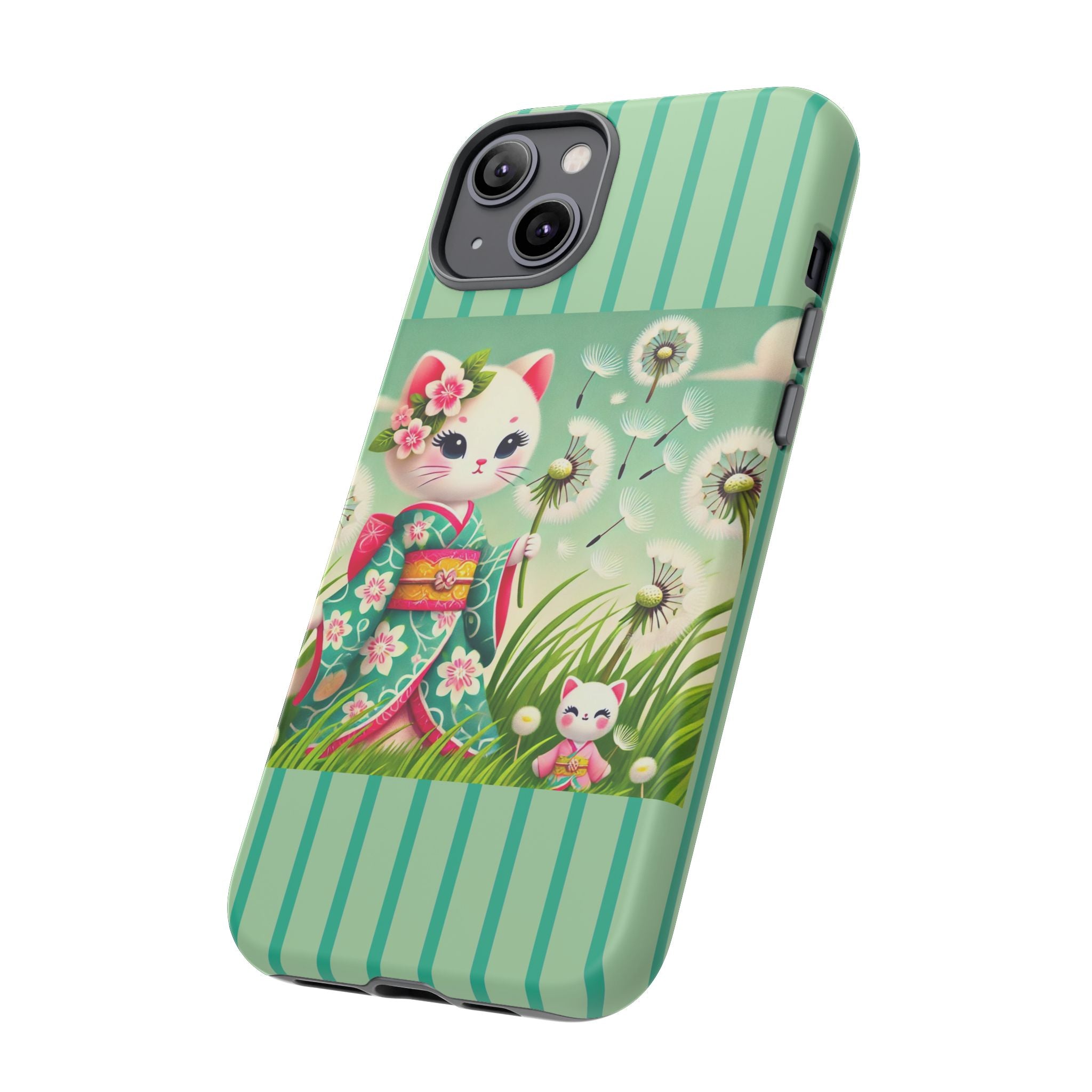 Add a touch of calm charm to your day with our Geisha Kitten and the Dandelion Phone Cases. Designed for iPhone, Samsung Galaxy, and Google Pixel devices, these premium-quality cases combine everyday protection with the gentle beauty of whimsical art. The design features a serene illustration of a geisha kitten and her tiny kitten doll, both dressed in matching kimonos, surrounded by tall swaying grass and drifting dandelion seeds. The soft colors and delicate details create a dreamy, tranquil mood that transforms your phone into a peaceful work of art.
