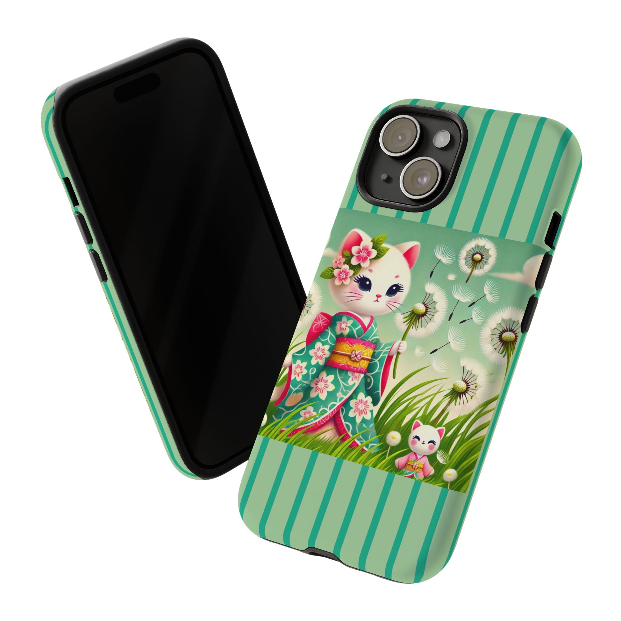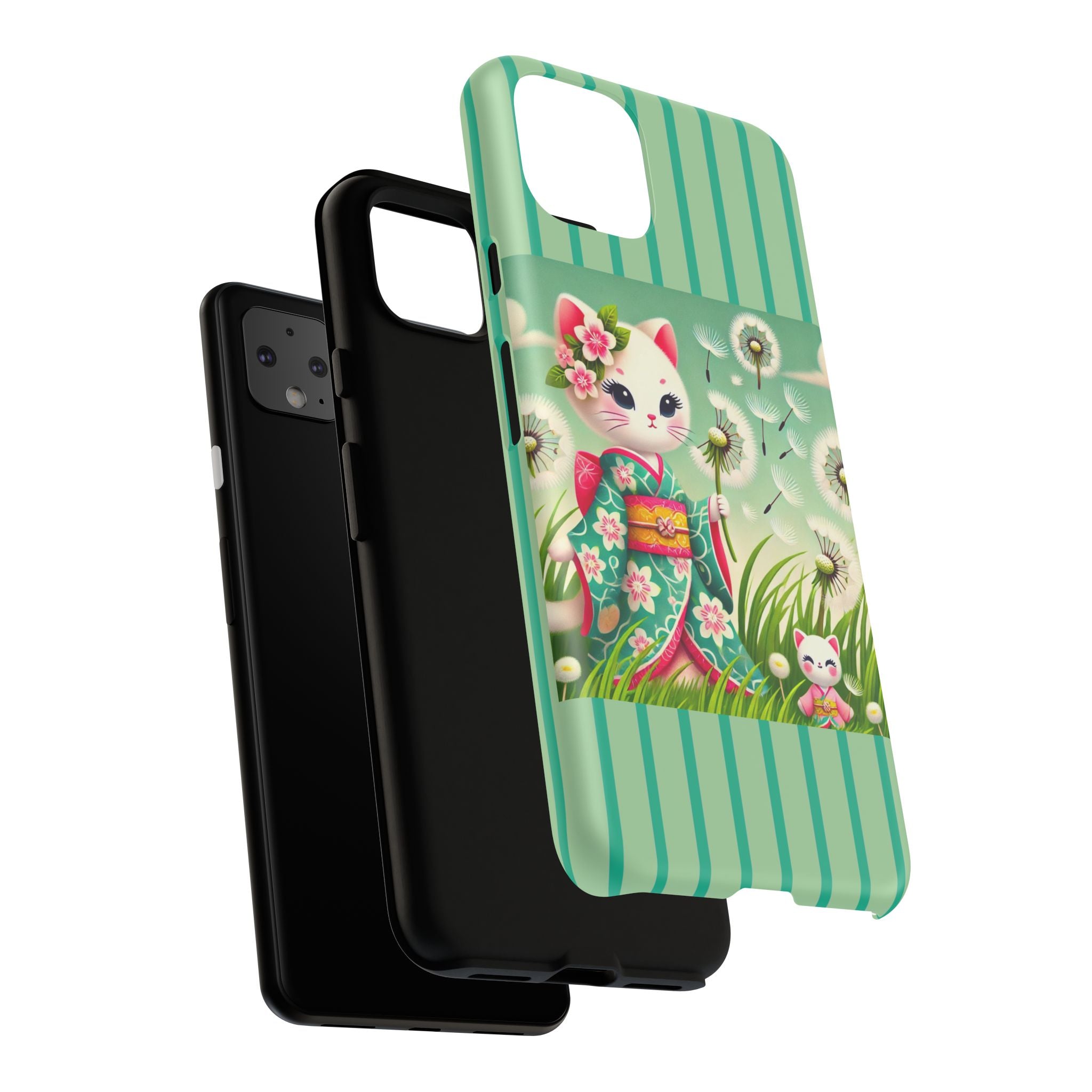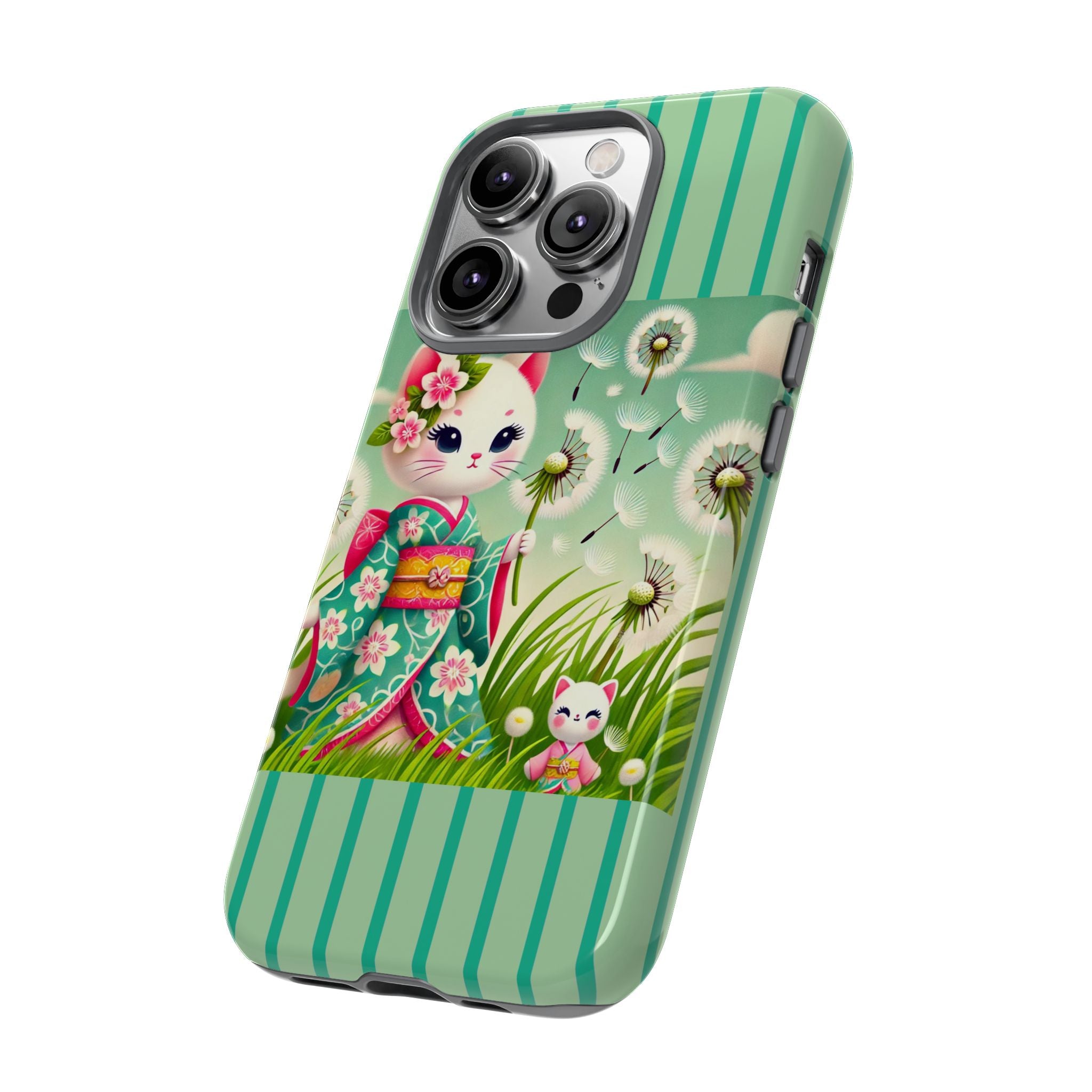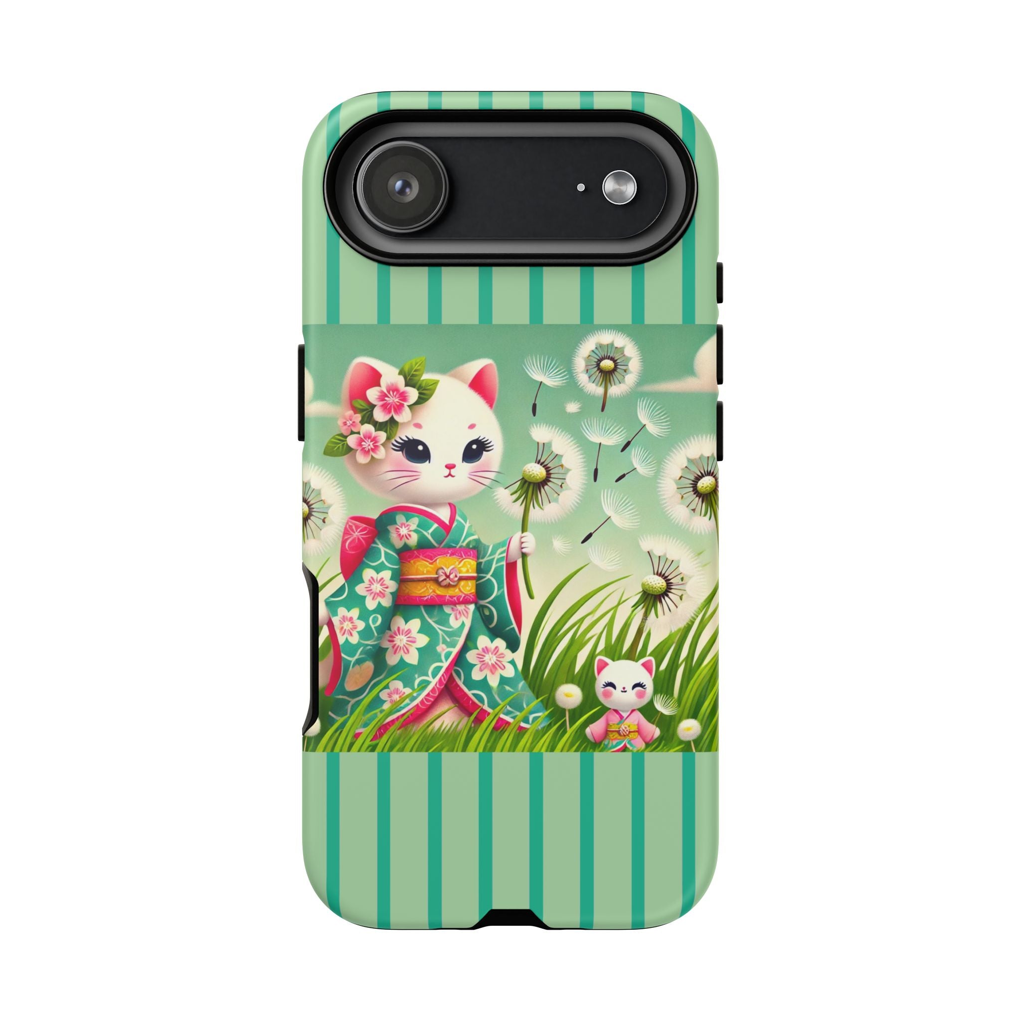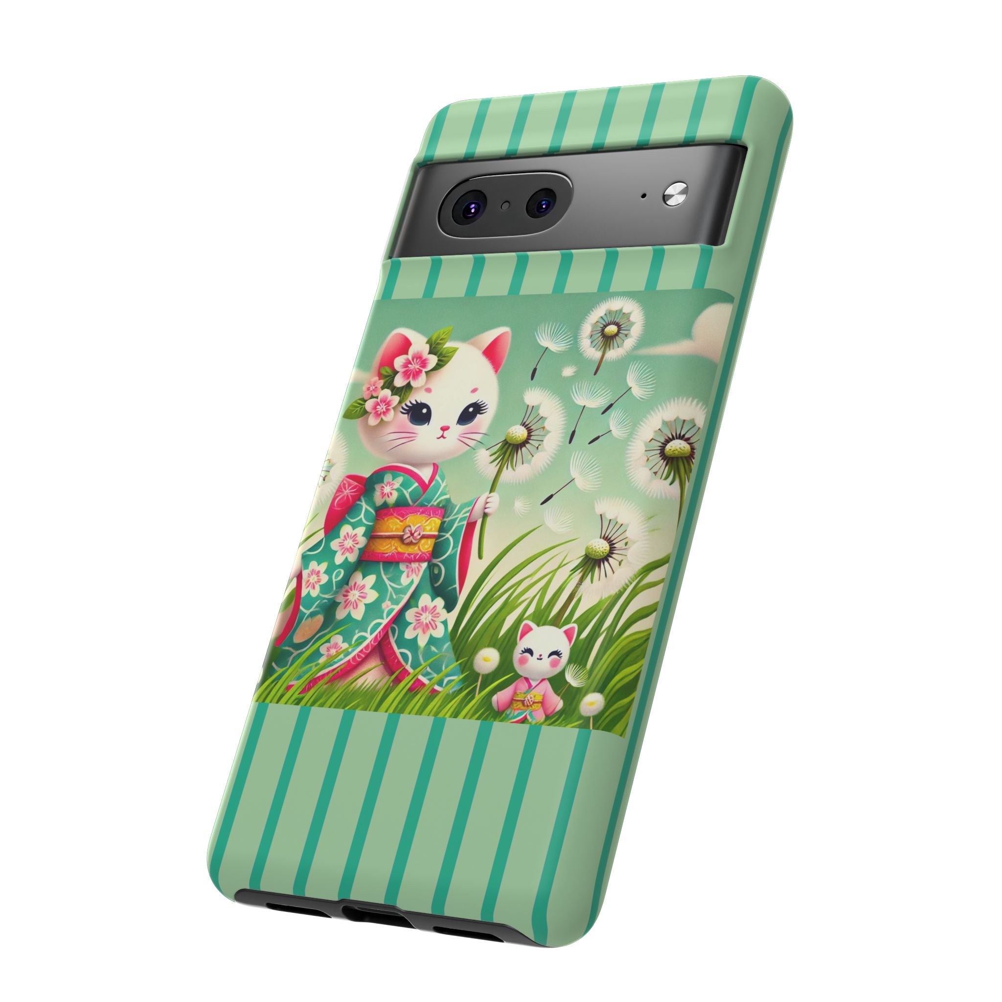 Add a touch of calm charm to your day with our Geisha Kitten and the Dandelion Phone Cases. Designed for iPhone, Samsung Galaxy, and Google Pixel devices, these premium-quality cases combine everyday protection with the gentle beauty of whimsical art. The design features a serene illustration of a geisha kitten and her tiny kitten doll, both dressed in matching kimonos, surrounded by tall swaying grass and drifting dandelion seeds. The soft colors and delicate details create a dreamy, tranquil mood that transforms your phone into a peaceful work of art.