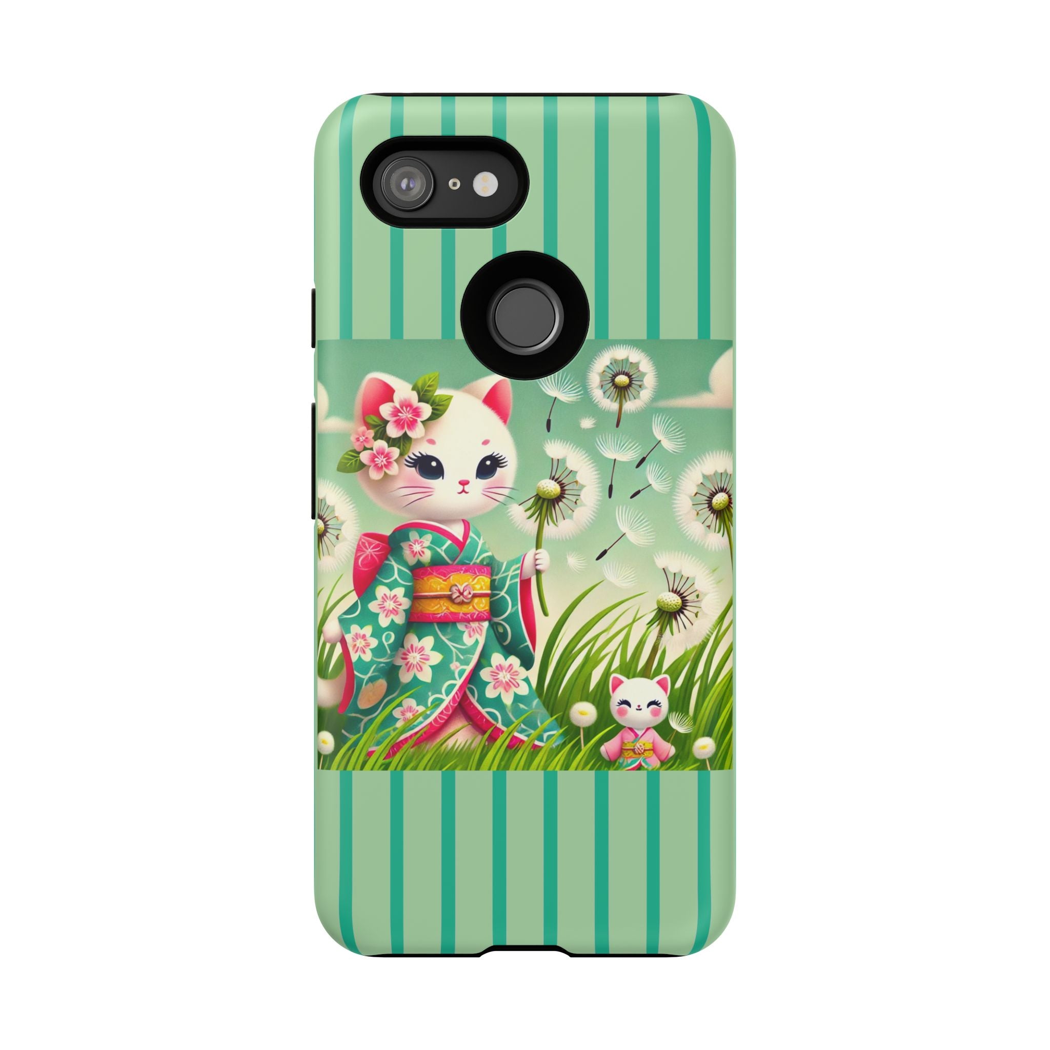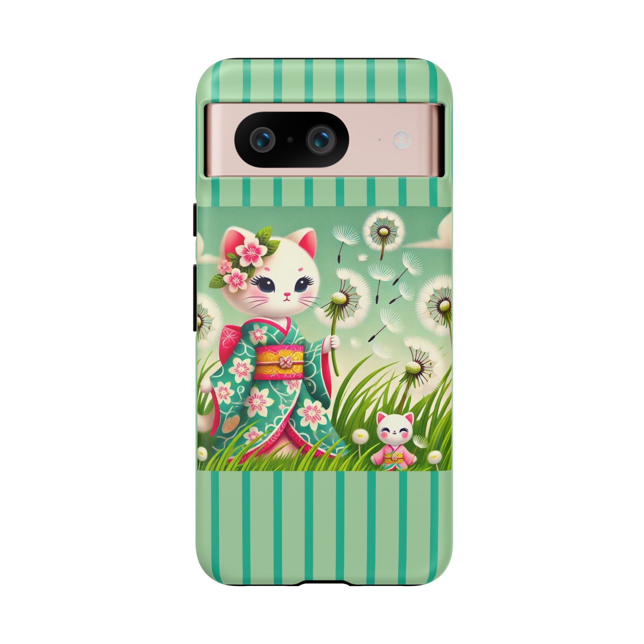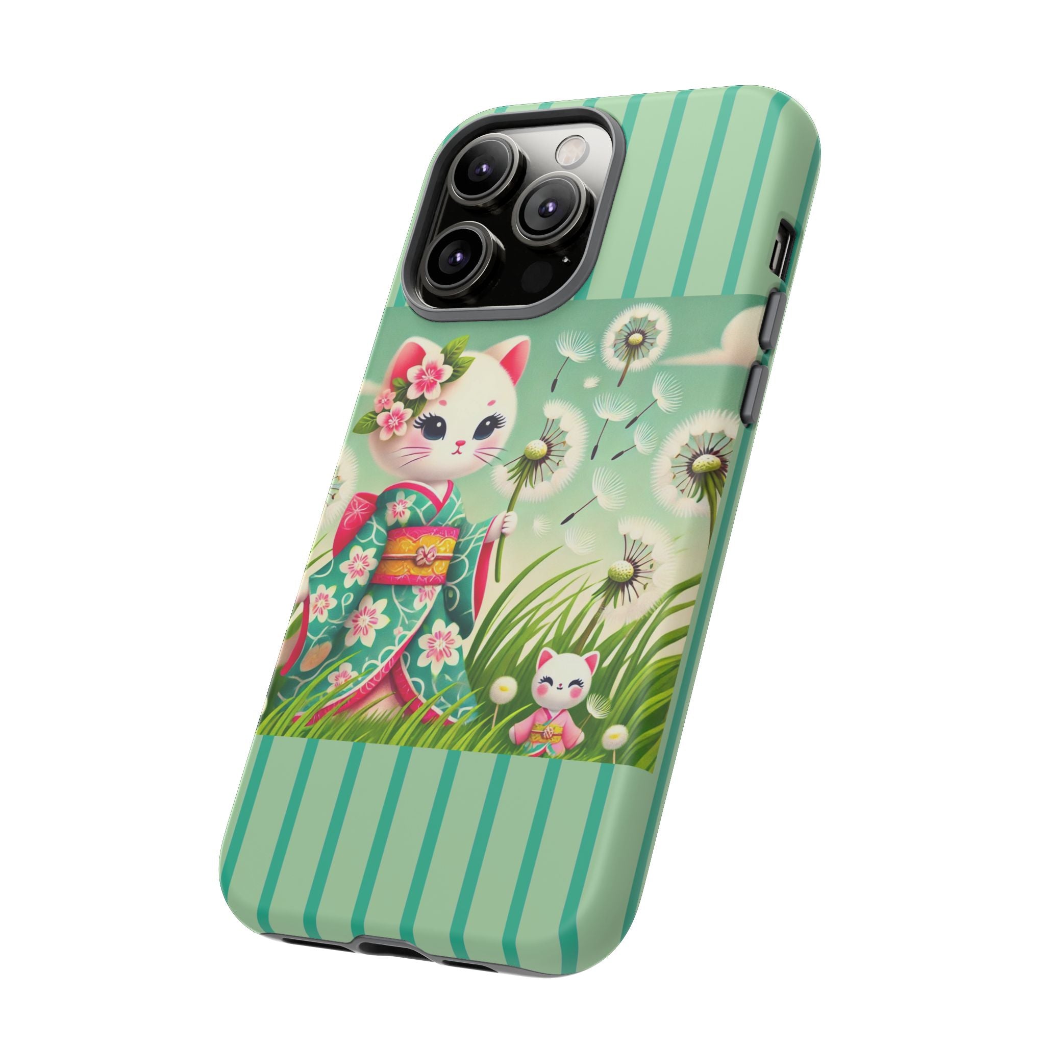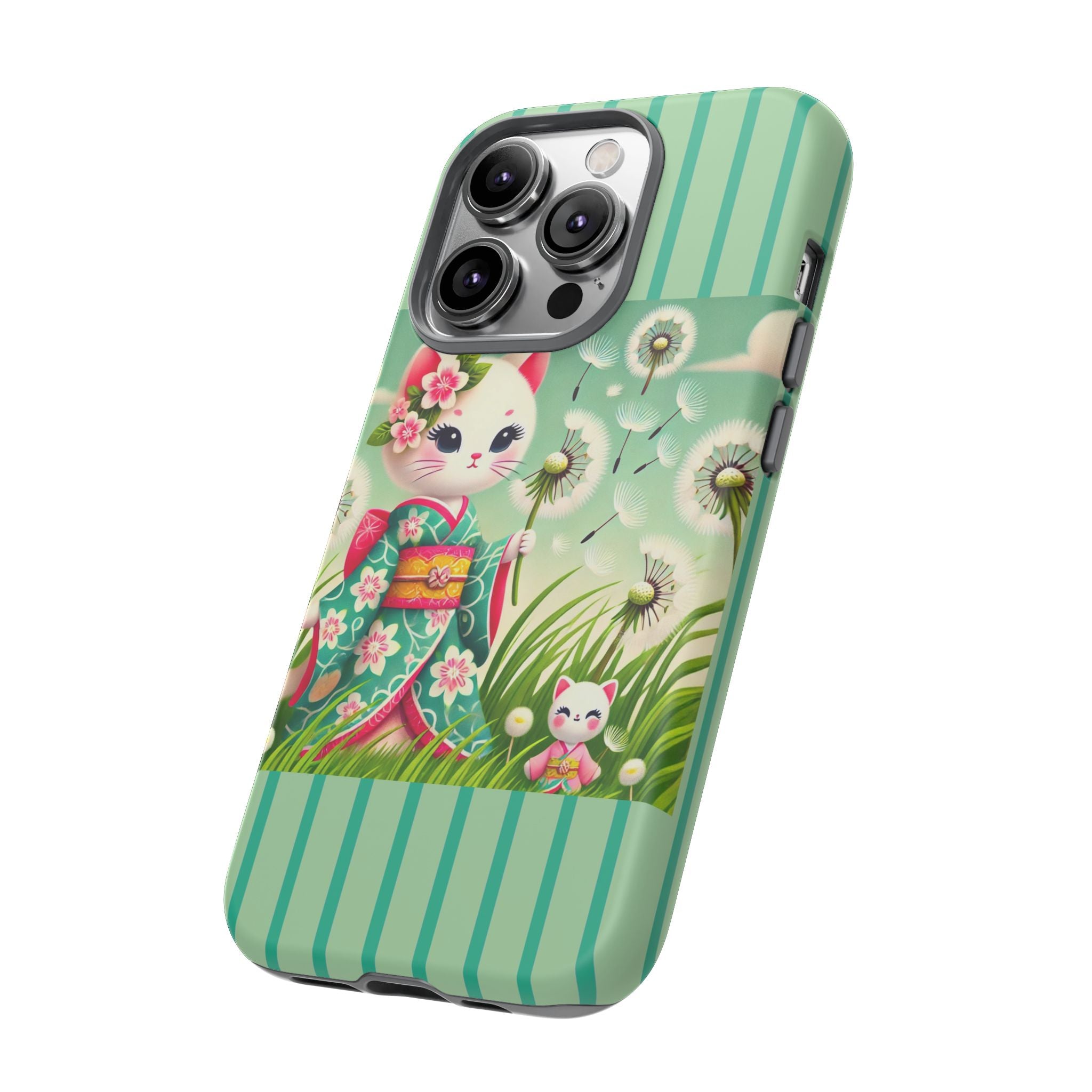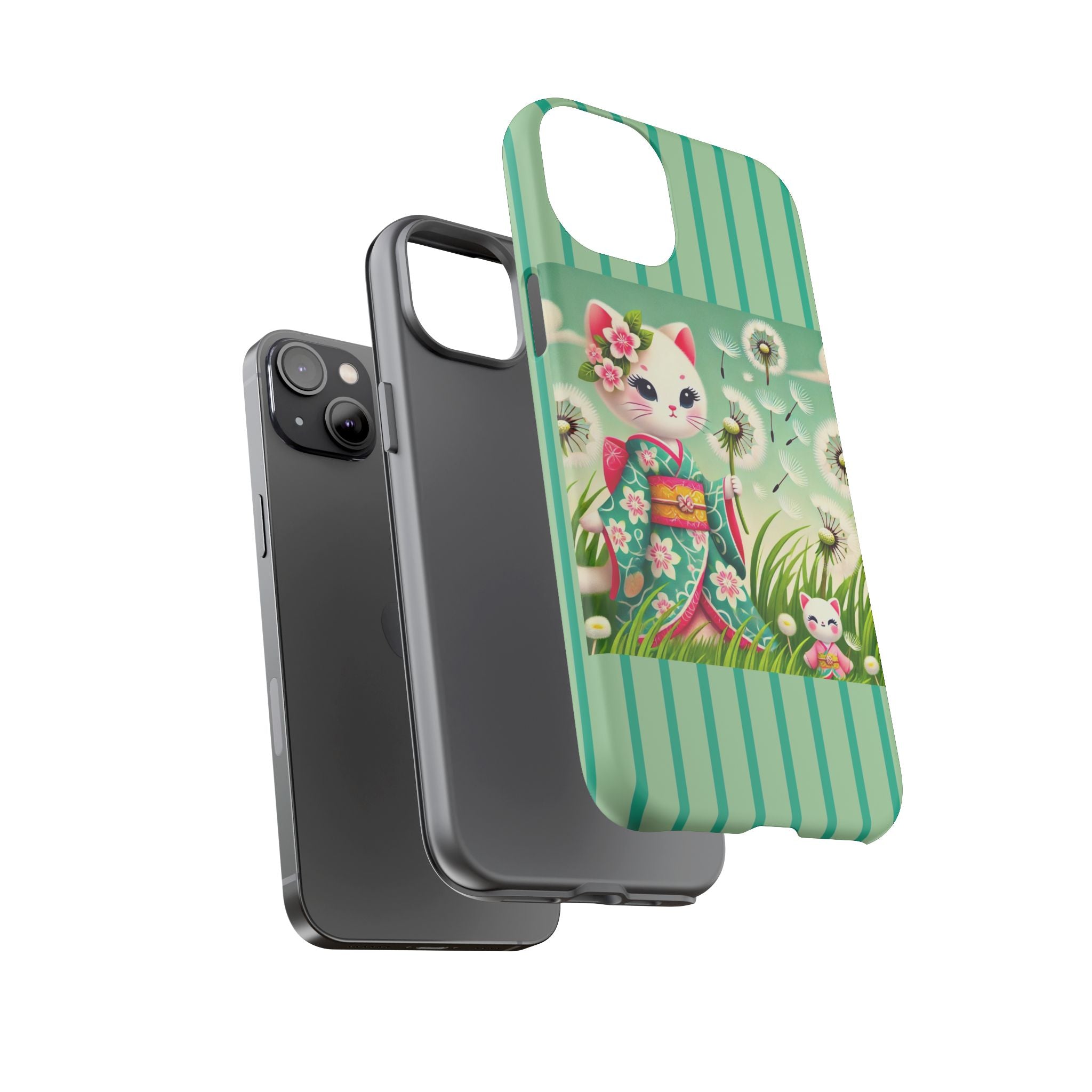 Add a touch of calm charm to your day with our Geisha Kitten and the Dandelion Phone Cases. Designed for iPhone, Samsung Galaxy, and Google Pixel devices, these premium-quality cases combine everyday protection with the gentle beauty of whimsical art. The design features a serene illustration of a geisha kitten and her tiny kitten doll, both dressed in matching kimonos, surrounded by tall swaying grass and drifting dandelion seeds. The soft colors and delicate details create a dreamy, tranquil mood that transforms your phone into a peaceful work of art.