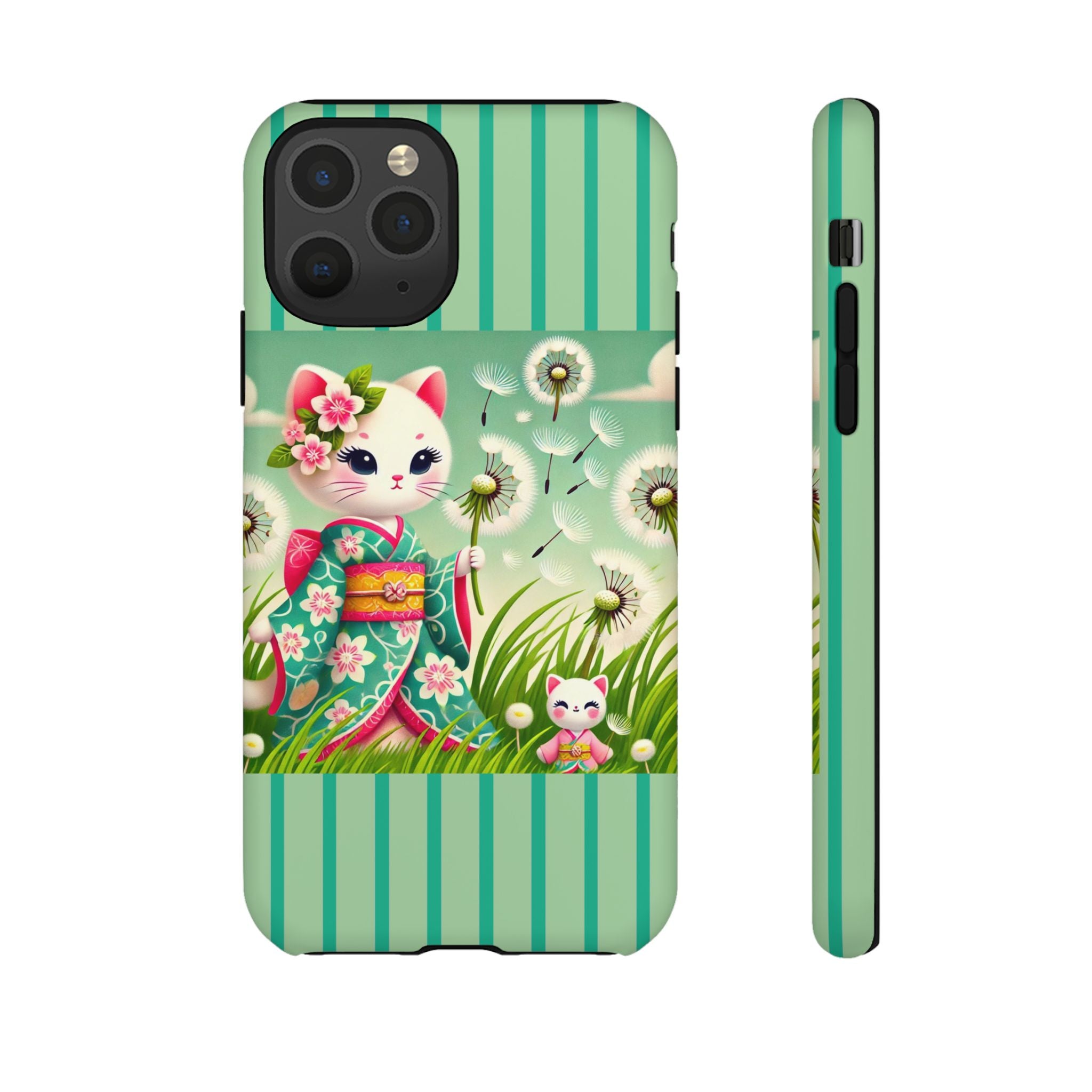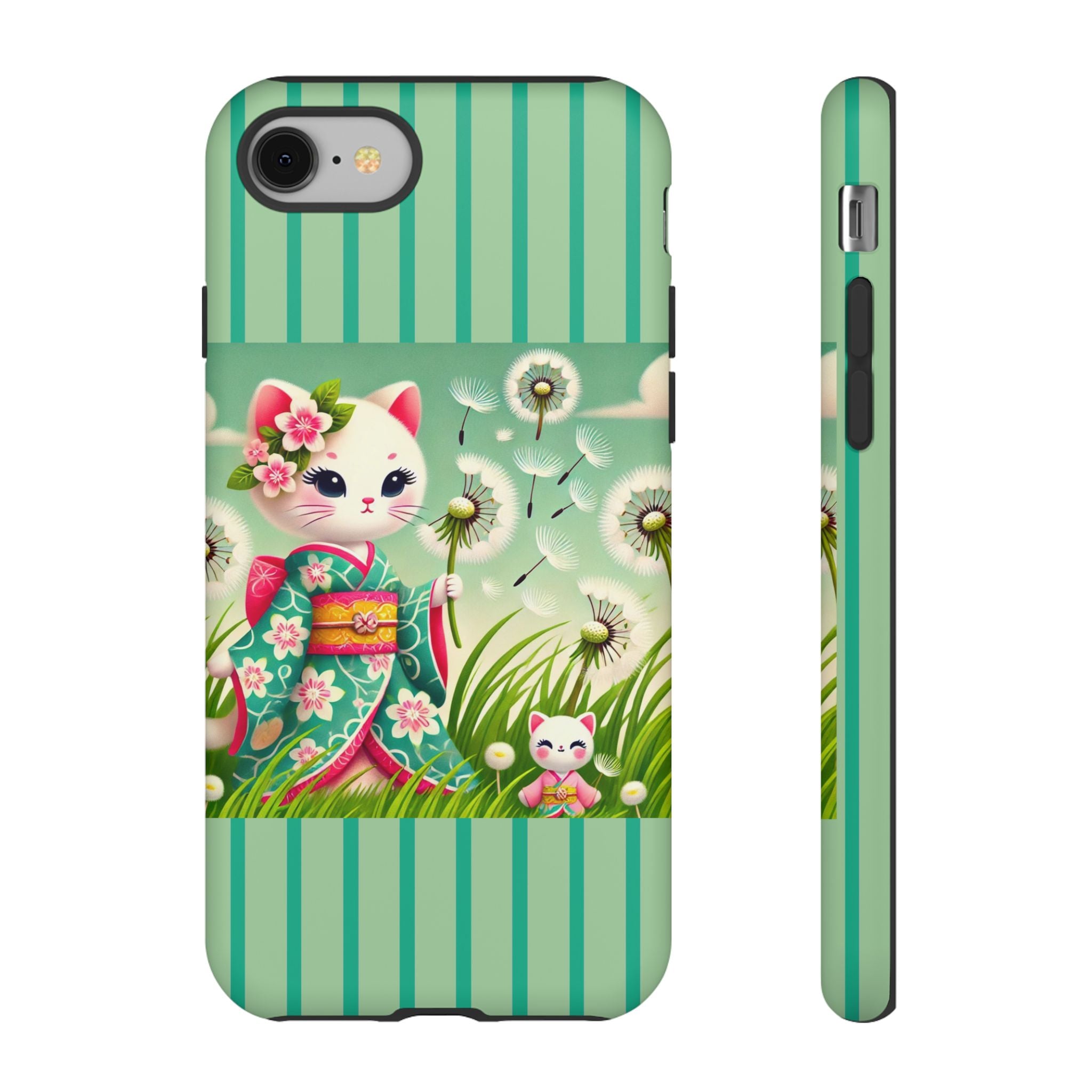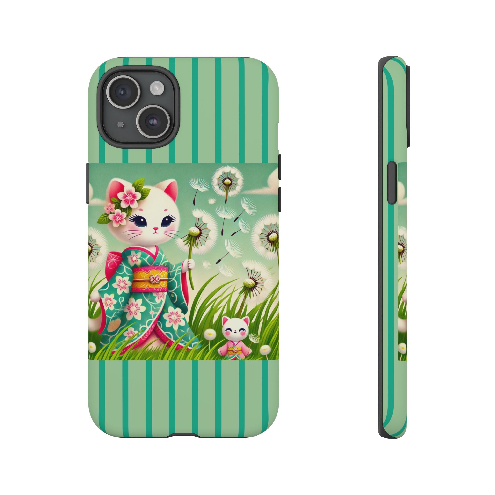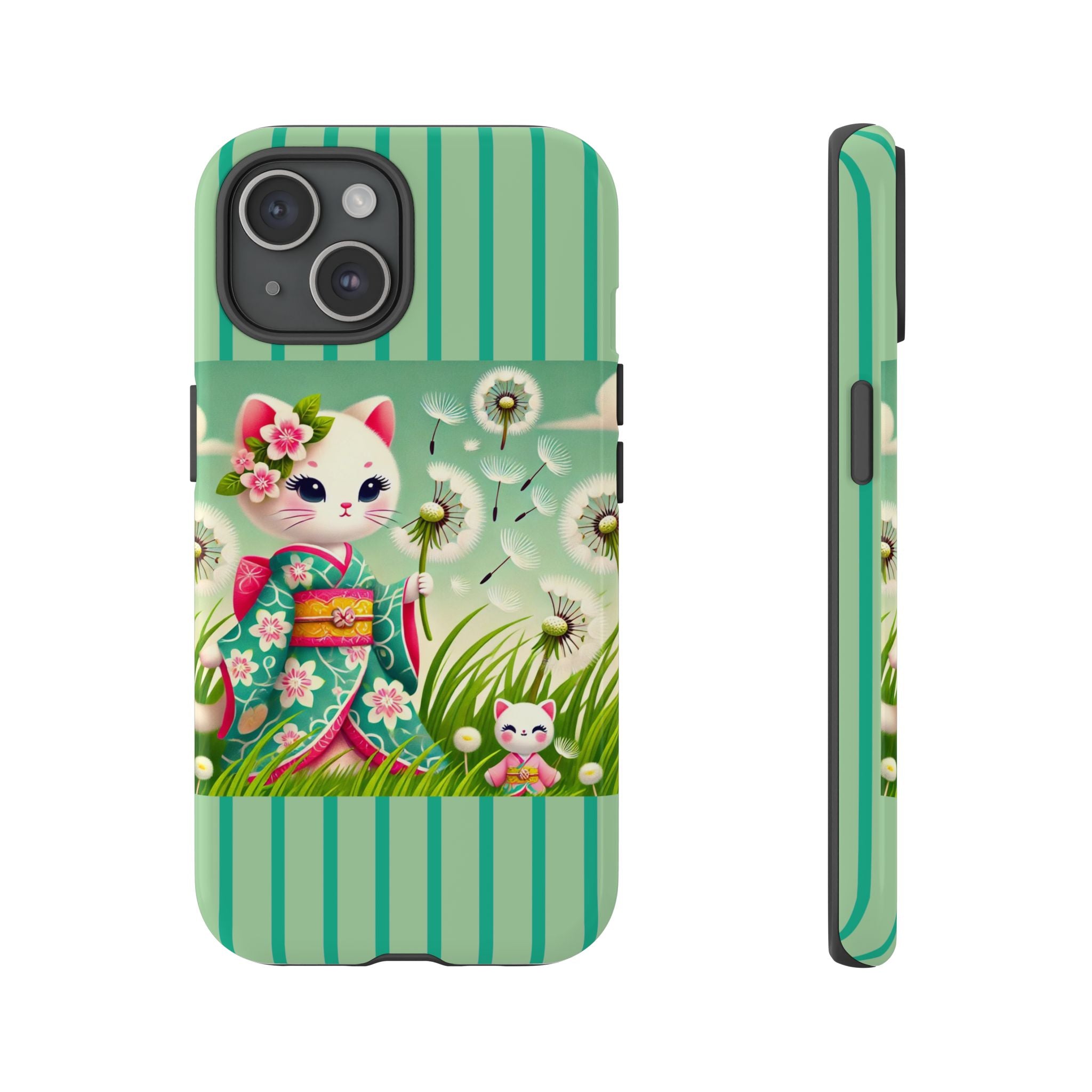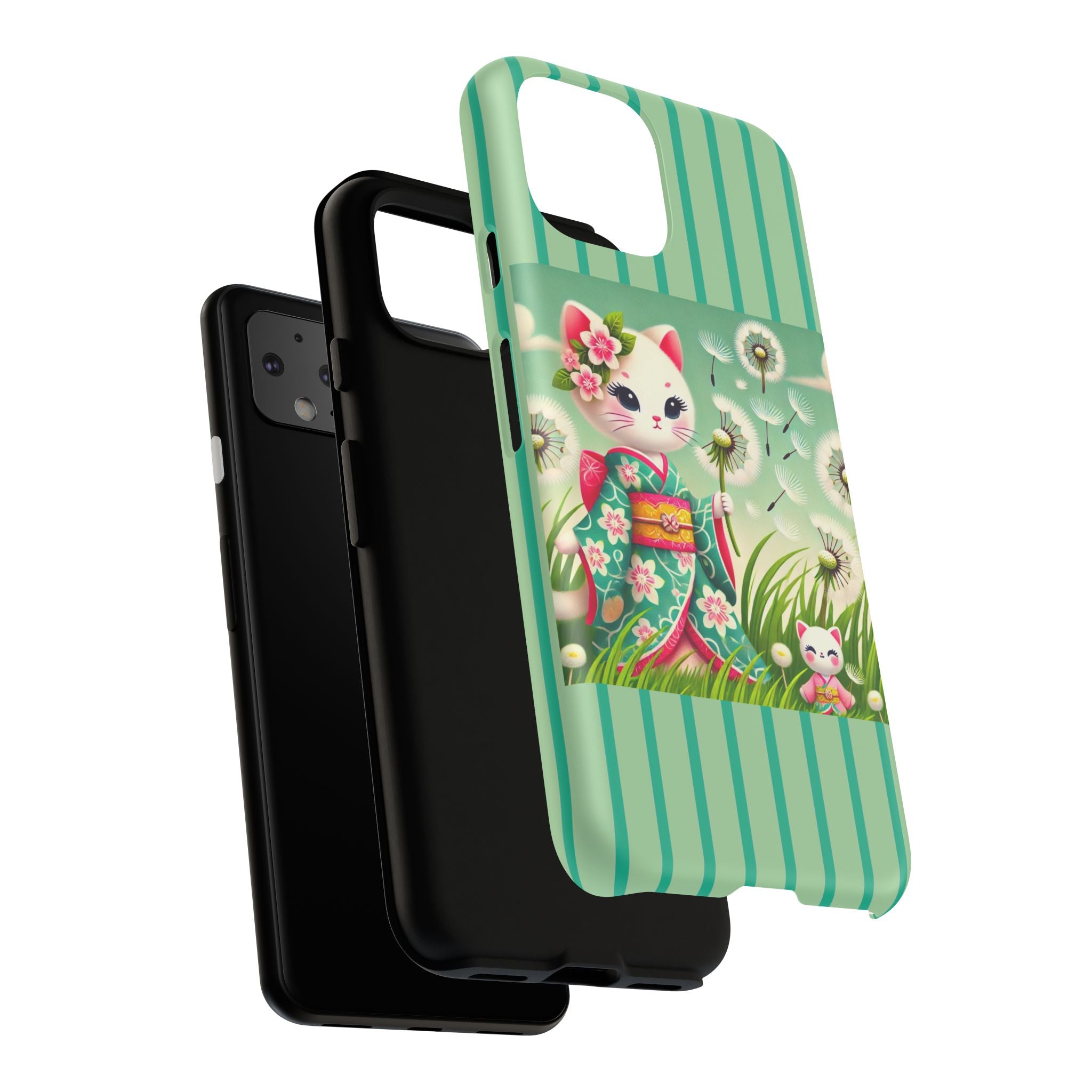 Add a touch of calm charm to your day with our Geisha Kitten and the Dandelion Phone Cases. Designed for iPhone, Samsung Galaxy, and Google Pixel devices, these premium-quality cases combine everyday protection with the gentle beauty of whimsical art. The design features a serene illustration of a geisha kitten and her tiny kitten doll, both dressed in matching kimonos, surrounded by tall swaying grass and drifting dandelion seeds. The soft colors and delicate details create a dreamy, tranquil mood that transforms your phone into a peaceful work of art.