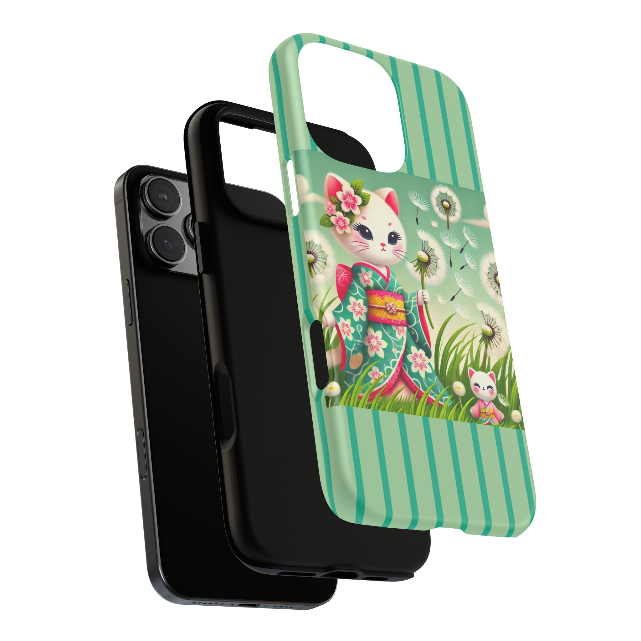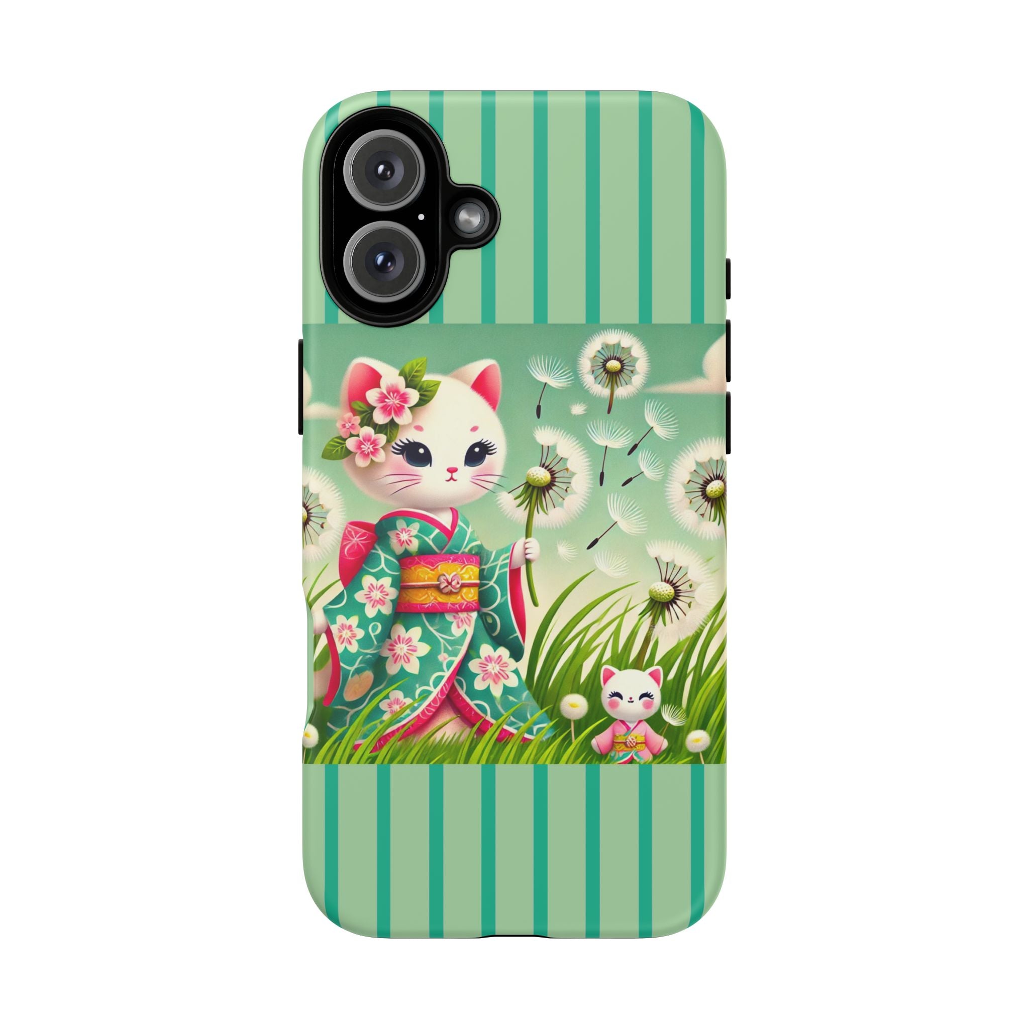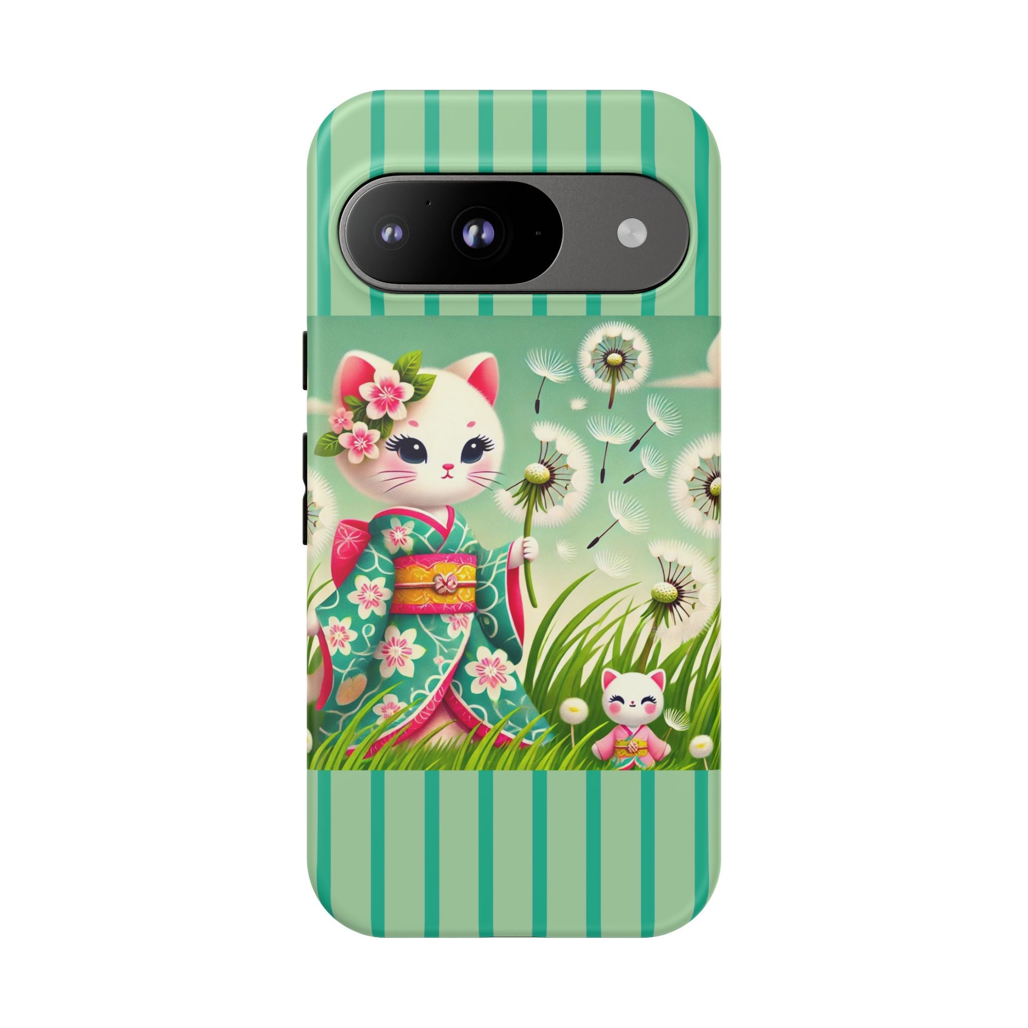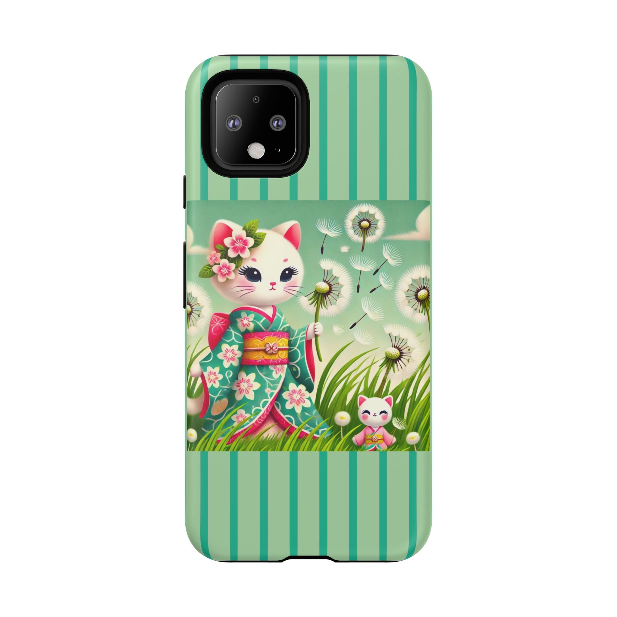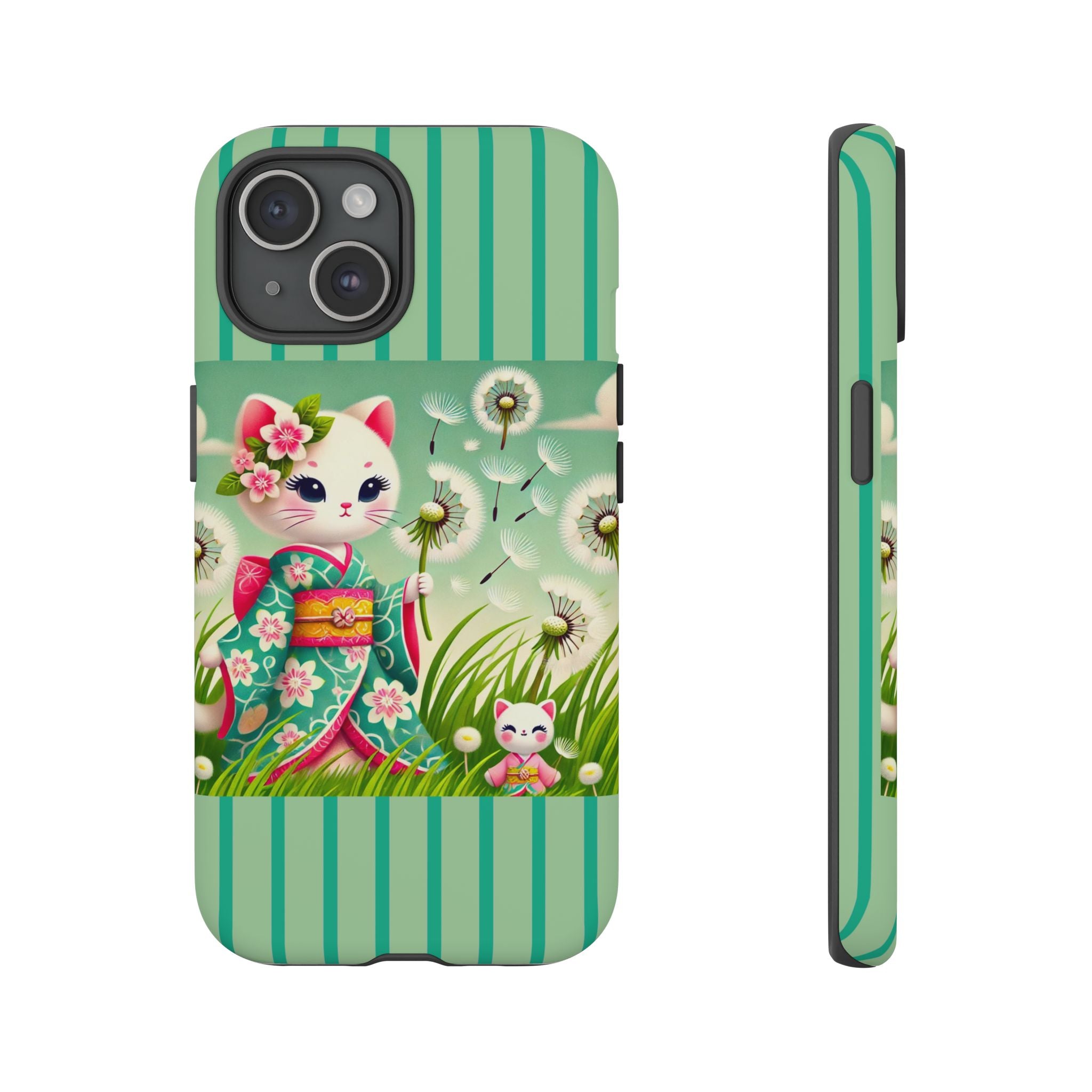 Add a touch of calm charm to your day with our Geisha Kitten and the Dandelion Phone Cases. Designed for iPhone, Samsung Galaxy, and Google Pixel devices, these premium-quality cases combine everyday protection with the gentle beauty of whimsical art. The design features a serene illustration of a geisha kitten and her tiny kitten doll, both dressed in matching kimonos, surrounded by tall swaying grass and drifting dandelion seeds. The soft colors and delicate details create a dreamy, tranquil mood that transforms your phone into a peaceful work of art.