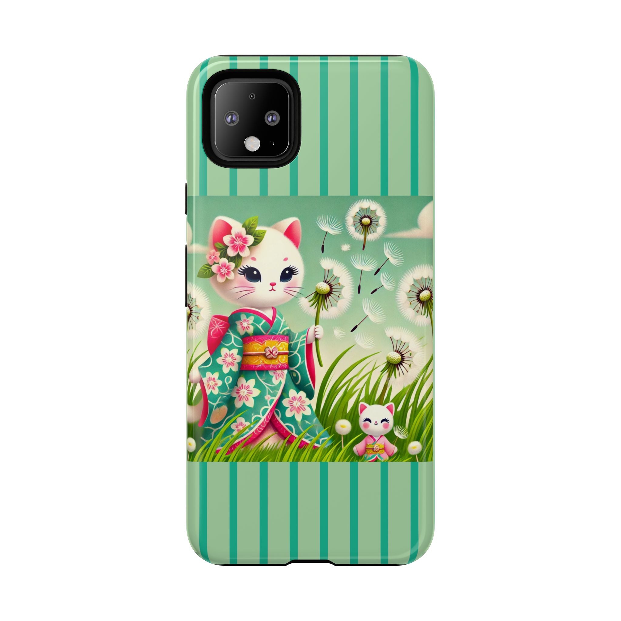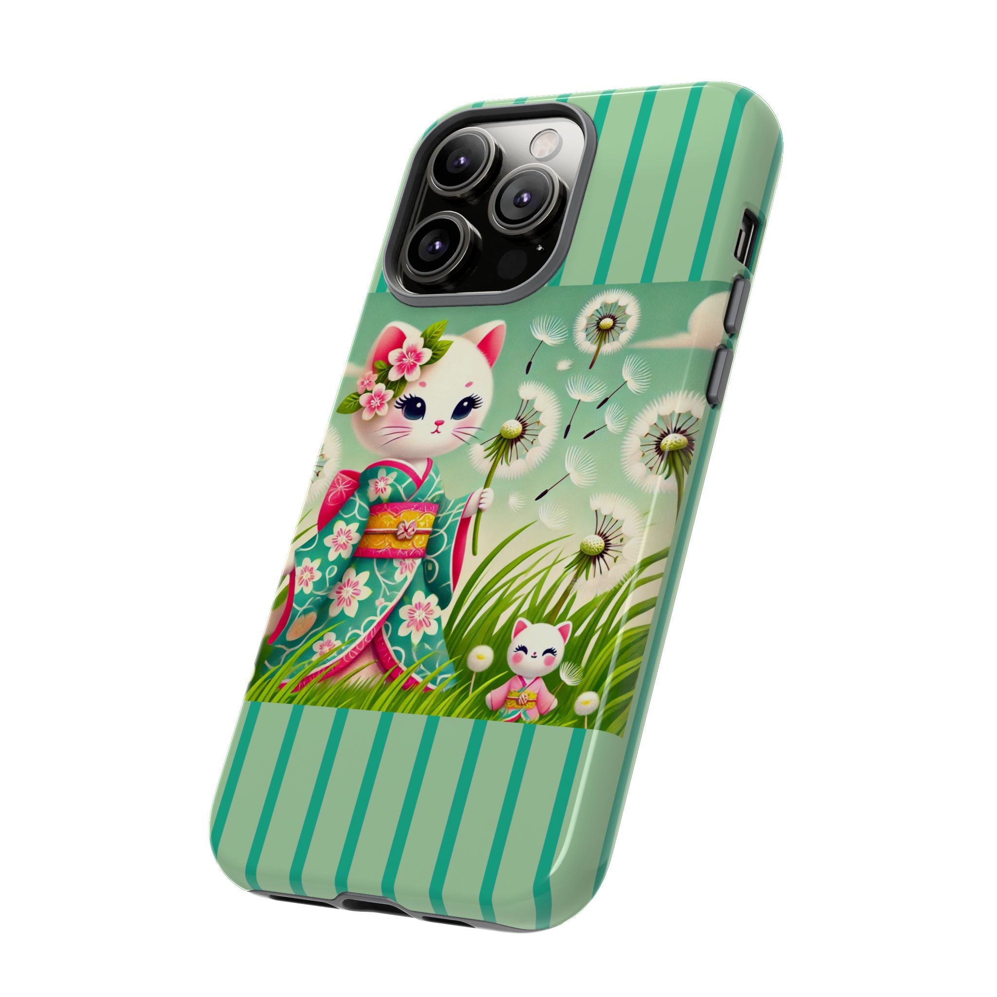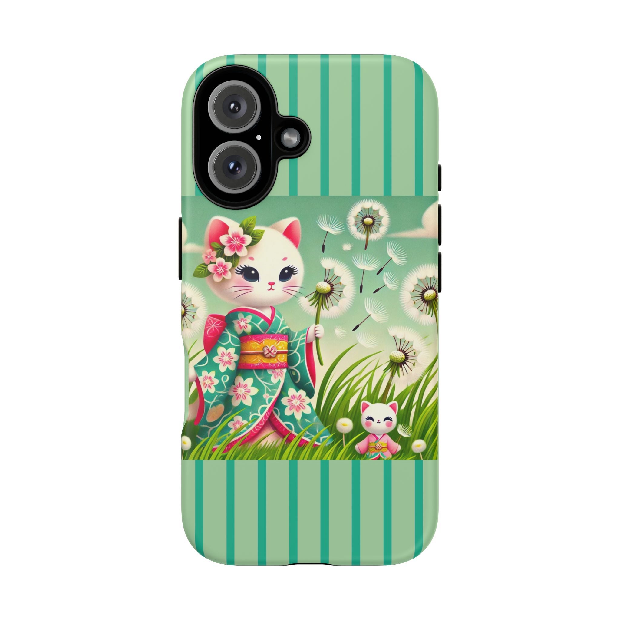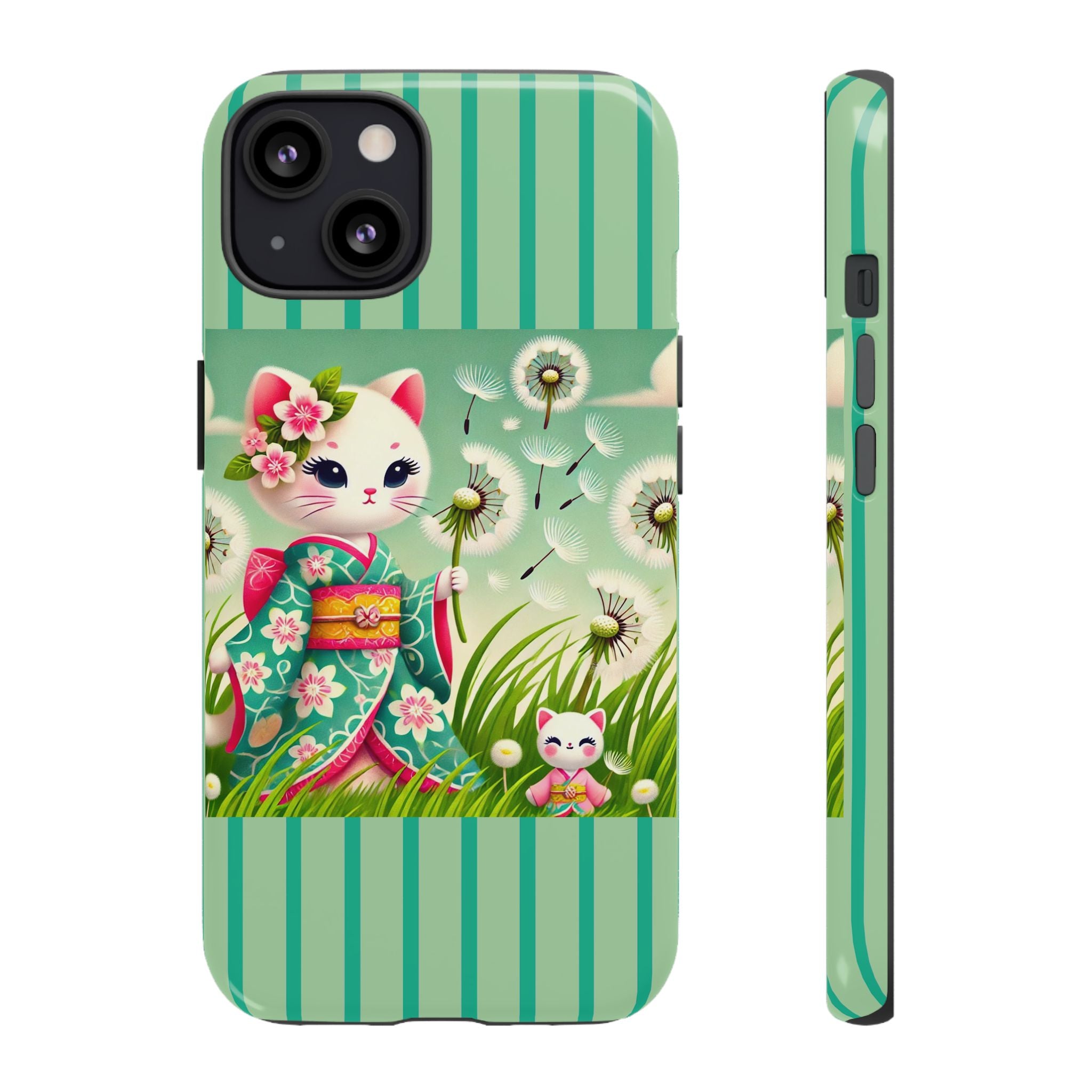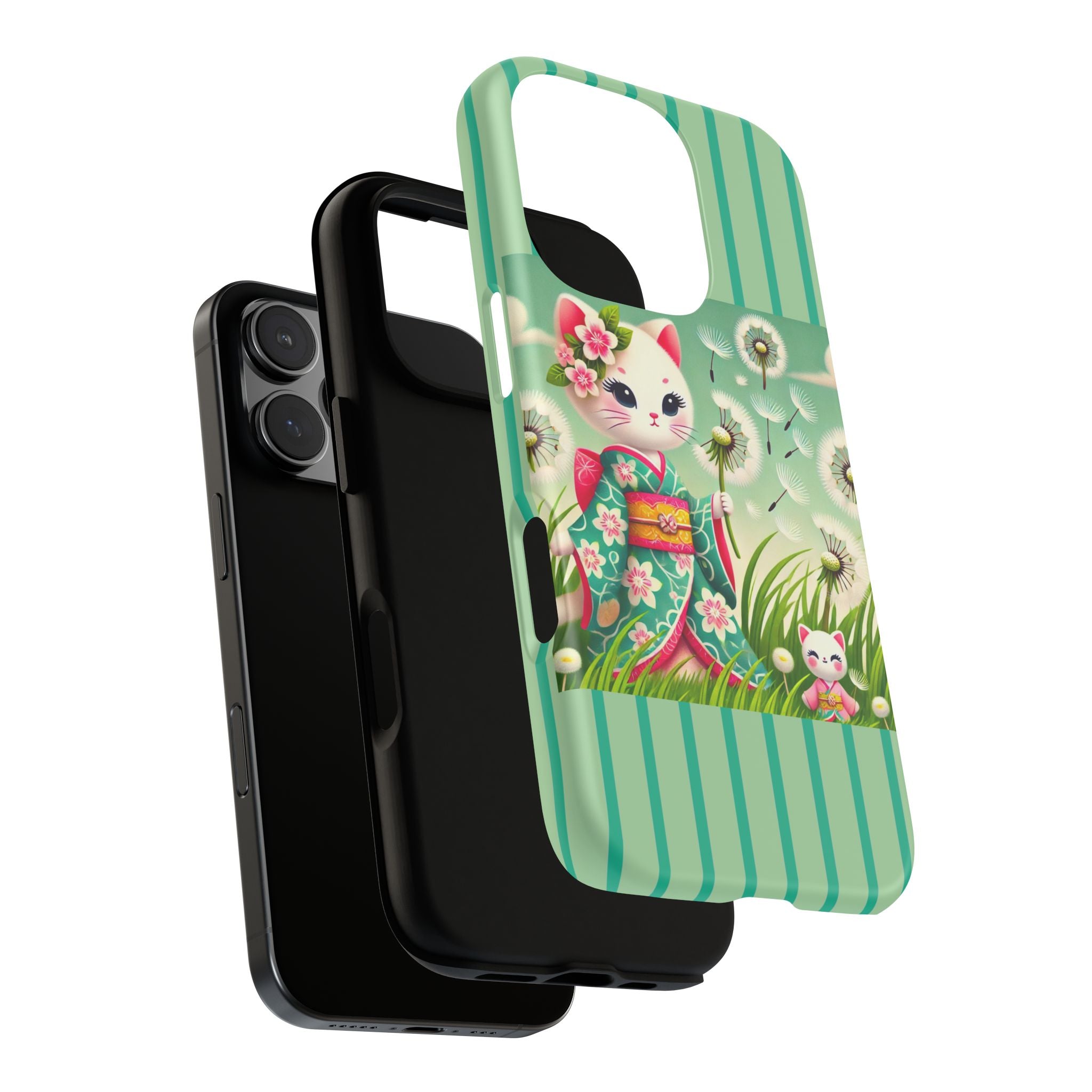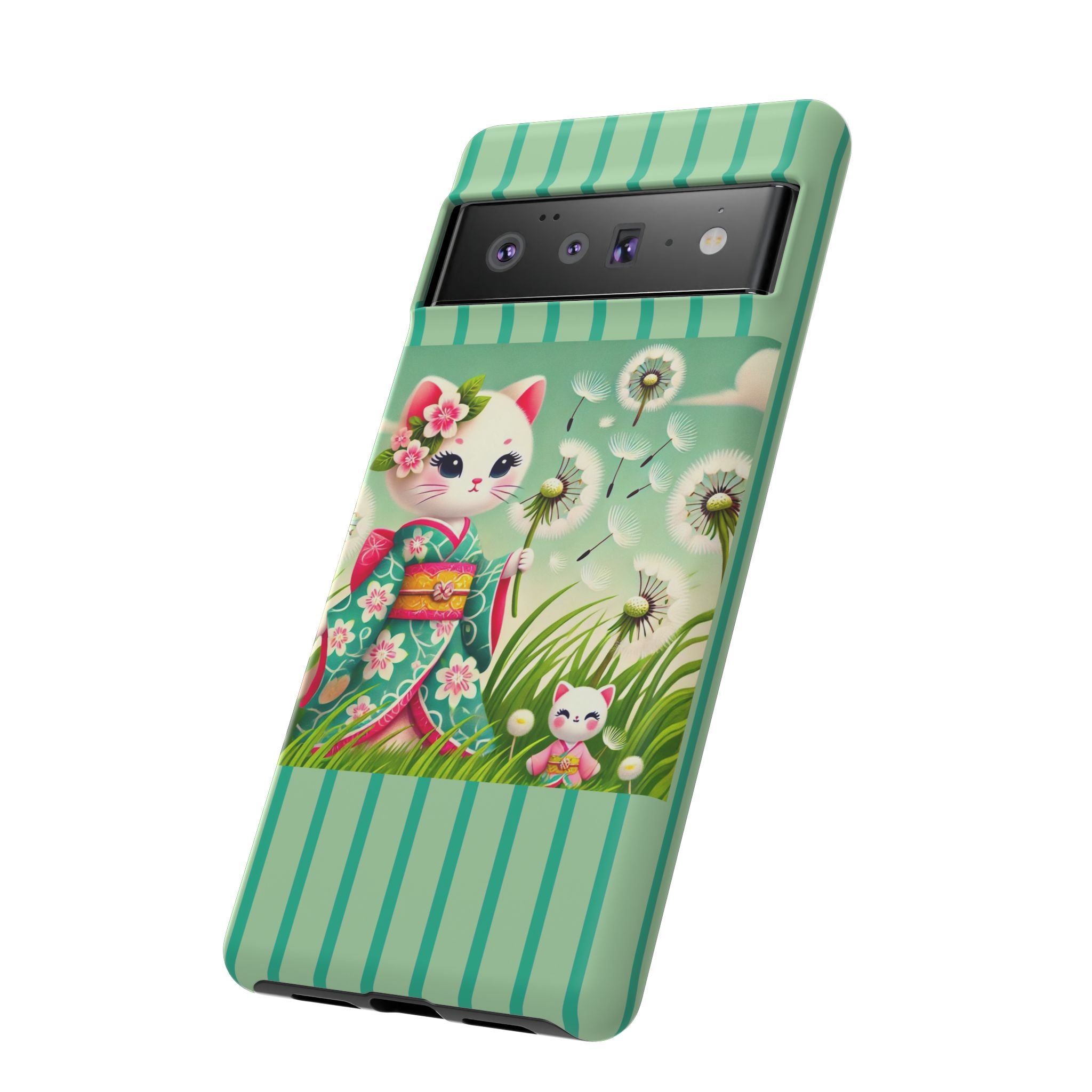 Add a touch of calm charm to your day with our Geisha Kitten and the Dandelion Phone Cases. Designed for iPhone, Samsung Galaxy, and Google Pixel devices, these premium-quality cases combine everyday protection with the gentle beauty of whimsical art. The design features a serene illustration of a geisha kitten and her tiny kitten doll, both dressed in matching kimonos, surrounded by tall swaying grass and drifting dandelion seeds. The soft colors and delicate details create a dreamy, tranquil mood that transforms your phone into a peaceful work of art.