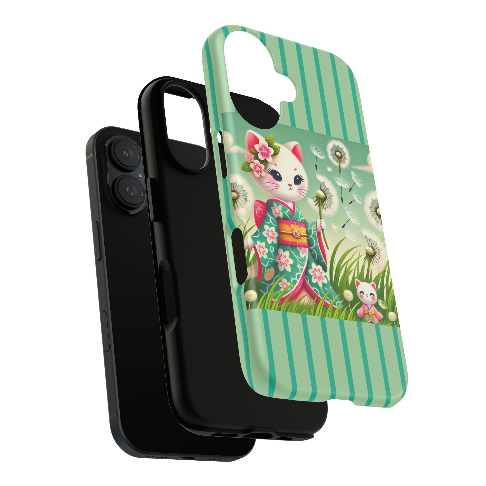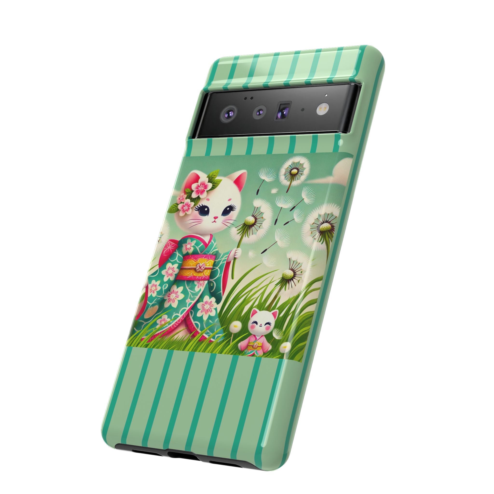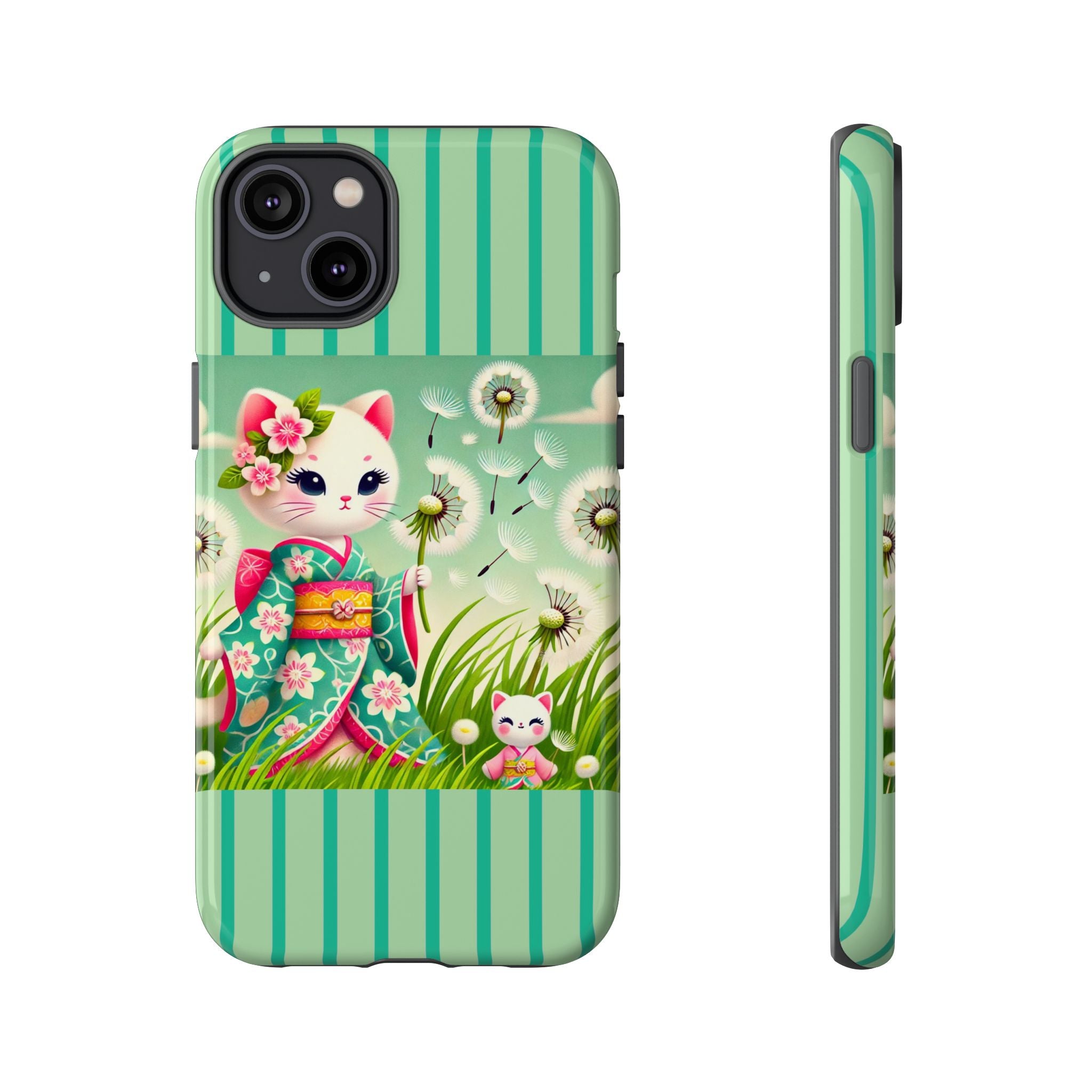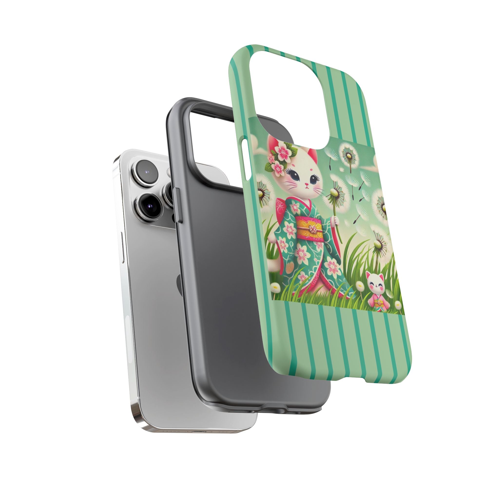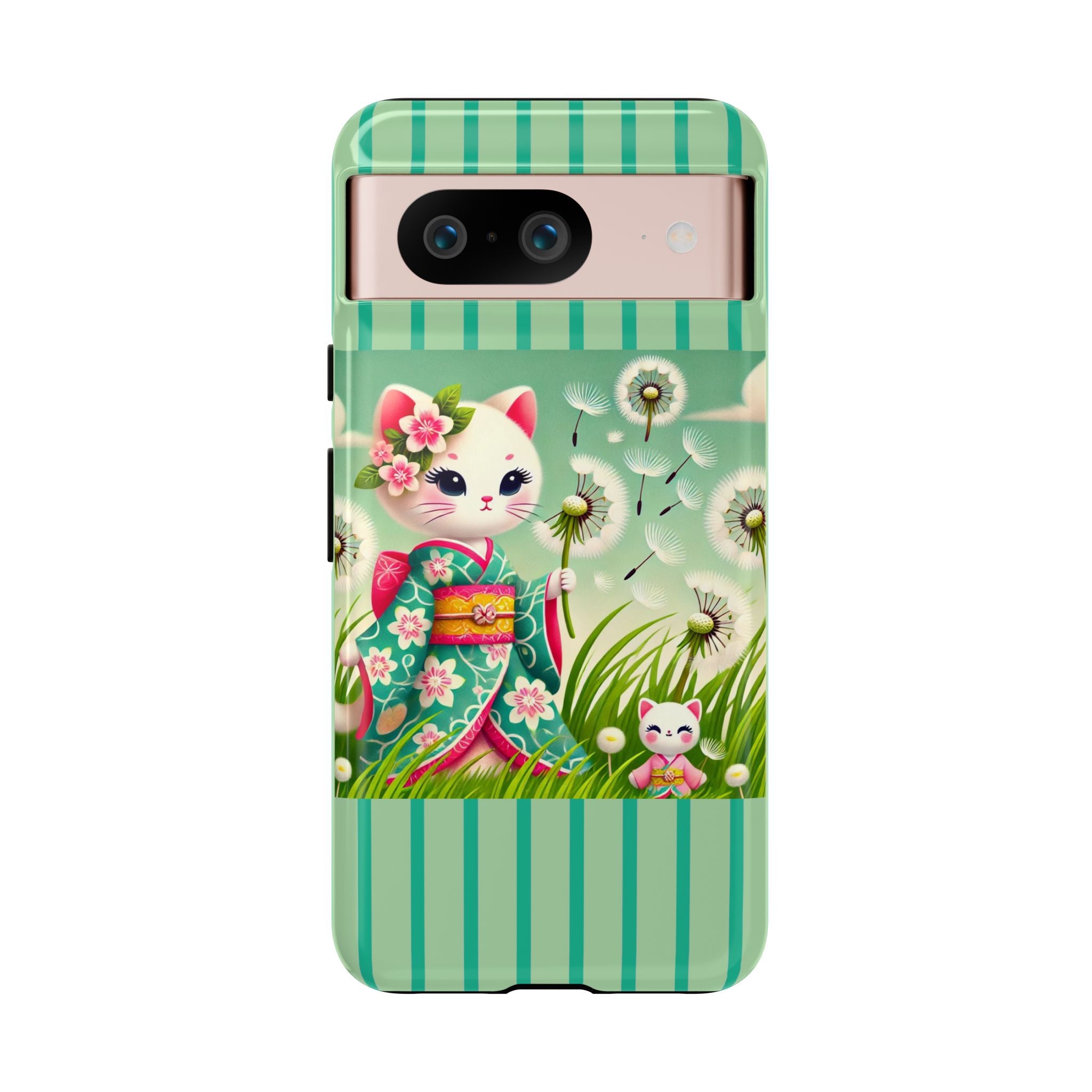 Add a touch of calm charm to your day with our Geisha Kitten and the Dandelion Phone Cases. Designed for iPhone, Samsung Galaxy, and Google Pixel devices, these premium-quality cases combine everyday protection with the gentle beauty of whimsical art. The design features a serene illustration of a geisha kitten and her tiny kitten doll, both dressed in matching kimonos, surrounded by tall swaying grass and drifting dandelion seeds. The soft colors and delicate details create a dreamy, tranquil mood that transforms your phone into a peaceful work of art.