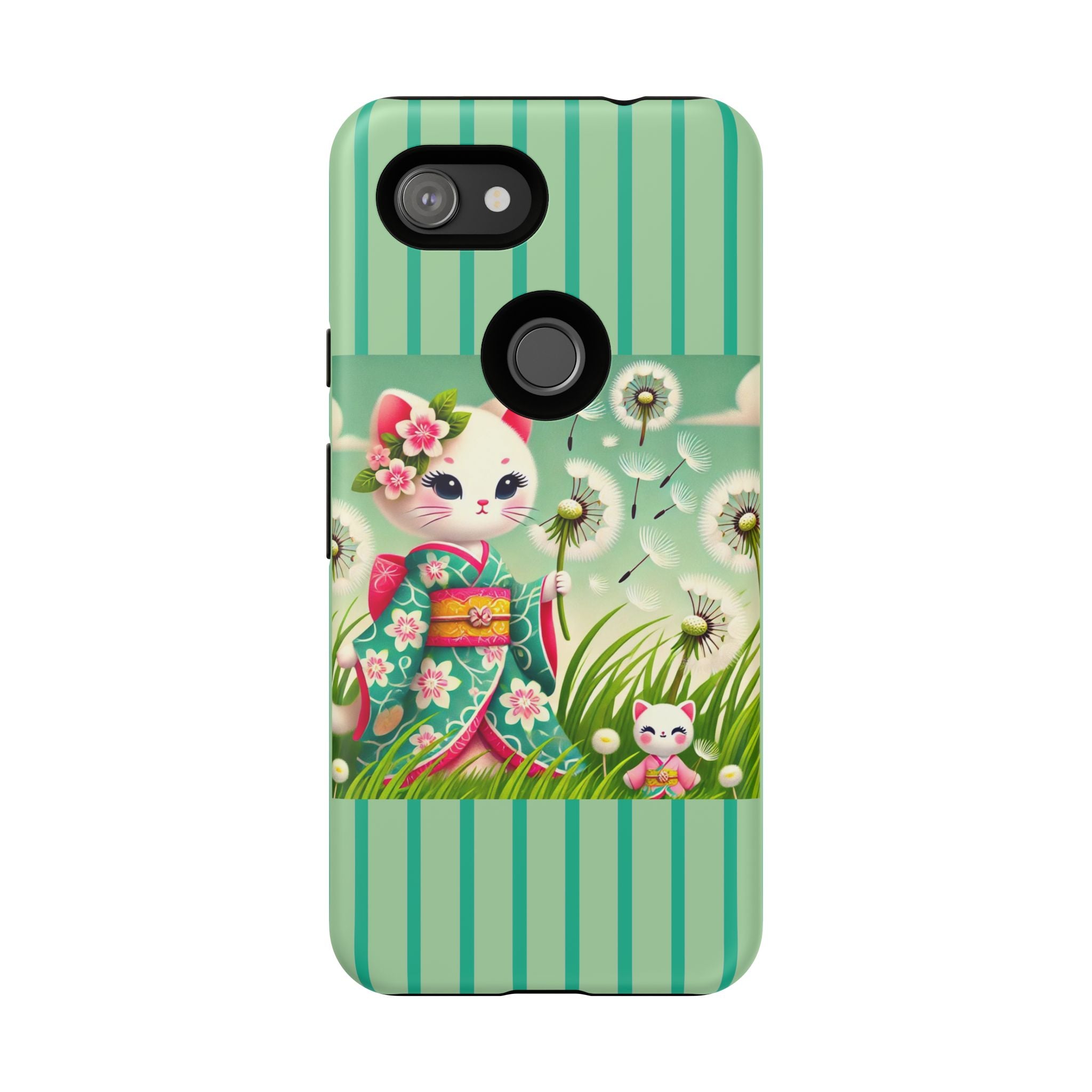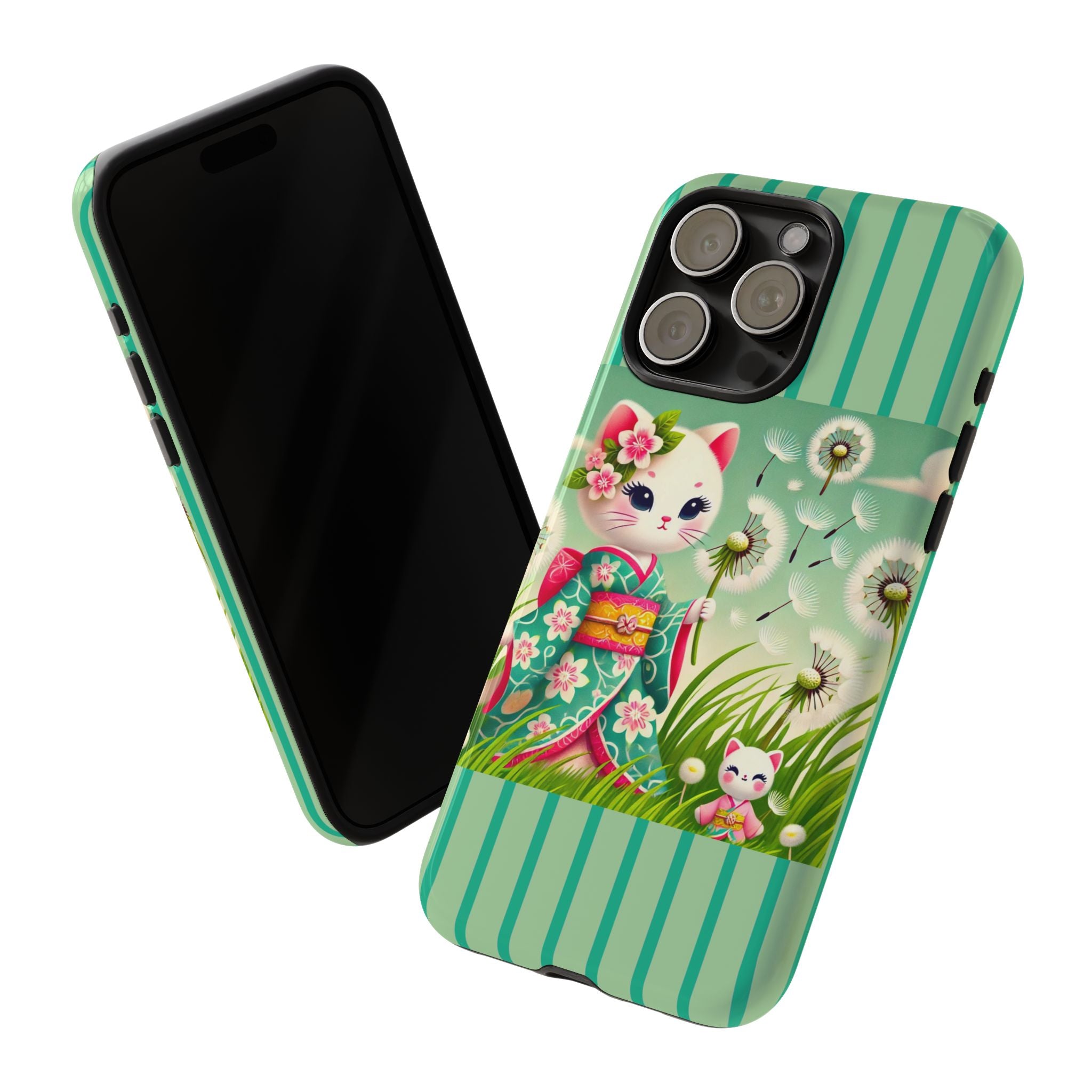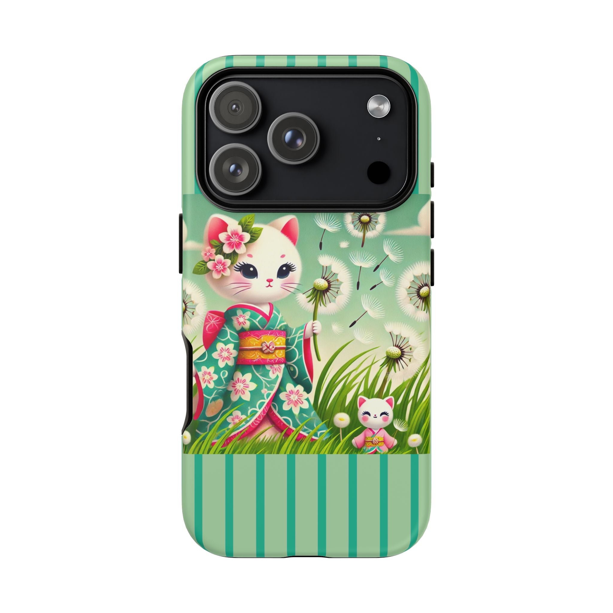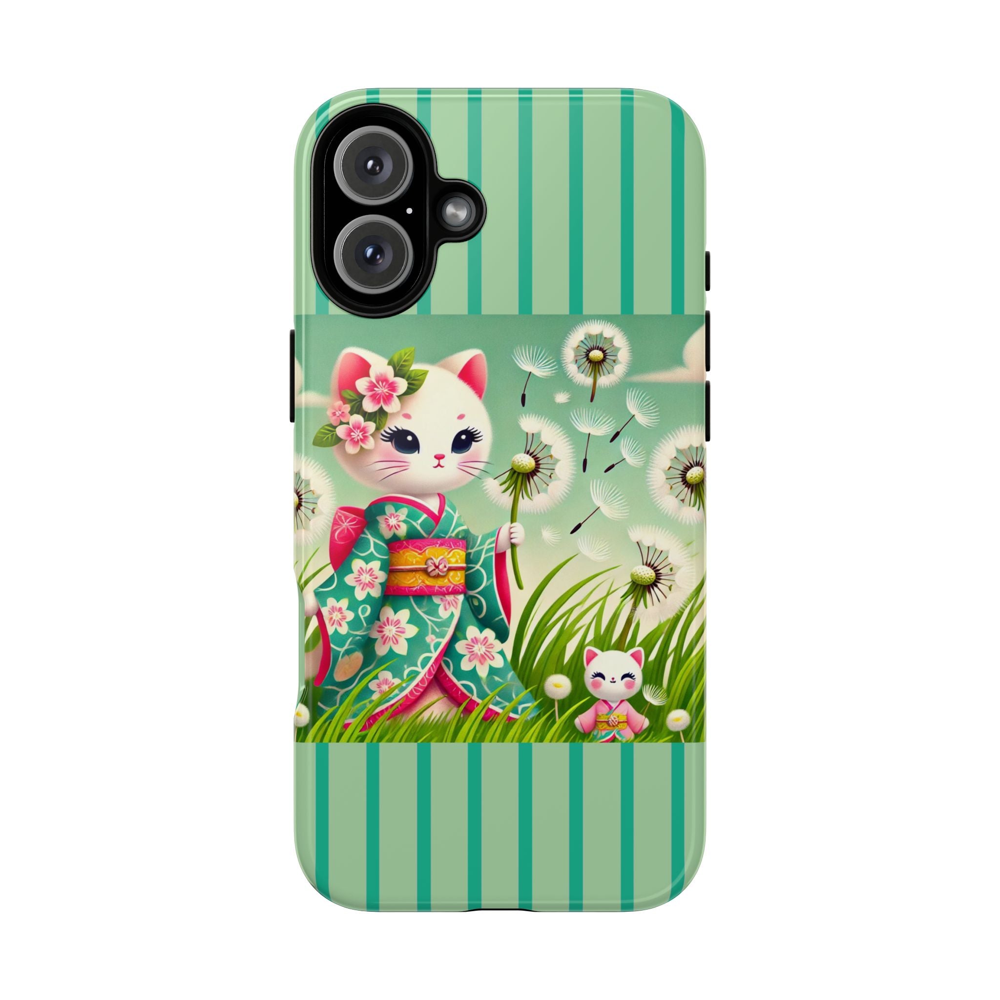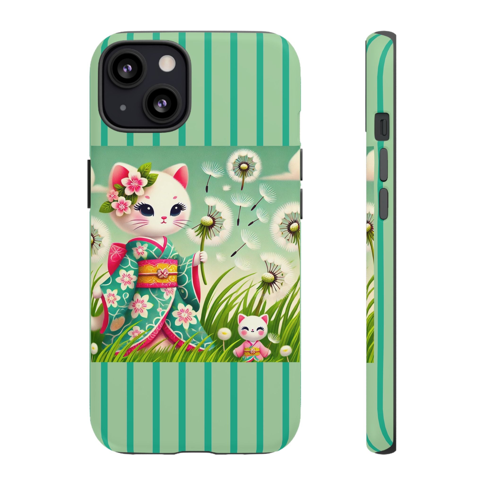 Add a touch of calm charm to your day with our Geisha Kitten and the Dandelion Phone Cases. Designed for iPhone, Samsung Galaxy, and Google Pixel devices, these premium-quality cases combine everyday protection with the gentle beauty of whimsical art. The design features a serene illustration of a geisha kitten and her tiny kitten doll, both dressed in matching kimonos, surrounded by tall swaying grass and drifting dandelion seeds. The soft colors and delicate details create a dreamy, tranquil mood that transforms your phone into a peaceful work of art.