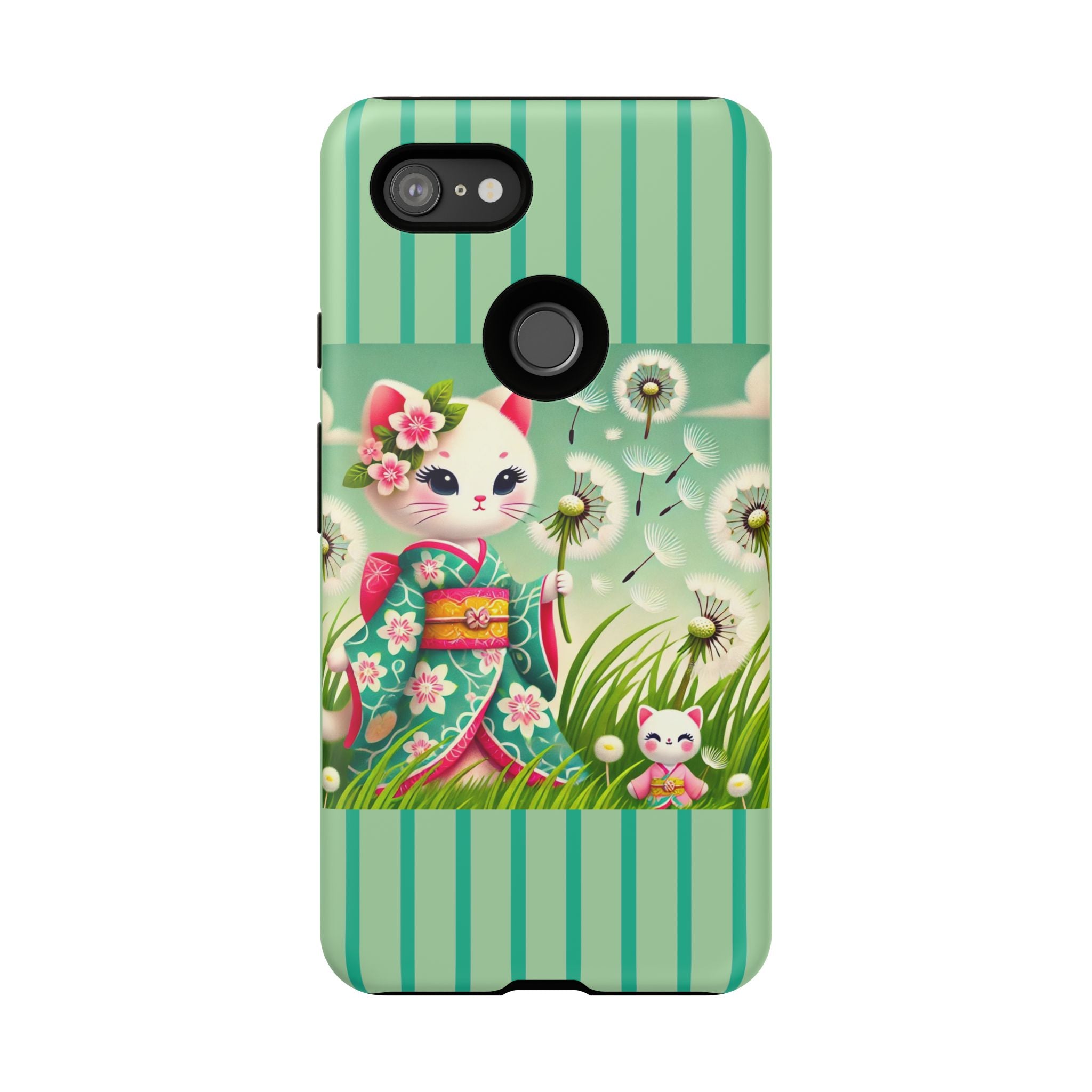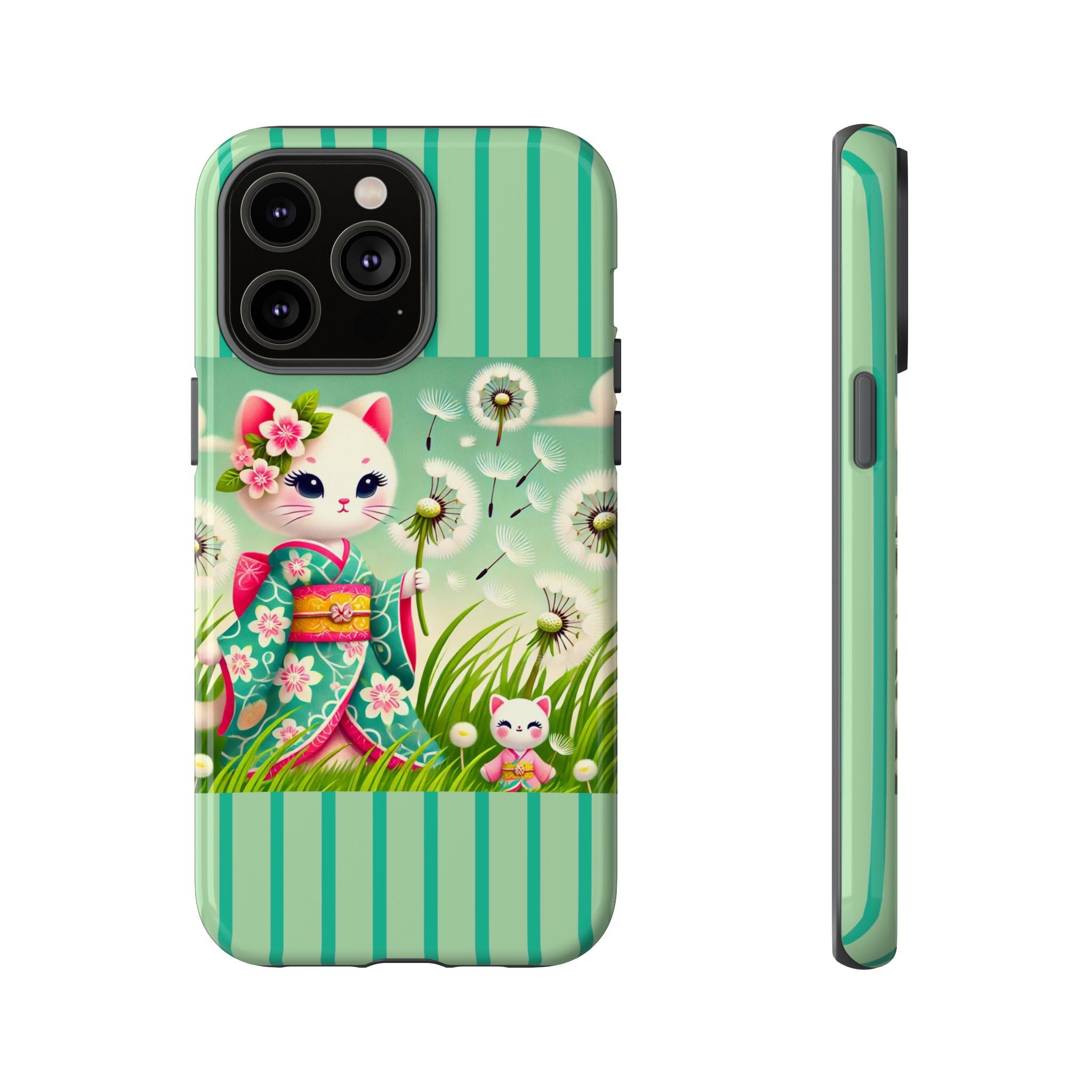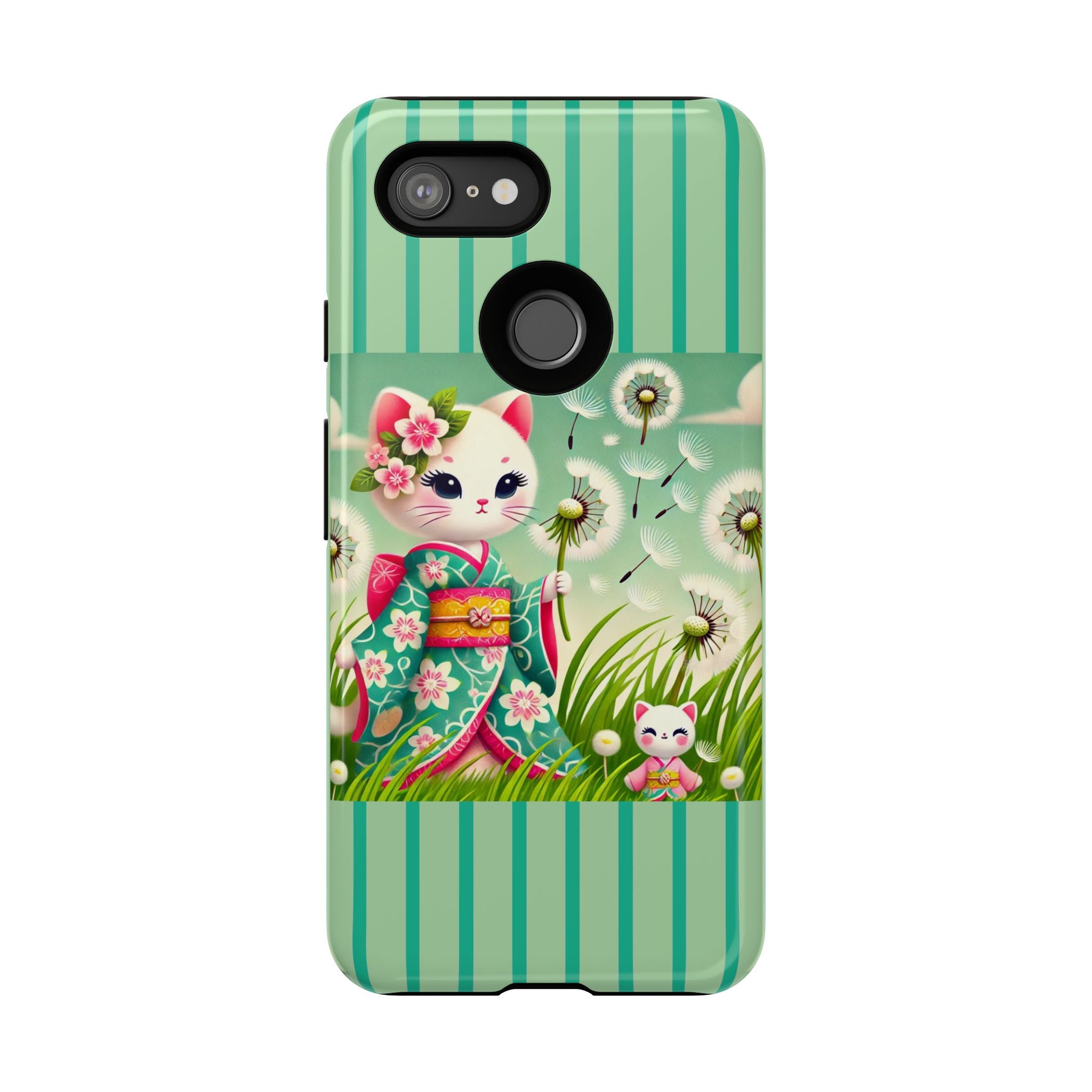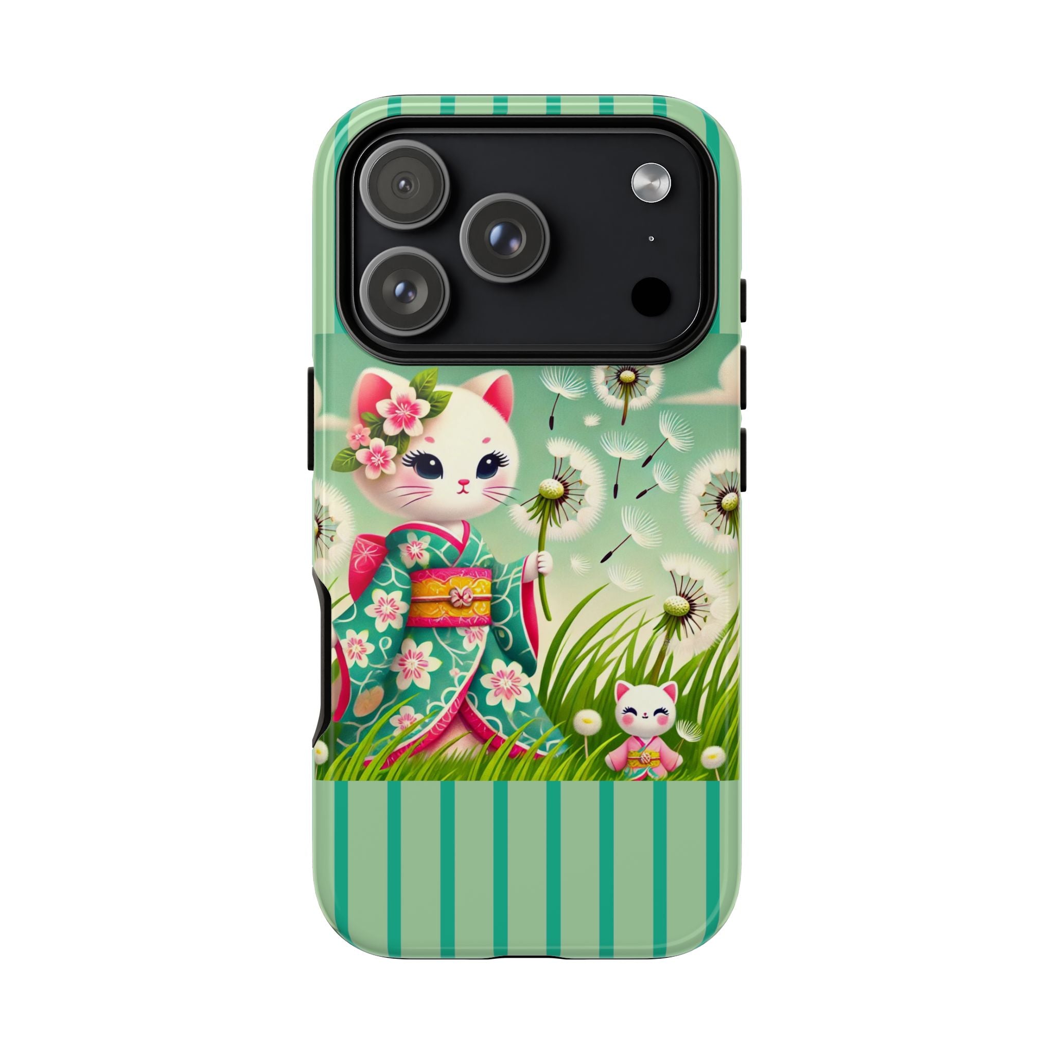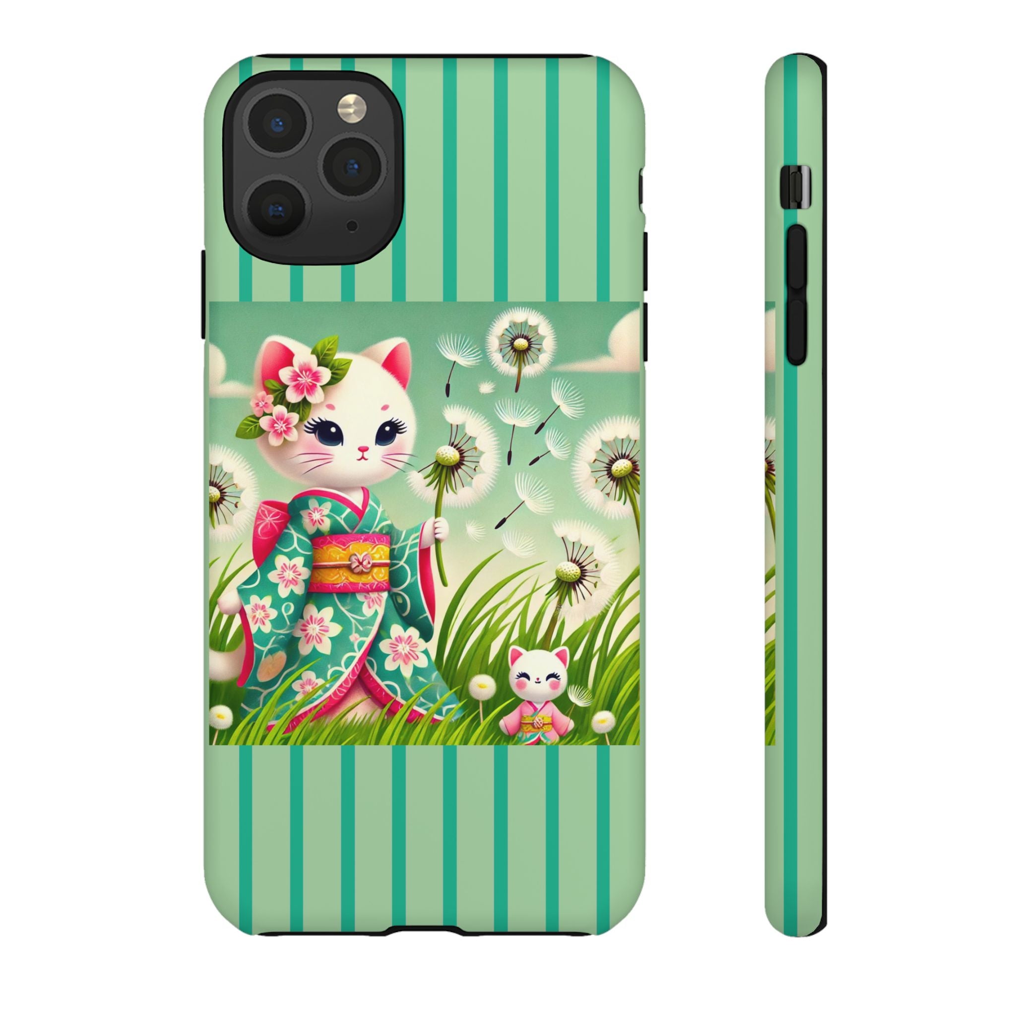 Add a touch of calm charm to your day with our Geisha Kitten and the Dandelion Phone Cases. Designed for iPhone, Samsung Galaxy, and Google Pixel devices, these premium-quality cases combine everyday protection with the gentle beauty of whimsical art. The design features a serene illustration of a geisha kitten and her tiny kitten doll, both dressed in matching kimonos, surrounded by tall swaying grass and drifting dandelion seeds. The soft colors and delicate details create a dreamy, tranquil mood that transforms your phone into a peaceful work of art.